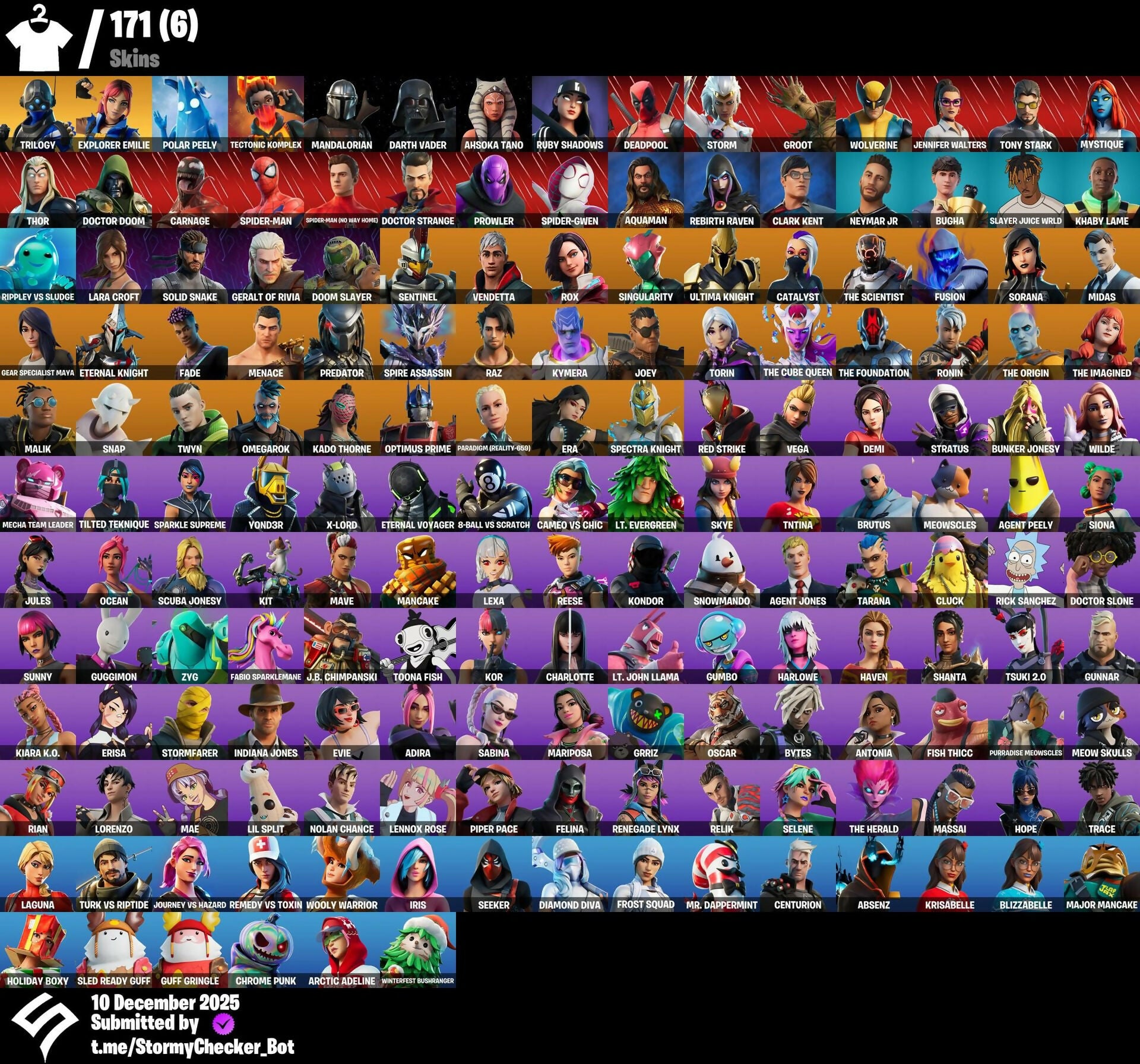 171 Skins | Explorer Emilie | Trilogy | Solid Snake | Mariposa | Grriz | Default Pickaxe | Stun Knife | Lucha Slashers | S11-Badge-3 | S12-Badge-3 | 150 VB
