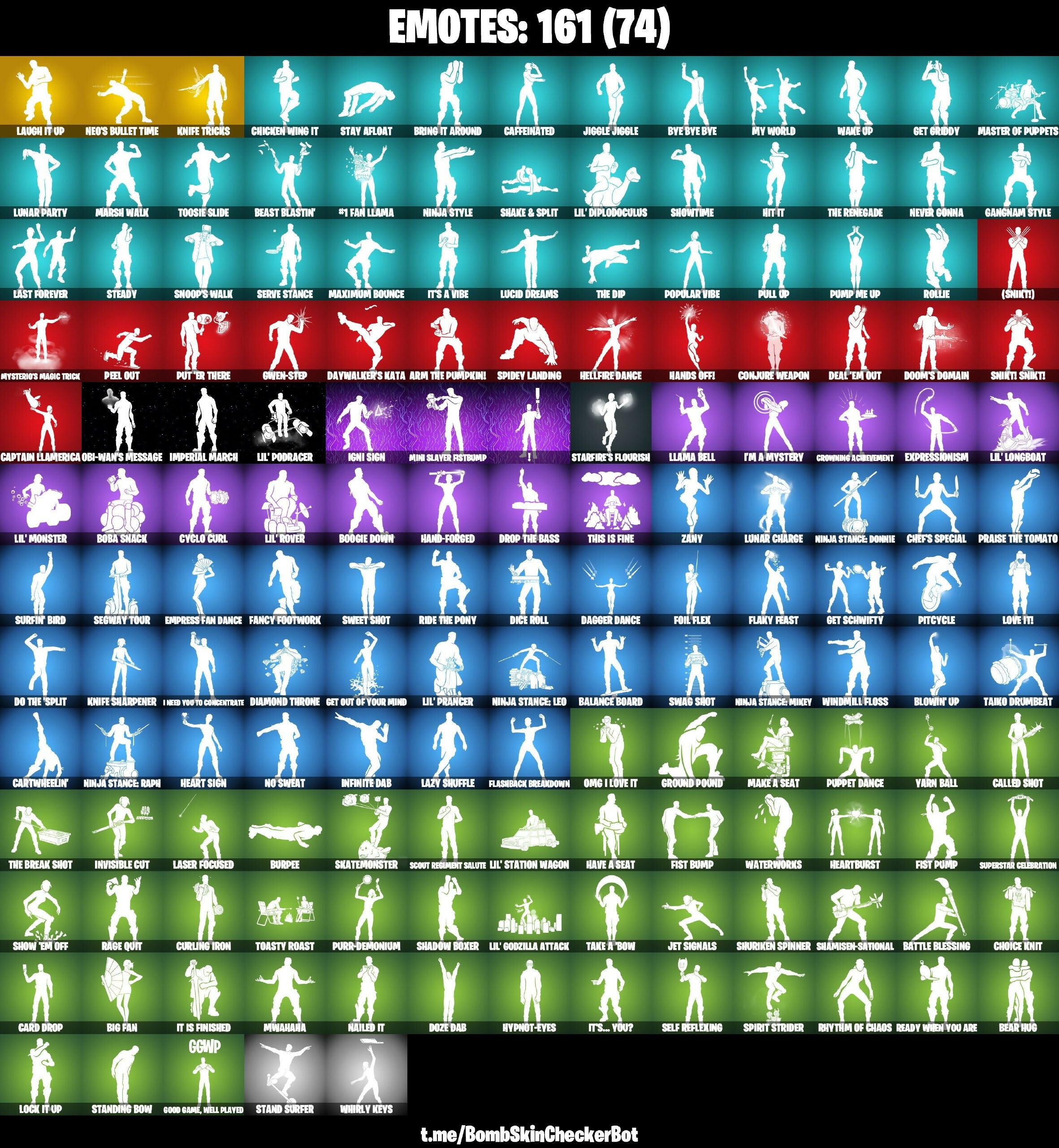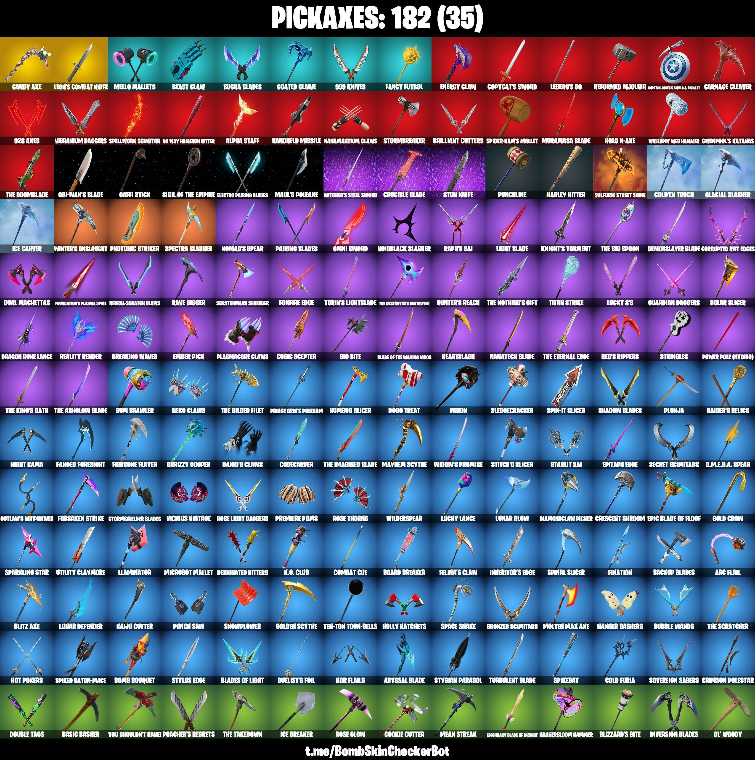 #1 Fan Llama, (Snikt!), 1-Ball, 928 Axes, 999 Knives, AbseNz, Abyssal Blade, Adira, Aftermath, Ahsoka's Clone Trooper, Alpha Staff, Arc Flail, Arctic Adeline, Arm The Pumpkin!, Astrea, Backup Blades, Balance Board, Basic Basher, Battle Blessing, Bear Hug, Beast Blastin', Beast Claw, Beerus, Big Bite, Big Fan, Black Panther, Blade of the Waning Moon, Blades of Light, Blitz Axe, Blizzabelle, Blizzard's Bite, Blowin' Up, Board Breaker, Boba Fett, Boba Snack, Bomb Bouquet, Boogie Down, Breaking Waves, Breezabelle, Brilliant Cutters, Bring It Around, Bronzed Scimitars, Bubble Wands, Budge, Bugha, Bugha Blades, Burpee, Bye Bye Bye, Bytes, Caffeinated, Called Shot, Candy Axe, Captain America's Shield & Pickle, Captain Jones, Captain Llamerica, Captain Marvel, Card Drop, Carnage, Carnage Cleaver, Cartwheelin', Chaos Director, Charlotte, Chef's Special, Chicken Wing It, Choice Knit, Chrome Punk, Clone Trooper, Codecarver, Cold Furia, Cold'en Touch, Color Crush, Combat Cue, Conjure Weapon, Contract Giller, Cookie Cutter, Copycat's Sword, Corrupted Rift Edges, Coruscant Guard, Crescent Shroom, Crimson Polestar, Crowning Achievement, Crucible Blade, Crz-8, Cubic Scepter, Curling Iron, Cyclo Curl, Dagger Dance, Dahlia, Daigo, Daigo's Claws, Darth Maul, Darth Vader, Daywalker's Kata, Deal 'Em Out, Demonslayer Blade, Designated Hitters, Diamond Throne, Diamondclaw Picker, Dice Roll, Do The 'Split, Doctor Strange, Doggy Treat, Doom, Doom Slayer, Doom's Domain, Double Tags, Doze Dab, Dragon Rune Lance, Driftwalker, Drop The Bass, Dual Machettas, Duelist's Foil, Dusty, Dynamo Tintina, Electro Pairing Blades, Ember Pick, Emma Frost, Empress Fan Dance, Energy Claw, Envoy, Epic Blade of Floof, Epitaph Edge, Era, Eren Jaeger, Erisa, Evie, Expressionism, FNCS Champion Seeker, Fabio Sparklemane, Fancy Footwork, Fancy Futbol, Fanged Foresight, Felina, Felina's Claw, Fishbone Flayer, Fishstick, Fist Bump, Fist Pump, Fixation, Flaky Feast, Flashback Breakdown, Focus, Foil Flex, Forsaken Strike, Foundation's Plasma Spike, Foxfire Edge, GUMBO, Gaffi Stick, Gangnam Style, Geralt of Rivia, Get Griddy, Get Out Of Your Mind, Get Schwifty, Glacial Slasher, Goated Glaive, Godzilla Evolved, Gold Crow, Golden Scythe, Good Game, Well Played, Grizz, Grizzly Gooper, Ground Pound, Guardian Daggers, Guff Gringle, Gum Brawler, Gunnar, Gwen Step, Gwenpool, Gwenpool's Katanas, Hand-Forged, Handheld Missile, Hands Off!, Harley Hitter, Harley Quinn, Harlowe, Have A Seat, Haven, Heart Sign, Heartburst, Heartslash, Hellfire Dance, Helsie, Hero Baymax, Highwire, Hit It, Holiday Boxy, Holly Hatchets, Holo X-Axe, Hope, Hot Pokers, Humbug Slicer, Hunter's Reach, Hypnot-Eyes, I Need You To Concentrate, I'm A Mystery, Ice Breaker, Ice Carver, Ice Crystal, Icebound Midas, Igni Sign, Imani, Imperial March, Indiana Jones, Infinite Dab, Inheritor's Edge, Inversion Blades, Invisible Cut, It Is Finished, It's A Vibe, It's... You?, Izuku Midoriya, J.B. Chimpanski, Jackie, Jade, Jet Signals, Jiggle Jiggle, Joltara, K.O. Club, Kaiju Cutter, Kendo, Kiara I.C.O., King Flamingo, Knife Sharpener, Knife Tricks, Knight's Torment, Kor, Kor Flails, Krisabelle, Laminator, Laser Focused, Last Forever, Laugh It Up, Lazy Shuffle, Lebeau's Bo, Leelah, Legendary Blade of Insight, Lennox Rose, Leon's Combat Knife, Light Blade, Lil Split, Lil' Diplodocus, Lil' Godzilla Attack, Lil' Longboat, Lil' Monster, Lil' Podracer, Lil' Prancer, Lil' Rover, Lil' Station Wagon, Lionel Messi, Llama Bell, Lock It Up, Love It!, Loveless, Lt. John Llama, Lucid Dreams, Lucky 8's, Lucky Lance, Lunar Charge, Lunar Defender, Lunar Glow, Lunar Party, MJ (No Way Home), Make A Seat, Malik, Markus, Marsh Walk, Marshmello, Massai, Master Of Puppets, Maul's Poleaxe, Maximum Bounce, Mayhem Scythe, Mean Streak, Mecha Morty, Mega Strike Commander, Mello Mallets, Meow Skulls, Meowdas, Microbot Mallet, Mighty Thor, Mini Slayer Ristpump, Mizuki, Molten Max Axe, Monarch, Montague, Mrbeast6000, Muramasa Blade, Mwahaha, My World, Mysterio's Magic Trick, Mystica, Nailed It, Nanatech Blade, Nanner Bashers, Nannerbloom Hammer, Nanomantium Claws, Neo's Bullet Time, Nero Claws, Neural-Scratch Claws, Neuralynx, Never Gonna, Nezumi, Night Kama, Ninja, Ninja Stance: Donnie, Ninja Stance: Leo, Ninja Stance: Mikey, Ninja Stance: Raph, Ninja Style, Nisha, No Sweat, No Way Home Run Hitter, Nolan Chance, Nomad's Spear, Nyanja, O.M.E.G.A. Spear, Obi-Wan Kenobi, Obi-Wan's Blade, Obi-Wan's Message, Ol' Woody, Omega Knight, Omegakrok, Omg I Love It, Omni Sword, Oscar, Outlaw's Whipknives, P3sly, Pairing Blades, Paradise Meowscles, Paradox (Reality-689), Peel Out, Peelverine, Permafrost Raider, Peter Griffin, Phaedra, Photonic Striker, Piper Pace, Pitcycle, Plasmacore Claws, Plunja, Poacher's Regrets, Polar Peely, Popular Vibe, Power Pole (Nyoibo), Praise The Tomato, Premiere Poms, Prince Orin, Prince Orion's Polearm, Princess Lexa, Prowler, Pull Up, Pump Me Up, Punch Saw, Punchline, Puppet Dance, Purr-Demonium, Put'er There, Rage Quit, Raider's Relics, Raph's Sai, Raphael, Rave Digger, Ready When You Are, Reality Render, Recline Raider, Red Claw, Red's Rippers, Reformed Mjolnir, Relik, Renegade Lynx, Renegade Raider, Renegade Runner, Renzo The Destroyer, Reverb, Rhythm Of Chaos, Rian, Ride The Pony, Rift Knight Kieran, Rollie, Ronin, Rose Glow, Rose Light Daggers, Rose Team Leader, Rose Thorns, Ruby, Runway Racer, Sabina, Santa Dogg, Santa Suit Mariah, Sayara, Scout Regiment Salute, Scratchmark Shredder, Secret Scimitars, Segway Tour, Selene, Self Reflexing, Serve Stance, Shaanta, Shadow Blade Hope, Shadow Blades, Shadow Boxer, Shake & Split, Show 'Em Off, Showtime, Shuriken Spinner, Sigil of the Empire, Skatemonster, Slayer Juice Wrld, Sled Ready Guff, Sledgecracker, Snap, Snikt! Snikt!, Snoop's Walk, Snowplower, Snuggs, Solar Slicer, Solid Snake, Son Goku, Southpaw, Sovereign Sabers, Space Snake, Sparkling Star, Spectra Knight, Spectra Slasher, Spellwork Scimitar, Spider-Ham's Mallet, Spider-Man (Miles Morales), Spi