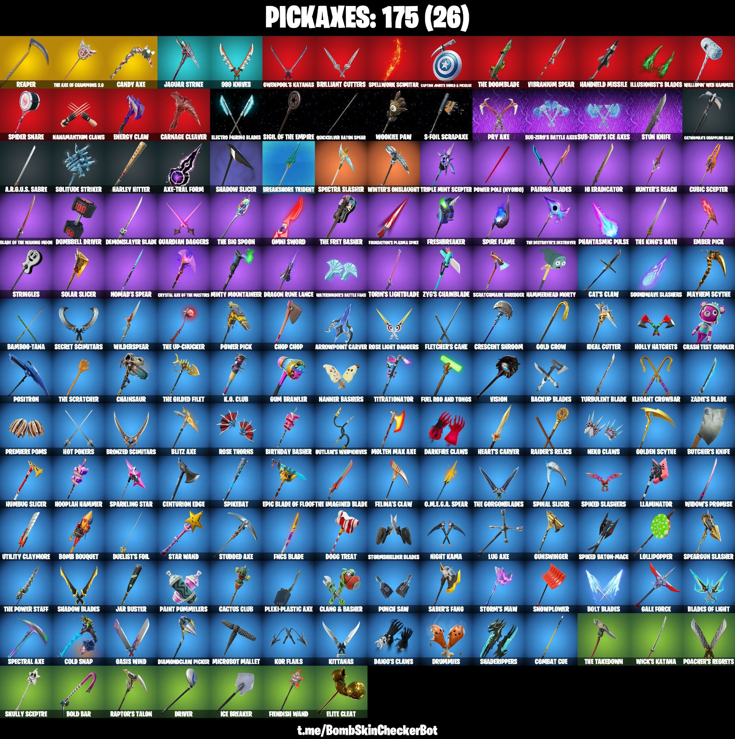 (Snikit), 1-Ball, 10 Eradicator, 999 Knives, A.R.G.U.S. Sabre, Adira, Agent Jones, Aphrodite, Arrowpoint Carver, Artemis, Aura, Avatar's Flourish, Axe-Trail Form, Azarath Metrion Zinthos?, Backup Blades, Bamboo-Tana, Baron's Hoard, Batman Zero, Battle Blessing, Battlehawk, Be Seeing You, Bean Bag, Bear Hug, Beerus, Big Dill, Billy Bounce, Bim Bam Boom, Birthday Basher, Blade of the Waning Moon, Blades of Light, Blitz Axe, Blitz Knight, Blizzabelle, Blowin' Up, Bold Bar, Bolt Blades, Bomb Bouquet, Boneless, Boogie Down, Boots "N" Cats, Breakshore Trident, Brilliant Cutters, Bring It Around, Britesorm Bomber, Bronzed Scimitars, Brush Your Shoulders, Butcher's Knife, Cactus Club, Call Me, Cammy, Candy Axe, Captain America's Shield & Pickle, Captain Jones, Captain Llamerica, Carbide, Card Drop, Cardistry, Carnage, Carnage Cleaver, Cassidy Quinn, Cat's Claw, Catwoman's Grappling Claw, Cauldron Chill, Centurion, Centurion Edge, Cerberus, Chainsaur, Champion Kyra, Champion PJ, Champion Siren, Chaos Director, Charlotte, Chigusa, Choice Knit, Chop Chop, Clang & Basher, Clark Kent, Clean Sweep, Cluck, Cold Snap, Combat Cue, Conch Call, Conjure Weapon, Crash Test Cuddler, Crescent Shroom, Crowning Achievement, Crystal, Crystal Axe of the Masters, Cubic Scepter, Cyclo Curl, Dab, Dagger Dance, Daigo, Daigo's Claws, Dark Bomber, Dark Doggo, Darkfire Claws, Darth Vader, Deep Dab, Demonslayer Blade, Diamond Throne, Diamondclaw Picker, Do The Split, Doctor Slone, Doctor Strange, Dogg Treat, Doom, Doze Dab, Dragon Rune Lance, Dream, Driver, Drummies, Duelist's Card Trick, Duelist's Foil, Dumbbell Driver, Dummy, Dynamo, Dynamo Tntina, Electro Pairing Blades, Elegant Crowbar, Elite Cleat, Ember Pick, Emma Frost, Energy Claw, Envoy, Epic Blade of Floof, Era, Erisa, Evasive Maneuvers, Evie, Explorer Emilie, FNGs Blade, Fabio Sparklemane, Felina, Felina's Claw, Fiendish Wand, Finger Wag, Fireworks Salvo, Fist Bump, Flashback Breakdown, Fletcher Kane, Fletcher's Cane, Flex On 'Em, Flippin' Away, Flippin' Sexy, Focus, Focused, Foil Flex, Foundation's Plasma Spike, Fresh Aura, Freshbreaker, Frozen Love Ranger, Frozen Raven, Frozen Red Knight, Frozen Treat Cart, Fuel Rod and Tongs, Gale Force, Gangnam Style, Gentleman's Dab, Get Griddy, Get Out Of Your Mind, Ghoul Trooper, Goated, Gold Crow, Golden Scythe, Good Guy, Good Sportsmanship, Guardian Daggers, Guggimon, Gum Brawler, Gumbo, Gunnar, Gunslinger Calamity, Gunswinger, Gwen-Step, Gwenpool, Gwenpool's Katanas, Hammerhead Morty, Hand-Forged, Handheld Missile, Harley Hitter, Harlowe, Haven, Hawk Classic, Haze, Heart Sign, Heart's Carver, Hellfire Dance, Hero Baymax, Hit It, Holiday Boxy, Holly Hatchets, Hooplah Hammer, Hope, Hot Pokers, Hot Stuff, Humbug Slicer, Hunter's Reach, Huntmaster Saber, Hype!, I'm A Mystery, Ice Breaker, Ideal Cutter, Illusionist's Blades, Imperial March, Incinerator Kuno, Invisible Cut, It Is Finished, It's A Vibe, It's Chemistry!, It's... You?, J.B. Chimpanski, Jabba Switchway, Jade, Jaguar Strike, Jar Buster, Jet Signals, Job Well Done, Joey, Joltara, Jonesy The First, Joss, K.O. Club, Kakashi Hatake, Keisha Cross, Kendo, Kiara K.O., Kick Back, Kittanas, Knife Sharpener, Kor, Kor Flails, Korra, Krisabelle, Kuno, Kymera, Lara Croft, Lil Split, Lil' Godzilla Attack, Lil' Longboat, Lil' Monster, Lil' Rover, Lil' Saucer, Lizzik, Llaminator, Log Axe, Lollipopper, Love It!, Lt. John Llama, Lucid Dreams, Lunar Charge, Lustrous Luxe, Major Glory, Make A Seat, Malik, Mayhem Scythe, Meat Grinder, Medusa, Megumi, Meowdas, Microbot Mallet, Mind Blown, Mini Dogfight, Minty Bomber, Minty Mountaineer, Mogul Master (CAN), Molten Max Axe, Molten Ragnarok, Montague, Moonlit Mystery, Mr. Dappermint, Mwahaha, Mysterio, Mysterio's Magic Trick, Nailed It, Nanner Bashers, Nanner Ringer, Nanomantium Claws, Naruto Uzumaki, Nexo Claws, Neymar Jr, Nick Fury, Night Kama, Ninja Stance Donnie, Ninja Stance: Leo, Ninja Stance: Mikey, Ninja Stance: Raph, Nisha, Nog Ops, Nomad's Spear, Nyanja, O.M.E.G.A. Spear, Oasis Wind, Omegarok, Omni Sword, Orange Justice, Original Renegade, Oscar, Outlaw Midas, Outlaw's Mugshot, Outlaw's Strut, Outlaw's Whipknives, Paint Pummelers, Pairing Blades, Party Hips, Peel Out, Peelverine, Peter Griffin, Phantasmic Pulse, Phew!, Pig The Butcher, Plexi-Plastic Axe, Poacher's Regrets, Poised Playmaker, Polar Peely, Popcorn, Popular Vibe, Poseidon, Positron, Power Pick, Power Pole (Nyoibo), Premiere Poms, Prickly Pose, Prowler, Pry Axe, Punch Saw, Puppet Dance, Pura-Demonium, Quicksilver Baton Spear, Raider's Relics, Rapscallion, Raptor's Talon, Raven's Legion, Raz, Ready When You Are, Reaper, Rebirth Raven, Recon Expert, Recon Raptor, Red Card, Red Knight, Relik, Renegade Lynx, Renegade Raider, Revel, Rhythm Of Chaos, Rick Sanchez, Rizzblocks, Roast Lord, Robo-Kevin, Rock Paper Scissors, Rocket Rodeo, Ronin, Rookie Spitfire, Rose Light Daggers, Rose Thorns, Ruan, Ruby Shadows, Runway Racer, S-Foil ScrapaXe, Saber's Fang, Sabina, Safari, Santa Doge, Scarlet Commander, Scarlet Defender, Scorecard, Scorpion, Scratchmark Shredder, Scuba Crystal, Secret Scimitars, Segway Tour, Serpentine Summoning, Shaderbox, Shaderippers, Shadow Blade Hope, Shadow Blades, Shadow Slicer, Shamisen-Sational, Shanta, Shaq Shimmy, Show 'Em Off, Shuri, Shuriken Spinner, Sigil of the Empire, Siren, Ska-Stra-Terrestrial, Skate Monster, Skellemint Oro, Skull Ranger, Skully Sceptre, Slayer Juice Wrld, Slim Shady, Slow Clap, Snap, Snowplower, Social Climber, Socks, Solar Slicer, Solid Snake, Solitude Striker, Son Goku, Soundwave Slashers, Sparkling Star, Sparkplug, Speargun Slasher, Spectra Knight, Spectra Slasher, Spectral Axe, Spellwork Scimitar, Spider Snare, Spiderman Gilded Reality, Spikebat, Spiked Baton-Mace, Spiked Slashers, Spinal Slicer, Spire Assassin, Spire Flame, Spirit Sniper, Spirit Strider, Staff Stand, Stand Surfer, Star Wand, Steady, Storm's Maw, Stormfarer, Stormshielder Blades, Stringles, Studded Axe, Stun Knife, Sub-Zero (MK3), Sub-Zero's Battle Axes
