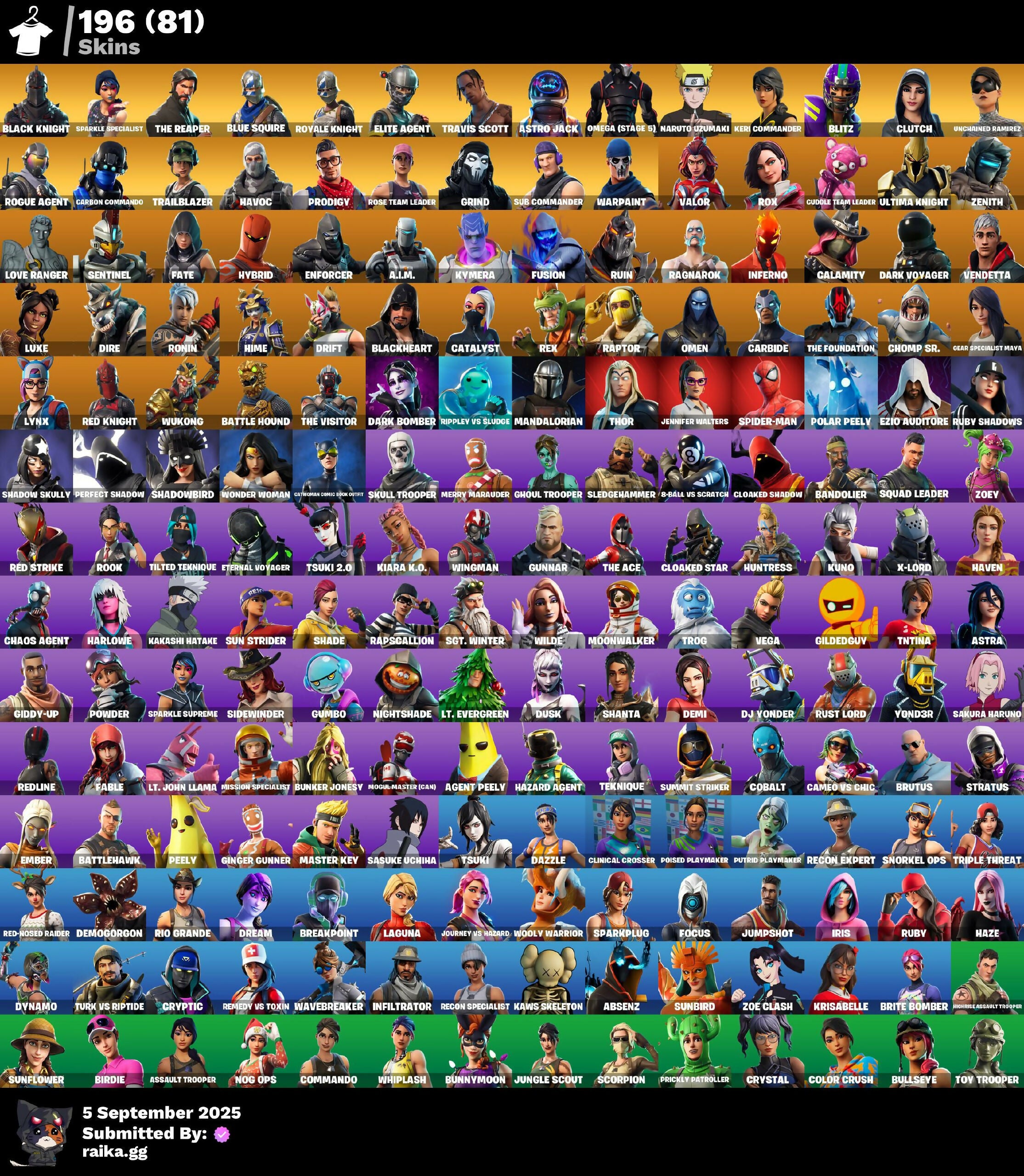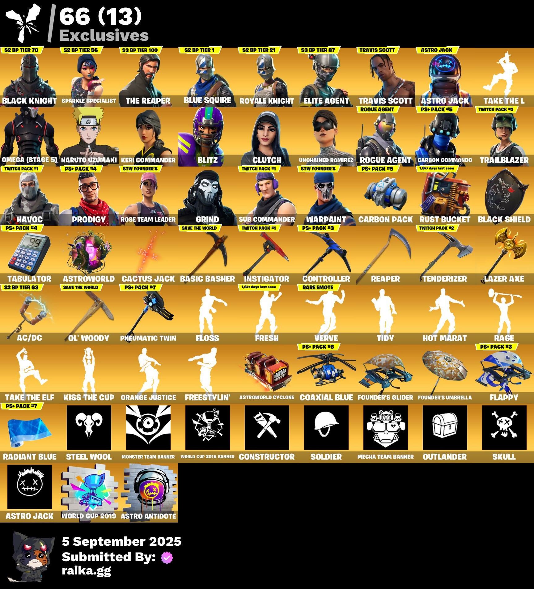 196 skins ✅ OG STW ✅ Black Knight ✅ Travis Scott ✅ Sparkle Specialist ✅ The Reaper ✅ Blue Squire ✅ Royale Knight ✅ Elite Agent ✅ Astro Jack ✅ 650 VB