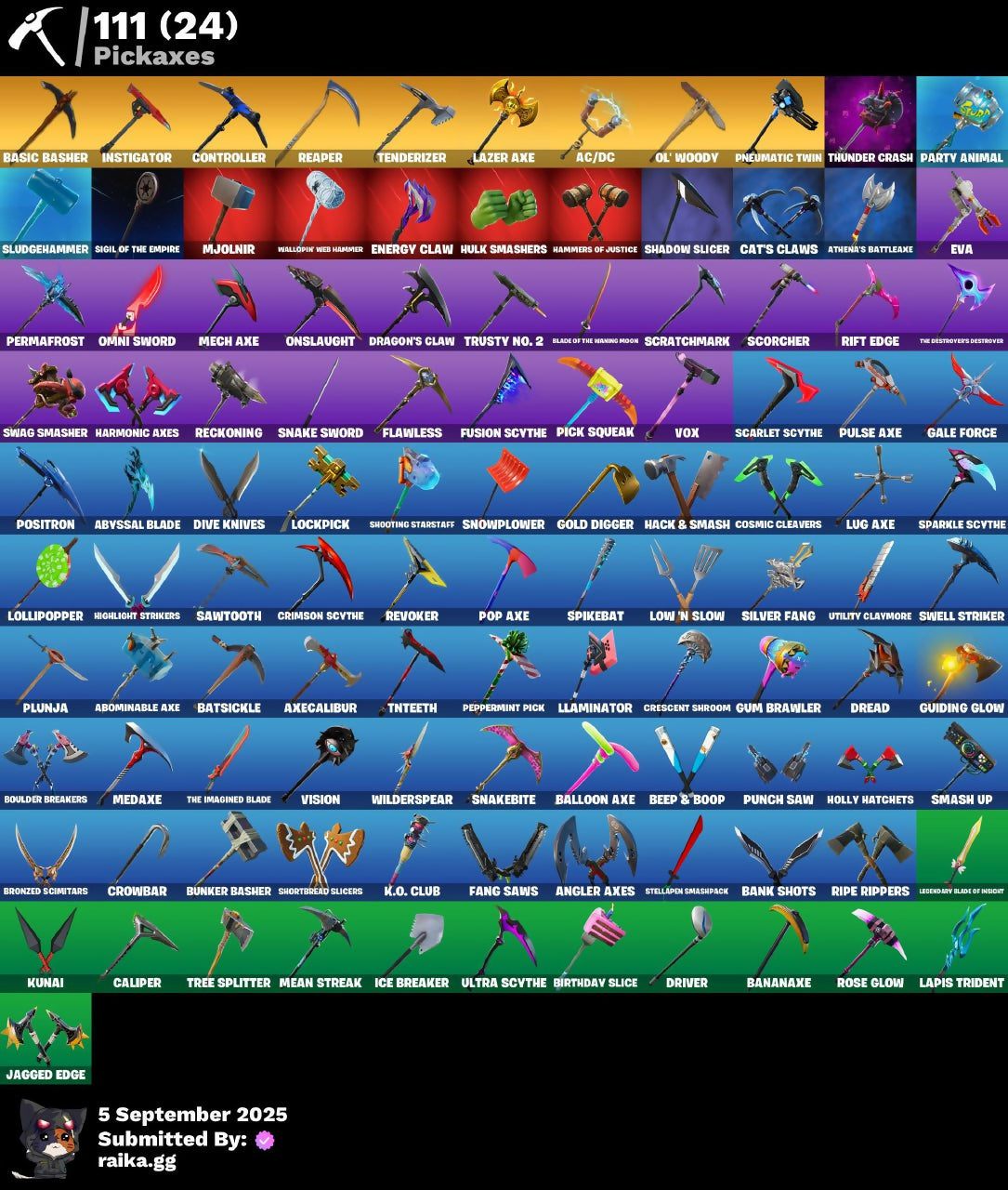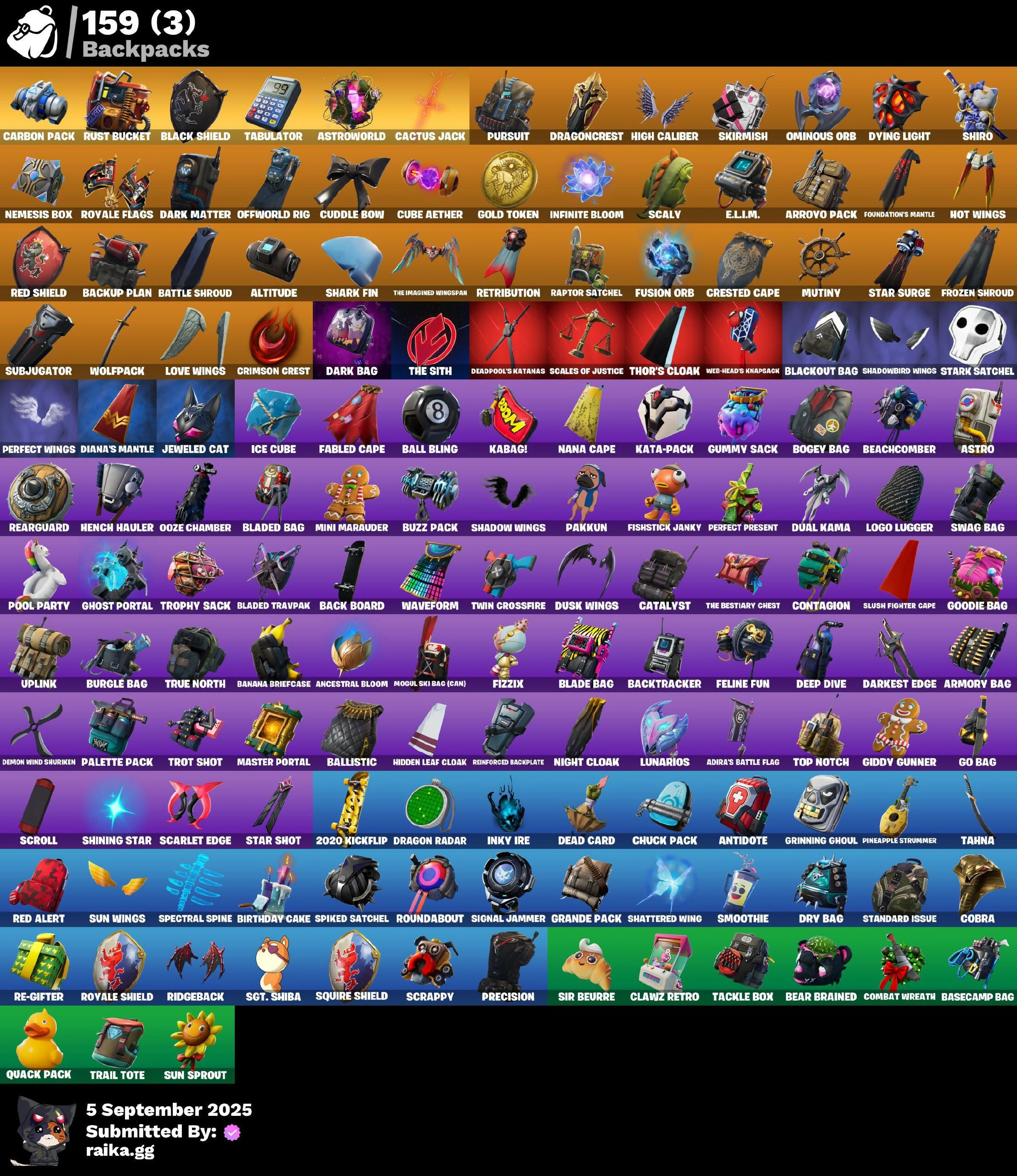 2020 Kickflip, 8-Ball vs Scratch, A.I.M., Abominable Axe, Absenz, Abyssal Blade, Ac/Dc, Adira's Battle Flag, Agent Peely, Altitude, Ancestral Bloom, Angler Axes, Antidote, Armory Bag, Arroyo Pack, Assault Trooper, Astra, Astro, Astro Antidote, Astro Jack, Astroworld, Athena's Battleaxe, Axecalibur, Back Board, Backtracker, Backup Plan, Ball Bling, Ballistic, Balloon Axe, Banana Briefcase, Bananaxe, Bandolier, Bank Shots, Basecamp Bag, Basic Basher, Batsickle, Battle Hound, Battle Shroud, Battlehawk, Beachcomber, Bear Brained, Beep & Boop, Best Mates, Billy Bounce, Birdie, Birthday Cake, Birthday Slice, Black Knight, Black Shield, Blackheart, Blackout Bag, Blade Bag, Blade Of The Waning Moon, Bladed Bag, Bladed Travpak, Blitz, Blowing Bubbles, Blue Squire, Bogey Bag, Boing!, Boogie Down, Boosting Ki, Boulder Breakers, Breakdown, Breakneck, Breakpoint, Breezy, Brite Bomber, Bronzed Scimitars, Brutus, Bullseye, Bunker Basher, Bunker Jonesy, Bunnymoon, Burgle Bag, Buzz Pack, Cactus Jack, Calamity, Calculated, Caliper, Call Me, Cameo vs Chic, Carbide, Carbon Commando, Carbon Pack, Cartwheelin', Cat Flip, Cat's Claws, Catalyst, Catwoman Comic Book Outfit, Chaos Agent, Chicken Wing It, Choice Knit, Chomp Sr., Chuck Pack, Clawz Retro, Clean Sweep, Click!, Clinical Crosser, Cloaked Shadow, Cloaked Star, Cluck Strut, Clutch, Coaxial Blue, Cobalt, Cobra, Color Crush, Combat Wreath, Commando, Conga, Constructor, Contagion, Controller, Cosmic Cleavers, Crescent Shroom, Crested Cape, Crimson Crest, Crimson Scythe, Crowbar, Crowning Achievement, Cryptic, Crystal, Cube Aether, Cuddle Bow, Cuddle Team Leader, Cyclo Curl, DJ Yonder, Dab, Dabstand, Dark Bag, Dark Bomber, Dark Matter, Dark Voyager, Darkest Edge, Dazzle, Dead Card, Deadpool's Katanas, Deep Dive, Deep End, Demi, Demogorgon, Demon Wind Shuriken, Diana's Mantle, Dire, Dive Knives, Don't Start Now, Dragon Radar, Dragon Stance, Dragon's Claw, Dragoncrest, Dread, Dream, Drift, Driver, Droop, Dry Bag, Dual Kama, Dusk, Dusk Wings, Dying Light, Dynamo, E.L.I.M., Elite Agent, Ember, Energy Claw, Enforcer, Eternal Voyager, Eva, Everybody Loves Me, Ezio Auditore, Fable, Fabled Cape, Fang Saws, Fate, Featherweight, Feline Fun, Fierce, Fishstick Janky, Fizzix, Flamenco, Flappy, Flawless, Flippin' Away, Flippin' Sexy, Floss, Focus, Foundation's Mantle, Founder's Glider, Founder's Umbrella, Freestylin', Fresh, Frozen Shroud, Fusion, Fusion Orb, Fusion Scythe, Gale Force, Gear Specialist Maya, Gentleman's Dab, Get Funky, Get Gone, Ghost Portal, Ghoul Trooper, Giddy Gunner, Giddy-Up, Gildedguy, Ginger Gunner, Go Bag, Gold Digger, Gold Token, Golf Clap, Goodie Bag, Grande Pack, Grind, Grinning Ghoul, Groove Jam, Guiding Glow, Gum Brawler, Gumbo, Gummy Sack, Gunnar, Hack & Smash, Hammers Of Justice, Harlowe, Harmonic Axes, Haven, Havoc, Hazard Agent, Haze, Hello Friend, Hench Hauler, Hidden Leaf Cloak, High Caliber, High Five, Highlight Strikers, Hime, Hit It, Holly Hatchets, Hoop Master, Hot Marat, Hot Wings, Hula, Hula Hoopin', Hulk Smashers, Huntress, Hybrid, Hype, Ice Breaker, Ice Cube, Imperial March, Infectious, Inferno, Infiltrator, Infinite Bloom, Inky Ire, Instigator, Iris, Island Vibes, It Is Finished, It's Go Time!, It's... You?, Jagged Edge, Jaywalking, Jennifer Walters, Jeweled Cat, Journey vs Hazard, Jubilation, Jump Jets, Jumpshot, Jungle Scout, K.O. Club, Kabagi, Kakashi Hatake, Kata-Pack, Kaws Skeleton, Keep It Mello, Keri Commander, Kiara K.O., Kiss The Cup, Krisabelle, Kunai, Kuno, Kymera, Laguna, Laid Back Shuffle, Lapis Trident, Lazer Axe, Legendary Blade Of Insight, Lil' Monster, Lil' Saucer, Living Large, Llaminator, Lock It Up, Lockpick, Logo Lugger, Lollipopper, Love It!, Love Ranger, Love Wings, Low 'N Slow, Lt. Evergreen, Lt. John Llama, Lug Axe, Lunar Charge, Lunarios, Luxe, Lynx, Mandalorian, Master Key, Master Portal, Mean Streak, Mech Axe, Medaxe, Merry Marauder, Mic Drop, Mini Marauder, Mission Specialist, Mjolnir, Mogul Ski Bag (CAN), Mogul-Master (Can), Moonwalker, Mutiny, Mwahaha, Nana Cape, Nana Nana, Naruto Uzumaki, Nemesis Box, Never Gonna, Night Cloak, Nightshade, Nog Ops, Offworld Rig, Ol' Woody, Omega (Stage 5), Omen, Ominous Orb, Omni Sword, Onslaught, Ooze Chamber, Orange Justice, Outlander, Pakkun, Palette Pack, Pandemonium, Party Animal, Peace Out, Peely, Peppermint Pick, Perfect Present, Perfect Shadow, Perfect Wings, Permafrost, Pick Squeak, Pineapple Strummer, Plunja, Pneumatic Twin, Poised Playmaker, Polar Peely, Pony Up, Pool Party, Pop Axe, Popcorn, Positron, Powder, Precision, Prickly Patroller, Prodigy, Pulse Axe, Punch Saw, Pursuit, Putrid Playmaker, Quack Pack, Radiant Blue, Rage, Ragnarok, Rapscallion, Raptor, Raptor Satchel, Re-Gifter, Reanimated, Reaper, Rearguard, Reckoning, Recon Expert, Recon Specialist, Red Alert, Red Knight, Red Shield, Red Strike, Red-Nosed Raider, Redline, Regal Wave, Reinforced Backplate, Remedy vs Toxin, Respect, Respect The Peace, Retribution, Revoker, Rex, Ride The Pony, Ridgeback, Rift Edge, Rio Grande, Ripe Rippers, Rippley vs Sludge, Rock Paper Scissors, Rogue Agent, Ronin, Rook, Rose Glow, Rose Team Leader, Roundabout, Rox, Royale Flags, Royale Knight, Royale Shield, Ruby, Ruby Shadows, Ruin, Running Man, Rust Bucket, Rust Lord, Sad Trombone, Sakura Haruno, Salute, Sasuke Uchiha, Savage, Sawtooth, Scales of Justice, Scaly, Scarlet Edge, Scarlet Scythe, Scorcher, Scorpion, Scrappy, Scratchmark, Scroll, Segway Tour, Sentinel, Sgt. Shiba, Sgt. Winter, Shade, Shadow Skully, Shadow Slicer, Shadow Wings, Shadowbird, Shadowbird Wings, Shake & Slash, Shanta, Shaolin Sit-Up, Shark Fin, Sharpshooter, Shattered Wing, Shimmer, Shining Star, Shiro, Shooting Starstaff, Shortbread Slicers, Side Hustle, Sidewinder, Sigil Of The Empire, Sign Spinner, Signal Jammer, Silver Fang, Sir Beurre, Skirmish, Skull, Skull Trooper, Sledgehammer, Slitherin', Slow Clap, Sludgehammer, Slush Fighter Cape, Smash Up, Smoothie, Snake Sword, Snakebite, Snoozefest, Snorkel Ops, Snowplower, Snowshaker, So Squa