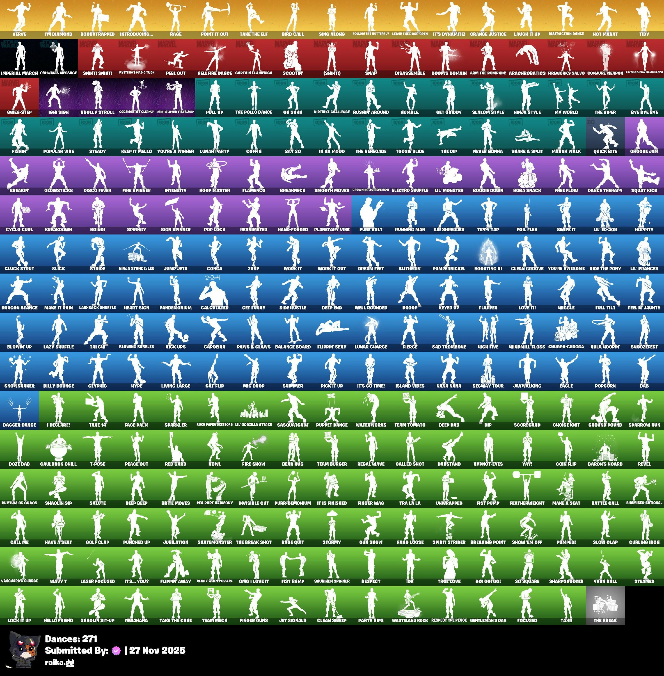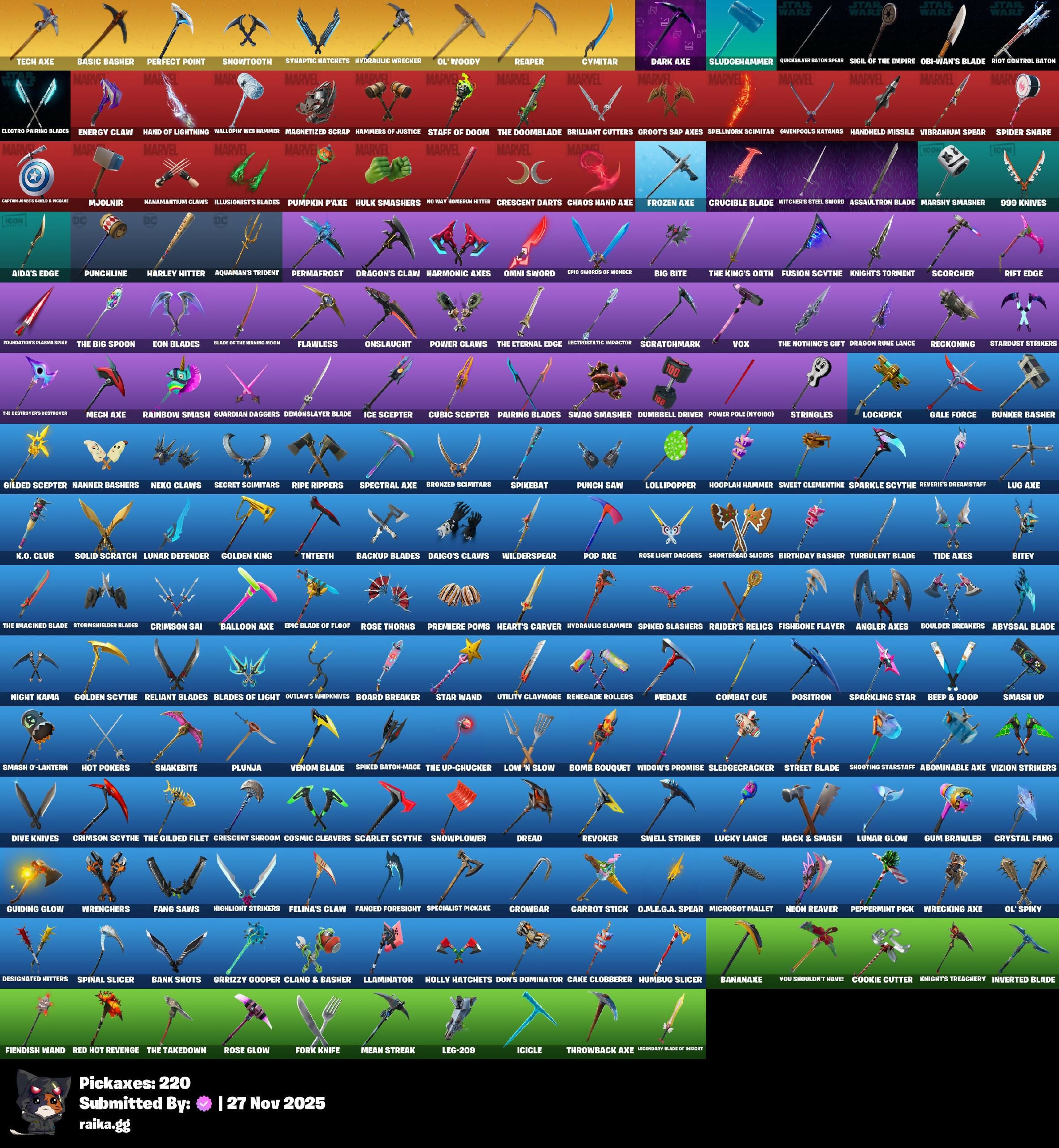 (Snikt!), 1-Ball, 8-Ball vs Scratch, 999 Knives, A.I.M., Abominable Axe, Absenz, Abyssal Blade, Adira, Agent Peely, Aida’s Edge, Air Shredder, Angler Axes, Aquaman, Aquaman’s Trident, Arachrobatics, Arctic Adeline, Arm The Pumpkin, Assaultron Blade, Aura, Backup Blades, Balance Board, Balloon Axe, Bananaxe, Bank Shots, Baron's Hoard, Basic Basher, Battle Call, Battlehawk, Bear Hug, Beep & Boop, Beep Beep, Big Bite, Billy Bounce, Bird Call, Birthday Basher, Bitev, Blackheart, Blade of the Waning Moon, Blades of Light, Blaze, Blowin' Up, Blowing Bubbles, Board Breaker, Boba Snack, Boing!, Bomb Bouquet, Boobytrapped, Boogie Down, Boosting Ki, Boulder Breakers, Breakdown, Breakin', Breaking Point, Breakneck, Brilliant Cutters, Brite Bomber, Brite Moves, Brite Raider, Brolly Stroll, Bronzed Scimitars, Brutus, Bunker Basher, Bunker Jonesy, Bunny Brawler, Bye Bye Bye, Bytes, Cake Clobberer, Calamity, Calculated, Call Me, Called Shot, Cameo vs Chic, Capoeira, Captain America’s Shield & Pickaxe, Captain Clamerica, Captain Jones, Carbide, Carrot Stick, Cat Flip, Catalyst, Cauldron Chill, Chaos Director, Chaos Double Agent, Chaos Hand Axe, Charlotte, Chica, Choice Knit, Chrome Punk, Chugga-Chugga, Chun-Li, Clang & Basher, Clean Groove, Clean Sweep, Cloud Striker, Cluck Strut, Cobalt, Codsworth's Cleanup, Coffin, Coin Flip, Combat Cue, Commando, Conga, Conjure Weapon, Cookie Cutter, Corrupted Voyager, Cosmic Cleavers, Crescent Darts, Crescent Shroom, Crimson Sai, Crimson Scythe, Crowbar, Crucible Blade, Crystal, Crystal Fang, Cubic Scepter, Cuddle Team Leader, Curling Iron, Cvmitar, Cyclo Curl, DJ Yonder, Dab, Dabstand, Dagger Dance, Daigo, Daigo’s Claws, Dance Therapy, Dark Axe, Dark Bomber, Dark Doggo, Dark Jonesy, Dark Red Knight, Dark Wild Card, Darth Vader, Deadpool, Deep Dab, Deep End, Demi, Demogorgon, Demonslayer Blade, Derby Dynamo, Designated Hitters, Dip, Dire, Dirtbike Challenge, Disassemble, Disco Fever, Distraction Dance, Dive Knives, Doctor Doom, Doctor Strange, Don’s Dominator, Doom, Doom Slayer, Doom's Domain, Double Agent Blackbird, Double Agent Hush, Doze Dab, Dragon Rune Lance, Dragon Stance, Dragon’s Claw, Dread, Dream Feet, Drift, Droop, Dumbbell Driver, Dusk, Dusk Knight, Dusty, Dynamo Tntina, Eagle, Electro Pairing Blades, Electro Shuffle, Electrostatic Impactor, Ember, Emma Frost, Energy Claw, Enforcer, Eon Blades, Epic Blade of Floof, Epic Swords of Wonder, Erisa, Eternal Knight, Eternal Voyager, Evie, Fable, Face Palm, Fade, Fang Saws, Fanged Foresight, Featherweight, Feelin' Jaunty, Felina, Felina’s Claw, Fiendish Wand, Fierce, Finger Guns, Finger Wag, Fire Show, Fire Spinner, Fireworks Salvo, Fishbone Flayer, Fishin', Fishstick, Fist Bump, Fist Pump, Flamenco, Flapper, Flawless, Flippin' Away, Flippin' Sexy, Focused, Foil Flex, Follow The Butterfly, Fork Knife, Foundation’s Plasma Spike, Free Flow, Frozen Axe, Full Tilt, Fusion, Fusion Scythe, Galaxy Scout, Gale Force, Gear Specialist Maya, Gentleman's Dab, Geralt of Rivia, Get Funky, Get Griddy, Giddy-Up, Gilded Scepter, Ginger Gunner, Glowsticks, Glyphic, Go! Go! Go!, Godzilla Evolved, Gold Midas, Golden King, Golden Scythe, Golf Clap, Green Goblin, Grizzly Gooper, Groot, Groot’s Sap Axes, Groove Jam, Ground Pound, Grriz, Guardian Daggers, Guiding Glow, Gum Brawler, Gumbo, Gun Show, Gunnar, Gwen-Step, Gwenpool, Hack & Smash, Hammers of Justice, Hand of Lightning, Hand-Forged, Handheld Missile, Hang Loose, Harley Hitter, Harley Quinn, Harlowe, Harmonic Axes, Have A Seat, Haven, Heart Sign, Hearts Carver, Hellfire Dance, Hello Friend, Helsie, Hero Baymax, High Five, Highlight Strikers, Holiday Boxy, Holly Hatchets, Hood Master, Hooplah Hammer, Hoppity, Hot Marat, Hot Pokers, Howl, Hula Hoopin', Hulk Smashers, Humble., Humbug Slicer, Huntress, Hybrid, Hydraulic Slammer, Hydraulic Wrecker, Hype, Hypnot-Eyes, I Declare!, I'm Diamond, IDK, Ice Scepter, Ice Spice, Icicle, Igni Sign, Illusionist’s Blades, Imperial March, In Ha Mood, Inferno, Intensity, Introducing..., Inverted Blade, Invisible Cut, Iris, Island Vibes, It Is Finished, It's Dynamite!, It's Go Time!, It's... You?, Jack Sparrow, Jade, Jaywalking, Jennifer Walters, Jet Signals, Joltara, Journey vs Hazard, Jubilation, Jules, Jump Jets, K.O. Club, Kayt Diaz, Keep It Mello, Kendo, Keyed Up, Kiara K.O., Kick Ups, Kit, Knights Torment, Knight’s Treachery, Krisabelle, Laid Back Shuffle, Laser Focused, Laugh It Up, Lazy Shuffle, Leave The Door Open, Leg-209, Legendary Blade of Insight, Lennox Rose, Lil' Ed-209, Lil' Godzilla Attack, Lil' Monster, Lil' Prancer, Living Large, Lizzik, Llaminator, Lock It Up, Lockpick, Lollipopper, Love It!, Low ‘N Slow, Lt. Evergreen, Lt. John Llama, Lucky Lance, Lug Axe, Lunar Charge, Lunar Defender, Lunar Glow, Lunar Party, Luxe, Lynx, MJ (No Way Home), Magnetized Scrap, Major Mancake, Make A Seat, Make It Rain, Malik, Marcus Fenix, Marsh Walk, Marshy Smasher, Massai, Master Key, Mean Streak, Mech Axe, Medaxe, Megalo Don, Meow Skulls, Meowdas, Meowscles, Merry Marauder, Mic Drop, Microbot Mallet, Mini Slayer Fistbump, Mjolnir, Moon Knight, Mr. Meeseeks, Mwahaha, My World, Mysterio, Mysterio's Magic Trick, Nana Nana, Nanner Bashers, Naramantium Claws, Nathan Drake, Neko Claws, Neon Reaver, Never Gonna, Nezumi, Night Kama, Nightshade, Ninja Stance: Leo, Ninja Style, No Way Homerun Hitter, Nog Ops, Nyanja, O.M.E.G.A. Spear, OMG I Love It, Obi-Wan Kenobi, Obi-Wan's Message, Obi-Wan’s Blade, Ocean, Oh Shhh, Ol’ Spiky, Ol’ Woody, Omega, Omega Knight, Omni Sword, Onesie, Onslaught, Orange Justice, Outlaw’s Whipknives, Owenpools Katanas, PJ Patroller, Pairing Blades, Pandemonium, Par Patroller, Paradox (Reality-459), Party Hips, Paws & Claws, Pea Part Harmony, Peabody, Peace Out, Peel Out, Peelverine, Peely, Peppermint Pick, Perfect Point, Perfect Shadow, Permafrost, Pick It Up, Planetary Vibe, Plastic Patroller, Plunja, Point It Out, Polar Peely, Pop Axe, Pop Lock, Popcorn, Popular Vibe, Positron, Powder, Power Cla