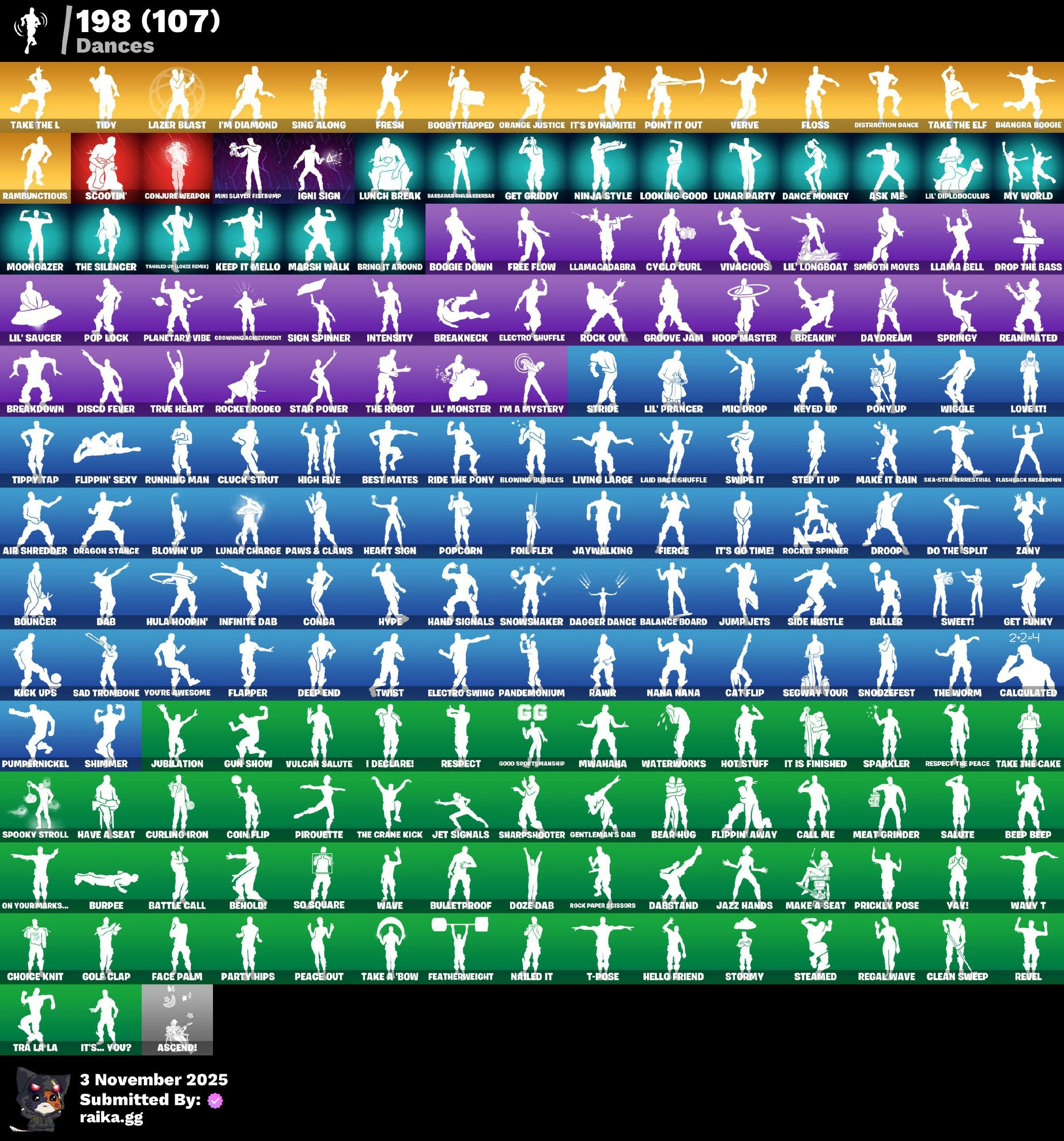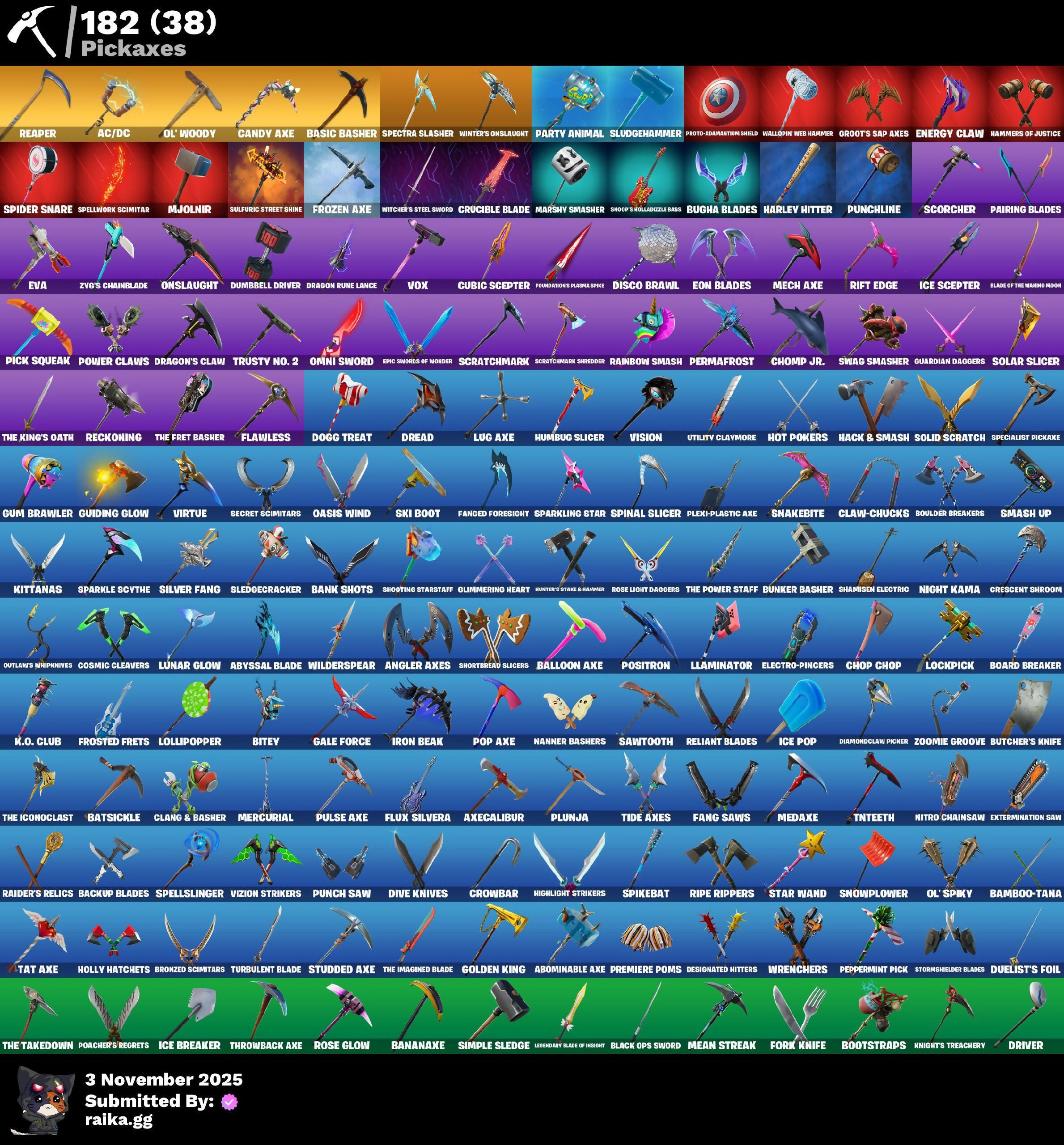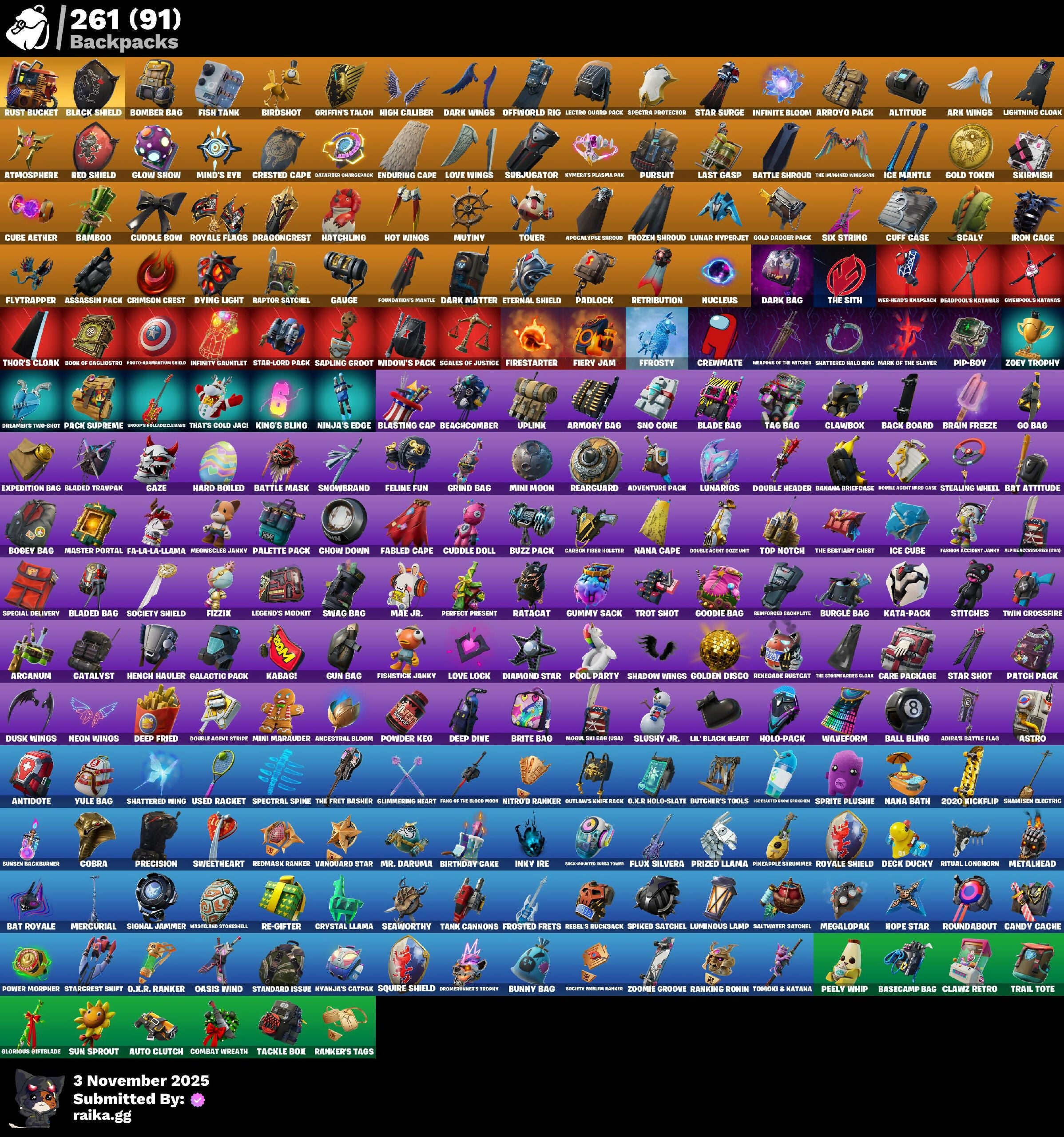 2020 Kickflip, 8-Ball vs Scratch, Abominable Axe, Absenz, Absolute Zero, Abstrakt, Abyssal Blade, Ac/Dc, Adira, Adira's Battle Flag, Adventure Pack, Agent Peely, Air Shredder, Alpine Accessories (USA), Alpine Ace (USA), Altitude, Ancestral Bloom, Angler Axes, Antidote, Apocalypse Shroud, Arcanum, Arctic Adeline, Arctic Assassin, Ark, Ark Wings, Armory Bag, Arroyo Pack, Ascend!, Ask Me, Assassin Pack, Astro, Astro Jack, Astroworld Cyclone, Atmosphere, Aura, Auto Clutch, Axecalibur, B.R.U.T.E. Gunner, Back Board, Backup Blades, Balance Board, Ball Bling, Baller, Balloon Axe, Bamboo, Bamboo-Tana, Banana Briefcase, Bananaxe, Bandolier, Bank Shots, Barbara's Rosa is a Barbara, Basecamp Bag, Basic Basher, Bat Attitude, Bat Royale, Batsickle, Battle Bus, Battle Call, Battle Hound, Battle Mask, Battle Shroud, Battlehawk, Beachcomber, Bear Hug, Beef Boss, Beep Beep, Behold!, Best Mates, Bhangra Boogie, Birdshot, Birthday Cake, Bitey, Black Knight, Black Ops Sword, Black Shield, Black Widow Outfit, Blackheart, Blade Bag, Blade Of The Waning Moon, Bladed Bag, Bladed Travpak, Blasting Cap, Blaze, Blizzabelle, Blowin' Up, Blowing Bubbles, Blue Squire, Board Breaker, Bogey Bag, Bomber Bag, Boobytrapped, Boogie Down, Book of Cagliostro, Bootstraps, Boulder Breakers, Bouncer, Brain Freeze, Breakdown, Breakin', Breakneck, Breakpoint, Bring It Around, Brite Bag, Brite Bomber, Brite Gunner, Bronzed Scimitars, Brutus, Buccaneer, Bugha, Bugha Blades, Bulletproof, Bunker Basher, Bunker Jonesy, Bunny Bag, Bunsen Backburner, Burgle Bag, Burpee, Butcher's Knife, Butcher's Tools, Buzz Pack, C3S2 Contender III, Calamity, Calculated, Call Me, Cameo vs Chic, Candy Axe, Candy Cache, Captain America, Carbide, Carbon Fiber Holster, Care Package, Catalyst, Catflip, Chaos Double Agent, Chica Was Here, Choice Knit, Chomp Jr., Chop Chop, Chow Down, Chromium, Clang & Basher, Claw-Chucks, Clawbox, Clawz Retro, Clean Sweep, Clinical Crosser, Cloaked Shadow, Cluck Strut, Clutch, Cobalt, Cobra, Coin Flip, Combat Wreath, Commando, Conga, Conjure Weapon, Constructor, Cosmic Cleavers, Cozy Commander, Crackshot, Crescent Shroom, Crested Cape, Crewmate, Crimbles, Crimson Crest, Crowbar, Crucible Blade, Cryptic, Crystal, Crystal Llama, Cube Aether, Cubic Scepter, Cuddle Bow, Cuddle Doll, Cuddle Team Leader, Cuff Case, Curling Iron, Cyclo Curl, DJ Bop, DJ Yonder, Dab, Dabstand, Dagger Dance, Dance Monkey, Dark Bag, Dark Bomber, Dark Matter, Dark Voyager, Dark Wings, Daydream, Dazzle, Deadpool, Deadpool's Katanas, Deck Ducky, Deep Dive, Deep End, Deep Fried, Demi, Designated Hitters, Diamond Star, Diamondclaw Picker, Disco Brawl, Disco Fever, Distraction Dance, Dive Knives, Do The 'Split, Doctor Strange, Dogg Treat, Doggo, Doom Slayer, Double Agent Hard Case, Double Agent Midas, Double Agent Ooze Unit, Double Agent Stripe, Double Agent Wildcard, Double Header, Doze Dab, Dragon Rune Lance, Dragon Stance, Dragon's Claw, Dragoncrest, Dread, Dream, Dreamer's Two-Shot, Drift, Driver, DromeRunner's Trophy, Droop, Drop The Bass, Duelist's Foil, Dumbbell Driver, Dusk Wings, Dusty, Dying Light, Electro Shuffle, Electro Swing, Electro-Pincers, Elite Agent, Elite's Sigil, Ember, Enduring Cape, Energy Claw, Enforcer, Eon Blades, Epic Swords Of Wonder, Erisa, Eternal Knight, Eternal Shield, Eternal Voyager, Eva, Evie, Expedition Bag, Extermination Saw, Fa-La-La-Llama, Fable, Fabled Cape, Face Palm, Fade, Fang Saws, Fang of the Flood Moon, Fanged Foresight, Fashion Accident Janky, Featherweight, Feline Fun, Ffrosty, Fierce, Fiery Jam, Firestarter, Fireworks Team Leader, Fish Tank, Fishstick Janky, Fizzix, Flapper, Flashback Breakdown, Flawless, Flippin' Away, Flippin' Sexy, Floss, Flux Silvera, Flytrap, Flytrapper, Foil Flex, Fork Knife, Foundation's Mantle, Foundation's Plasma Spike, Founder's Glider, Founder's Umbrella, Free Flow, Fresh, Frosted Frets, Frozen Axe, Frozen Shroud, Funk Ops, Galactic Pack, Galaxy Scout, Gale Force, Garrison, Gauge, Gaze, Gear Specialist Maya, Gentleman's Dab, Geralt of Rivia, Get Funky, Get Griddy, Giddy-Up, Glimmering Heart, Glorious Giftblade, Glow Show, Go Bag, Gold Dagger Pack, Gold Midas, Gold Token, Golden Disco, Golden King, Golf Clap, Good Sportsmanship, Goodie Bag, Griffin's Talon, Grind, Grind Bag, Groot, Groot's Sap Axes, Groove Jam, Guardian Daggers, Guggimon, Guiding Glow, Gum Brawler, Gumbo, Gummy Sack, Gun Bag, Gun Show, Gunnar, Gwenpool's Katanas, Hack & Smash, Hammers Of Justice, Hand Signals, Hard Boiled, Harley Hitter, Harley Quinn, Harlowe, Hatchling, Have A Seat, Haven, Heart Sign, Heartbreaker, Hello Friend, Hench Hauler, High Caliber, High Five, Highlight Strikers, Holly Hatchets, Holo-Pack, Hoop Master, Hope, Hope Star, Hopper, Hot Pokers, Hot Stuff, Hot Wings, Hula Hoopin', Humbug Slicer, Hunter's Stake & Hammer, Huntress, Hybrid, Hype, I Declare!, I'm A Mystery, I'm Diamond, Ice Breaker, Ice Cube, Ice Mantle, Ice Pop, Ice Scepter, Ice-Icicles' Bone Crownhorn, Igni Sign, Indiana Jones, Infinite Bloom, Infinite Dab, Infinity Gauntlet, Inky Ire, Intensity, Iris, Iron Beak, Iron Cage, It Is Finished, It's Dynamite!, It's Go Time!, It's... You?, Jack Gourdon, Jaywalking, Jazz Hands, Jennifer Walters, Jet Signals, Joey, John Wick, Joltara, Jonesy The First, Journey vs Hazard, Joy, Jubilation, Jules, Jump Jets, K.O. Club, Kabag!, Kata-Pack, Keep It Mello, Keyed Up, Kiara K.O., Kick Ups, King's Bling, Kit, Kittanas, Knight's Treachery, Krisabelle, Kymera, Kymera's Plasma Pak, Lace, Laguna, Laid Back Shuffle, Last Gasp, Lazer Blast, LeBron James, Lectro Guard Pack, Legend's Modkit, Legendary Blade Of Insight, Leviathan, Lightning Cloak, Lil Split, Lil Whip, Lil' Black Heart, Lil' Diplodocus, Lil' Longboat, Lil' Monster, Lil' Prancer, Lil' Saucer, Living Large, Llama Bell, Llamacadabra, Llaminator, Lockpick, Lollipopper, Looking Good, Love It!, Love Lock, Love Ranger, Love Wings, Lt. Evergreen, Lt. John Llama, Lug Axe, Luminous Lamp, Lunar Charge, Lunar Glow, Lunar Hyperjet, Lunar Party, Lunarios, Lun