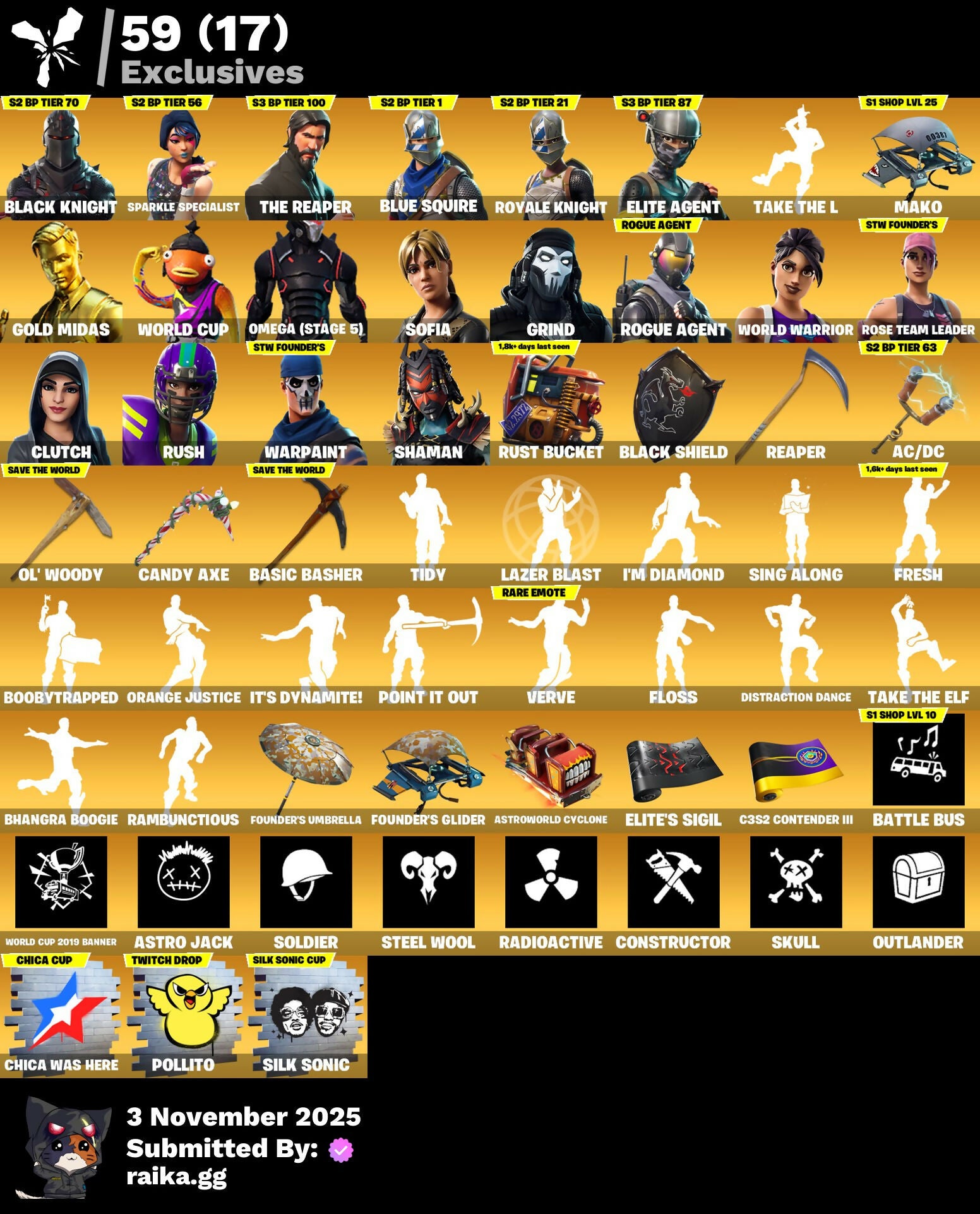 269 skins ✅ OG STW ✅ Black Knight ✅ Sparkle Specialist ✅ The Reaper ✅ Blue Squire ✅ Royale Knight ✅ Elite Agent ✅ Gold Midas ✅ WORLD CUP ✅ 100 VB