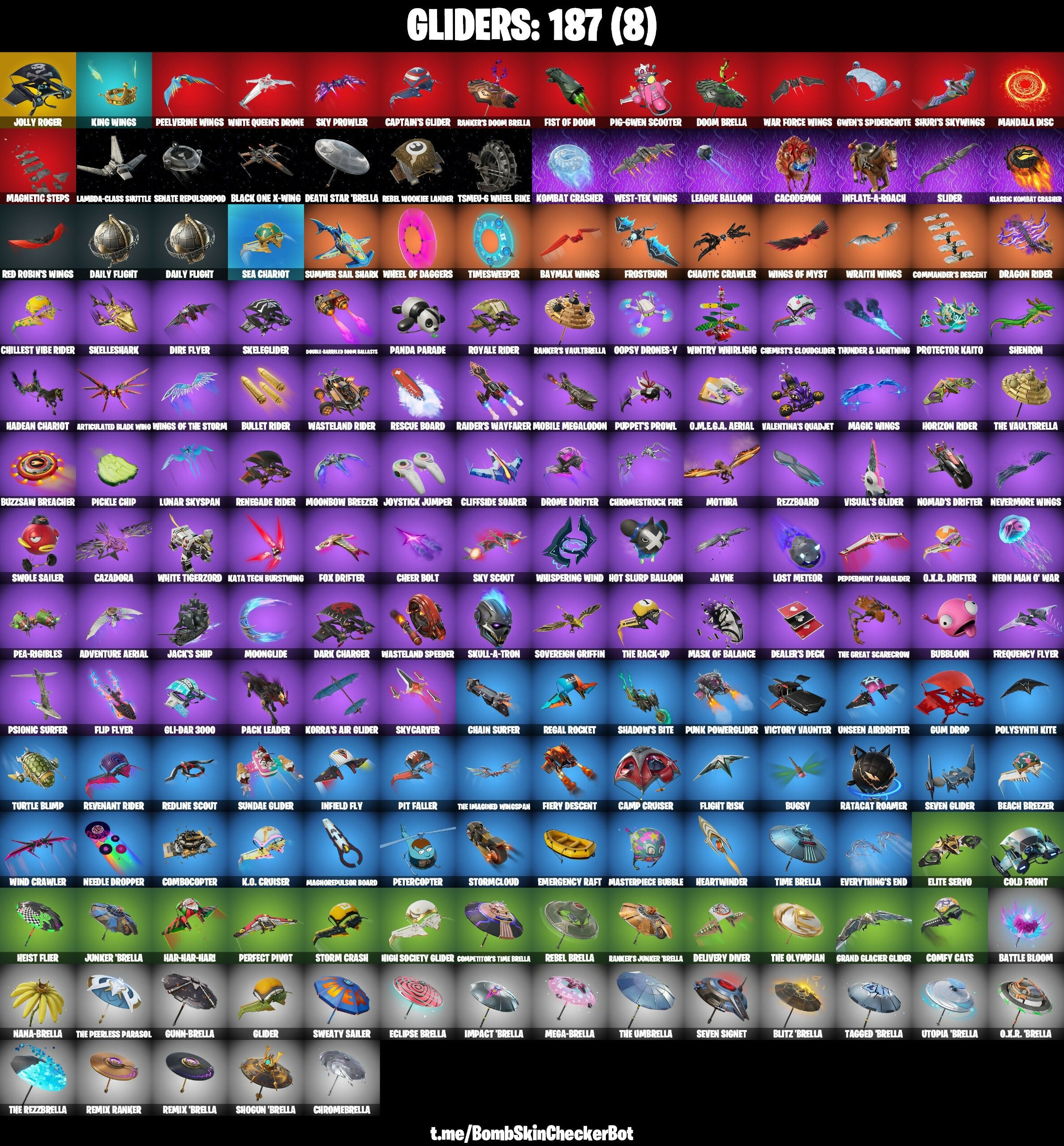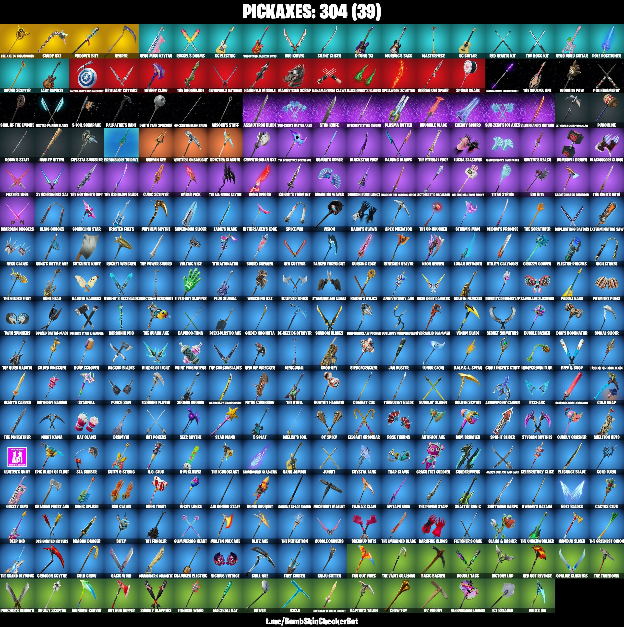 (Snikt!), 1-Ball, 999 Knives, Aang, Adira, Adventure Aerial, Aerial Assault Bomber, Agent Patch, Ahsoka Tano, Ahsoka's Staff, Air Horn, Air Nomad Staff, Alias, Amazing Cube, Anniversary Axe, Antonia, Apex Predator, Aphrodite, Apprentice Evie, Arachorobatics, Arcane Research, Arctic Adeline, Arm The Pumpkin!, ArrowPoint Carver, Artemis, Articulated Blade Wing, Artifact Axe, Ascend!, Assaultron Blade, Augury, Aura, Avatar's Flourish, Aw, Shucks., Axion Sentinel, Ayla Winn, B Splat, Backup Blades, Baguli, Balance Board, Bamboo-Tana, Baron's Hoard, Basic Basher, Battle Blessing, Battle Bloom, Battle Gamer Mae, Baymax Wings, Beach Breezer, Bear Hug, Beatzbunny, Beep & Boop, Bench Upgrade, Bernie, Bhangra Boogie, Big Bite, Big Dill, Big Fan, Bike To Go, Bird Call, Birdarang Flourish, Birthday Basher, Bitey, Bizcochito, Black One X-Wing, Blackstar Edge, Blade of the Waning Moon, Blades of Light, Blaze, Blitz 'Brella, Blitz Axe, Blitz Knight, Bloomin' Bouquet, Blowin' Up, Board Breaker, Boardwalk Ruby, Boba Shack, Bolt Blades, Bomb Bouquet, Bone Breaker, Bone Head, Boogie Down, Boosting Ki, Bounce Wit It, Bow Go, Branded Brawler, Breakin', Breaking Waves, Breakshore Trident, Breakup Bats, Brilliant Cutters, Brite Moves, Brite Raider, Bruno Mars, Bubble Basher, Bubbloon, Bublin Sludge, Bugsy, Bullet Rider, Burn Bright, Butcher's Knife, Buzz Beat, Buzzsaw Breacher, Bytes, Cacodemon, Cactus Club, Called Shot, Camp Cruiser, Candy Axe, Caper, Captain Jones, Captain Llamerica, Captain Phasma, Captain's Glider, Card Drop, Carmine Rosso, Cassidy Quinn, Cauldron Chill, Cazadora, Celebratory Slice, Cerberus, Chain Surfer, Challenger's Staff, Championship Jonesy, Chaos Director, Chaos Double Agent, Chaotic Crawler, Charging Up, Check The Map, Cheer Bolt, Chef's Special, Chemist's Cloudglider, Chewy Toy, Chill Challenger, Chill-Axe, Chillest Vibe Rider, Chrome Punk, Chromebrella, Chromestruck Fire, Clang & Basher, Claw-Chucks, Cliffside Soarer, Cold Front, Cold Furia, Cold Snap, Color Crush, Combat Cue, Combocopter, Comfy Cats, Commander's Descent, Competitor's Time Brella, Conch Call, Conjure Weapon, Controller Crew, Count It!, Cozy Chomps, Crack It, Crash Test Cuddler, Crazyboy, Crimson Scythe, Crowning Achievement, Crucible Blade, Crystal Fang, Crystal Smasher, Cubic Scepter, Cuddle Carvers, Cuddlepool, Cuddly Crusher, Curling Iron, Cybertronian Axe, Cyclo Curl, Dab, Dagger Dance, Daigo, Daigo's Claws, Daily Flight, Dalgona Destroyer, Dali, Dance Monkey, Danica, Dara, Dark Charger, Dark Doggo, Darkfire Claws, Darth Vader, Ddakji Defender, De-Rezz De-Stroyer, Dealer's Deck, Death Star 'Brella, Death Star Smasher, Deep Dab, Deep End, Delivery Diver, Designated Hitters, Desirable, Diamond Throne, Diamondclaw Pick, Dice Roll, Die White A Smile Bruno, Die With A Smile, Dill With It, Dino Megazord, Dip, Dire Flyer, Dirtbike Challenge, Disassemble, Do The 'Split, Doctor Strange, Dogg Treat, Don's Dominator, Doom, Doom Brella, Doom Slayer, Double Agent Hush, Double Agent Wildcard, Double Tags, Double-Barreled Doom Ballast, Doze Dab, Dragon Dagger, Dragon Rider, Dragon Rune Lance, Dramatic Flares, Dramyin, Driver, Drome Drifter, Duelist's Card Trick, Duelist's Foil, Dumbrell Driver, Dune Scooper, Dupli-Kate, Duplicates, Duplicating Batons, Durr Taisho, Dusty, Dynamo Dancer, Dynamo Titania, Echo, Eclipse Brella, Eclipsed Edges, Electro Pairing Blades, Electro-Pincers, Electrostatic Impactor, Elegance Blade, Elegant Crowbar, Elite Servo, Ember Pick, Emergency Raft, Emma Frost, Emperor Palpatine, Empress Fan Dance, Energy Claw, Energy Sword, Epic Blade of Floof, Epitaph Edge, Era, Eren Jaeger, Erisa, Everything's End, Evie, Explorer Emilie, Expressionism, Extermination Saw, Fang Dance, Fanged Foresight, Far Out Vibes, Feel The Force, Felina, Felina's Claw, Fiendish Wand, Fiery Descent, Fire Show, Fireworks Salvo, Fish Thicc, Fishbone Flayer, Fist Bump, Fist of Doom, Five Digit Slapper, Flaky Feast, Flashback Breakdown, Fletcher Kane, Fletcher's Cane, Flight Risk, Flip Flyer, Flox, Flux Silvera, Flying Stone Fighter, Focused, Foil Flex, For O.K.R.!, Force Lightning, Forget Me Not, Fox Drifter, Foxfire Edge, Frequency Flier, Fret Surfer, Fright Funk, Front Page Pose, Frostbite, Frostburn, Frosted Frets, Frozen Treat Cart, G-Funk '93, Games Guard, Games Manager, General Grievous, General's War Table, Geralt Of Rivia, Get Griddy, Get Loose, Get Out Of Your Mind, Get Schwifty, Getdownrat's Grappling Gun, Ghoul Trooper, Gilded Naginata, Gilded Pinscher, Glass Bridge Survivor, Glid'ar 3000, Glider, Glimmering Heart, Goated, Godsworth's Cleanup, Godzilla Evolved, Gold Blooded Ace, Gold Crow, Golden Nemesis, Golden Scythe, Gong-Qi Great, Good Game, Well Played, Good Sportsmanship, Gorgonik Mic, Grabber Frost Axe, Grand Glacier Glider, Green Light Guardian, Green Ranger, Grizzly Gooper, Grizzly Keys, Grrz, Guardian Daggers, Guffy G-String, Gum Brawler, Gum Drop, Gunn-Brella, Gunnar, Gunslinger Shakedown, Gwen's Spidercute, Gwen-Step, Gwenpool, Gwenpool's Katanas, Hadean Chariot, Hadean Key, Hades, Hairpin, Handheld Missile, Har-Har-Hari, Harley Hitter, Harley Quinn, Harmony, Havskur, Haylee Skye, Heart Sign, Heart's Carver, Heartburst, Heartwinder, Heist Flier, Helichopper, Hellfire Dance, Helsie, Hero Baymax, Hex Cutters, High Society Glider, High Stakes, Highwire, Holiday Boxy, Homegrown Flail, Hope, Horizon Rider, Hot Pokers, Hot Rod Ripper, Hot Slurp Balloon, Humbug Slicer, Hunter's Knife, Hunter's Reach, Hunter's Stag & Hammer, Hydraulic Slammer, Hype!, Hypnot-Eyes, I Like To Move It, I Need You To Concentrate, I'm A Mystery, I'm Out, I'm The Visual, Ice Breaker, Icicle, Igni Sign, Illusionist's Blades, Imani, Impact 'Brella, Imperial March, In Da Party, Indiana Jones, Infectious, Inferno, Infield Fly, Inflate-A-Roach, Invisible Cut, Iridia Vayne, Isaac Clarke, Isabelle, Island Vibes, It Is Finished, It's A Vibe, It's Chemistry!, It's True, It's... You?, Jack's Cutlass and Bake, Jack's Ship, Jade, Jana Park, Jana Pastel,