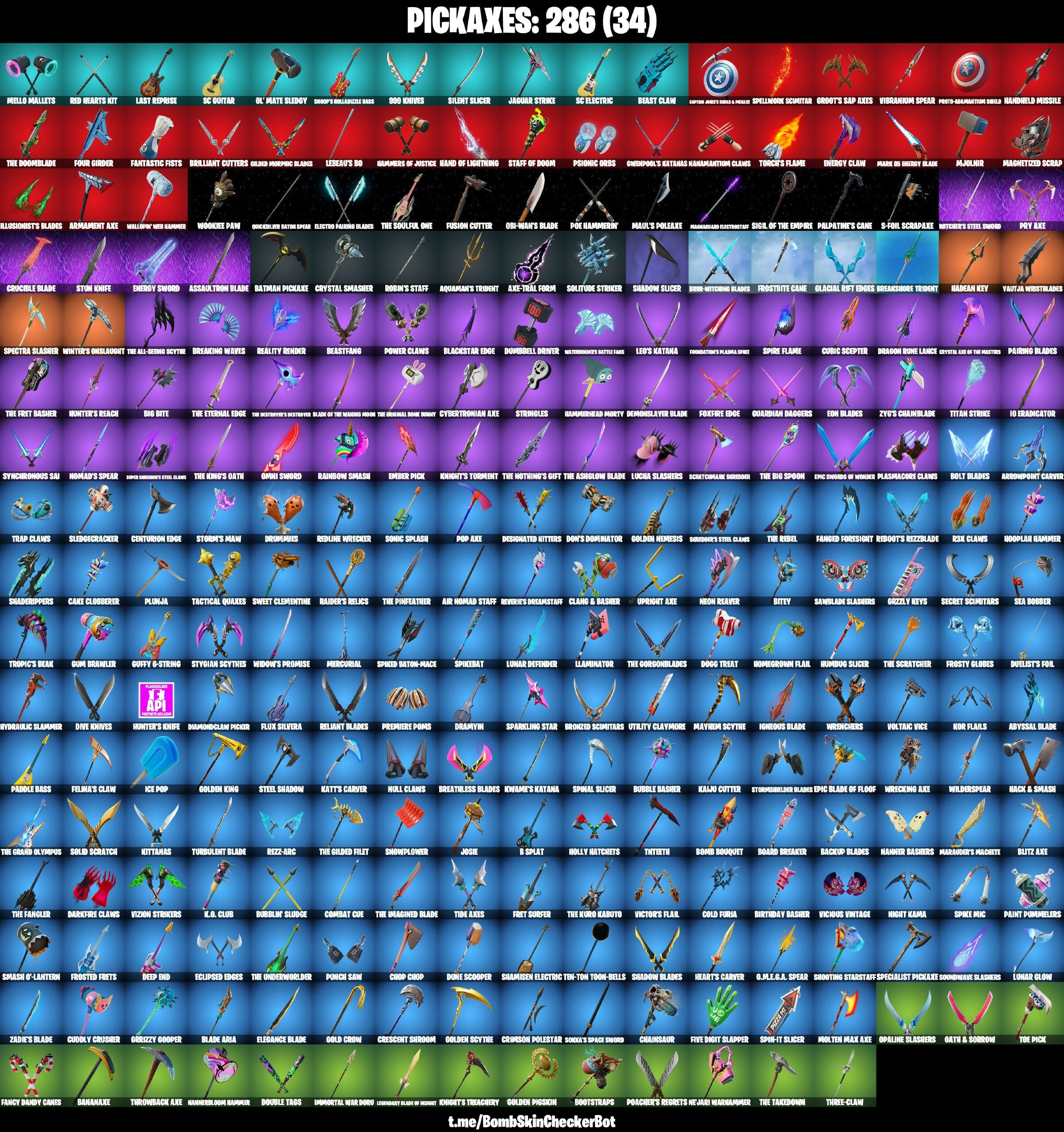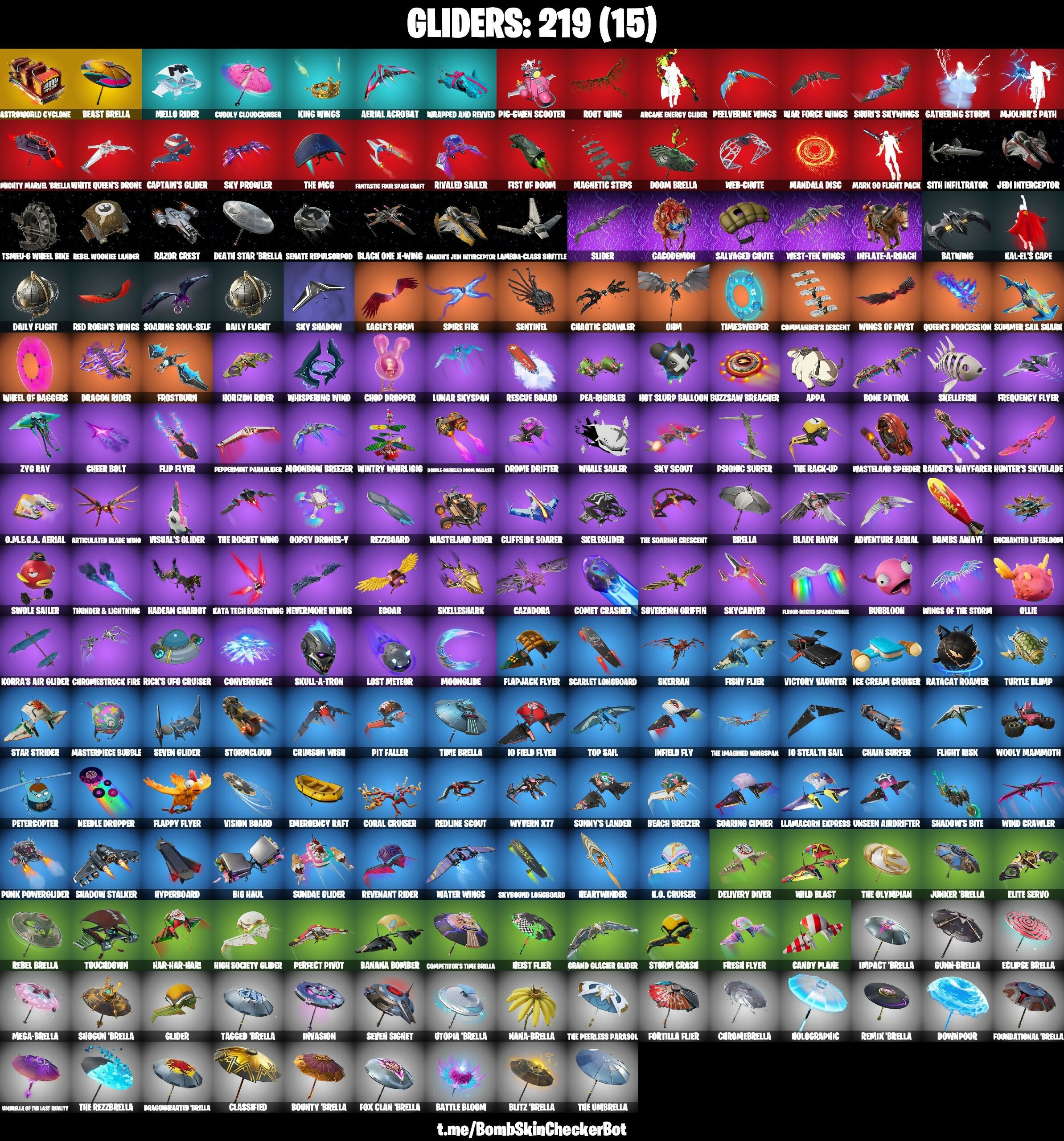 1-Ball, 999 Knives, A Warrior Prepares, Aang, Aang's Air Sphere, AbseNz, Abyssal Blade, Adira, Adventure Aerial, Aerial Acrobat, Agent Jones, Agent Peely, Ahsoka Tano, Ahsoka’s Clone Trooper, Air Nomad Staff, Air Shredder, Anakin Skywalker, Anakin's Jedi Interceptor Lambda-Class Shuttle, Antonia, Aphrodite, Appa, Apprentice Evie, Aquaman, Aquaman's Trident, Arcane Energy Glider, Arcane Research, Arctic Adeline, Ares, Arm-up, Armament Axe, Arrowpoint Carver, Artemis, Articulated Blade Wing, Assaultron Blade, Astroworld Cyclone, Avatar State Aang, Avatar's Flourish, Aw, Shucks., Axe-Trail Form, Axion Sentinel, Ayla Winn, Azarath Metron Zhitiros, B Splat, Backup Blades, Balance Board, Banana Bomber, Bananaxe, Batman Pickaxe, Battle Bloom, Battle Call, Battle Prep, Battle Prep: Super Flashback Breakdown, Batwing, Beach Breezer, Bean Bag, Beast Brella, Beast Claw, Beastfang, Beef Boss, Beep Beep, Belle, Ben Grimm, Bernie, Big Bite, Big Haul, Bike To Go, Birdarang Flourish, Birthday Basher, Bitty, Black One X-Wing, Blackstar Edge, Blade Aria, Blade Of The Waning Moon, Blade Raven, Blitz 'Brella, Blitz Axe, Blitz Knight, Blowin' Up, Board Breaker, Boba Snack, Bolt Blades, Bomb Bouquet, Bombs Away!, Bone Breaker, Bone Patrol, Boogie Down, Book-Kitting Blades, Boomin', Boots 'N' Cats, Bootstraps, Bounty 'Brella, Bow Go, Breakin', Breaking Waves, Breakshore Trident, Breathless Blades, Brella, Brilliant Cutters, Brite Moves, Brite Raider, Bronzed Scimitars, Brutus (Fully Golden), Bubble Basher, Bubblin Sludge, Bubbloon, Bunny Brawler, Buzzsaw Breacher, Bytes, Cacodemon, Cake Clobberer, Call Me, Called Shot, Candy Plane, Captain America, Captain Joey's Bomb & Pickle, Captain Jones, Captain Llamerica, Captain Phasma, Captain's Glider, Cardistry, Castaway Jonesy, Cazadora, Centurion, Centurion Edge, Cerberus, Chain Surfer, Chainsaur, Chaos Director, Chaos Double Agent, Chaotic Crawler, Charlotte, Cheer Bolt, Chef's Special, Choice Knit, Chop Chop, Chop Dropper, Chrome Punk, Chrome-Brella, Chromestrock Fire, Clang & Basher, Clark Kent, Classified, Clean Sweep, Cliffside Soarer, Clone Trooper, Cluck, Codename E.L.F., Codename E.L.I., Coin Flip, Cold Furia, Combat Cue, Comet Crasher, Commander's Descent, Competitor's Time Brella, Conch Call, Conjure Weapon, Contract Giller, Convergence, Coral Cruiser, Coruscant Guard, Count It!, Crack It, Crackshot, Crescent Shroom, Crimson Polestar, Crimson Wish, Crocible Blade, Crowning Achievement, Crystal Axe Of The Masters, Crystal Smasher, Cubic Scepter, Cuddly Cloudcrusher, Cuddly Crusher, Curling Iron, Cybertronian Axe, Cyclo Curl, Dagger Dance, Daily Flight, Dali, Danica, Dark Side, Darkfire Claws, Darth Maul, Darth Vader, Deadpool, Death Star 'Brella, Deep End, Delivery Diver, Demonslayer Blade, Denied, Designated Hitters, Diamond Throne, Diamondclan Picker, Dice Roll, Die With A Smile, Die With A Smile Bruno, Distraction Dance, Dive Knives, Do The 'Split, Doctor Doom, Doctor Slone, Doctor Strange, Dogg Treat, Doggo, Don's Dominator, Doom, Doom Brella, Doom Slayer, Doom's Domain, Dorsal Destroyer, Double Agent Hush, Double Agent Wildcard, Double Tags, Downpour, Doze Dab, Dragon Rider, Dragon Rune Lance, Dragonhearted 'Brella, Dramatic Flares, Dramyin, Drippin' Flavor, Drome Drifter, Drop The Bass, Drummlies, Duelists Foil, Dumbbell Driver, Dune Scooper, Dusty, Dynamo Tntina, Eagle's Form, Eclipse Brella, Eclipsed Edges, Eggar, Electro Pairing Blades, Electro Shuffle, Elegance Blade, Elite Servo, Ember Pick, Emergency Raft, Emma Frost, Emperor Palpatine, Empress Fan Dance, Enchanted Lifebloom, Energy Claw, Energy Sword, Eon Blades, Epic Swords Of Wonder, Era, Eren Jaeger, Erisa, Eternal Knight, Evasive Maneuvers, Evie, Expressionism, Fabio Sparklemane, Fade, Fancy Dandy Canes, Fanged Foresight, Fantastic Calculations, Fantastic Fists, Fantastic Four Space Craft, Feel The Force, Felina, Felina's Claw, Fire Show, Fireworks Salvo, Fish Thicc, Fishstick, Fishy Flier, Fishy Flourish, Fist of Doom, Five Digit Slapper, Flaky Feast, Flapjack Flyer, Flappy Flyer, Flavor-Dusted Sparkling, Flight Risk, Flip Flyer, Flippin' Away, Flux Silvera, Foil Flex, Force Field Shatter, Force Lightning, Foundation's Plasma Spike, Foundational 'Brella, Four Girder, Fox Clan 'Brella, Foxfire Edge, Frequency Flyer, Fresh Flyer, Fret Surfer, Frost Broker, Frost Squad, Frostbite Cane, Frostburn, Frosted Frets, Frosty Globes, Frozen Fishstick, Frozen Nog Ops, Full Tilt, Fusion Cutter, Gambit, Gangnam Style, Gathering Storm, Gear Specialist Maya, General Grievous, Geralt of Rivia, Get Griddy, Get Out Of Your Mind, Gilded Morphic Blades, Glacial Rift Edges, Glider, Godsworth's Cleanup, Gold Crow, Golden King, Golden Nemesis, Golden Pisscin, Golden Scythe, Good Guy, Grand Glacier Glider, Grdzz, Grizzly Gooper, Grizzly Keys, Groot, Groot's Sap Axes, Guardian Daggers, Guff Gringle, Guffy G-String, Guggimon, Gum Brawler, Gumbo, Gunn-'Brella, Gunnar, Gwen-Step, Gwenpool, Gwenpool's Katanas Nanomantium Claws, Hack & Smash, Hadean Chariot, Hades, Hammerhead Morty, Hammers Of Justice, Hand Of Lightning, Hand-Forged, Handheld Missile, Hang Loose Celebration, Har-Har-Hari, Harlowe, Have A Seat, Haven, Haylee Skye, Heart Sign, Heart's Carver, Heartwinder, Heist Flier, Hellfire Dance, High Society Glider, Highwire, Holiday Boxy, Holly Hatchets, Holographic, Homegrown Flail, Hooplah Hammer, Hope, Horizon Rider, Hot Slurp Balloon, Humbug Slicer, Hunter's Knife, Hunter's Reach, Hunter's Skyblade, Hydraulic Slammer, Hype!, Hyperboard, Hypnot-Eyes, I Need You To Concentrate, I'm A Mystery, I.C.O. Club, I.C.O. Cruiser, IO Eradicator, IO Field Flyer, IO Stealth Sail, Ice Cream Cruiser, Ice Pop, Igneous Blade, Igni Sign, Illusionist's Blades, Imani, Immortal War Doru, Impact 'Brella, Imperial March, Imperial Stormtrooper, Indiana Jones, Infield Fly, Inflate-A-Roach, Invasion, Iris, It Is Finished, It's Clobberin' Time!, It's... You?, Jaguar Strike, Jedi Interceptor, Jennifer Walters, Jet Signals, Jing, Joey, Jo