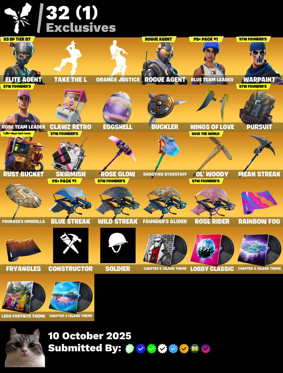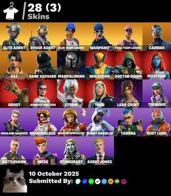 28 Skins ? OG STW - Deluxe Edition - Lara Croft - Elite Agent - Take The L - Agent Jones - Orange Justice - Rogue Agent - Mystique - Bunny Brawler