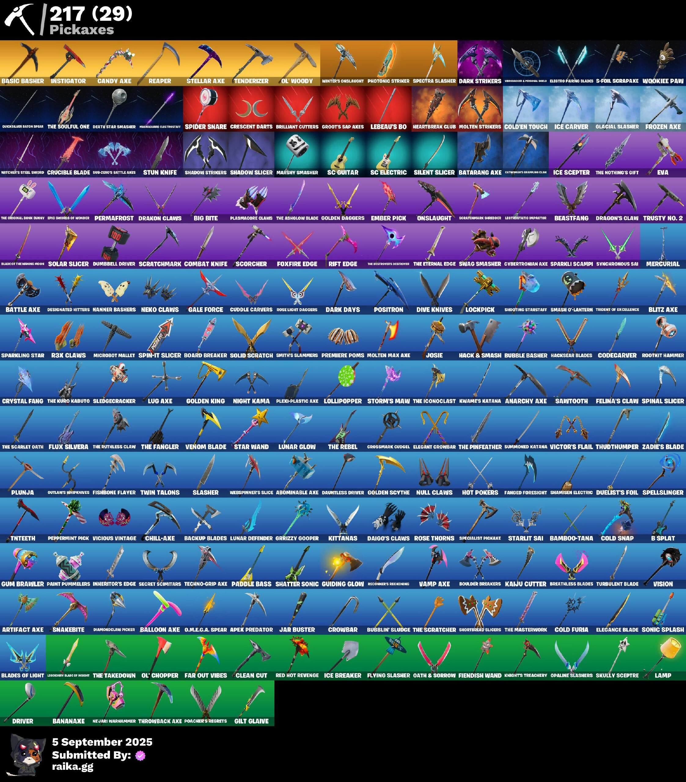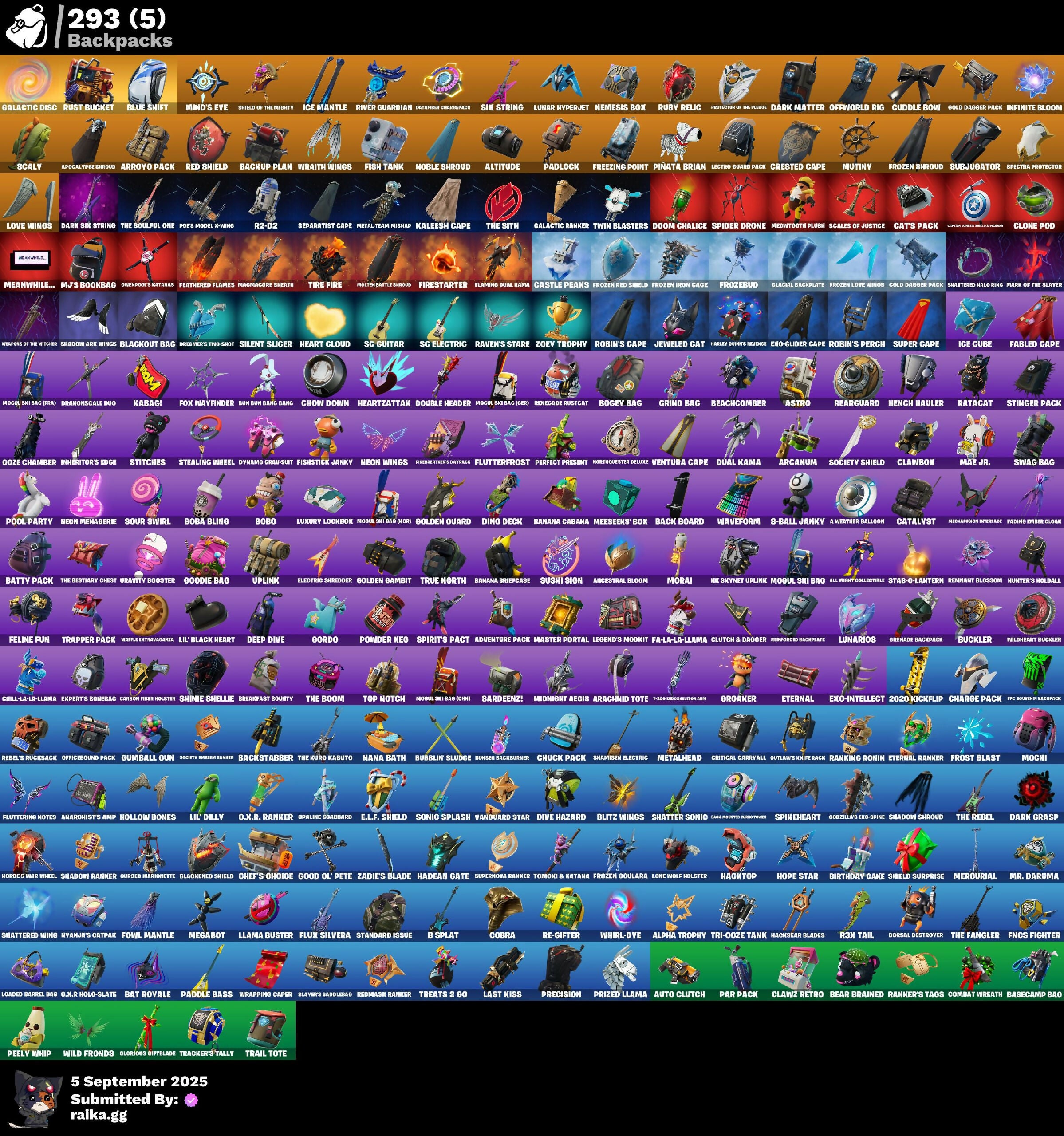 2020 Kickflip, 8-Ball Janky, A Warrior Prepares, A Weather Balloon, Abominable Axe, Adventure Pack, Agent Peely, All Monty Collectible, Alpha Trophy, Altitude, Anarchist's Amp, Anarchy Axe, Ancestral Bloom, Andre, Antonia, Apex Predator, Apocalypse Shroud, Apprentice Evie, Arachne Couture, Arachnid Tote, Arachnrobatics, Arcanum, Arctic Adeline, Armored Batman Zero, Arroyo Pack, Artifact Axe, Assault Trooper, Astro, Astroworld Cyclone, Aura, Auto Clutch, Avla Winn, B Splat, Bachii, Back Board, Back Offloaded Turbo Timer, Backstabber, Backup Blades, Backup Plan, Balance Board, Balloon Axe, Bamboo-Tana, Banana Briefcase, Banana Cabana, Bananaxe, Baron's Hoard, Barracuda, Basecamp Bag, Basic Basher, Bat Royale, Batarang Axe, Battle Axe, Battle Blessing, Battle Hound, Battlehawk, Batty Pack, Beachcomber, Bear Brained, Beastfang, Beatzbunny, Beep Beep, Behold!, Best Mates, Big Bite, Billy Bounce, Birthday Cake, Bizochoito, Black Cat, Blackened Shield, Blackheart, Blackout Bag, Blade of the Warring Moon, Blades of Light, Blaze, Blitz Axe, Blitz Wings, Blue Shift, Blue Streak, Blue Striker, Blue Team Leader, Board Breaker, Boba Bling, Boba Snack, Bobo, Bogey Bag, Bogey Basher, Bone Breaker, Boneless, Boogie Down, Boomin', Boosting Ki, Boulder Breakers, Bow Go, Breakdown, Breakfast Bounty, Breathless Blades, Brilliant Cutters, Brite Bomber, Brtlstorm Bomber, Brush Your Shoulders, Brutus, Bubbie Basher, Bubblin' Sludge, Buckler, Bugha, Bullseye, Bun Bun Bang Bang, Bunsen Backburner, Bytes, Cabbie, Calculated, Call Me, Called Shot, Camille, Candy Axe, Captain America Shield & Bertha, Captain LLamerica, Captain Phasma, Carbide, Carbon Fiber Holster, Cart Champion, Castle Peaks, Cat Flip, Catalyst, Catwoman Comic Book Cvr, Catwoman Zero, Cat’s Pack, Cauldron Chill, Championship Jonesy, Chaos Agent, Charge Pack, Chef's Choice, Chef's Special, Chill-Axe, Chilla-La-Llama, Chow Down, Chuck Pack, Clash, Clawbox, Clawz Retro, Clean Cut, Clean Sweep, Clone Pod, Clutch & Dagger, Cobalt, Cobra, Codecarver, Codename E.L.F., Coin Flip, Cold Dagger Pack, Cold Furia, Cold Snap, Cold'en Touch, Color Crush, Combat Knife, Combat Tech Jules, Combat Wreath, Commando, Conga, Contract Giller, Count It!, Crack It, Crescent Darts, Crested Cape, Crimson Scout, Critical Carryall, Crossmark Cudgel, Crowbar, Crowning Achievement, Crucible Blade, Crystal Fang, Cuddle Bow, Cuddle Carvers, Cuddle Team Leader, Curling Iron, Cursed Marionette, Cyberdyne Salute, Cybertronian Axe, Dab, Dahlia, Daigo, Daigo's Claws, Dark Days, Dark Grasp, Dark Matter, Dark Power Chord, Dark Six String, Dark Strikers, Dark Voyager, Datafacer Chargepack, Dauntless Driver, Daydream, Death Star Smasher, Deep Dive, Designated Hitters, Diamond Throne, Diamondclaw Picker, Dice Roll, Dino Deck, Dip, Dire, Disc Spinner, Discovery, Dive Hazard, Dive Knives, Do The Split, Doggo, Dominator, Doom Chalice, Doom Slayer, Dorsal Destroyer, Double Header, Doze Dab, Dragon Stance, Dragon Steel Hybrid, Dragon's Claw, Dragonscale Duo, Drakon Claws, Dream, Dreamer's Two-Shot, Drift, Driver, Dual Kama, Duelist's Foil, Dumbbell Driver, Dusty, Dyed Breeze, Dynamic Dribbler, Dynamo Grav-Suit, E.L.F. Shield, Eagle Enforcer, Electric Shredder, Electro Shuffle, Electro Swing, Elegance Blade, Elegant Crowbar, Eleven, Elite Agent, Ember Pick, Enforcer, Epic Swords of Wonder, Eternal, Eternal Ranker, Eva, Exo-Glider Cape, Exo-Intellect, Expert's Bonebag, Expressionism, FFC Souvenir Backpack, FNCS Fighter, Fa-La-La-Llama, Fabled Cape, Fading Ember Cloak, Fanged Foresight, Far Out Vibes, Feathered Flames, Feel The Force, Felina, Felina's Claw, Feline Fun, Ffc Chloe Kim, Ffc Lebron James, Ffc Neymar Jr, Ffc Sparkplug, Ffc Thegregf, Fiendish Wand, Finger Guns, Firebreaker's Daypack, Firestarter, Fish Tank, Fish Thicc, Fishbone Flayer, Fishstick Janky, Fist Bump, Flaky Feast, Flaming Dual Kama, Flashback Breakdown, Flippin' Away, Flutterfrost, Fluttering Notes, Flux Silvera, Flying Slasher, Fncs Renegade, Focus, Foil Flex, Force Lightning, Fowl Mantle, Fox Wayfinder, Foxfire Edge, Free Flow, Freestylin', Freezing Point, Frost Blast, Frostbite, Frosted Flurry, Frozebud, Frozen Axe, Frozen Fishstick, Frozen Iron Cage, Frozen Love Wings, Frozen Loverang, Frozen Nog Ops, Frozen Oculata, Frozen Raven, Frozen Red Knight, Frozen Red Shield, Frozen Shroud, Fusion! Hah!!, Galactic Disc, Galactic Ranker, Galaxy, Gale Force, Gear Specialist Maya, General Grievous, Gentleman's Dab, Geralt of Rivia, Get Funky, Get Schwifty, Ghortsbeard Slicers, Ghoul Trooper, Gildhart, Gilt Glaive, Glacial Backplate, Glacial Slasher, Glorious Giftblade, Glumbunny, Godzilla Evolved, Godzilla's Exo-Spine, Gold Dagger Pack, Golden Daggers, Golden Gambit, Golden Guard, Golden King, Golden Scythe, Golf Clap, Good Ol' Pete, Good Sportsmanship, Goodie Bag, Gordo, Grenade Backpack, Grind Bag, Grizzly Gooper, Groaker, Groot's Sap Axes, Groove Jam, Grriz, Guff Gringle, Guiding Glow, Gum Brawler, Gumball Gun, Gun Show, Gwenpool’s Katanas, HK Skynet Uplink, Hack & Smash, Hacksear Blades, Hacktop, Hadean Gate, Harley Quinn's Revenge, Havoc, Haxsaura, Heart Cloud, Heartbreak Club, Heartbreak Ranger, Heartzattack, Hello Friend, Helsie, Hench Hauler, Hero Baymax, Highland Warrior, Highwire, Holiday Boxy, Hollow Bones, Hope, Hope Star, Horde's War Wheel, Hot Marat, Hot Pokers, Human Bill, Hunter's Holdall, Huntress, Hybrid, Hype, Hype!, Hypnot-Eyes, I Need You To Concentrate, I'm A Mystery, Ice Breaker, Ice Carver, Ice Crystal, Ice Cube, Ice Mantle, Ice Scepter, Icebound Midas, Igni Sign, Incinerator Kuno, Infinite Bloom, Inheritor's Edge, Instigator, Invisible Cut, It's Go Time!, Izuku Midoriya, Jade, Jar Buster, Jet Signals, Jeweled Cat, Joltara, Jones Unchained, Joni The Red, Josie, Jubilation, Kabag!, Kado Thorne, Kaiju Cutter, Kaleesh Cape, Katsuki Bakugo, Keep It Mello, Kendo, Khaby Lame, Kittanas, Knife Sharpener, Knight's Treachery, Kondor, Kuno, Kwame, Kwame's Katana, Lace, Lamp, Laser Focused, Last Kiss, Laugh It Up, L