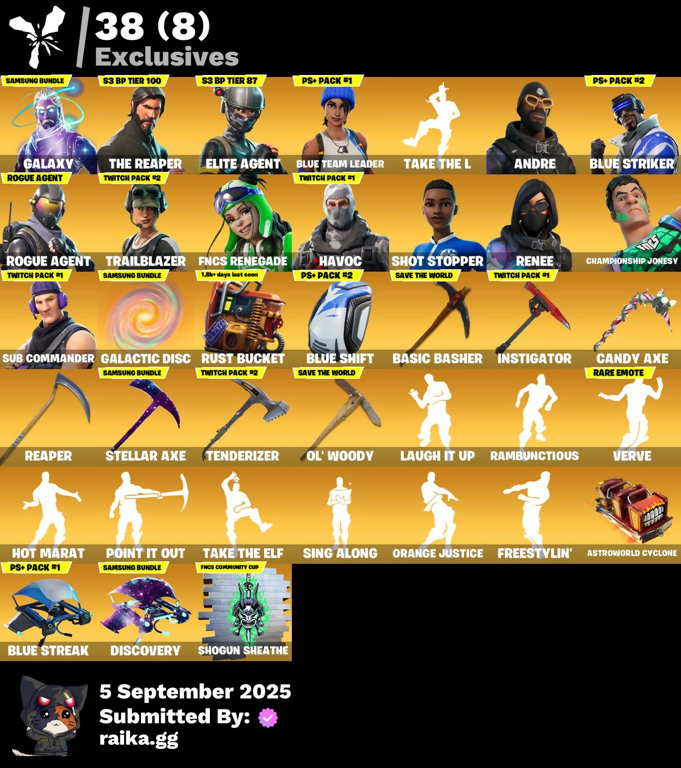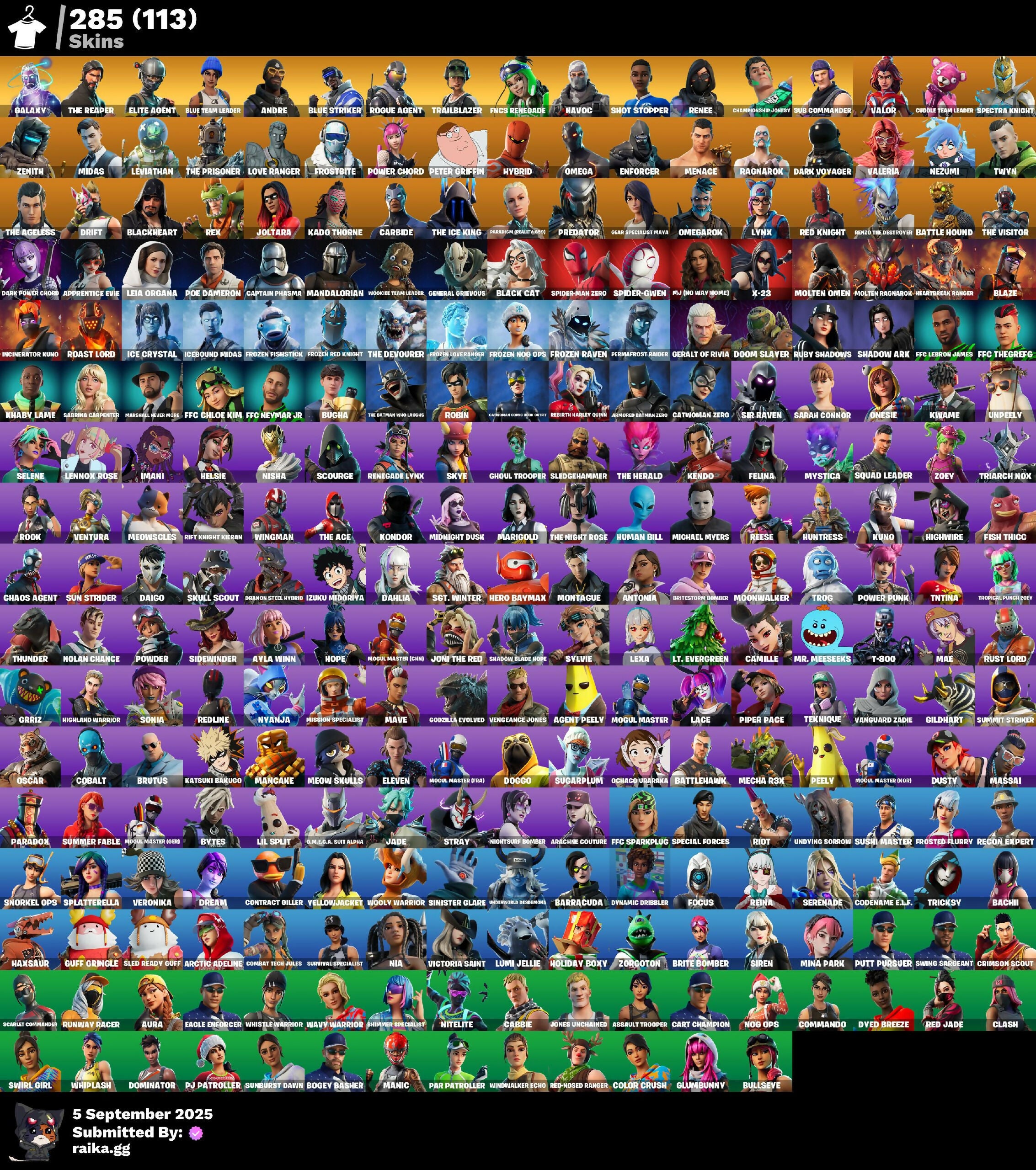 285 skins ✅ Galaxy ✅ The Reaper ✅ Elite Agent ✅ Blue Team Leader ✅ Andre ✅ Blue Striker ✅ Rogue Agent ✅ Trailblazer ✅ FNCS Renegade ✅ Havoc ✅ 400 VB