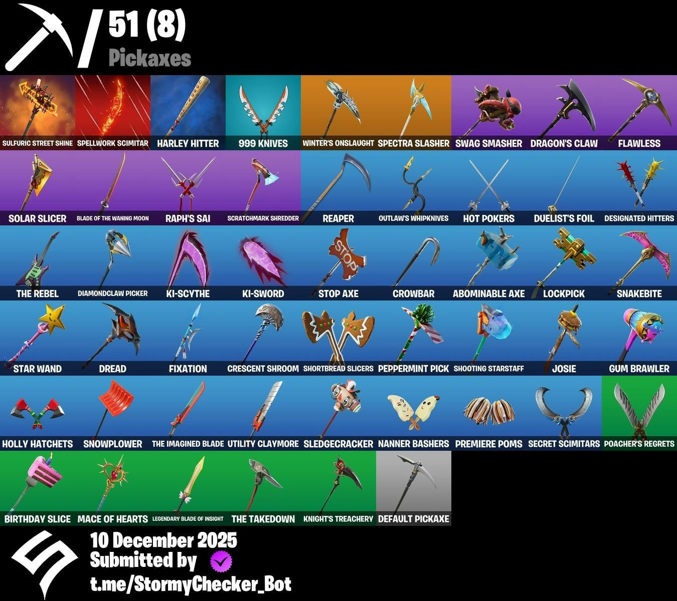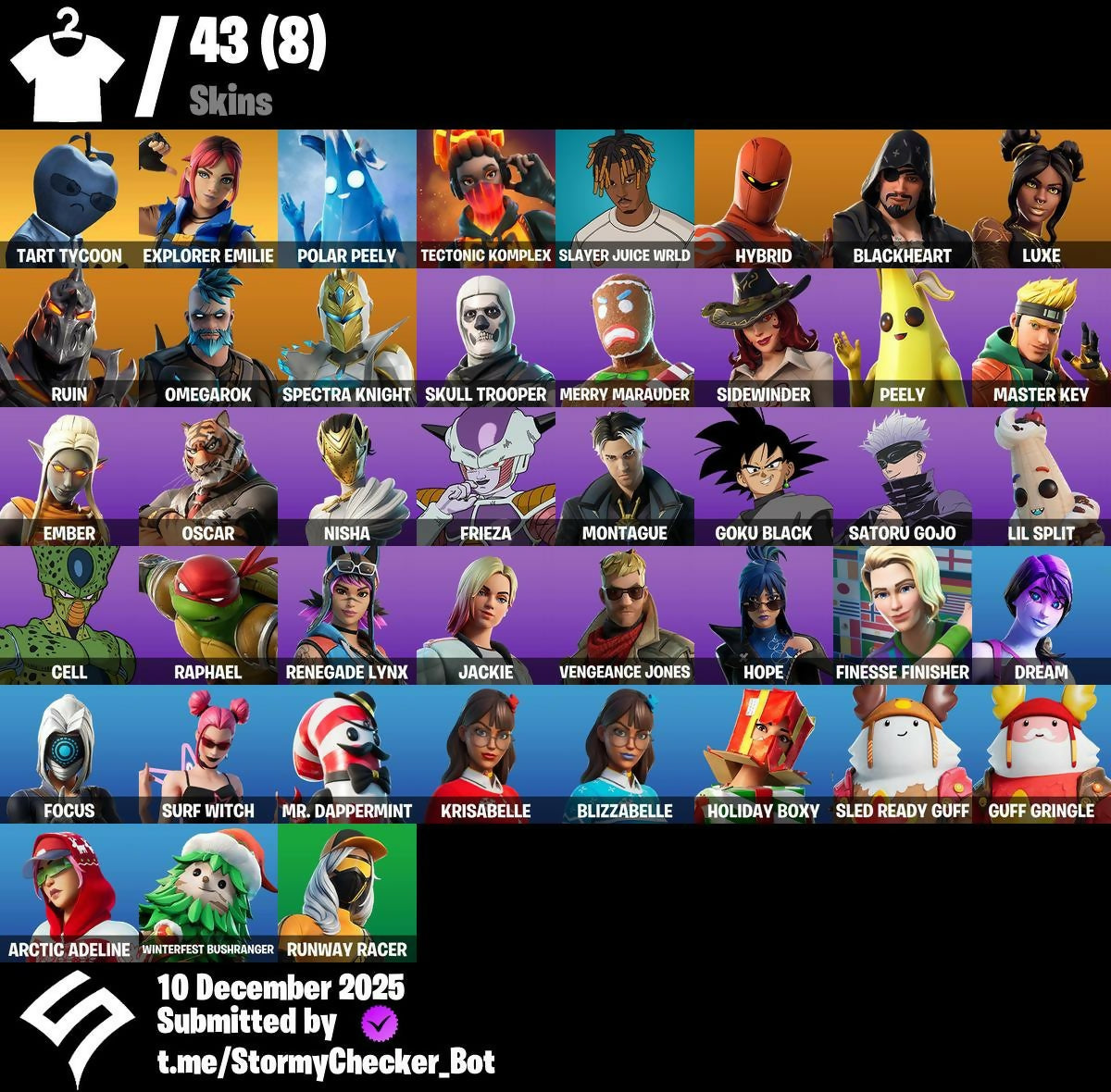 43 Skins | Explorer Emilie | Tart Tycoon | Oscar | Holiday Boxy | Nisha | Default Pickaxe | Reaper | Outlaw's Whipknives | 150 VB