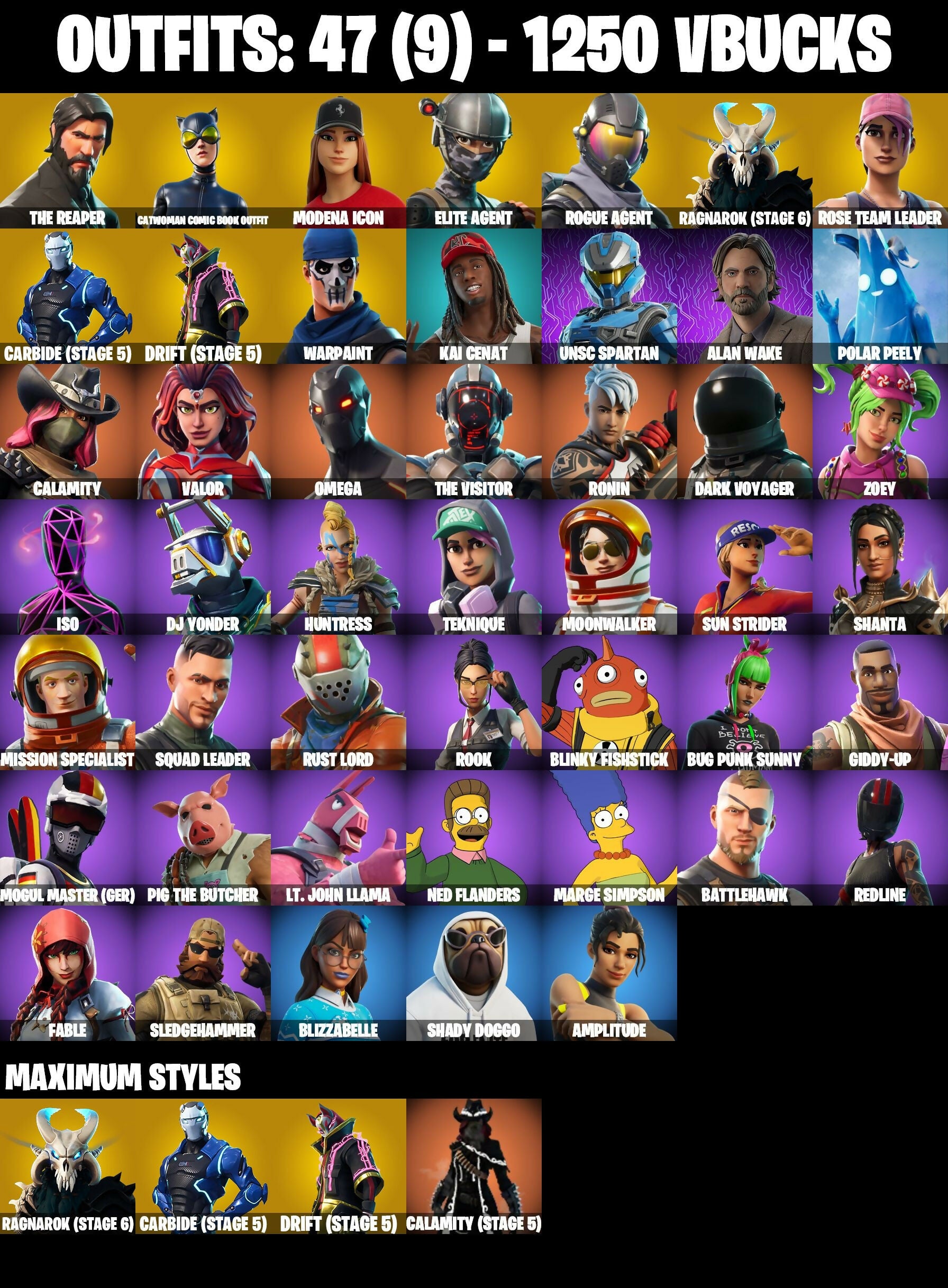 47 Skins | Catwoman Comic Book , The Reaper , Hot Marat , OG STW , Take The L , Mako | 1250 VBucks | [PC/XBOX/NINTENDO]