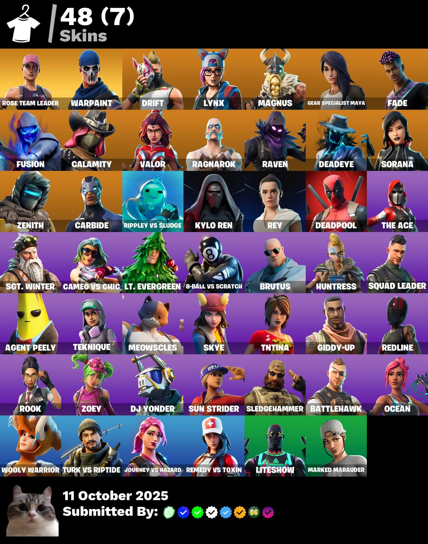 48 Skins โญ๏ธ OG STW - Drift - Deadpool - Zoey - Orange Justice - Calamity - Lynx - Skye - Rook - Meowscles - Redline - TNTina - Agent Peely - Ocean - Deadeye