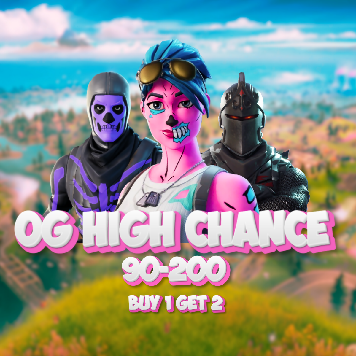 (Buy 1 Get 2) 90-200 , Chance for (Travis Scott ,OG Ghoul Trooper, Renegade Raider , Black Knight ,Galaxy, IKONIK , OG Skull Trooper, Sparkle Specialist , Take the L or Others skins).