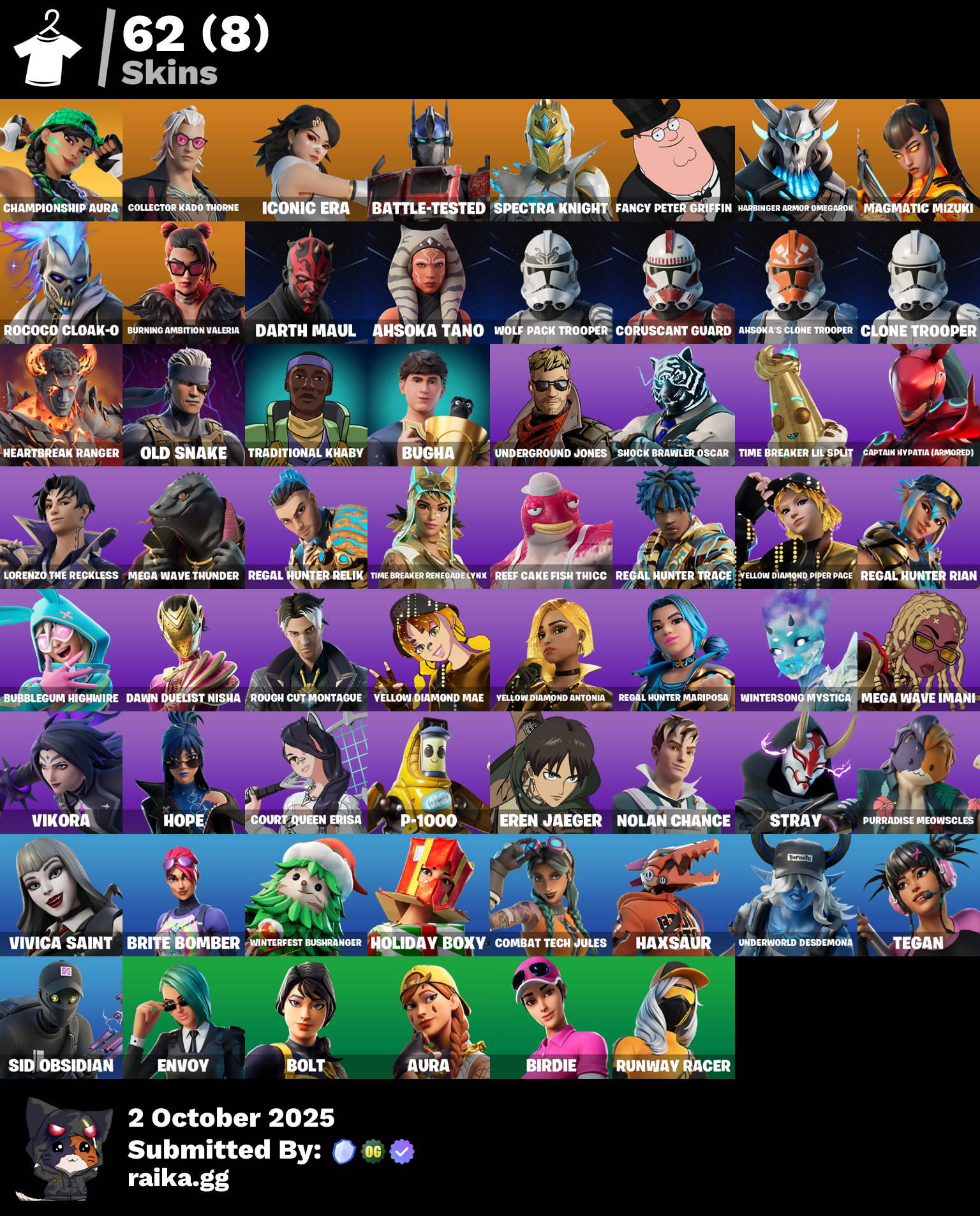 62 TOP SKINS [PC/PSN/XBOX]|CHAMPIONSHIP AURA ✅ COLLECTOR KADO THORNE ✅ ICONIC ERA ✅ BATTLE-TESTED ✅ SPECTRA KNIGHT ✅ FANCY PETER GRIFFIN