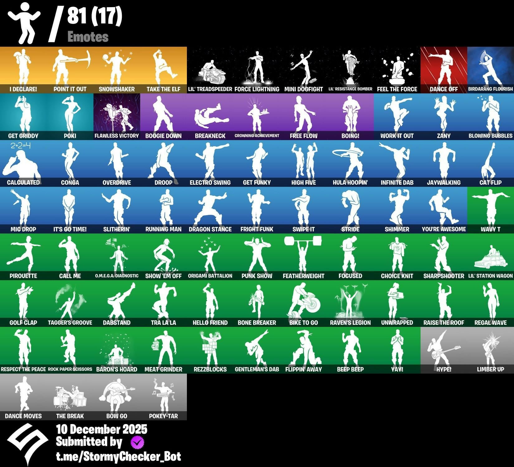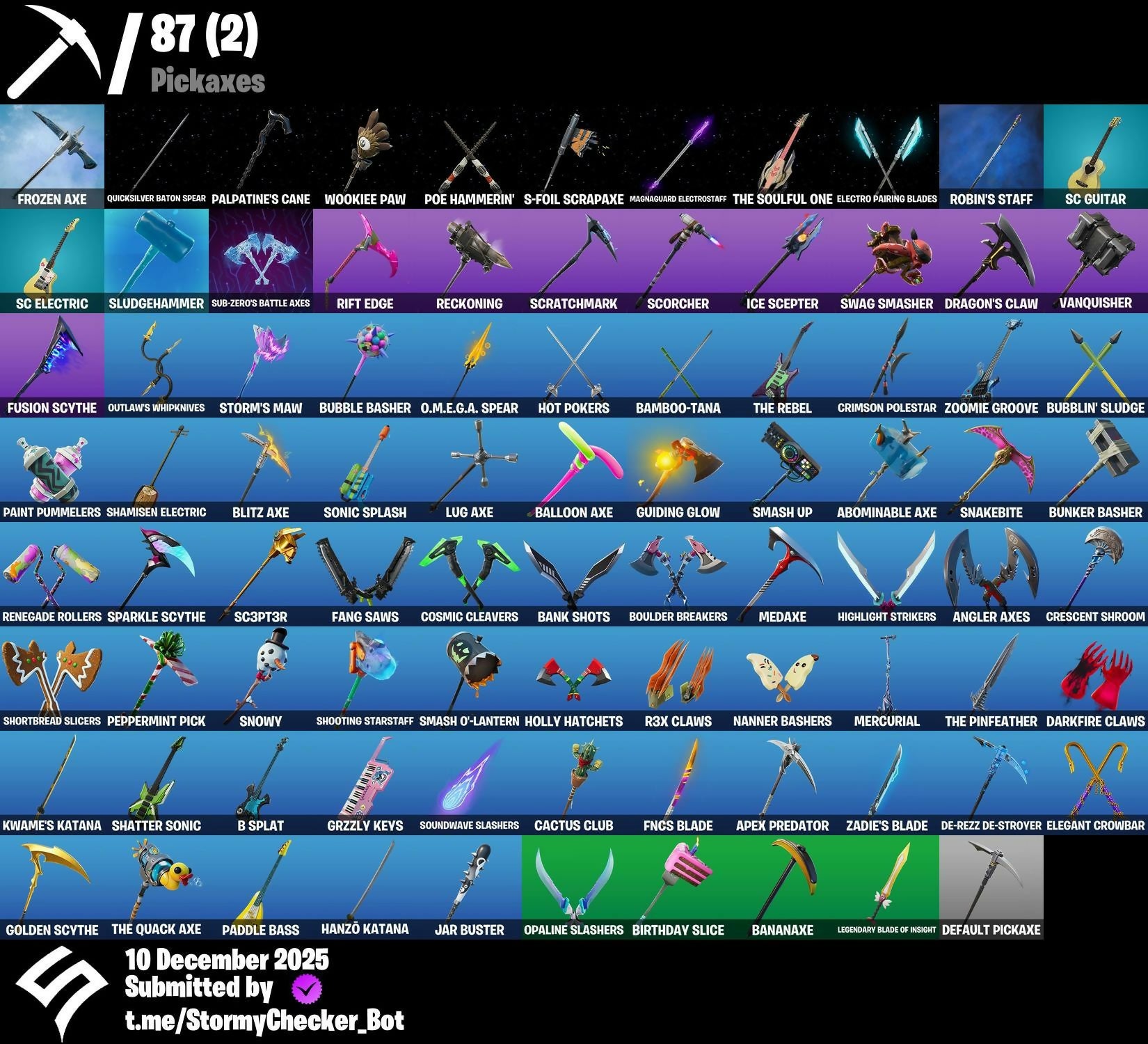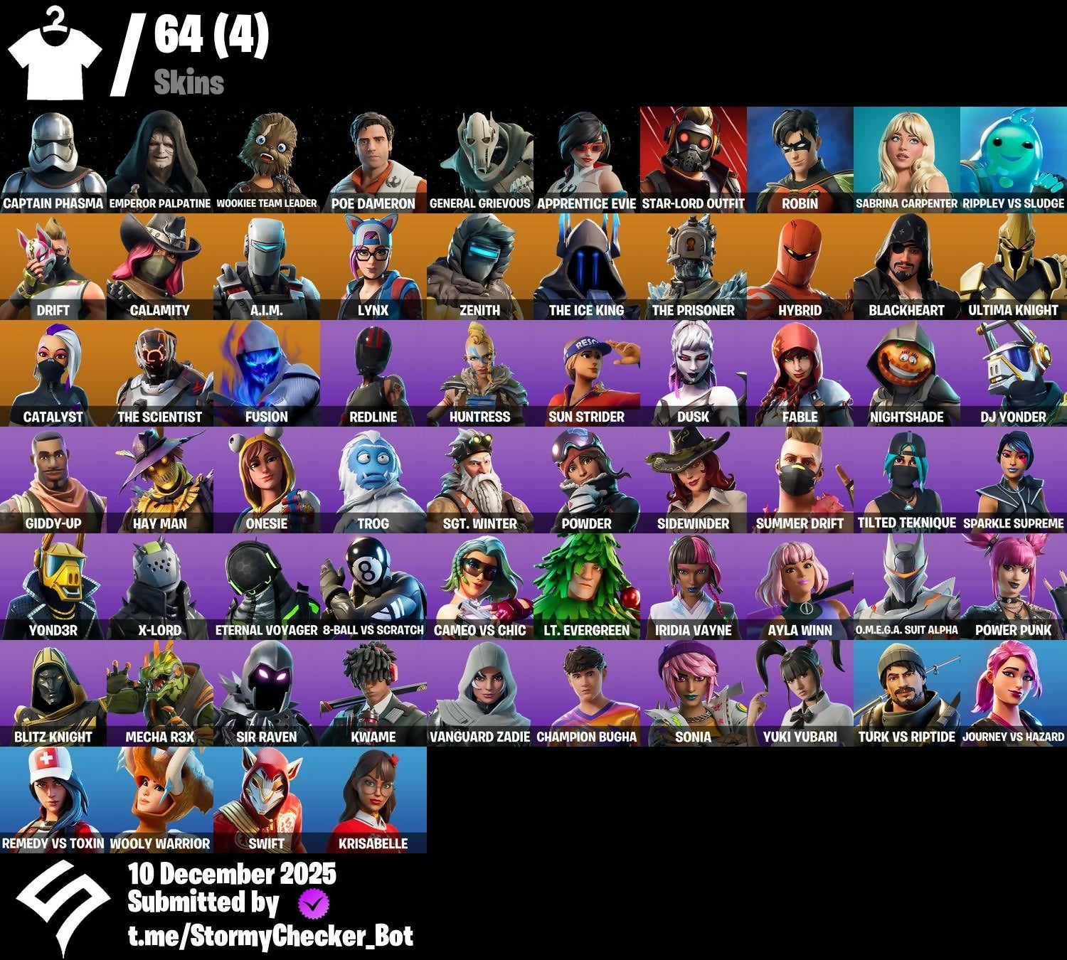 | 64 Skins | Iridia Vayne | Captain Phasma | Ayla Winn | O.M.E.G.A. Suit Alpha | Emperor Palpatine | Default Pickaxe | Outlaw's Whipknives | Opaline Slashers | 100 VB