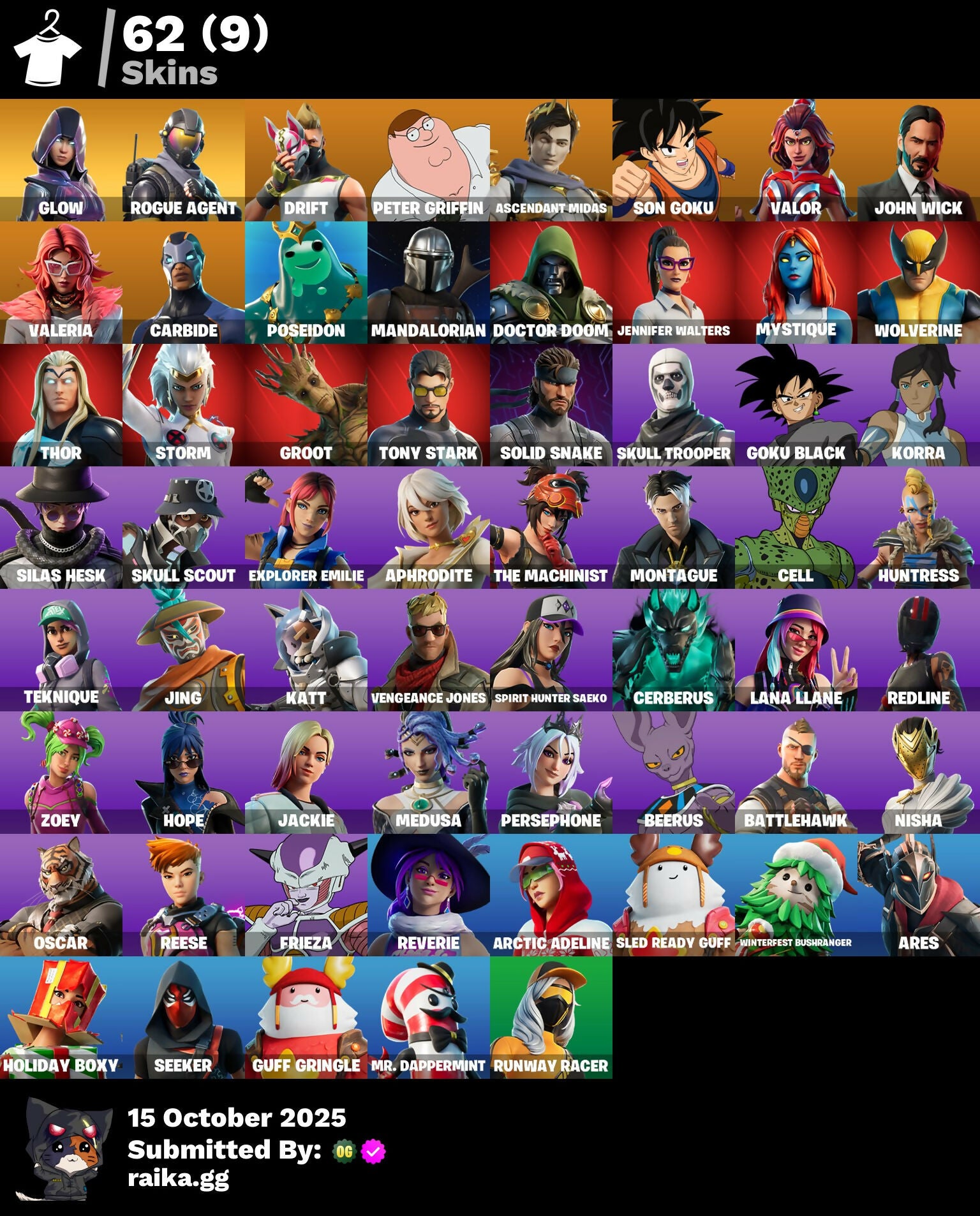 [6k vb] 62 skins | Glow | Rogue Agent | Drift | Peter Griffin | Ascendant Midas | Son Goku | Valor | John Wick | Valeria | Carbide | Poseidon | 5950 VB