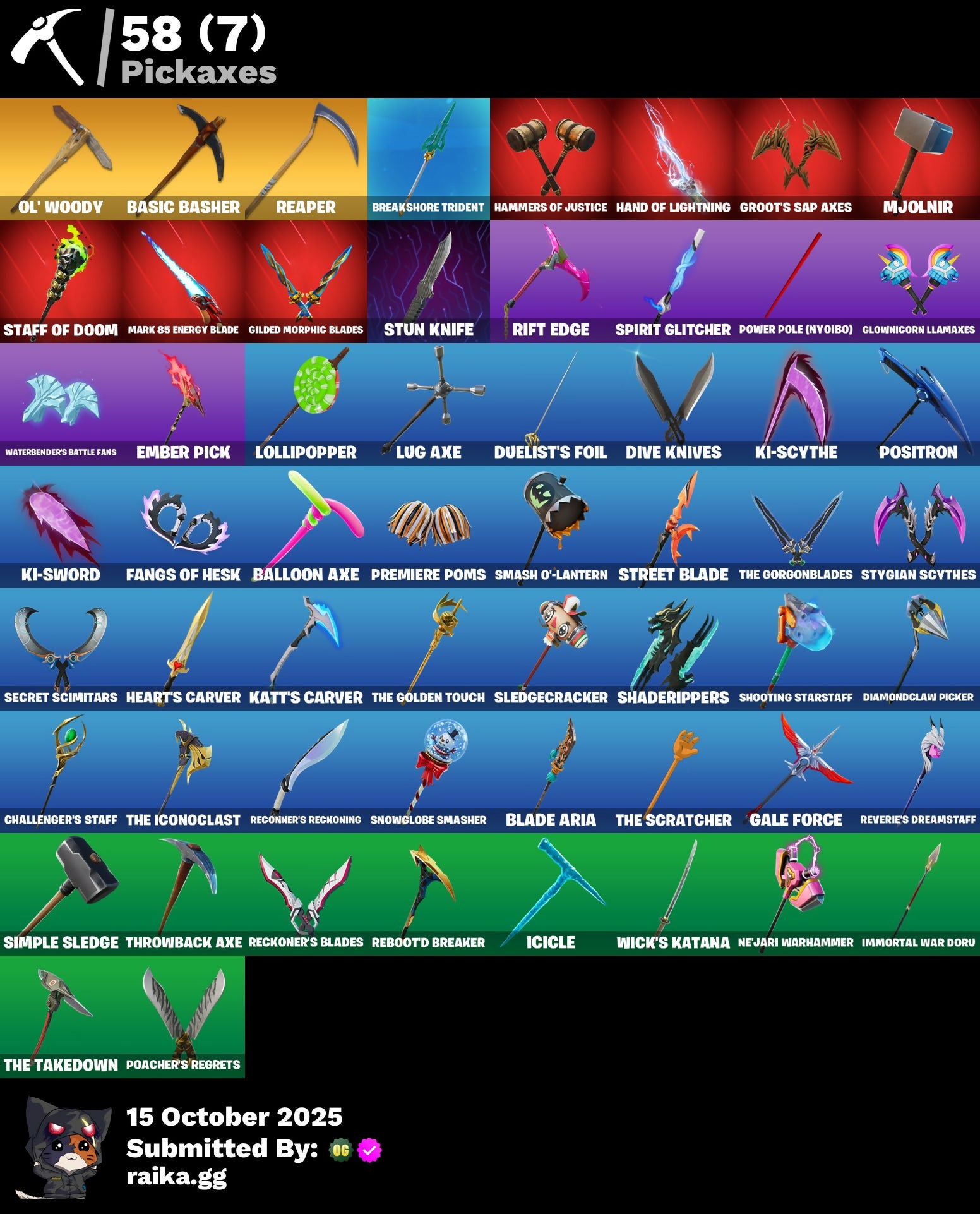 Aphrodite, Arctic Adeline, Ares, Ascendant Midas, Avatar's Flourish, Balloon Axe, Basic Basher, Battlehawk, Beerus, Blade Aria, Boogie Down, Boomin', Breakshore Trident, Carbide, Card Drop, Cell, Cerberus, Challenger's Staff, Clean Sweep, Conch Call, Crowning Achievement, Diamond Throne, Diamondclaw Picker, Dive Knives, Doctor Doom, Drift, Duelist's Foil, Ember Pick, Explorer Emilie, Fangs of Hesk, Flippin' Away, Foil Flex, Frieza, Gale Force, Gentleman's Dab, Get Griddy, Gilded Morphic Blades, Glow, Glownicorn Llamaxes, Goku Black, Groot, Groot's Sap Axes, Guff Gringle, Hammers of Justice, Hand of Lightning, Heart's Carver, Holiday Boxy, Hope, Huntress, Hype, I'm A Mystery, Icicle, Immortal War Doru, Jackie, Jennifer Walters, Jing, John Wick, Katt, Katt's Carver, Ki-Scythe, Ki-Sword, Knife Sharpener, Korra, Lana Llane, Lil' Prancer, LolliPopper, Lug Axe, Mandalorian, Mark 85 Energy Blade, Medusa, Mjolnir, Montague, Mr. Dappermint, Mystique, Ne'Jari Warhammer, Ninja Stance: Leo, Nisha, Ol' Woody, Orange Justice, Oscar, Persephone, Peter Griffin, Poacher's Regrets, Popcorn, Poseidon, Positron, Power Pole (Nyoibo), Premiere Poms, Reaper, Rebootd Breaker, Reckoner's Blades, Reconner's Reckoning, Redline, Reese, Regal Wave, Respect, Reverie, Reverie's Dreamstaff, Rift Edge, Rogue Agent, Runway Racer, Secret Scimitars, Seeker, Serpentine Summoning, Shadebox, Shaderippers, Shooting Starstaff, Silas Hesk, Simple Sledge, Skull Scout, Skull Trooper, Sled Ready Goff, Sledgecracker, Smash O'-Lantern, Snowglobe Smasher, So Square, Solid Snake, Son Goku, Spirit Glitcher, Spirit Hunter Saeko, Staff of Doom, Storm, Street Blade, Stun Knife, Stygian Scythes, Surfin' Bird, Sweet Swing, Take The Cake, Teknique, The Golden Touch, The Gorgonblades, The Iconoclast, The Machinist, The Scratcher, The Takedown, Thor, Throwback Axe, Tony Stark, Valeria, Valor, Vengeance Jones, Verve, Waterbender's Battle Fans, Wave, Wick's Katana, Winterfest Bushranger, Wolverine, You're Awesome, Zoey