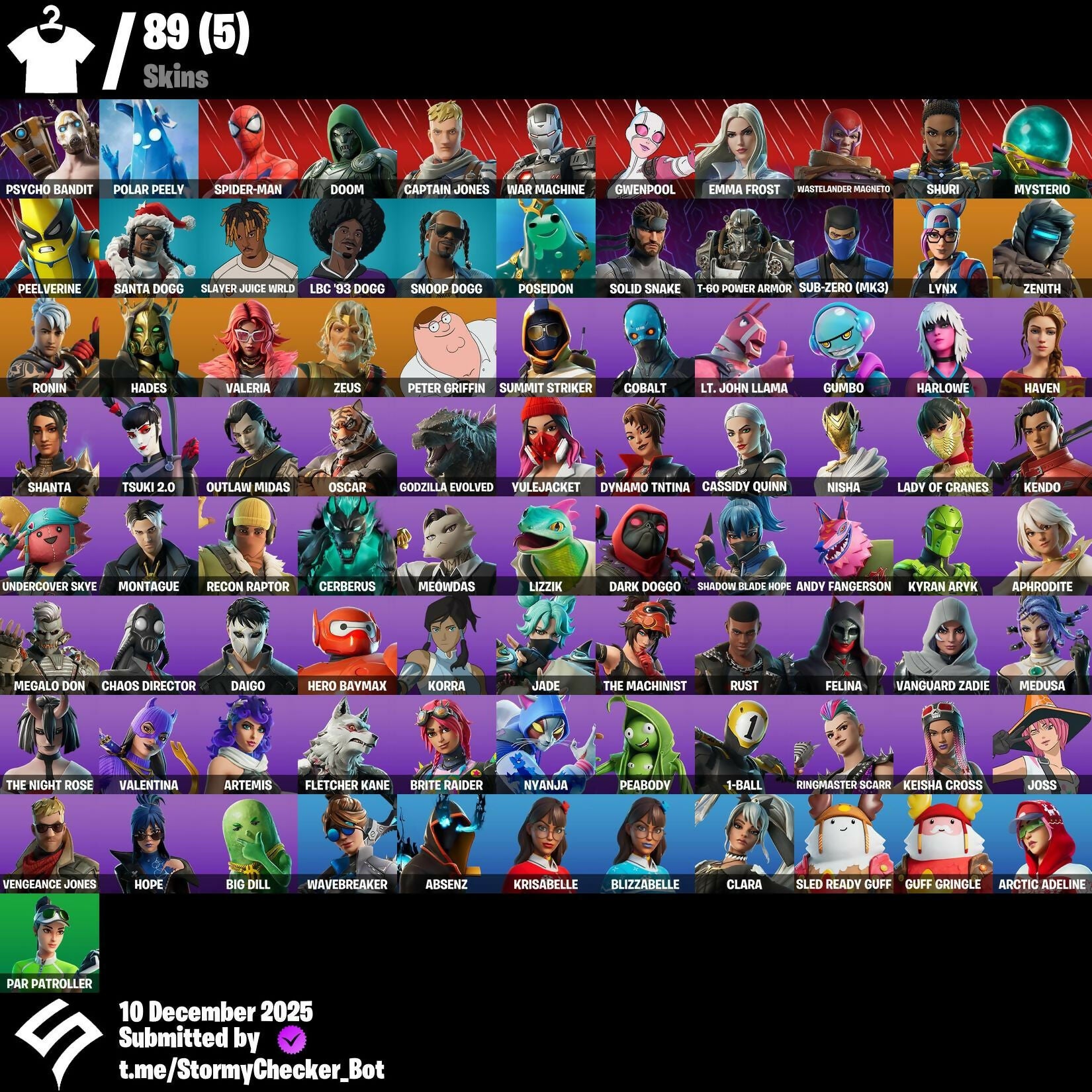 89 Skins | Solid Snake | Santa Dogg | Doom | Outlaw Midas | Clara | Default Pickaxe | Reaper | Stun Knife | 900 VB