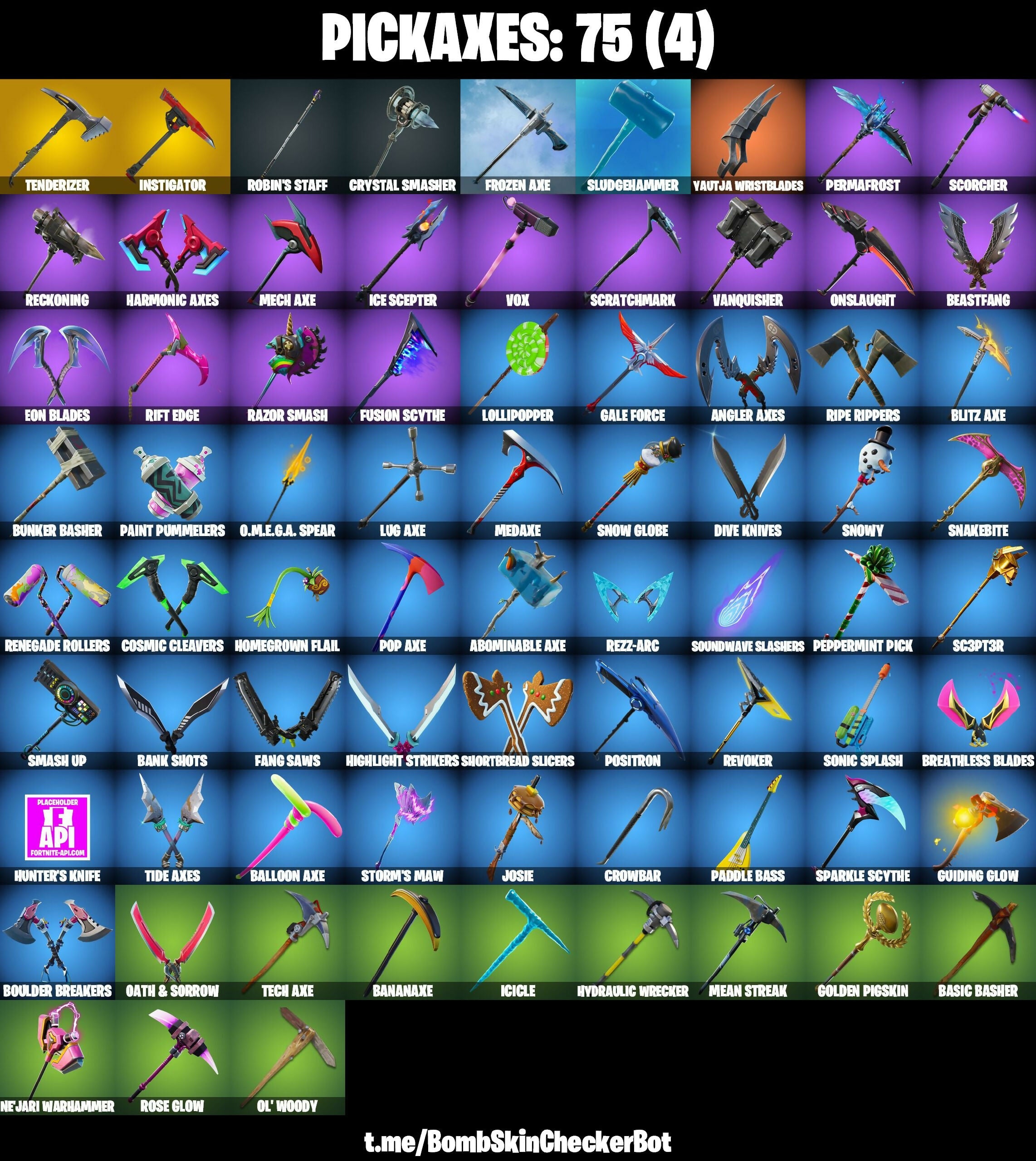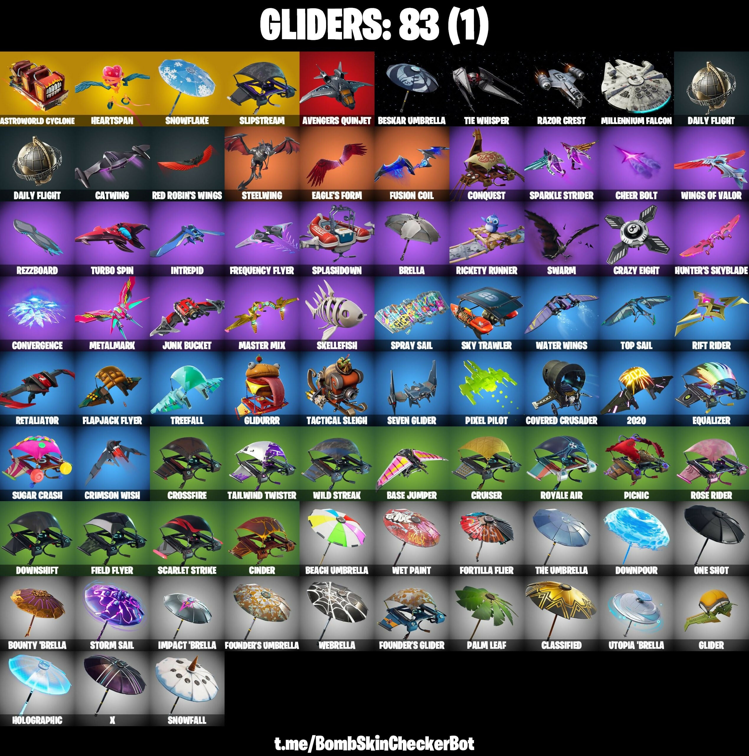 2020, 8-Ball Vs Scratch, A.I.M., Abominable Axe, Air Shredder, Angler Axes, Arcane Research, Astroworld Cyclone, Aura, Avengers Quinjet, Balloon Axe, Bananaxe, Bank Shots, Base Jumper, Basic Basher, Battlehawk, Beach Umbrella, Beastfang, Beep Beep, Beskar Umbrella, Birdarang Flourish, Blitz Axe, Blowing Bubbles, Blue Striker, Boing!, Bolt, Boneless, Boogeyman, Boogie Down, Boomin', Boulder Breakers, Bounty 'Brella, Breakdown, Breakneck, Breathless Blades, Brella, Bunker Basher, Bunker Jonesy, Calamity, Calculated, Call Me, Cameo Vs Chic, Carbide, Cat Flip, Catalyst, Catwing, Chalk Outline, Cheer Bolt, Cinder, Classified, Cluck Strut, Conquest, Convergence, Cosmic Cleavers, Covered Crusader, Crackshot, Crazy Eight, Crimson Wish, Crossfire, Crowbar, Crowning Achievement, Cruiser, Crystal Smasher, DJ Yonder, Dabstand, Daily Flight, Dark Tricera Ops, Deep Dab, Demi, Dire, Dive Knives, Downpour, Downshift, Drift, Drift (Stage 5), Droop, Dusk, Eagle's Form, Enforcer, Eon Blades, Equalizer, Eternal Voyager, Extraterrestrial, Fable, Face Palm, Fade, Fang Saws, Featherweight, Field Flyer, Finger Guns, Fist Pump, Flamenco, Flapjack Flyer, Flippin' Away, Fortilla Flier, Founder's Glider, Founder's Umbrella, Free Flow, Freestylin', Frequency Flyer, Frozen Axe, Fusion, Fusion Coil, Fusion Scythe, GG Smiley, Gale Force, Gentleman's Dab, Get Funky, Giddy-Up, Glider, Glidurr, Glow, Golden Pigskin, Golf Clap, Grand Salute, Groove Jam, Guiding Glow, Gun Show, Harmonic Axes, Havoc, Haylee Skye, Haze, Heartspan, Hello Friend, High Five, Highlight Strikers, Holographic, Homegrown Flail, Howl, Hula Hoopin', Hunter's Knife, Hunter's Skyblade, Huntress, Hydraulic Wrecker, Hype, Hype!, Ice Scepter, Icicle, Ikonik, Impact 'Brella, Instigator, Intrepid, Iris, It's Go Time!, Jaywalking, Josie, Journey Vs Hazard, Jubilation, Jump Jets, Junk Bucket, Killswitch, Kondor, Kylo Ren, Laid Back Shuffle, Leafy Longboardin', Lightrider, Lollipopper, Lt. Evergreen, Lug Axe, Lynx, Mancake, Mandalorian, Master Mix, Mave, Mean Streak, Mech Axe, Medaxe, Metalmark, Mic Drop, Millennium Falcon, Morgan Myst, Nejari Warhammer, Nightshade, No Sweat, Nog Ops, O.M.E.G.A. Spear, Oath & Sorrow, Ocean, Ol' Woody, Old School, Omega, One Shot, Onesie, Onslaught, Orange Justice, Paddle Bass, Paint Pummellers, Palm Leaf, Peace Out, Peppermint Pick, Permafrost, Picnic, Pixel Pilot, Point It Out, Point Patroller, Pop Axe, Popcorn, Positron, Powder, Predator, Psylocke, Punched Up, Ragnarok (Stage 6), Razor Crest, Razor Smash, Reckoning, Red Robin's Wings, Red Strike, Redline, Reese, Regal Wave, Remedy Vs Toxin, Renegade Rollers, Respect, Respect The Peace, Retaliator, Revel, Revoker, Rezz-Arc, Rezzblocks, Rezzboard, Rickety Runner, Ride The Pony, Rift Edge, Rift Rider, Ripe Rippers, Rippley Vs Sludge, Robin, Robin's Staff, Rock Out, Rook, Rose Glow, Rose Rider, Rose Team Leader, Rox, Royale Air, Running Man, Rust Bucket, Sad Trombone, Salute, Sc3pt3r, Scarlet Strike, Scenario, Scorcher, Scratchmark, Scuba Jonesy, Sentinel, Seven Glider, Sgt. Winter, Shaolin Sip, Shaolin Sit-Up, Sharpshooter, Shimmer, Shortbread Slicers, Sign Spinner, Sing Along, Skellefish, Skull Trooper, Sky Trawler, Sledgehammer, Slipstream, Slitherin', Slow Clap, Sludgehammer, Smash Up, Snakebite, Snow Globe, Snowfall, Snowflake, Snowshaker, Snowy, So Square, Sonic Splash, Soundwave Slashers, Sparkle Scythe, Sparkle Strider, Sparkle Supreme, Splashdown, Spray Sail, Squad Leader, Steelwing, Storm Sail, Storm's Maw, Stratus, Stride, Sub Commander, Sugar Crash, Summit Striker, Sun Strider, Super Save, Superman, Swarm, Swipe It, Synth Step, Synthwave, T-Pose, Tactical Sleigh, Tagger's Groove, Tailwind Twister, Take The Elf, Targeted Focus, Tech Axe, Teknique, Tenderizer, The Ice King, The Prisoner, The Scientist, The Umbrella, The Visitor, Tide Axes, Tie Whisper, Tilted Teknique, Top Sail, Tra La La, Trailblazer, Treefall, Trog, True Love, Tunnel, Turbo Spin, Turk Vs Riptide, Utopia 'Brella, Valor, Vanquisher, Vega, Vendetta, Vox, Warpaint, Water Wings, Wave, Wavy T, Webrella, Wet Paint, Wild Streak, Wings Of Valor, Wooly Warrior, X, X-Lord, Yautja Wristblades, Yay!, Yond3r, You're Awesome, Yule Trooper, Zenith, Ziggy, Zoey