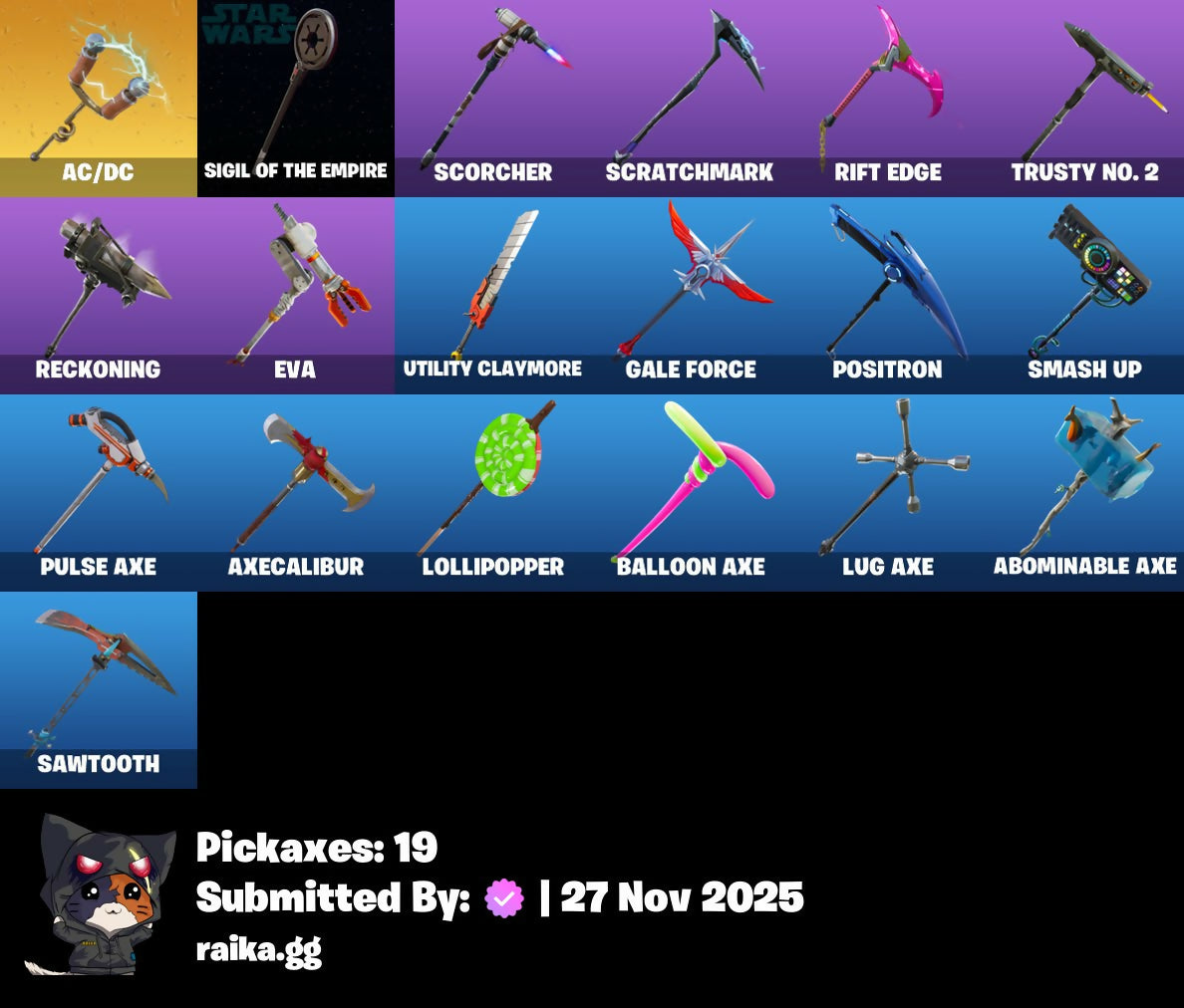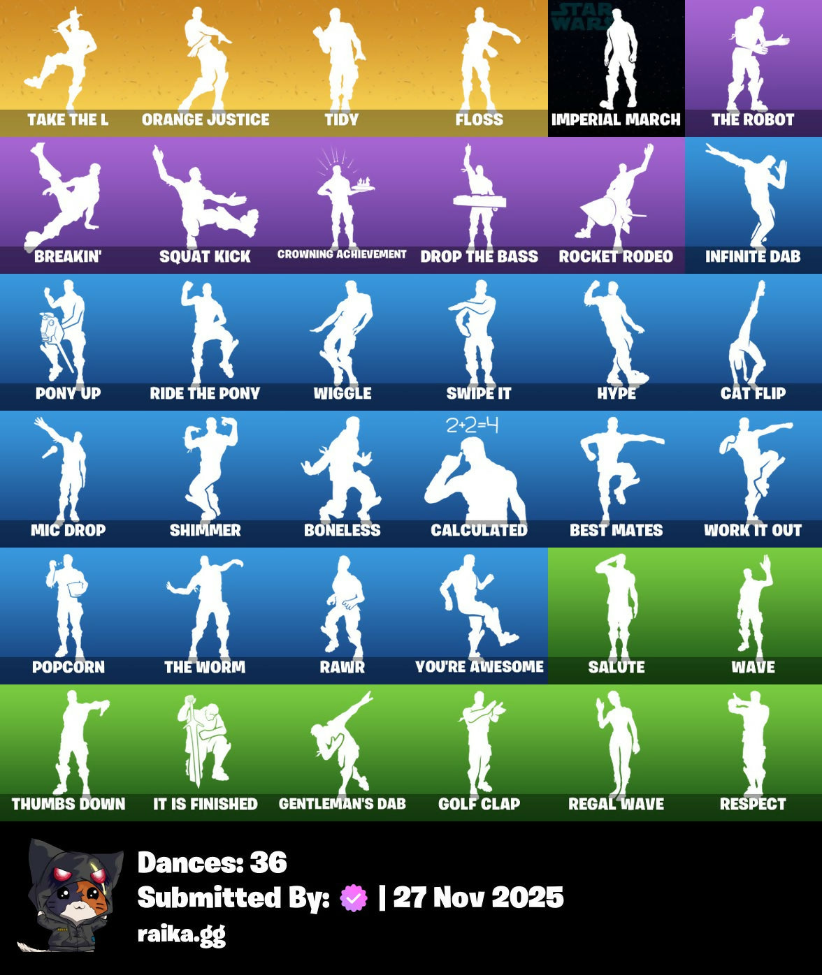 Abominable Axe, Abstrakt, Ac/Dc, Axecalibur, Balloon Axe, Battlehawk, Best Mates, Black Knight, Blue Squire, Blue Striker, Blue Team Leader, Boneless, Breakin', Calamity, Calculated, Carbide, Cat Flip, Crowning Achievement, DJ Yonder, Dark Voyager, Drift, Drop the Bass, Elite Agent, Eva, Floss, Gale Force, Gentleman's Dab, Golf Clap, Huntress, Hype, Imperial March, Infinite Dab, It Is Finished, Lollipopper, Lug Axe, Lynx, Mic Drop, Mission Specialist, Moonwalker, Orange Justice, Pony Up, Popcorn, Positron, Powder, Pulse Axe, Rawr, Reckoning, Redline, Regal Wave, Respect, Ride the Pony, Rift Edge, Rocket Rodeo, Rogue Agent, Royale Knight, Rust Lord, Salute, Sawtooth, Scorcher, Scratchmark, Sgt. Winter, Shimmer, Sigil Of The Empire, Sledgehammer, Smash Up, Sparkle Specialist, Squad Leader, Squat Kick, Sun Strider, Swipe It, Take the L, Teknique, The Reaper, The Robot, The Worm, Thumbs Down, Tidy, Trusty No. 2, Utility Claymore, Valor, Wave, Wiggle, Wingman, Work It Out, You're Awesome, Zenith, Zoey