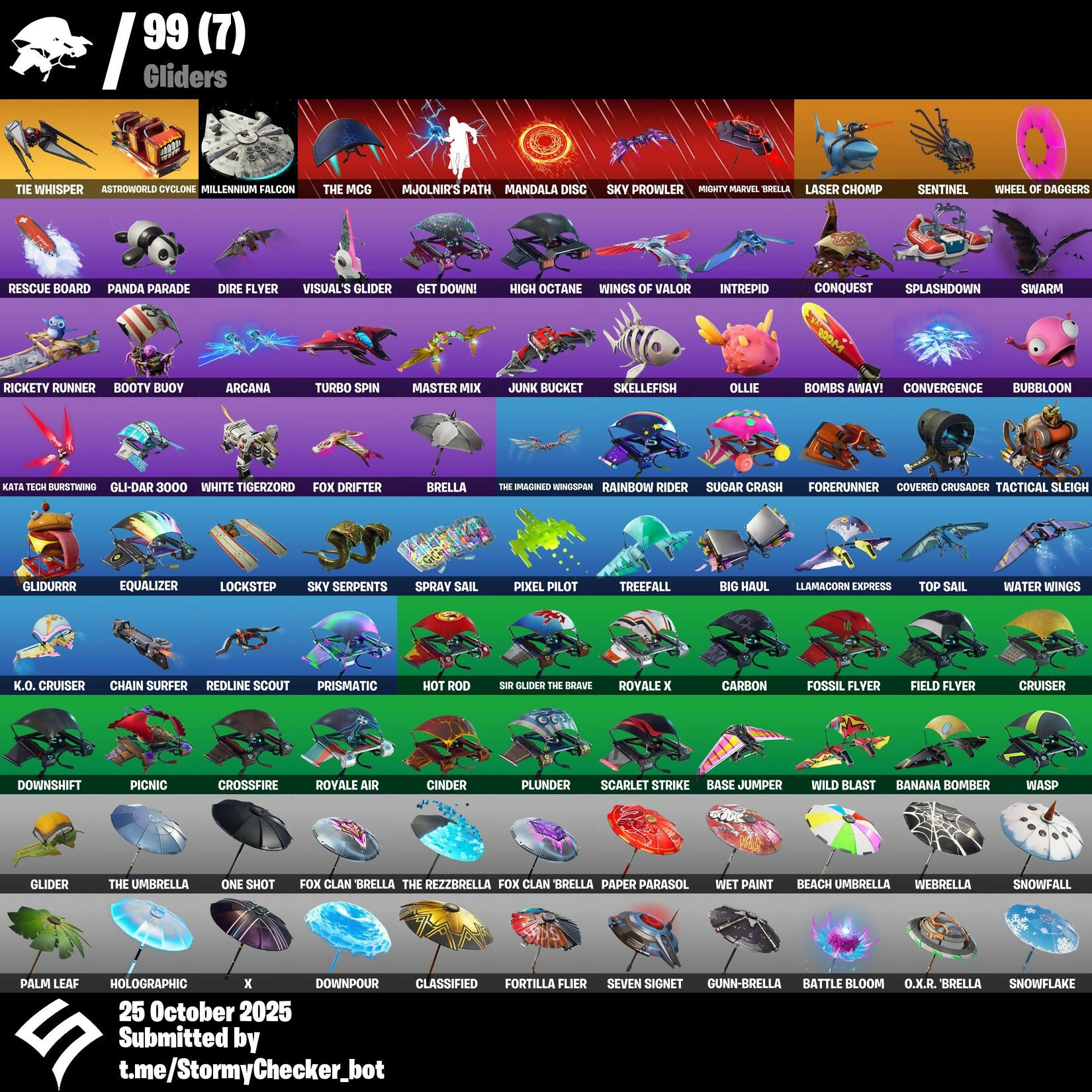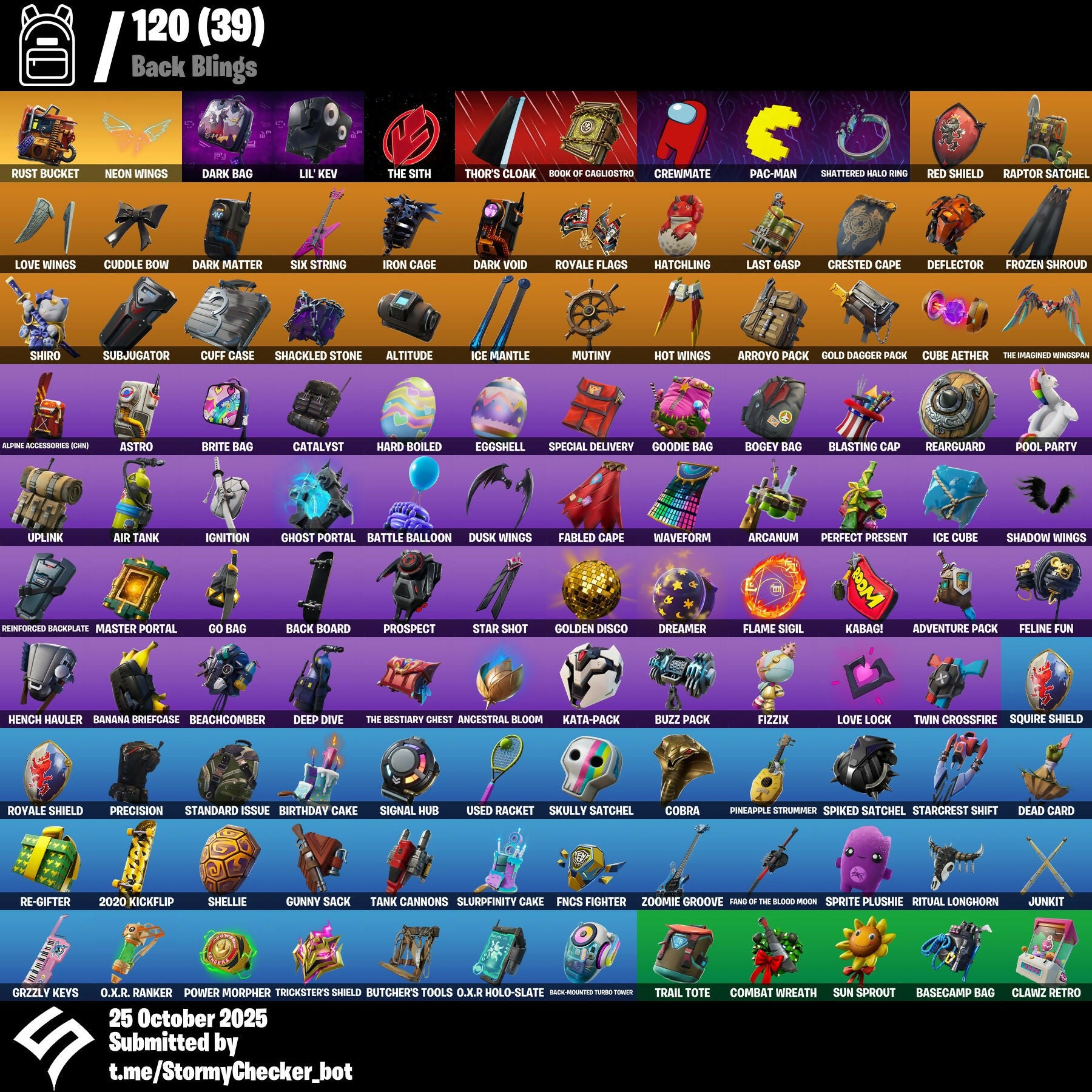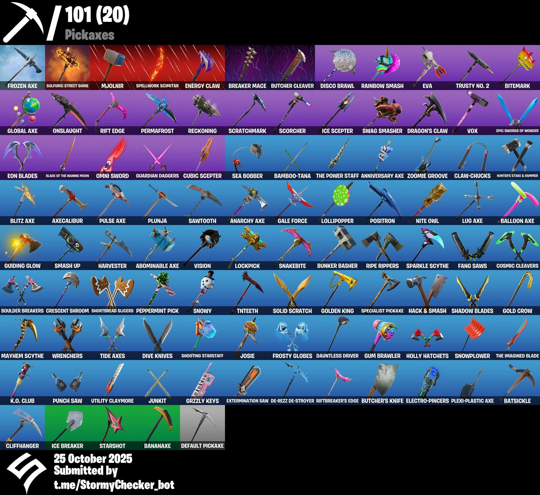 2020 Kickflip, Abominable Axe, Absolute Zero, Adventure Pack, Aerial Assault Trooper, Agent Peely, Air Shredder, Air Tank, Alpine Accessories (CHN), Alpine Ace (CHN), Altitude, Anarchy Axe, Ancestral Bloom, Anniversary Axe, Arcana, Arcanum, Arroyo Pack, Ascend!, Astro, Astroworld Cyclone, Aura, Axecalibur, Back Board, Back-Mounted Turbo Tower, Baller, Balloon Axe, Bamboo-Tana, Banana Bomber, Banana Briefcase, Bananaxe, Base Jumper, Basecamp Bag, Batsickle, Battle Balloon, Battle Bloom, Battle Hound, Battlehawk, Beach Umbrella, Beachcomber, Beep Beep, Best Mates, Big Haul, Bike To Go, Birdie, Birthday Cake, Bitemark, Blackheart, Blade of the Waning Moon, Blasting Cap, Blitz Axe, Blowing Bubbles, Blue Squire, Bogey Bag, Bombastic, Bombs Away!, Boobytrapped, Boogie Down, Book of Cagliostro, Booty Buoy, Boulder Breakers, Breakdown, Breaker Mace, Breakneck, Brella, Brite Bag, Brite Gunner, Brseason1, Brutus, Bubloon, Bunker Basher, Bunker Jonesy, Bunny Brawler, Bunnymoon, Butcher Cleaver, Butcher's Knife, Butcher's Tools, Buzz Pack, Calamity, Calculated, Call Me, Capoeira, Carbide, Carbon, Cat Flip, Catalyst, Chain Surfer, Chief Hopper, Choice Knit, Chromium, Cinder, Cipher, Classified, Claw-Chucks, Clawz Retro, Cliffhanger, Cloaked Shadow, Cluck Strut, Cobalt, Cobra, Coin Flip, Combat Wreath, Conga, Conjure Weapon, Conquest, Convergence, Cosmic Cleavers, Covered Crusader, Crescent Shroom, Crested Cape, Crewmate, Crossfire, Crowning Achievement, Cruiser, Cube Aether, Cubic Scepter, Cuddle Bow, Cuddle Hearts, Cuddle Team Leader, Cuff Case, Cyclo Curl, DJ Yonder, Dab, Dabstand, Dagger Dance, Dance Moves, Dark Bag, Dark Bomber, Dark Matter, Dark Vanguard, Dark Void, Dark Voyager, Dauntless Driver, Dazzle, De-Rezz De-Stroyer, Dead Card, Deadfire, Decaying Dribbler, Deep Dive, Default Pickaxe, Deflector, Dip, Dire Flyer, Disco Brawl, Distraction Dance, Dive Knives, Doctor Strange, Dominion, Don't Start Now, Downpour, Downshift, Dragon Stance, Dragon's Claw, Dreamer, Drift, Dusk, Dusk Wings, Eggshell, Electro Shuffle, Electro-Pincers, Elite Agent, Ember, Energy Claw, Enforcer, Eon Blades, Epic Swords of Wonder, Equalizer, Erisa, Eva, Extermination Saw, Extraterrestrial, FNCS Fighter, Fable, Fabled Cape, Fade, Fang Saws, Fang of the Blood Moon, Feline Fun, Field Flyer, Fireworks Team Leader, Fizzix, Flame Sigil, Flippin' Away, Flippin' Sexy, Forerunner, Fortilla Flier, Fossil Flyer, Fox Clan 'Brella, Fox Drifter, Free Flow, Freemix, Frosty Globes, Frozen Axe, Frozen Shroud, Funk Ops, Galaxian, Gale Force, Gear Specialist Maya, Gentleman's Dab, Get Down!, Get Funky, Ghost Portal, Giddy-Up, Gli-Dar 3000, Glider, Glidurrr, Glitter, Global Axe, Go Bag, Gold Crow, Gold Dagger Pack, Golden Disco, Golden King, Golf Clap, Good Sportsmanship, Goodie Bag, Groove Jam, Grzzly Keys, Guardian Daggers, Guiding Glow, Gum Brawler, Gun Show, Gunn-Brella, Gunnar, Gunny Sack, Hack & Smash, Hard Boiled, Harvester, Hatchling, Heart Sign, Hello Friend, Hench Hauler, High Octane, Hime, Holly Hatchets, Holographic, Hot Marat, Hot Rod, Hot Wings, Hunter's Stake & Hammer, Huntress, Hybrid, Hype, Ice Breaker, Ice Cube, Ice Mantle, Ice Scepter, Ignition, Infinite Dab, Intrepid, Iron Cage, It's A Vibe, It's Go Time!, It's... You?, Jaywalking, Jellie, Joltara, Josie, Jules, Jump Jets, Jungle Scout, Junk Bucket, Junkit, K.O. Club, K.O. Cruiser, Kabag!, Kata Tech Burstwing, Kata-Pack, Keep It Mello, Kiara K.O., Kick Ups, Krisabelle, Laguna, Laser Chomp, Last Gasp, Lil' Diplodocus, Lil' Kev, Lil' Warthog, Liteshow, Llama Bell, Llamacorn Express, Lockpick, Lockstep, Lollipopper, Love It!, Love Lock, Love Ranger, Love Wings, Lt. Evergreen, Lug Axe, Lynx, Mandala Disc, Marked Marauder, Master Mix, Master Portal, Mayhem Scythe, Meat Grinder, Meowscles, Mic Drop, Microflip, Midas, Mighty Marvel 'Brella, Millennium Falcon, Mission Specialist, Mjolnir, Mjolnir's Path, Moniker, Moonwalker, Mutiny, Nana Nana, Neon Wings, Nite Owl, Nog Ops, O.X.R. 'Brella, O.X.R. Holo-Slate, O.X.R. Ranker, Obi-Wan's Message, Ocean, Ollie, Omega, Omni Sword, One Shot, Onesie, Onslaught, Orange Justice, Pac-Brained, Pac-man, Palm Leaf, Panda Parade, Pandemonium, Paper Parasol, Paws & Claws, Peace Out, Peekaboo, Peely, Peppermint Pick, Perfect Present, Permafrost, Picnic, Pineapple Strummer, Pixel Pilot, Plexi-Plastic Axe, Plunder, Plunja, Point It Out, Polar Peely, Pony Up, Pool Party, Popcorn, Positron, Powder, Power Chord, Power Morpher, Praise The Tomato, Precision, Prismatic, Prospect, Prowler, Pulse Axe, Punch Saw, Pyg The Butcher, Rabbit Raider, Rage, Ragnarok, Rainbow Rider, Rainbow Smash, Raptor, Raptor Satchel, Raven, Re-Gifter, Reanimated, Rearguard, Reckoning, Recon Specialist, Red Knight, Red Shield, Redline, Redline Scout, Reef Ranger, Regal Wave, Reinforced Backplate, Renegade Raider, Rescue Board, Respect, Respect The Peace, Rickety Runner, Ride The Pony, Rift Edge, Riftbreaker's Edge, Ripe Rippers, Ritual Longhorn, Rock Out, Rocket Spinner, Rogue Agent, Rook, Rox, Royale Air, Royale Flags, Royale Knight, Royale Shield, Royale X, Running Man, Rust Bucket, Rust Lord, Sad Trombone, Safari, Salute, Sawtooth, Scarlet Strike, Scorcher, Scourge, Scratchmark, Scuba Jonesy, Sea Bobber, Search For Clues, Segway Tour, Sentinel, Seven Signet, Sgt. Winter, Shackled Stone, Shadow Blades, Shadow Boxer, Shadow Ops, Shadow Wings, Sharpshooter, Shattered Halo Ring, Shellie, Shimmer, Shiro, Shooting Starstaff, Shortbread Slicers, Side Hustle, Sidewinder, Sign Spinner, Signal Hub, Sir Glider The Brave, Six String, Skellefish, Skull Trooper, Skully, Skully Satchel, Sky Prowler, Sky Serpents, Sky Stalker, Skye, Sledgehammer, Slitherin', Slumber, Slurpfinty Cake, Smash Up, Snakebite, Snap, Snoozefest, Snowfall, Snowflake, Snowplower, Snowshaker, Snowy, So Square, Solid Scratch, Sparkle Scythe, Sparkle Supreme, Special Delivery, Special Forces, Specialist Pickaxe, Spellwork Scimitar, Spiked Satchel, Splashdown, Spooky Stroll, Spray Sail, Springy, Sprite Plushie, Squad 
