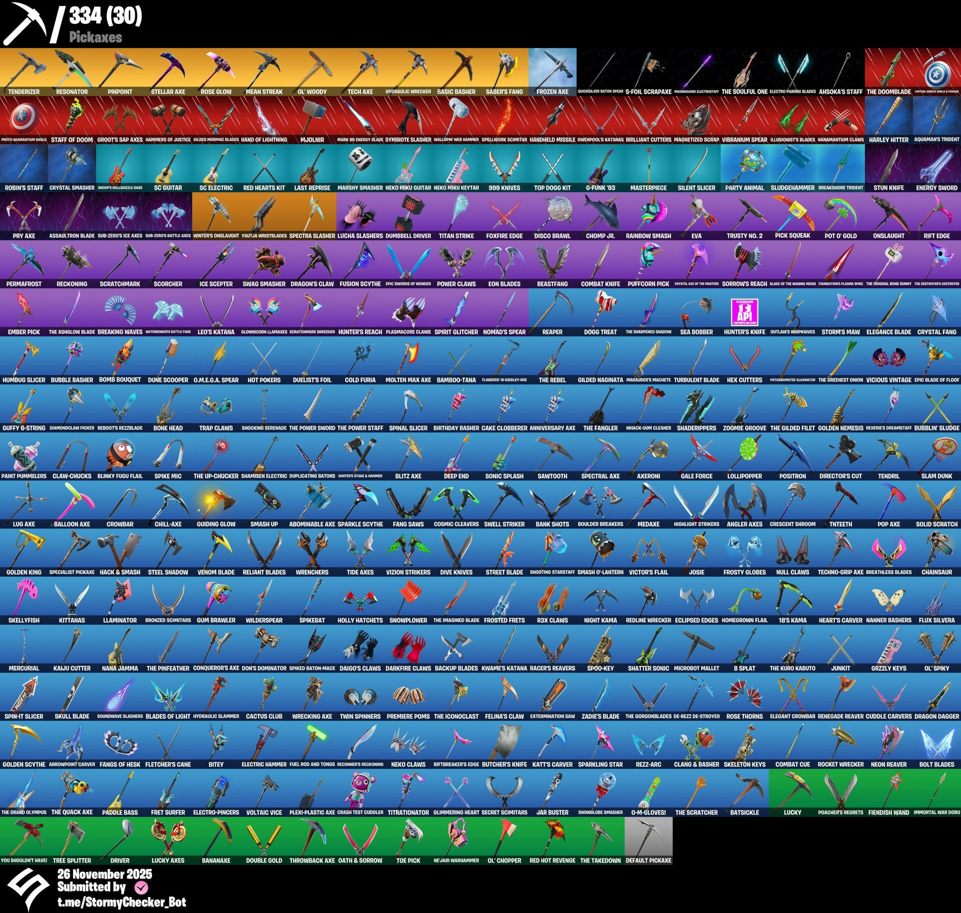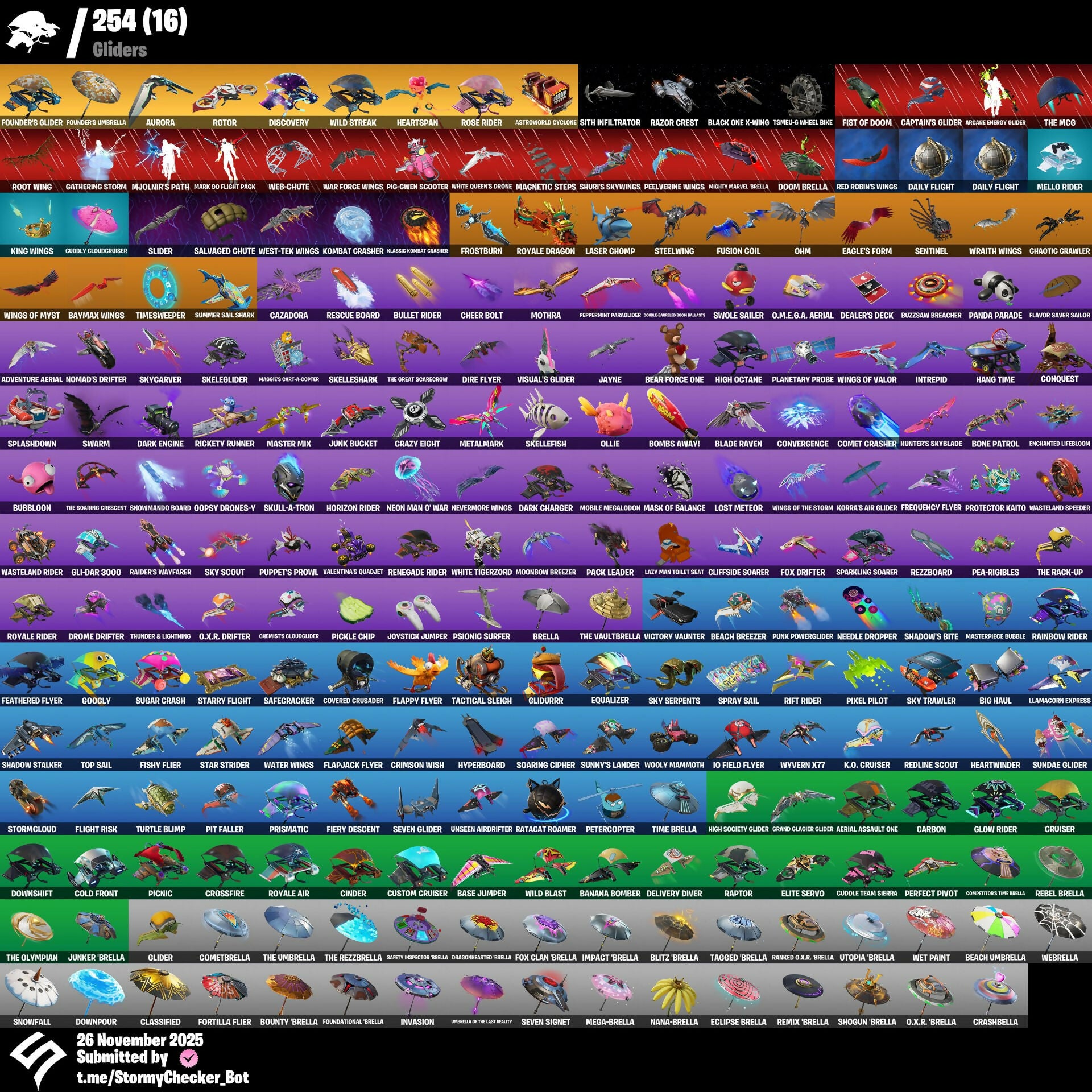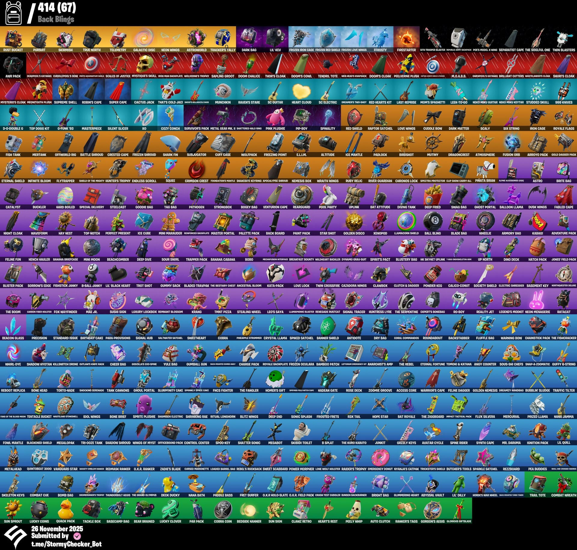 (Snikt!), 1-Ball, 10 Field Flyer, 18's Kama, 8-Ball Janky, 8-Ball Vs Scratch, 999 Knives, A Warrior Prepares, Abominable Axe, Absolute Zero, Abstrakt, Abyssal Vault, Access Core, Adventure Aerial, Adventure Pack, Aerial Assault Bomber, Aerial Assault One, Aerial Assault Trooper, Afterparty, Agent Jones, Agent Patch, Agent Peely, Ahsoka's Staff, Ain't It Fun, Air Horn, Air Shredder, Alim, Alli, Alpine Accessories (USA), Alpine Ace (USA), Altitude, Anarchists Amp, Ancestral Bloom, Andy Fangerson, Angler Axes, Angy Counter, Anniversary Axe, Antidote, Antonia, Aphrodite, Apocalypse Shroud, Apprentice Evie, Aquaman, Aquaman's Trident, Arcane Energy Glider, Arcane Research, Ares, Armory Bag, Arrowpoint Carver, Arroyo Pack, Artemis, Ascend!, Assault Trooper, Assaultron Blade, Astro, Astro Jack, Astroworld, Astroworld Cyclone, Atmosphere, Aura, Aurora, Auto Clutch, Avatar Cycle, Avatar's Flourish, Aw, Shucks., Awr Pack, Axeroni, Ayla Winn, B Splat, BB Belt, Back Board, Back-Handled Bombs Away, Backstabber, Backup Blades, Ball Bling, Baller, Balloon Axe, Balloon Llama, Bamboo Patch, Bamboo-Tana, Banana Bomber, Banana Briefcase, Banana Cabana, Bananaxe, Bandolier, Bank Shots, Banner Shield, Baron's Hoard, Base Jumper, Basecamp Bag, Basement Key, Bash, Basic Basher, Bat Attitude, Bat Royale, Batsickle, Battle Blessing, Battle Gamer Mae, Battle Hound, Battle Shroud, Battlehawk, Baymax Wings, Beach Breezer, Beach Umbrella, Beachcomber, Beacon Glass, Bear Brained, Bear Force One, Beastfang, Bedside Nanner, Beef Boss, Beep Beep, Bernie, Best Mates, Big Dill, Big Fan, Big Haul, Bike To Go, Billy Bounce, Bird Call, Birdarang Flourish, Birdshot, Birthday Basher, Birthday Cake, Bitey, Black Knight, Black One X-Wing, Blackened Shield, Blackheart, Blade Bag, Blade Raven, Blade of the Waning Moon, Bladed Travpak, Blades of Light, Blaze, Blinky Fishstick, Blinky Fugu Flail, Blister Pack, Blitz 'Brella, Blitz Axe, Blitz Wings, Blowing Bubbles, Blustery Bag, Bobo, Bogey Bag, Boing!, Bolt Blades, Bomb Bag, Bomb Bouquet, Bombs Away!, Bone Breaker, Bone Brief, Bone Head, Bone Patrol, Boneless, Bones, Boogie Down, Boomin', Boot It, Boulder Breakers, Bounty 'Brella, Bow Go, Breakdown, Breakfast Bounty, Breaking Point, Breaking Waves, Breakneck, Breakshore Trident, Breathless Blades, Brella, Bright Bag, Brilliant Cutters, Bring It, Brite Bag, Brite Gunner, Brite Moves, Brite Raider, Bronzed Scimitars, Brush Your Shoulders, Brutus, Bubble Basher, Bubblin' Sludge, Bubbly Sludge, Bubloon, Buckler, Bullet Rider, Bullseye, Bunsen Backburner, Burnout, Butcher's Knife, Butcher's Tools, Buzz Knight, Buzzsaw Breacher, C'Mere, Cactus Club, Cactus Jack, Cake Clobberer, Calamity, Calculated, Calico-Conut, Call Me, Cameo Vs Chic, Captain America, Captain Jones, Captain Jones' Shield & Hook, Captain Lamerica, Captain Phasma, Captain's Glider, Carbide, Carbon, Carbon Fiber Holster, Card Drop, Cardistry, Carmine Rosso, Cassidy Quinn, Catalyst, Catflip, Cauldron Chill, Cazadora, Cazadora Wings, Cerberus, Chainsaur, Chainstick Pack, Chaos Director, Chaotic Crawler, Charge Pack, Che Che, Cheer Bag, Cheer Bolt, Chef's Special, Chemist's Cloudglider, Chicken, Chill-Axe, Choice Knit, Chomp Jr., Chomp Sr., Chronos Lock, Chugga-Chugga, Cinder, Clang & Basher, Classified, Claw-Chucks, Clawbox, Clawz Retro, Clean Sweep, Cliché, Click!, Cliffside Soarer, Clip Show Carry-All, Clone Trooper, Clutch & Dagger, Cobalt, Cobra, Cobra Coin, Codsworth's Cleanup, Coin Flip, Cold Front, Cold Furia, Combat Cue, Combat Knife, Combat Wreath, Comet Crasher, Cometbrella, Competitor's Time Brella, Conch Call, Conga, Conqueror's Axe, Conqueror's Claim, Conquest, Control Center, Convergence, Coral Commandos, Corrupted Voyager, Cosmic Cleavers, Count It!, Covered Crusader, Cozy Conch, Crack It, Crackshot, Crash Test Cuddler, Crashbrella, Crazy Eight, Crescent Shroom, Crested Cape, Criminals, Crimson Crest, Crimson Wish, Criss Cross, Crossfire, Crowbar, Crowning Achievement, Cruiser, Crystal Axe of the Masters, Crystal Fang, Crystal Llama, Crystal Smasher, Cuddle Bow, Cuddle Carvers, Cuddle Hearts, Cuddle Team Leader, Cuddle Team Sierra, Cuddle Team Specialist, Cuddlepool, Cuddly Cloudcruiser, Cudgelopolis's Bow, Cuff Case, Cursed Marionette, Custom Cruiser, Cyberdyne Salute, Cyclo Curl, D-O-Double G, DJ Yonder, Dab, Dabstand, Dagger Dance, Daigo, Daigo's Claws, Daily Flight, Dance Moves, Danica, Dark Bag, Dark Bomber, Dark Charger, Dark Doggo, Dark Engine, Dark Matter, Dark Voyager, Darkfire Claws, De-Rezz De-Stroyer, Deadpool, Deadpool's Katanas, Dealer's Deck, Deck Ducky, Deep Dive, Deep End, Deep Fried, Default Pickaxe, Deimos, Delivery Diver, Diamond Throne, Diamondclaw Picker, Dice Roll, Die With A Smile, Die With A Smile Bruno, Diecast, Dino Deck, Dino Megazord, Dip, Dire, Dire Flyer, Director's Cut, Disassemble, Disco Brawl, Disco Fever, Discovery, Diva Fever, Dive Knives, Diving Tank, Do The Split, Doctor Doom, Dogg Treat, Dominator, Don's Dominator, Don't Start Now, Doom, Doom Brella, Doom Chalice, Doom's Cloak, Doom's Cowl, Doom's Domain, Double Gold, Double Helix, Double-Barreled Boom Ballists, Downpour, Downshift, Doze Dab, Dragon Dagger, Dragon Dagger's Song, Dragon Stance, Dragon's Claw, Dragoncrest, Dragonhearted 'Brella, Dreamer's Two-Shot, Dreamzy Handbag, Drift, Driver, Drome Drifter, Dromedunner's Trophy, Droop, Drum Major, Dry Bag, Duelist's Card Trick, Duelist's Foil, Dumbbell Driver, Dune Scooper, Dupli-Kate, Duplicates, Duplicating Batons, Durrr Taisho, Dusk, Dusk Wings, Dynamo Grav-Suit, Dynamo Tntina, E.L.I.M., Eagle, Eagle's Form, Eclipse Brella, Eclipsed Edges, Electric Hammer, Electric Shredder, Electro Pairing Blades, Electro Shuffle, Electro-Pincers, Elegance Blade, Elegant Crowbar, Elite Agent, Elite Servo, Ember Pick, Emergency Donut, Emma Frost, Empress Fan Dance, Empty Out Your Pockets, Enchanted Lifebloom, Endless Scroll, Energy Sword, Enforcer, Eon, Eon Blades, Epic Blade of Floof, Epic Swords of Wonder, Equalizer, Era, Eren Ja