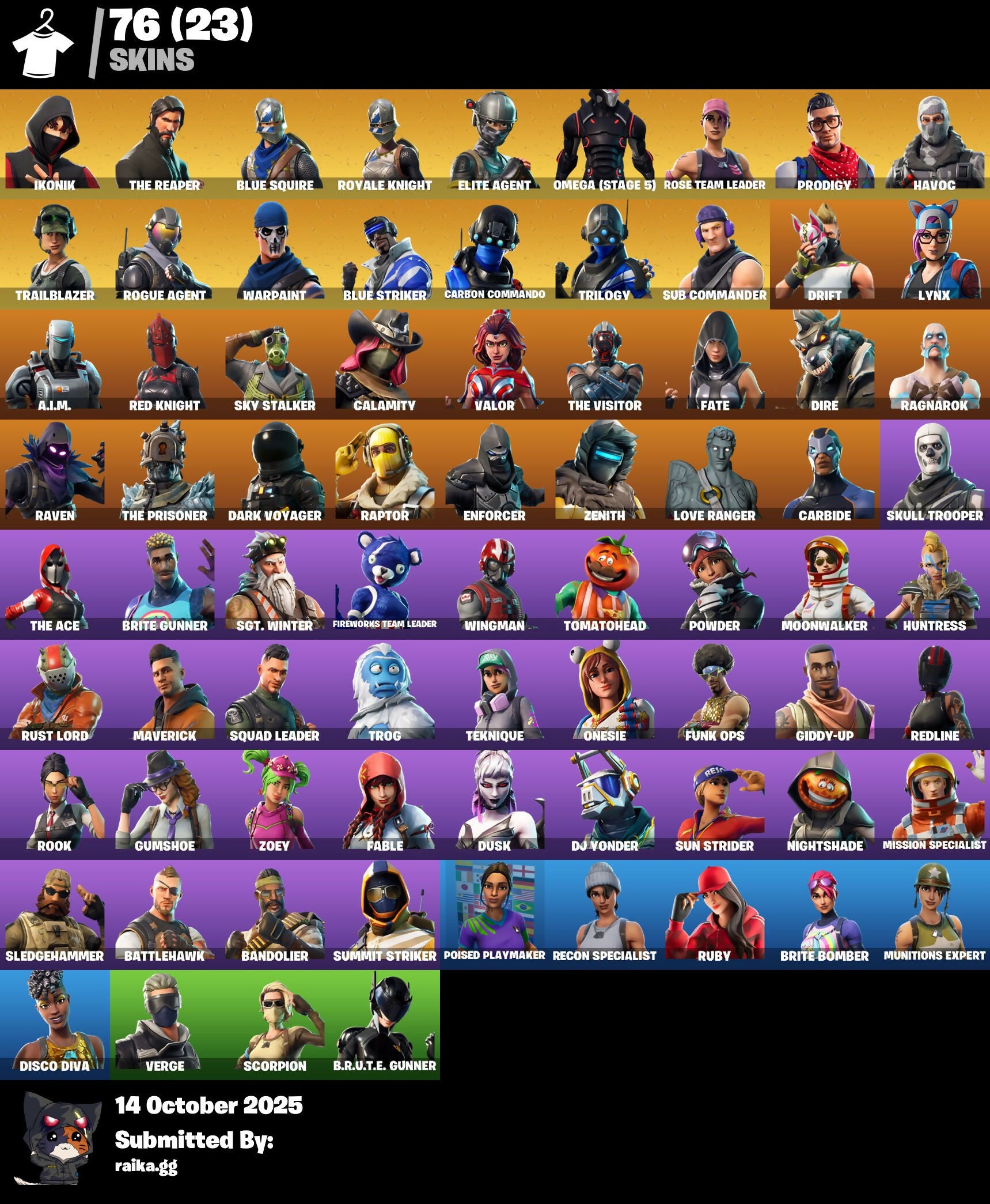 OG Fortnite Account☑️76 Skins☑️IKONIK☑️S2 Knights☑️The Reaper☑️Omega (Purple Lights)☑️Twitch Prime☑️Blue Striker☑️Rogue Agent☑️Crowbar☑️OG Raider's Revenge (Black and Gold)☑️Freestylin'☑️Fresh☑️Take the L☑️Mako☑️