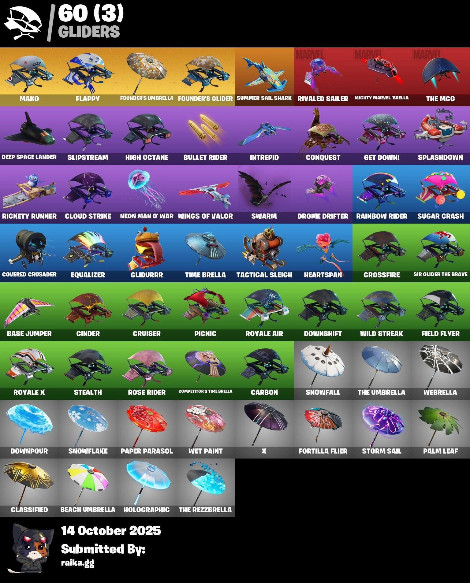 A.I.M., Abominable Axe, Altitude, Ancestral Bloom, Armory Bag, Astro, Axecalibur, B.R.O.T.E. Gunner, B.R.U.T.E. Gunner, Backup Plan, Balloon Axe, Bandolier, Base Jumper, Basecamp Bag, Basic Basher, Bat Attitude, Battle Bus, Battlehawk, Beach Umbrella, Beachcomber, Best Mates, Birthday Cake, Blade Of The Waning Moon, Blasting Cap, Blue Shift, Blue Squire, Blue Striker, Bogey Bag, Boogeyman, Boogie Down, Boulder Breakers, Breakdown, Bring It, Brite Bag, Brite Bomber, Brite Gunner, Bullet Rider, Calamity, Calculated, Call Me, Carbide, Carbon, Carbon Commando, Carbon Pack, Cat Flip, Catalyst, Cinder, Clang & Basher, Classified, Clawz Retro, Cloud Strike, Clown, Competitor's Time Brella, Confidential Case, Conquest, Constructor, Controller, Covered Crusader, Crimson Axe, Crossfire, Crowbar, Crowning Achievement, Cruiser, Crystal Llama, DJ Yonder, Dab, Dark Matter, Dark Voyager, Deep Dive, Deep Space Lander, Dire, Disco Ball, Disco Brawl, Disco Diva, Disco Fever, Downpour, Downshift, Drift, Drome Drifter, Dromerunner's Trophy, Dusk, Dusk Wings, E.L.I.M., Electro Shuffle, Elite Agent, Enforcer, Equalizer, Eva, F, Fable, Fabled Cape, Face Palm, Fate, Field Flyer, Finger Guns, Finger Wag, Fireworks Team Leader, Flamenco, Flappy, Flippin' Away, Flippin' Sexy, Forebearer, Fortilla Flier, Founder's Glider, Founder's Umbrella, Free Flow, Freestylin', Fresh, Frozen Shroud, Funk Ops, Gale Force, Gentleman's Dab, Get Down!, Get Funky, Get Lost, Ghost Portal, Giddy-Up, Glidurrr, Golden Disco, Golf Clap, Goodie Bag, Groove Jam, Ground Pound, Guiding Glow, Gumshoe, Gun Show, Gwenpool's Katanas, Havoc, Heartspan, Hello Friend, High Octane, Holographic, Horde Desert 1, Hot Marat, Howl, Huntress, Hydraulic Wrecker, Hype, I Declare!, Ice Cube, Ikonik, Instigator, Intrepid, Iron Cage, It's Go Time!, James's ESP Snakebyte, Job Well Done, Kata-Pack, Keep It Mello, Last Gasp, Lollipopper, Love Ranger, Love Wings, Lug Axe, Lynx, Make A Seat, Mako, Marshy Smasher, Master Portal, Maverick, Mean Streak, Metalhead, Mic Drop, Mighty Marvel 'Brella, Mission Specialist, Moonwalker, Munitions Expert, Nana Bath, Nanner Bashers, Neon Man O' War, Night Cloak, Nightshade, Offworld Rig, Og Raider's Revenge, Ol' Spiky, Ol' Woody, Omega (Stage 5), Ominous Orb, Onesie, Onslaught, Orange Justice, Outlander, Outlaw's Knife Rack, Outlaw's Whipknives, Padlock, Palm Leaf, Paper Parasol, Peely Whip, Perfect Present, Permafrost, Phone It In, Picnic, Pip-Boy, Poised Playmaker, Pony Up, Pool Party, Pop Lock, Popcorn, Positron, Powder, Precision, Prodigy, Pulse Axe, Pursuit, Ragnarok, Rainbow Rider, Rainbow Smash, Ranker's Tags, Raptor, Raptor Satchel, Raven, Rearguard, Reckoning, Recon Specialist, Red Alert, Red Knight, Red Shield, Redline, Regal Wave, Reliant Blue, Respect, Respect The Peace, Rickety Runner, Ride The Pony, Rift Edge, Rivaled Sailer, Rock Paper Scissors, Rogue Agent, Rook, Rose Glow, Rose Rider, Rose Team Leader, Roundhouse, Royale Air, Royale Knight, Royale Shield, Royale X, Ruby, Running Man, Rust Bucket, Rust Lord, Salute, Sawtooth, Scenario, Scorcher, Scorpion, Scratchmark, Sgt. Winter, Shimmer, Shooting Starstaff, Sir Glider The Brave, Skirmish, Skull, Skull Sickle, Skull Trooper, Sky Stalker, Sledgehammer, Slipstream, Slitherin', Slow Clap, Smash Up, Snakebite, Snowfall, Snowflake, Soldier, Special Delivery, Spectra Protector, Splashdown, Squad Leader, Squat Kick, Squire Shield, Standard Issue, Stealth, Steel Wool, Storm Sail, Sub Commander, Subjugator, Sugar Crash, Summer Sail Shark, Summit Striker, Sun Strider, Swag Bag, Swarm, Swipe It, T-Pose, Tabulator, Tactical Sleigh, Take The Cake, Take The Elf, Take The L, Tech Axe, Teknique, Tenderizer, The Ace, The Mcg, The Prisoner, The Reaper, The Rezzbrella, The Robot, The Umbrella, The Visitor, The Worm, Time Brella, Tomatohead, Top Notch, Trail Tote, Trailblazer, Trilogy, Trog, True Love, True North, Trusty No. 2, Uplink, Valor, Verge, Vindertech Elite, Warpaint, Wasteland Stoneshell, Wave, Waveform, Webrella, Wet Paint, Wild Streak, Wingman, Wings of Valor, Wolfpack, X, Yay!, You're Awesome, Zenith, Zoey
