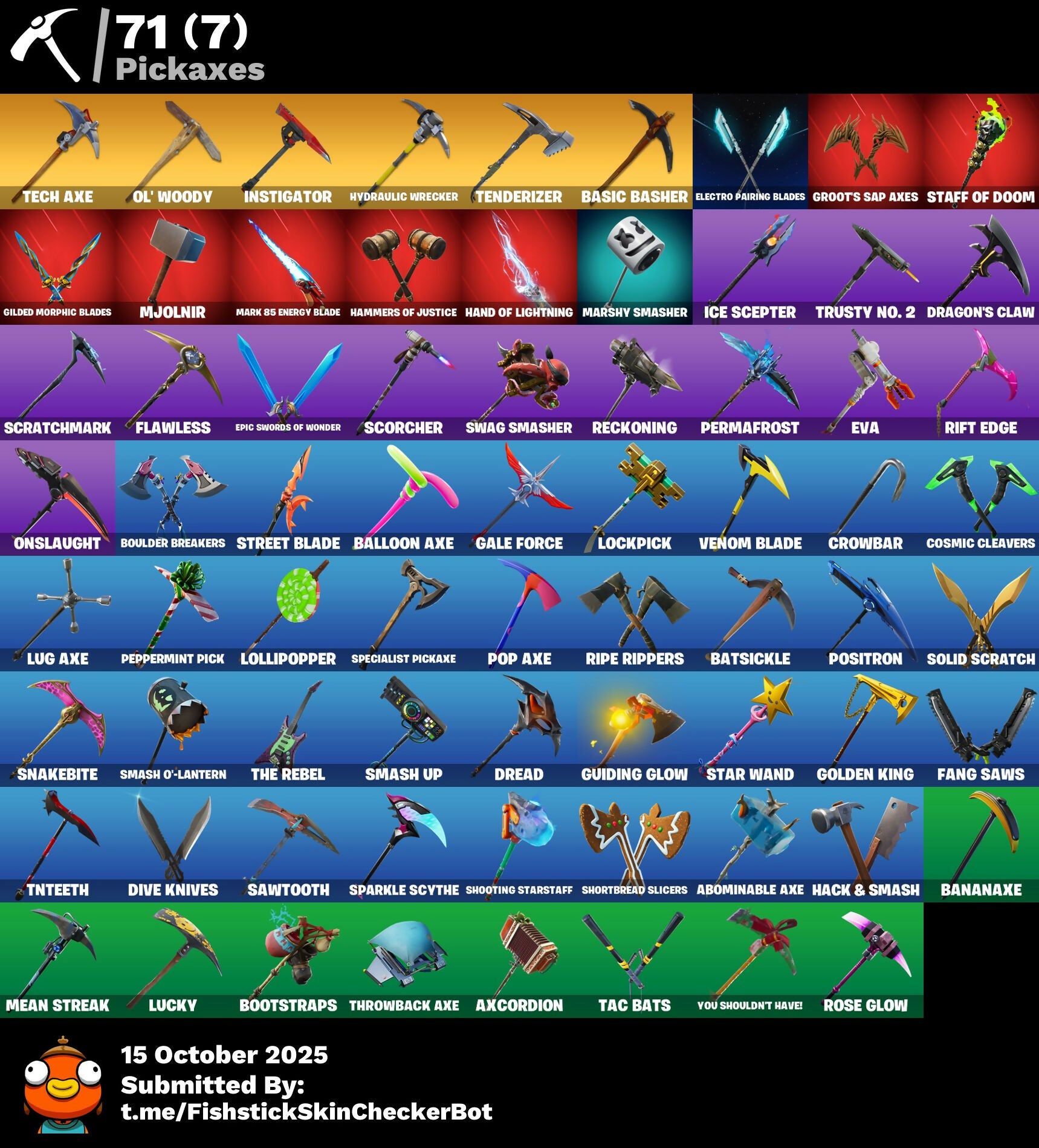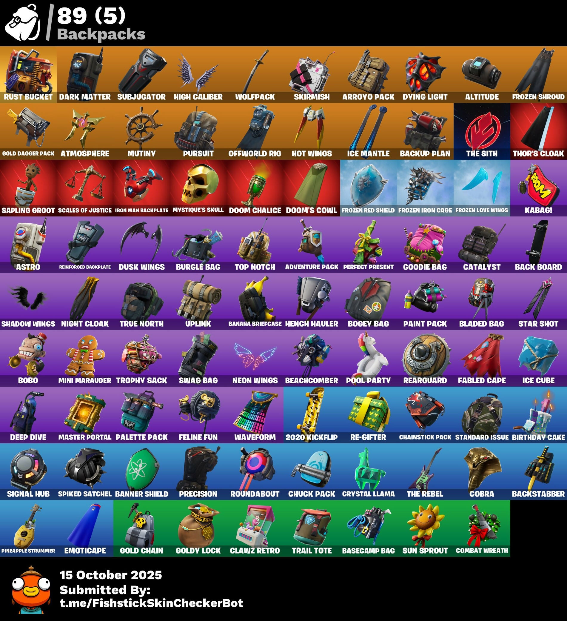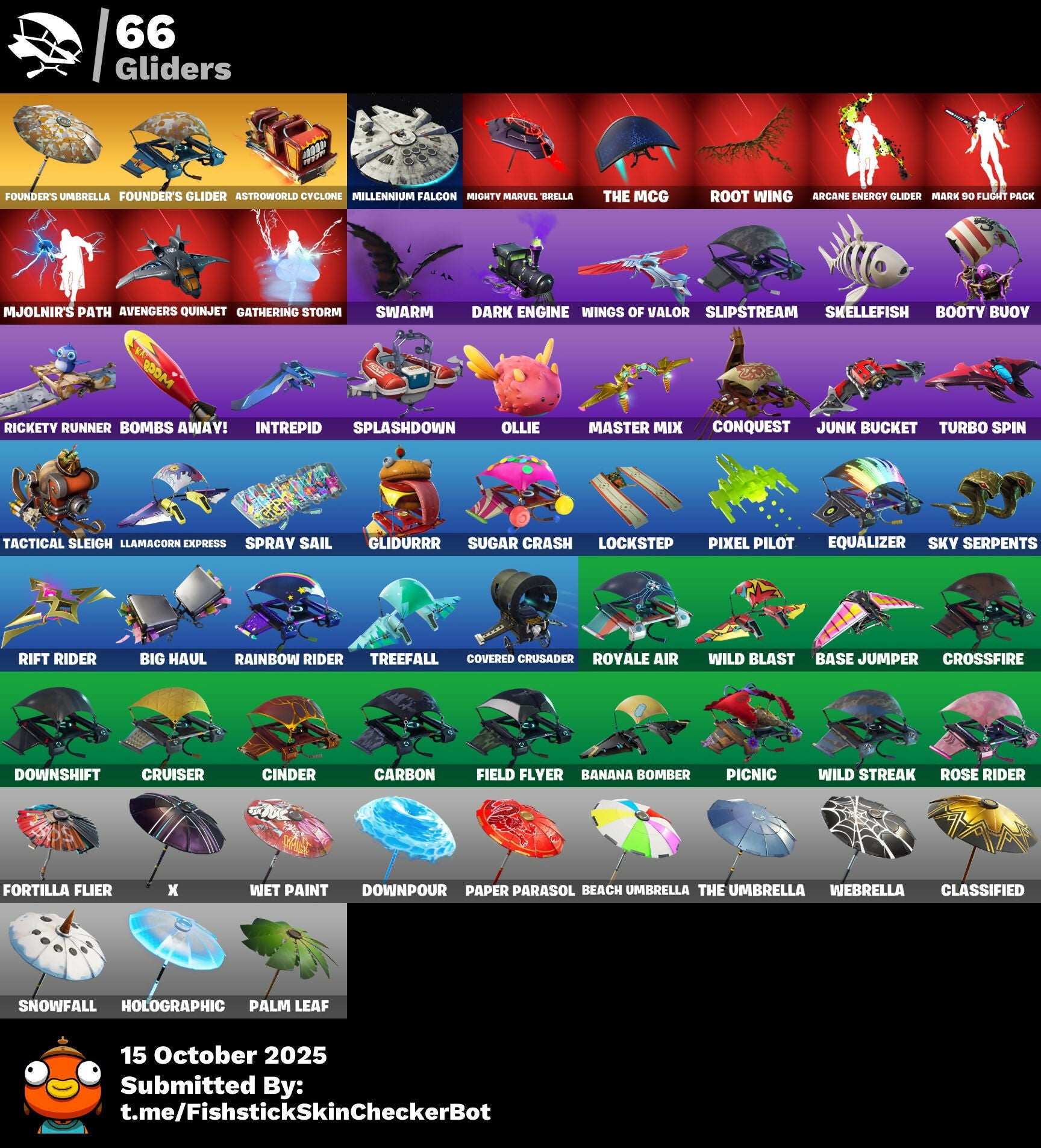 2020 Kickflip, Abominable Axe, Adventure Pack, Agent Peely, Air Horn, Altitude, Arcane Energy Glider, Arroyo Pack, Astro, Astroworld Cyclone, Atmosphere, Aura, Avengers Quinjet, Axcordion, Back Board, Backstabber, Backup Plan, Balloon Axe, Banana Bomber, Banana Briefcase, Bananaxe, Banner Shield, Base Jumper, Basecamp Bag, Basic Basher, Batsickle, Battlehawk, Beach Umbrella, Beachcomber, Beep Beep, Best Mates, Big Haul, Birthday Cake, Blackheart, Bladed Bag, Blowing Bubbles, Bobo, Bogey Bag, Bombs Away!, Boogie Down, Bootstraps, Booty Buoy, Boulder Breakers, Breakdown, Breakneck, Brite Bomber, Brutus, Bunker Jonesy, Burgle Bag, Calamity, Calculated, Call Me, Carbide, Carbon, Cat Flip, Catalyst, Chainstick Pack, Chuck Pack, Cinder, Classified, Clawz Retro, Cloaked Shadow, Cluck Strut, Cobalt, Cobra, Coin Flip, Combat Wreath, Commando, Conga, Conquest, Constructor, Cosmic Cleavers, Covered Crusader, Crossfire, Crowbar, Cruiser, Crystal Llama, DJ Yonder, Dabstand, Dark Engine, Dark Matter, Dark Voyager, Deadpool, Deep Dive, Dire, Dive Knives, Doctor Doom, Doom Chalice, Doom's Cowl, Downpour, Downshift, Dragon Stance, Dragon's Claw, Dread, Drift, Dusk, Dusk Wings, Dying Light, Electro Pairing Blades, Electro Shuffle, Electro Swing, Elite Agent, Ember, Emoticape, Enforcer, Epic Swords of Wonder, Equalizer, Eva, Fable, Fabled Cape, Fang Saws, Featherweight, Feline Fun, Field Flyer, Fierce, Flamenco, Flawless, Flippin' Away, Focus, Fortilla Flier, Fortune, Founder's Glider, Founder's Umbrella, Free Flow, Freestylin', Frozen Iron Cage, Frozen Love Ranger, Frozen Love Wings, Frozen Raven, Frozen Red Knight, Frozen Red Shield, Frozen Shroud, Gale Force, Gathering Storm, Gear Specialist Maya, Gentleman's Dab, Get Funky, Giddy-Up, Gilded Morphic Blades, Glidurr, Gold Chain, Gold Dagger Pack, Gold Midas, Golden King, Goldy Lock, Golf Clap, Goodie Bag, Groot, Groots Sap Axes, Groove Jam, Guiding Glow, Hack & Smash, Hammers of Justice, Hand Signals, Hand of Lightning, Havoc, Hello Friend, Hench Hauler, High Caliber, Holographic, Hoop Master, Hot Marat, Hot Wings, Howl, Huntress, Hybrid, Hydraulic Wrecker, Hype, I Declare!, I'm Diamond, Ice Cube, Ice Mantle, Ice Scepter, Infectious, Infinite Dab, Instigator, Intrepid, Iris, Iron Man Backplate, It's Dynamite!, It's Go Time!, Jaywalking, Jennifer Walters, Job Well Done, Jubilation, Junk Bucket, Kabag!, Keep It Mello, Laguna, Laugh It Up, Llamacorn Express, Lockpick, Lockstep, Lollipopper, Lt. Evergreen, Lucky, Lug Axe, Luxe, Lynx, Make It Rain, Mark 85 Energy Blade, Mark 90 Flight Pack, Marshy Smasher, Master Key, Master Mix, Master Portal, Mean Streak, Meowscles, Merry Marauder, Mic Drop, Mighty Marvel 'Brella, Millennium Falcon, Mini Marauder, Mission Specialist, Mjolnir, Mjolnir's Path, Monster Team Banner, Moonwalker, Mutiny, Mystique, Mystique's Skull, Nana Nana, Neon Wings, Night Cloak, Nightshade, Nog Ops, Offworld Rig, Ol' Woody, Ollie, Omega, Onesie, Onslaught, Orange Justice, Out West, Outlander, Paint Pack, Palette Pack, Palm Leaf, Pandemonium, Paper Parasol, Paws & Claws, Peace Out, Peely, Peppermint Pick, Perfect Present, Permafrost, Picnic, Pineapple Strummer, Pixel Pilot, Point It Out, Pool Party, Pop Axe, Popcorn, Positron, Powder, Precision, Pumpernickel, Pursuit, Race Quit, Ragnarok, Rainbow Rider, Rapscallion, Re-Gifter, Rearguard, Reckoning, Recon Ranger, Red Jade, Red Strike, Red-Nosed Raider, Redline, Regal Wave, Reinforced Backplate, Respect, Respect The Peace, Rickety Runner, Ride The Pony, Rift Edge, Rift Rider, Ripe Rippers, Rogue Agent, Rook, Root Wing, Rose Glow, Rose Rider, Rose Team Leader, Roundabout, Rox, Royale Air, Ruin, Running Man, Rust Bucket, Rust Lord, Salute, Sapling Groot, Sawtooth, Say So, Scales of Justice, Scarlet Defender, Scorcher, Scratchmark, Seeker, Sentinel, Sgt. Winter, Shadow Wings, Shaolin Sip, Sharpshooter, Shimmer, Shooting Starstaff, Shortbread Slicers, Side Hustle, Sidewinder, Signal Hub, Skellefish, Skirmish, Skull, Sky Serpents, Skye, Sledgehammer, Slick, Slipstream, Slitherin', Slow Clap, Smash O'-Lantern, Smash Up, Snakebite, Snap, Snoozefest, Snowfall, Snowshaker, So Square, Soldier, Solid Scratch, Sparkle Scythe, Sparkle Supreme, Sparkler, Specialist Pickaxe, Spiked Satchel, Splashdown, Spray Sail, Springy, Squad Leader, Staff of Doom, Standard Issue, Star Shot, Star Wand, Steel Wool, Storm, Street Blade, Stride, Sub Commander, Subjugator, Sugar Crash, Summit Striker, Sun Sprout, Sun Strider, Swag Bag, Swag Smasher, Swarm, Swipe It, T-Pose, Tac Bats, Tactical Sleigh, Take The Cake, Take The Elf, Take The L, Tech Axe, Teknique, Tenderizer, The Ace, The Ice King, The Mcg, The Reaper, The Rebel, The Renegade, The Robot, The Sith, The Umbrella, The Visitor, Thor, Thor's Cloak, Throwback Axe, Tilted Teknique, Tnteeth, Tntina, Tony Stark, Top Notch, Tra La La, Trail Tote, Trailblazer, Treefall, Trog, Trophy Sack, True North, Trusty No. 2, Turbo Spin, Uplink, Valor, Venom Blade, Vice, Warpaint, Waveform, Waypoint, Webrella, Wet Paint, Widow's Pirouette, Wild Blast, Wild Streak, Wilde, Windmill Floss, Wingman, Wings Of Valor, Wolfpack, Wolverine, Wooly Warrior, World Cup 2019 Banner, X, X-Lord, Yay!, Yellowjacket, Yond3r, You Shouldn't Have!, You're Awesome, Zenith, Zoey