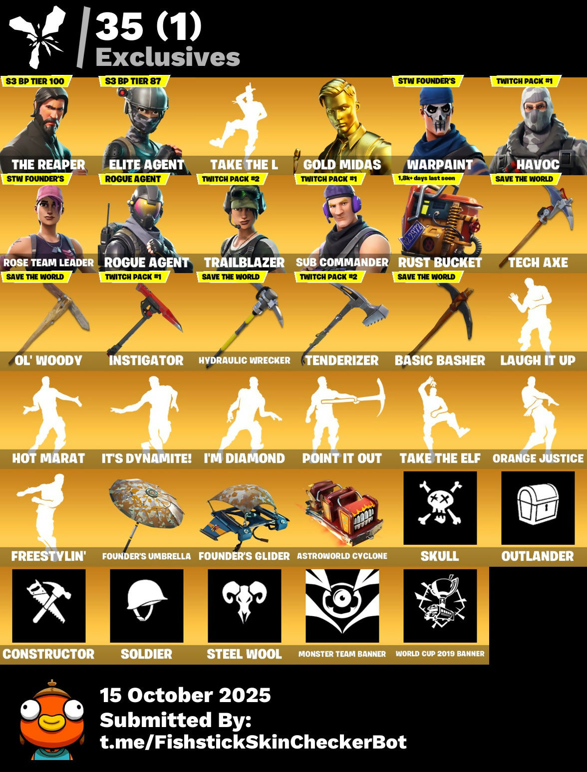 [PC] 105 skins | OG STW | The Reaper | Elite Agent | Gold Midas | Havoc | Rogue Agent | Trailblazer | Sub Commander | Hybrid | Gear Specialist Maya | 1400 VB