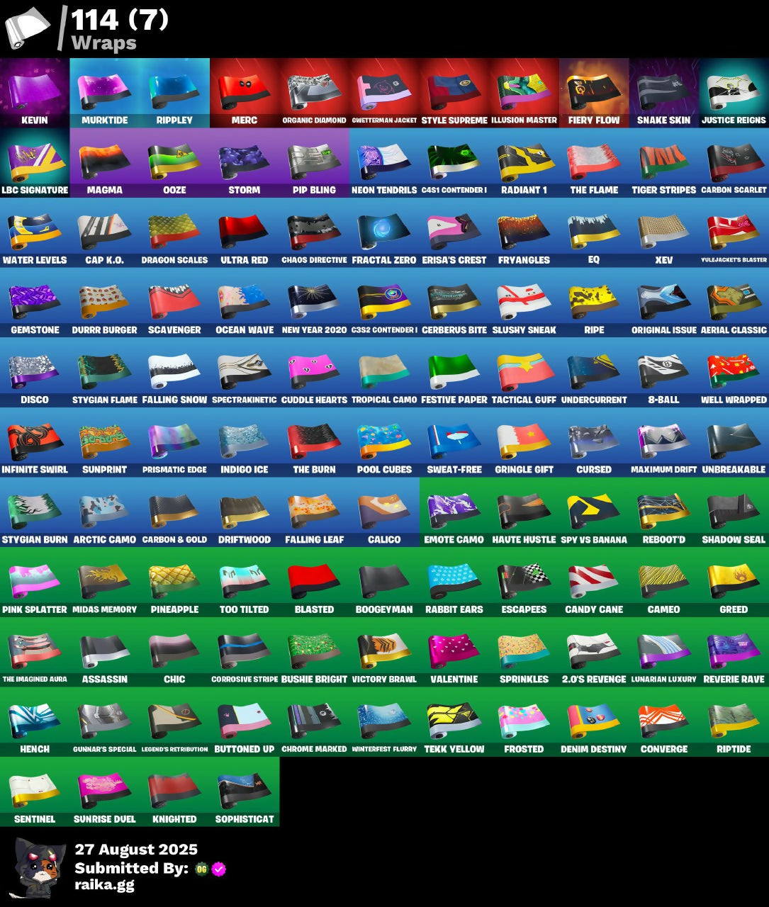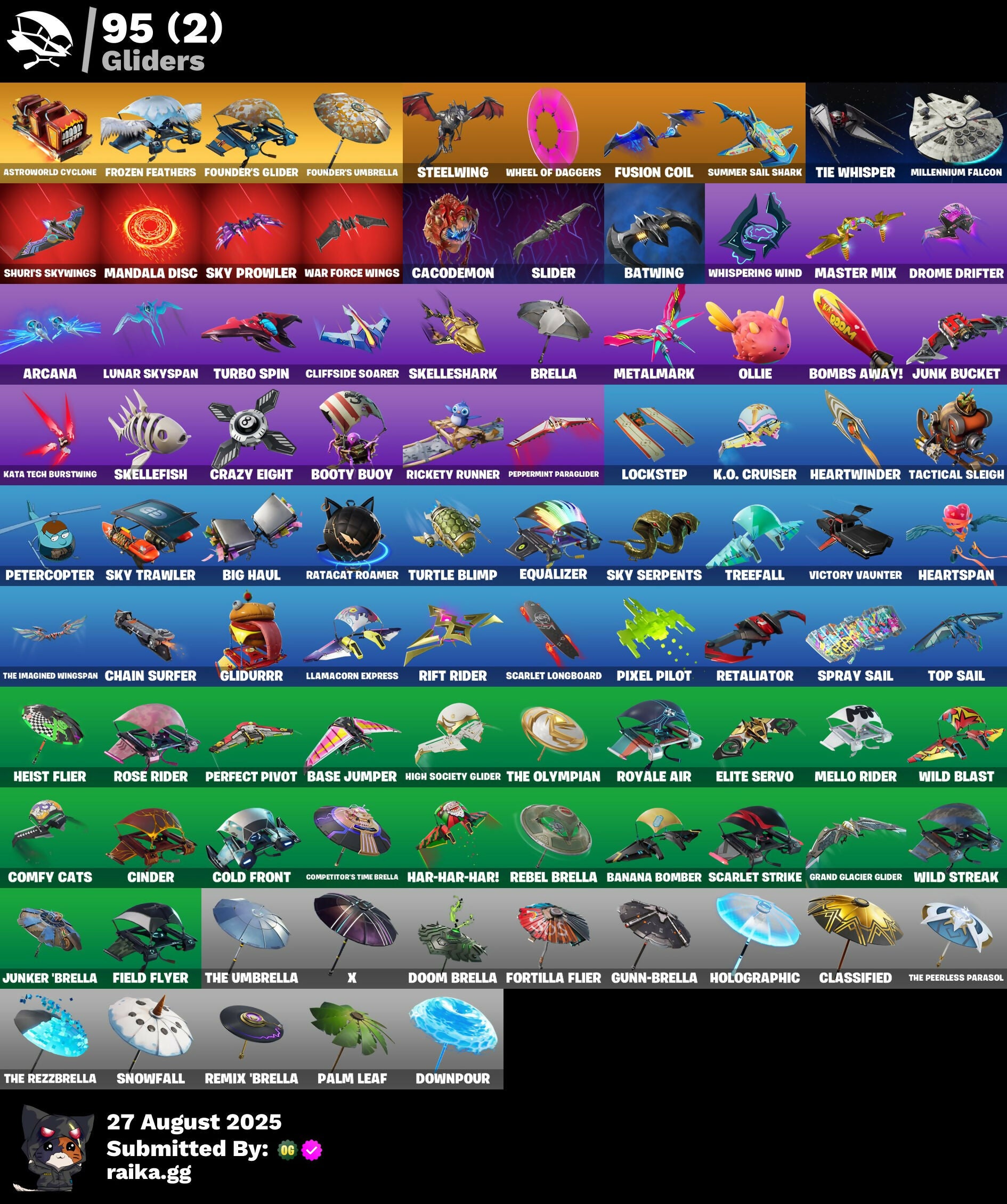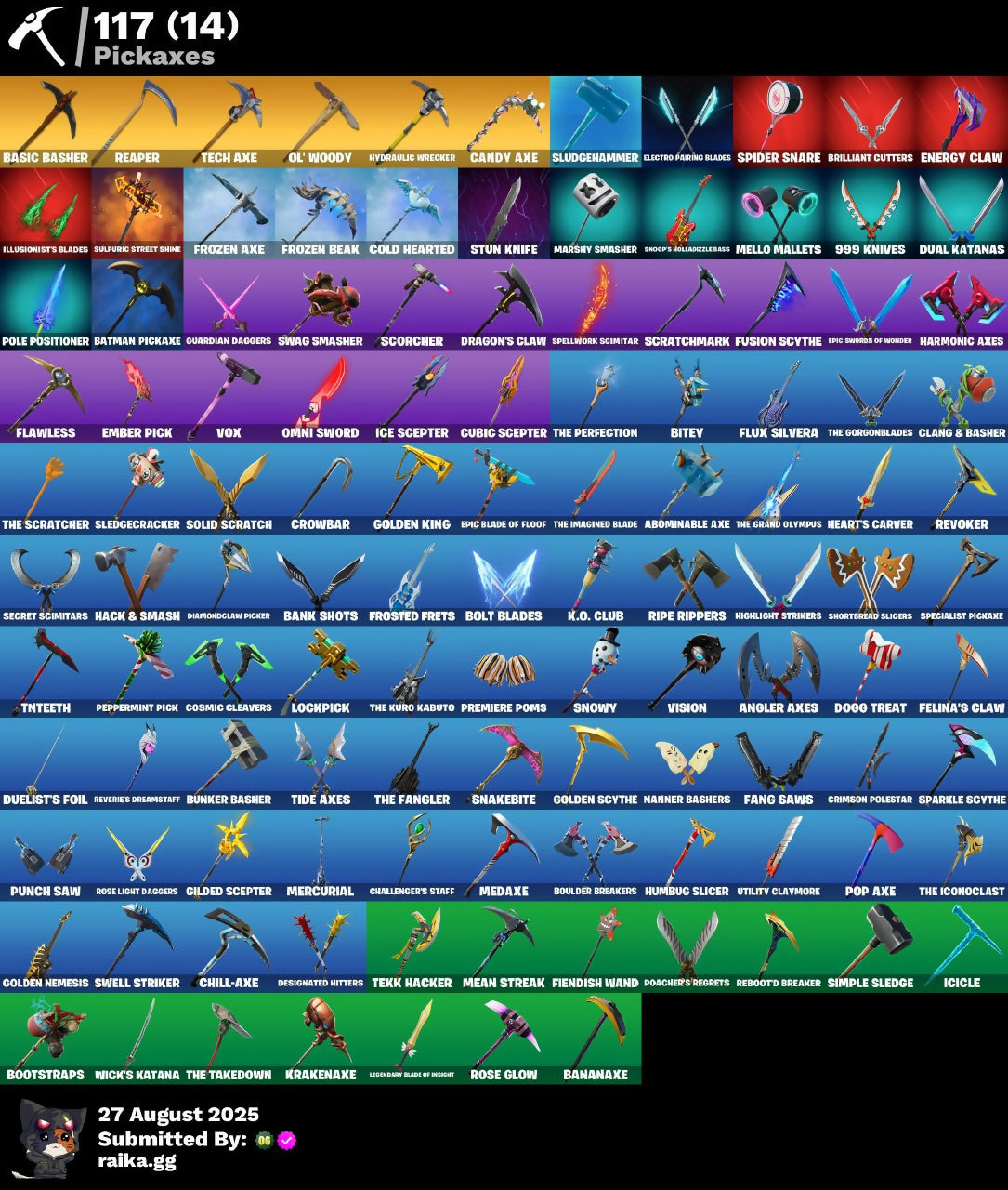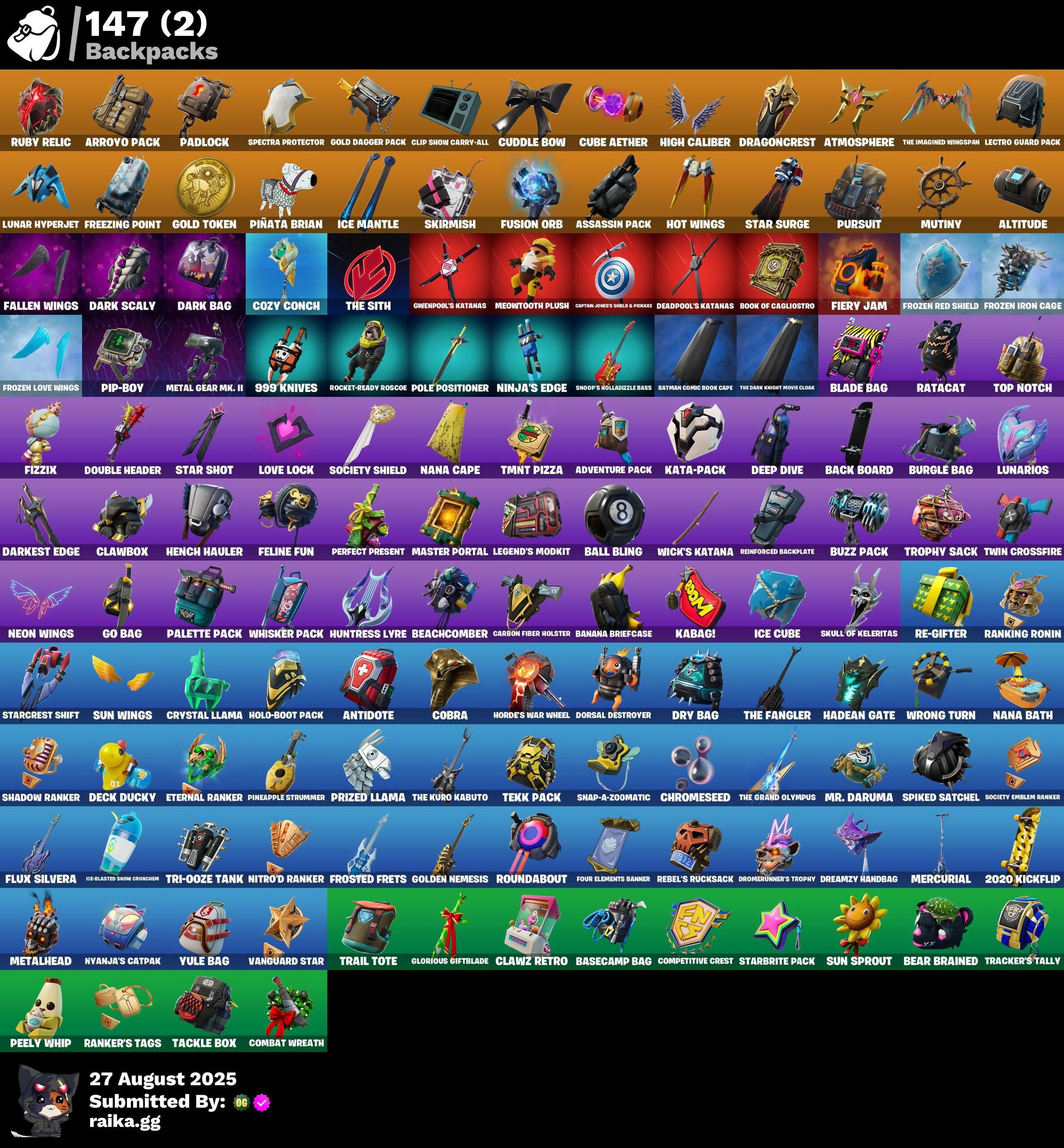 2.O'S Revenge, 2020 Kickflip, 8-Ball, 8-Ball Vs Scratch, 999 Knives, Abominable Axe, Adventure Pack, Aerial Classic, Agent Peely, Air Shredder, Altitude, Angler Axes, Antidote, Arcana, Arctic Adeline, Arctic Camo, Arroyo Pack, Assassin, Assassin Pack, Astroworld Cyclone, Atmosphere, Back Board, Back On 74, Ball Bling, Banana Bomber, Banana Briefcase, Bananaxe, Bank Shots, Base Jumper, Basecamp Bag, Basic Basher, Batman Comic Book Cape, Batman Comic Book Outfit, Batman Pickaxe, Battle Call, Batwing, Beachcomber, Bear Brained, Beep Beep, Big Haul, Bitev, Blackheart, Blade Bag, Blasted, Blowing Bubbles, Boing!, Bolt Blades, Bombs Away!, Boogeyman, Boogie Down, Book Of Cagliostro, Bootstraps, Booty Buoy, Boulder Breakers, Breaking Point, Breakneck, Brella, Brilliant Cutters, Brite Agent, Bullseye, Bunker Basher, Bunker Jonesy, Burgle Bag, Bushie Bright, Buttoned Up, Buzz Pack, C3S2 Contender I, C4S1 Contender I, Cacodemon, Calico, Call Me, Cameo, Cameo Vs Chic, Candy Axe, Candy Cane, Cap K.O., Captain Jones's Shield & Pickaxe, Captain Llamerica, Carbon & Gold, Carbon Fiber Holster, Carbon Scarlet, Card Drop, Cat Flip, Catalyst, Cauldron Chill, Cerberus Bite, Chain Surfer, Challenger's Staff, Chaos Directive, Cheer Up, Chic, Chill-Axe, Chrome Marked, Chromeseed, Cinder, Clang & Basher, Classified, Clawbox, Clawz Retro, Cliffside Soarer, Cloaked Star, Cluck Strut, Cobalt, Cobra, Coin Flip, Cold Front, Cold Hearted, Combat Wreath, Comfy Cats, Competitive Crest, Competitor's Time Brella, Conga, Conjure Weapon, Contract Giller, Converge, Corrosive Stripe, Cosmic Cleavers, Cosmic Infinity, Cozy Conch, Crabby, Crazy Eight, Crimson Polestar, Crowbar, Crowning Achievement, Crystal Llama, Cube Aether, Cubic Scepter, Cuddle Bow, Cuddle Hearts, Cuddle Team Leader, Cup Show Carry-All, Cursed, Cyclo Curl, Dabstand, Dagger Dance, Dark Bag, Dark Bomber, Dark Rex, Dark Scaly, Darkest Edge, Deadpool, Deadpool's Katanas, Deck Ducky, Deep Dab, Deep Dive, Demi, Denim Destiny, Designated Hitters, Diamond Throne, Diamondclaw Picker, Disco, Doctor Strange, Dogg Treat, Doom Brella, Dorsal Destroyer, Double Header, Downpour, Dragon Scales, Dragon Stance, Dragon's Claw, Dragoncrest, Dreamzy Handbag, Driftwood, Drippin' Flavor, Drome Drifter, Dromerunner's Trophy, Droop, Dry Bag, Dual Katanas, Duelist's Foil, Dummy, Durrr Burger, EQ, Electro Pairing Blades, Electro Swing, Elite Servo, Ember, Ember Pick, Emote Camo, Energy Claw, Epic Blade of Floof, Epic Swords of Wonder, Equalizer, Erisa, Erisa's Crest, Escapees, Eternal Ranker, Eternal Voyager, Fade, Fallen Love Ranger, Fallen Wings, Falling Leaf, Falling Snow, Fang Saws, Featherweight, Felina, Felina's Claw, Feline Fun, Festive Paper, Field Flyer, Fiendish Wand, Fierce, Fiery Flow, Fiery Jam, Fist Pump, Fizzix, Flawless, Flippin' Away, Flux Silvera, Foil Flex, Fortilla Flier, Founder's Glider, Founder's Umbrella, Four Elements Banner, Fractal Zero, Free Flow, Freezing Point, Frostbite, Frosted, Frosted Frets, Frozen Axe, Frozen Beak, Frozen Feathers, Frozen Iron Cage, Frozen Love Ranger, Frozen Love Wings, Frozen Raven, Frozen Red Knight, Frozen Red Shield, Fryangles, Fusion, Fusion Coil, Fusion Orb, Fusion Scythe, Gear Specialist Maya, Gemstone, Get Funky, Ghoul Trooper, Gilded Scepter, Glidurrr, Glorious Giftblade, Go Bag, Gold Brutus, Gold Dagger Pack, Gold Meowscles, Gold Midas, Gold Token, Golden King, Golden Nemesis, Golden Scythe, Golf Clap, Grand Glacier Glider, Greed, Gringle Gift, Guardian Daggers, Gunn-Brella, Gunnar, Gunnar's Special, Gwenpool's Katanas, Gwetterman Jacket, Hack & Smash, Hadean Gate, Hana, Har-Har-Har!, Harmonic Axes, Haute Hustle, Have A Seat, Heart's Carver, Heartspan, Heartwinder, Heist Flier, Hello Friend, Hench, Hench Hauler, High Caliber, High Five, High Society Glider, Highlight Strikers, Holiday Boxy, Holo-Boot Pack, Holographic, Honor Guard, Hoop Master, Hope, Horde's War Wheel, Hot Wings, Hula Hoopin', Humbug Slicer, Huntress Lyre, Hybrid, Hydraulic Wrecker, Hypnot-Eyes, I Declare!, I'm A Mystery, Ice Cube, Ice Mantle, Ice Scepter, Icicle, Illusion Master, Illusionist's Blades, Indigo Ice, Infectious, Infinite Swirl, Iris, Jaywalking, John Wick, Journey Vs Hazard, Jubilation, Jump Jets, Junk Bucket, Junker 'Brella, Justice Reigns, K.O. Club, K.O. Cruiser, Kabag!, Kata Tech Burstwing, Kata-Pack, Keep It Mello, Kevin, Kiara K.O., Knife Sharpener, Knighted, Krakenaxe, LBC Signature, Laguna, Laugh It Up, Launch Day Lewis Hamilton, Lectro Guard Pack, Legend's Modkit, Legend's Retribution, Legendary Blade of Insight, Lewis Hamilton, Lil' Prancer, Lllamacorn Express, Lock It Up, Lockpick, Lockstep, Love Lock, Lt. Evergreen, Lunar Hyperjet, Lunar Skyspan, Lunarian Luxury, Lunarios, Luxe, Lynx, Magma, Make A Seat, Mandala Disc, Manic, Marsh Walk, Marshmello, Marshy Smasher, Master Key, Master Mix, Master Portal, Maximum Drift, Mean Streak, Medaxe, Mello Mallets, Mello Rider, Meowtooth Plush, Merc, Mercurial, Metal Gear Mk. II, Metalarmark, Metalhead, Mic Drop, Midas Memory, Millennium Falcon, Montague, Mr. Daruma, Murktide, Mutiny, Nana Bath, Nana Cape, Nana Nana, Nanner Bashers, Neon Tendrils, Neon Wings, Never Gonna, New Year 2020, Ninja, Ninja Stance: Donnie, Ninja Stance: Leo, Ninja Stance: Mikey, Ninja Stance: Raph, Ninja Style, Ninja's Edge, Nisha, Nitro'D Ranker, No Sweat, Nog Ops, Nyanja's Catpak, Ocean, Ocean Wave, Ol' Woody, Ollie, Omni Sword, Onesie, Ooze, Organic Diamond, Original Issue, Oscar, Padlock, Palette Pack, Palm Leaf, Pandemonium, Paws & Claws, Peace Out, Peely, Peely Whip, Peppermint Paraglider, Peppermint Pick, Perfect Pivot, Perfect Present, Peter Griffin, Petercopter, Pinata Brian, Pineapple, Pineapple Strummer, Pink Splatter, Pip Bling, Pip-Boy, Pixel Pilot, Pizza Party, Poacher's Regrets, Point It Out, Poised Playmaker, Pole Positioner, Pool Cubes, Pop Axe, Powder, Premiere Poms, Prickly Pose, Prismatic Edge, Prized Llama, Prowler, Punch Saw, Pursuit, Rabbit Ears, Radiant 1, Rage Quit, Ranker's Tags, Ranking Ro