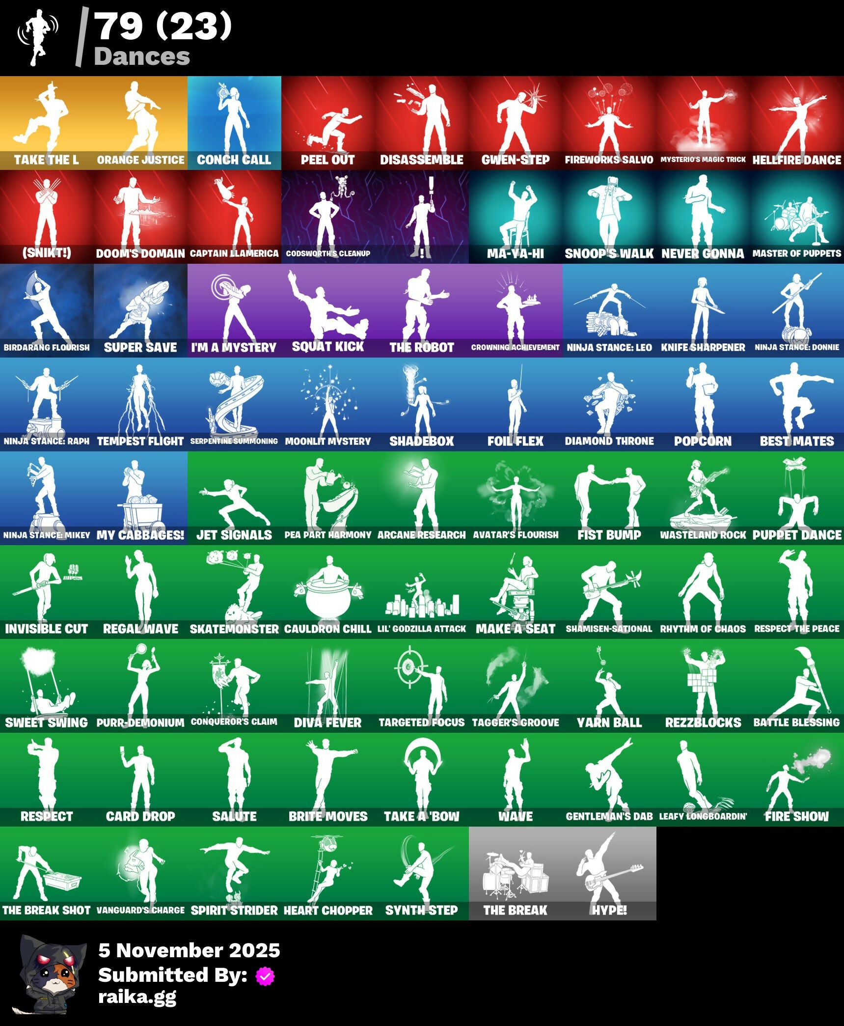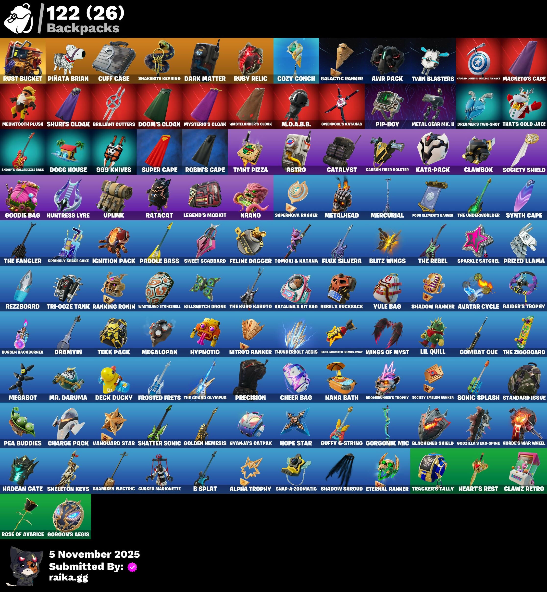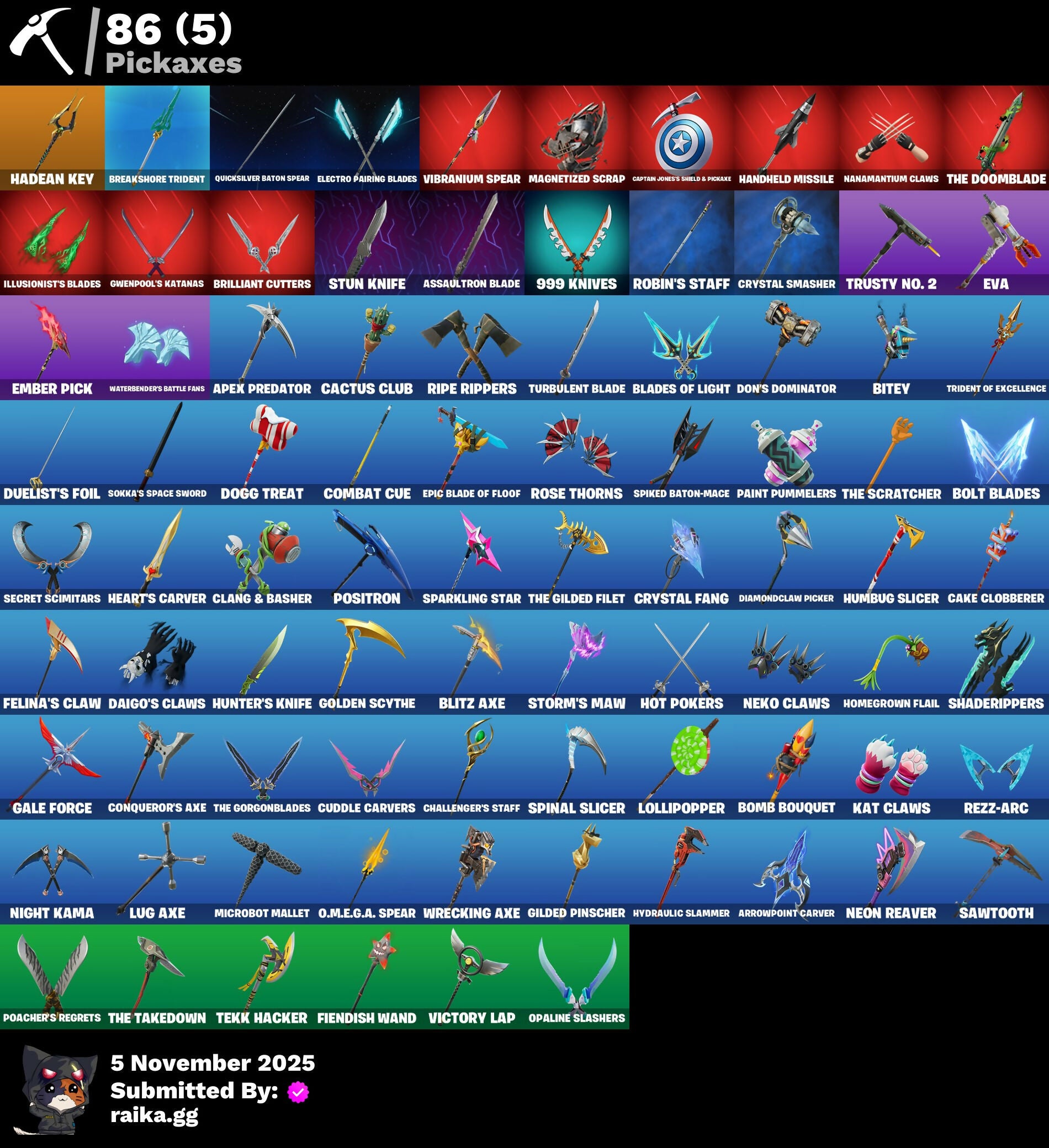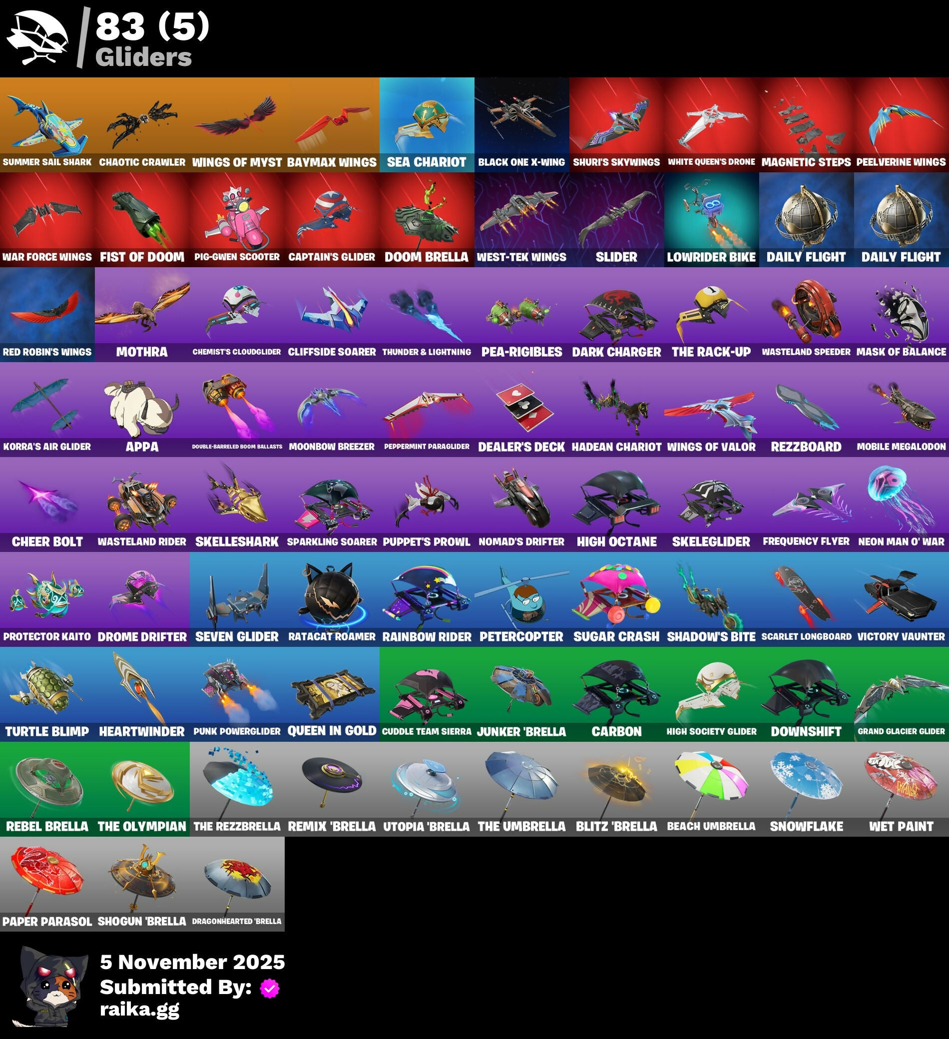 (Snikt!), 1-Ball, 999 Knives, AWR Pack, Alpha Trophy, Apex Predator, Aphrodite, Appa, Arcane Research, Arrowpoint Carver, Artemis, Assaultron Blade, Astro, Avatar Cycle, Avatar's Flourish, B Splat, Battle Blessing, Battlehawk, Baymax Wings, Beach Umbrella, Best Mates, Birdarang Flourish, Bitey, Black One X-Wing, Blackened Shield, Blades of Light, Blitz 'Brella, Blitz Axe, Blitz Wings, Bolt Blades, Bomb Bouquet, Breakshore Trident, Brilliant Cutters, Brite Moves, Brite Raider, Bunsen Backburner, Cactus Club, Cake Clobberer, Captain Jones, Captain Jones's Shield & Pickaxe, Captain Llamerica, Captain's Glider, Carbide, Carbon, Carbon Fiber Holster, Card Drop, Catalyst, Cauldron Chill, Cerberus, Challenger's Staff, Chaos Director, Chaotic Crawler, Charge Pack, Cheer Bag, Cheer Bolt, Chemist's Cloudglider, Chord Kahele, Clang & Basher, Clawbox, Clawz Retro, Cliffside Soarer, Codsworth's Cleanup, Combat Cue, Conch Call, Conqueror's Axe, Conqueror's Claim, Cozy Conch, Crowning Achievement, Crystal Fang, Crystal Smasher, Cuddle Carvers, Cuddle Team Sierra, Cuddle Team Specialist, Cuff Case, Cursed Marionette, Daigo, Daigo's Claws, Daily Flight, Dark Charger, Dark Matter, Dark Voyager, Dealer's Deck, Deck Ducky, Diamond Throne, Diamondclaw Picker, Disassemble, Diva Fever, Dogg House, Dogg Treat, Don's Dominator, Doom, Doom Brella, Doom's Cloak, Doom's Domain, Double-Barreled Boom Ballasts, Downshift, Dragonhearted 'Brella, Dramyin, Dreamer's Two-Shot, Drome Drifter, Dromerunner's Trophy, Duelist's Foil, Dusk Knight, Dynamo Tntina, Electro Pairing Blades, Elite Agent, Ember Pick, Emma Frost, Epic Blade of Floof, Eternal Ranker, Eva, Felina, Felina's Claw, Feline Dagger, Fiendish Wand, Fire Show, Fireworks Salvo, Fist Bump, Fist of Doom, Flux Silvera, Foil Flex, Four Elements Banner, Frequency Flyer, Frosted Frets, Galactic Ranker, Gale Force, Gentleman's Dab, Gilded Pinscher, Godzilla Evolved, Godzilla's Exo-Spine, Golden Nemesis, Golden Scythe, Goodie Bag, Gorgon's Aegis, Gorgonik Mic, Grand Glacier Glider, Guffy 6-String, Gwen-Step, Gwenpool, Gwenpool's Katanas, Hadean Chariot, Hadean Gate, Hadean Key, Hades, Handheld Missile, Haylee Skye, Heart Chopper, Heart's Carver, Heart's Rest, Heartwinder, Hellfire Dance, Hero Baymax, High Octane, High Society Glider, Homegrown Flail, Hope, Hope Star, Hordes War Wheel, Hot Pokers, Humbug Slicer, Hunter's Knife, Huntress Lyre, Hydraulic Slammer, Hype!, Hypnotic, I'm A Mystery, Ignition Pack, Illusionist's Blades, Invisible Cut, Jade, Jet Signals, Joltara, Junker 'Brella, Kat Claws, Kata-Pack, Katalina, Katalina's Kit Bag, Kendo, Killswitch, Killswitch Drone, Knife Sharpener, Knight Conqueror, Korra, Korra's Air Glider, Krang, Leafy Longboardin', Legend's Modkit, Lightrider, Lil Quill, Lil' Godzilla Attack, Lollipopper, Lowrider Bike, Lug Axe, M.O.A.B.B., Ma-Ya-Hi, Magnetic Steps, Magnetized Scrap, Magneto's Cape, Make A Seat, Mask of Balance, Master Of Puppets, Medusa, Megabot, Megalo Don, Megalopak, Meowdas, Meowtooth Plush, Mercurial, Metal Gear Mk. II, Metalhead, Mezmer, Microbot Mallet, Mission Specialist, Mobile Megalodon, Montague, Moonbow Breezer, Moonlit Mystery, Moonwalker, Morgan Myst, Mothra, Mr. Daruma, My Cabbages!, Mysterio, Mysterio's Cloak, Mysterio's Magic Trick, Nana Bath, Nanamantium Claws, Neko Claws, Neon Man O' War, Neon Reaver, Never Gonna, Night Kama, Ninja Stance: Donnie, Ninja Stance: Leo, Ninja Stance: Mikey, Ninja Stance: Raph, Nisha, Nitro'd Ranker, Nomad's Drifter, Nyanja, Nyanja's Catpak, O.M.E.G.A. Spear, Opaline Slashers, Orange Justice, Oscar, Paddle Bass, Paint Pummellers, Paper Parasol, Pea Buddies, Pea Part Harmony, Pea-Rigibles, Peabody, PeeIverine Wings, Peel Out, Peelverine, Peppermint Paraglider, Peter Griffin, Petercopter, Pig-Gwen Scooter, Pinata Brian, Pip-Boy, Poacher's Regrets, Popcorn, Poseidon, Positron, Precision, Prized Llama, Protector Kaito, Punk Powerglider, Puppet Dance, Puppet's Prowl, Purr-Demonium, Queen in Gold, Quicksilver Baton Spear, Raider's Trophy, Rainbow Rider, Ranking Ronin, Ratacat, Ratacat Roamer, Rebel Brella, Rebel's Rucksack, Red Robin's Wings, Regal Wave, Remix 'Brella, Respect, Respect The Peace, Rezz-Arc, Rezzblocks, Rezzboard, Rhythm Of Chaos, Ringmaster Scarr, Ripe Rippers, Robin, Robin's Cape, Robin's Staff, Rogue Agent, Rose Thorns, Rose of Avarice, Rox, Ruby Relic, Rust, Rust Bucket, Rust Lord, Salute, Santa Dogg, Sawtooth, Scarlet Longboard, Sea Chariot, Secret Scimitars, Sentinel, Serpentine Summoning, Seven Glider, Shadebox, Shaderippers, Shadow Blade Hope, Shadow Ranker, Shadow Shroud, Shadow's Bite, Shamisen Electric, Shamisen-Sational, Shatter Sonic, Shogun 'Brella, Shuri, Shuri's Cloak, Shuri's Skywings, Skatemonster, Skeleglider, Skeleton Keys, Skelleshark, Slayer Juice Wrld, Slider, Snakebite Keyring, Snap-A-Zoomatic, Snoop Dogg, Snoop's Holladazzle Bass, Snoop's Walk, Snowflake, Society Emblem Ranker, Society Shield, Sokka's Space Sword, Solid Snake, Sonic Splash, Sparkle Diva, Sparkle Satchel, Sparkling Soarer, Sparkling Star, Spiked Baton-Mace, Spinal Slicer, Spirit Strider, Sprinkly Space Cake, Squat Kick, Standard Issue, Storm's Maw, Stun Knife, Sugar Crash, Summer Sail Shark, Super Cape, Super Save, Superman, Supernova Ranker, Sweet Scabbard, Sweet Swing, Synth Cape, Synth Step, Synthwave, T-60 Power Armor, TMNT Pizza, Tagger's Groove, Take A 'Bow, Take The L, Targeted Focus, Tekk Hacker, Tekk Pack, Teknique, Tempest Flight, That's Cold Jac!, The Break, The Break Shot, The Doomblade, The Fangler, The Gilded Filet, The Gorgonblades, The Grand Olympus, The Kuro Kabuto, The Machinist, The Night Rose, The Olympian, The Rack-Up, The Reaper, The Rebel, The Rezzbrella, The Robot, The Scratcher, The Takedown, The Umbrella, The Underworlder, The Ziggboard, Thunder & Lightning, Thunderbolt Aegis, Tomoki & Katana, Tracker's Tally, Tri-Ooze Tank, Trident of Excellence, Trusty No. 2, Turbulent Blade, Turtle Blimp, Twin Blasters, Undercover Skye, Uplink, Utopia 'Brella, Valeria