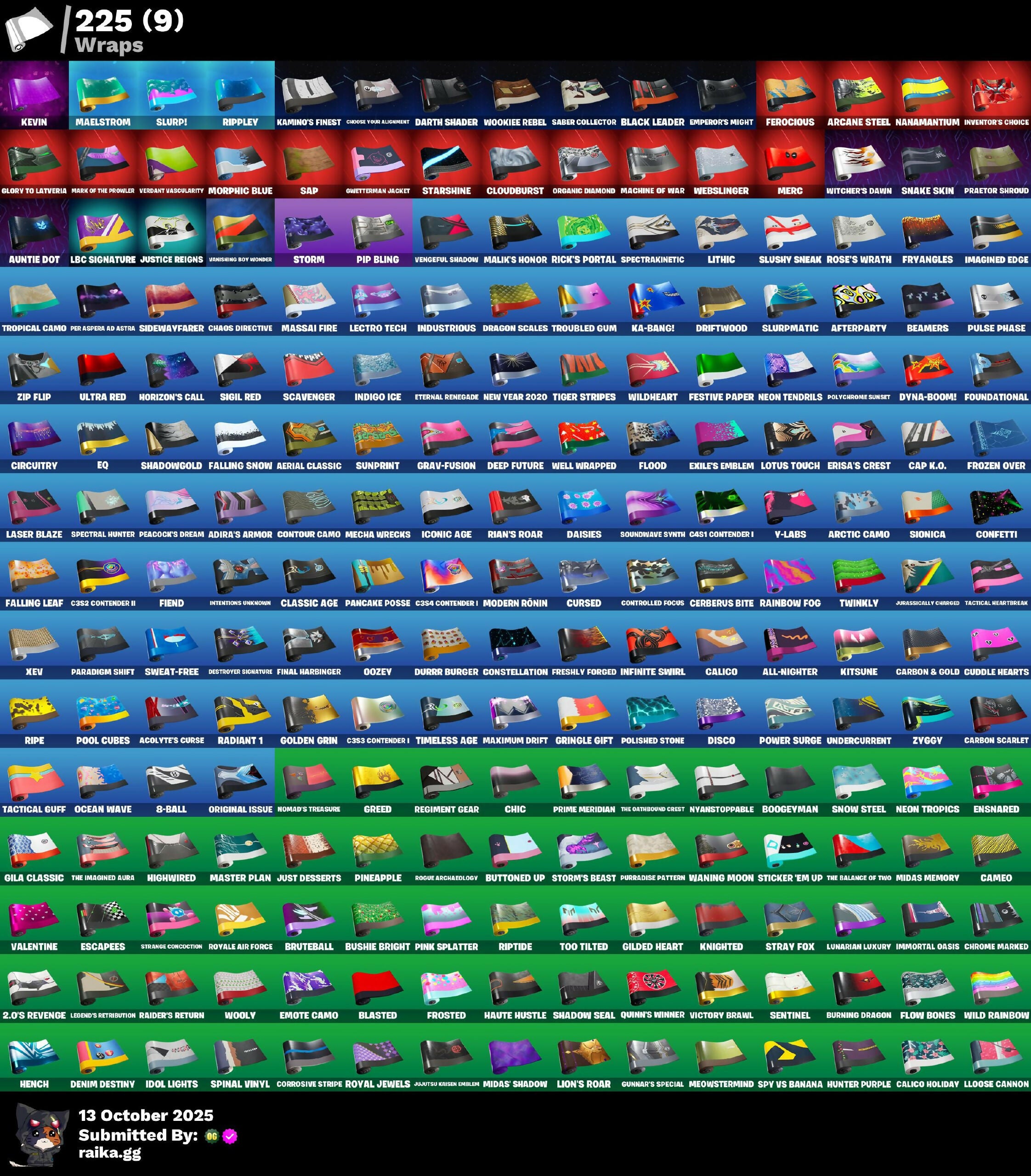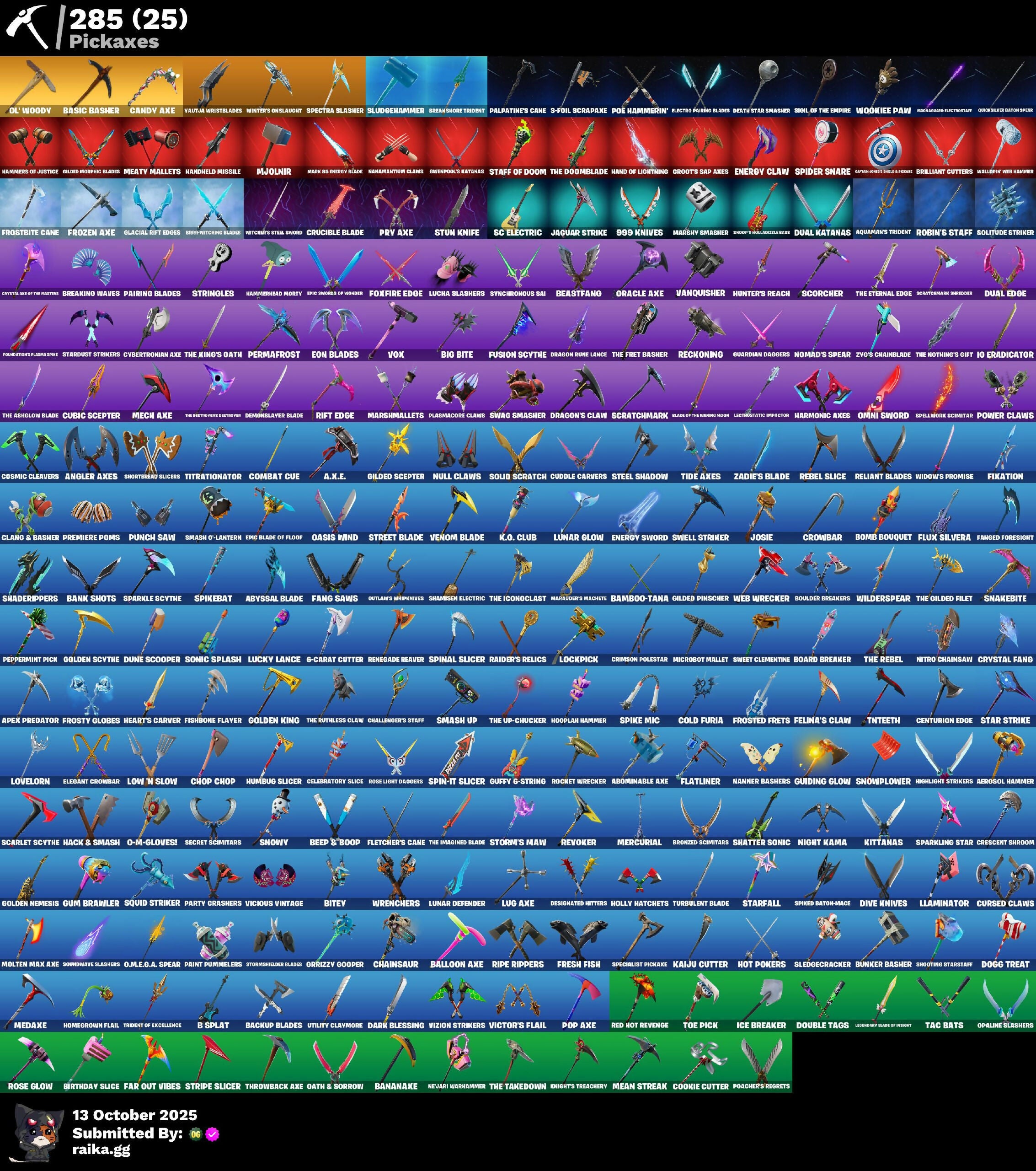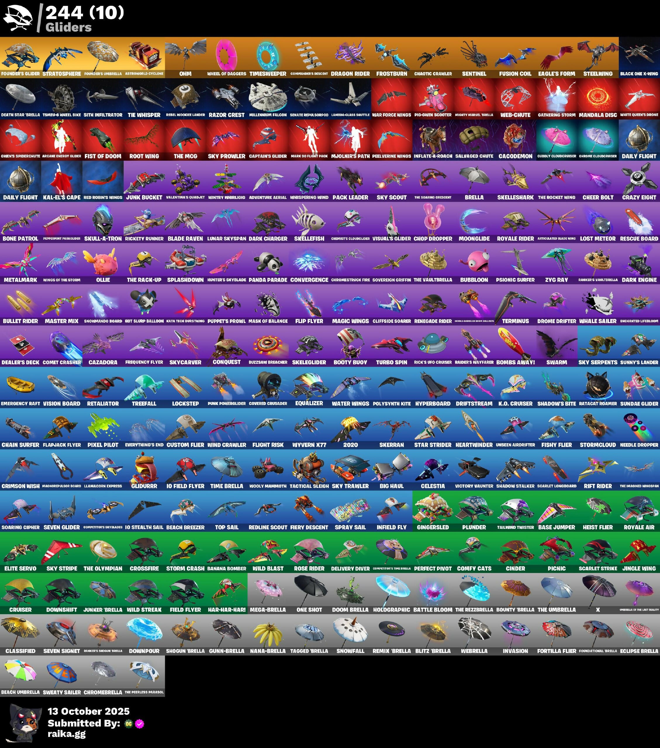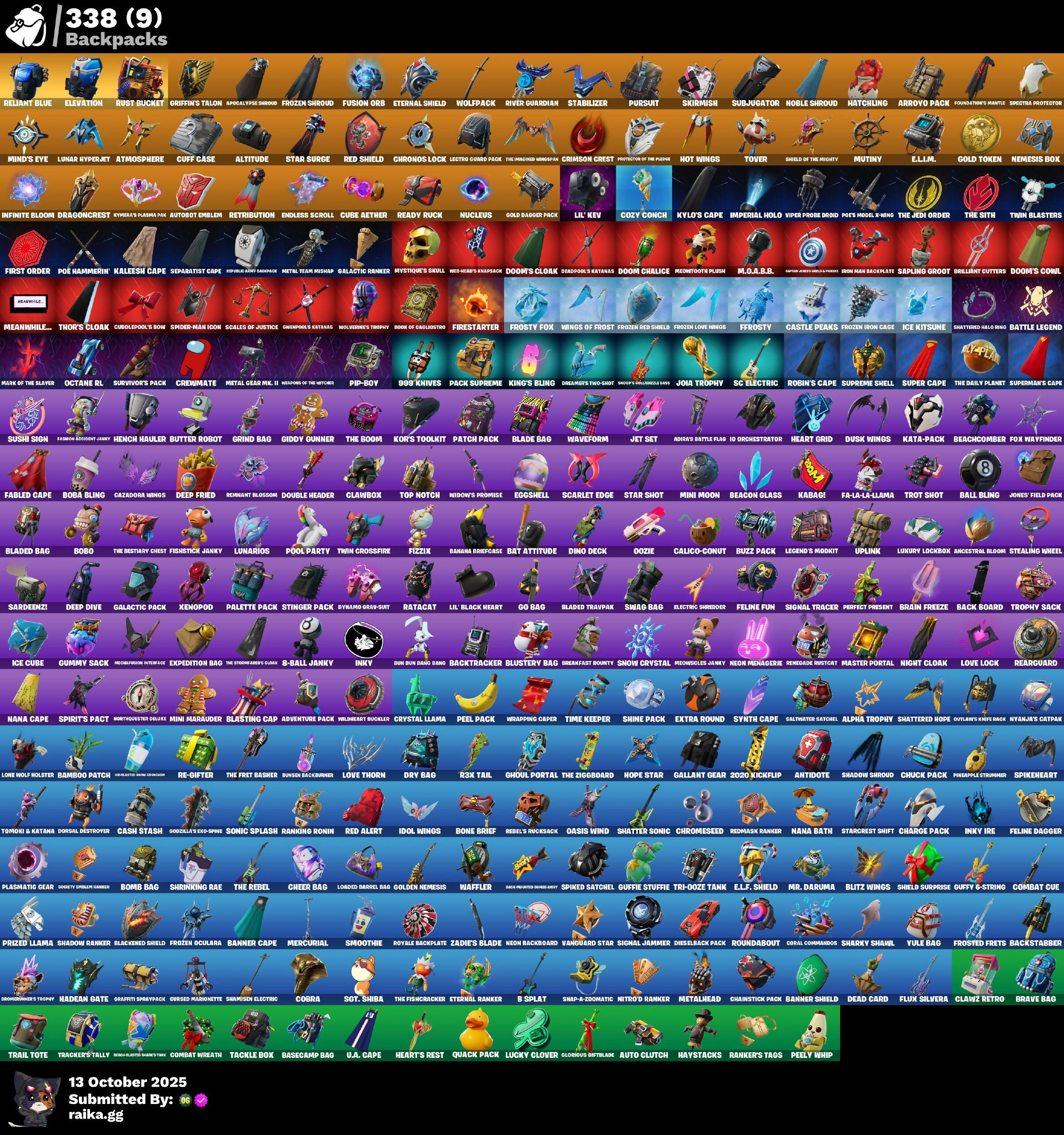 (Snikt!), 1-Ball, 10 Eradicator, 10 Field Flyer, 10 Orchestrator, 10 Stealth Sail, 2.0’s Revenge, 2020, 2020 Kickflip, 6-Carat Cutter, 8-Ball, 8-Ball Janky, 8-Ball Vs Scratch, 999 Knives, A Warrior Prepares, A.I.M., A.X.E., Abominable Axe, Absenz, Abyssal Blade, Acolyte’s Curse, Adira, Adira's Battle Flag, Adira’s Armor, Adventure Aerial, Adventure Pack, Aerial Classic, Aerosol Hammer, Afterparty, Agent Jones, Agent Patch, Agent Peely, Air Horn, Air Shredder, All-Nighter, Alpha Trophy, Altitude, Ancestral Bloom, Angler Axes, Antidote, Apex Predator, Aphrodite, Apocalypse Shroud, Apprentice Evie, Aquaman, Aquaman's Trident, Arachnrobatics, Arcane Energy Glider, Arcane Steel, Arctic Adeline, Arctic Camo, Arial Assault Bomber, Armadillo, Around The Clock, Arroyo Pack, Articulated Blade Wing, Astroworld Cyclone, Atmosphere, Auntie Dot, Aura, Auto Clutch, Autobot Emblem, B Splat, Back Board, Back Mounted 38015 Army, Backstabber, Backtracker, Backup Blades, Balance Board, Ball Bling, Balloon Axe, Bamboo Patch, Bamboo-Tana, Banana Bomber, Banana Briefcase, Bananaxe, Bank Shots, Banner Cape, Banner Shield, Baron’s Hoard, Base Jumper, Basecamp Bag, Basic Basher, Bat Attitude, Battle Bloom, Battle Call, Battle Legend, Beach Breezer, Beach Jules, Beach Umbrella, Beachcomber, Beacon Glass, Beamers, Bean Bag, Beastfang, Beef Boss, Beep & Boop, Beep Beep, Behold!, Big Bite, Big Fan, Big Haul, Bike To Go, Billy Bounce, Birdie, Birdraring Flourish, Birthday Slice, Bitey, Black Leader, Black One X-Wing, Blackened Shield, Blackheart, Blade Bag, Blade Of The Warning Moon, Blade Raven, Bladed Bag, Bladed Travpak, Blasted, Blasting Cap, Blaze, Blitz 'Brella, Blitz Wings, Blowing Bubbles, Blowin’ Up, Blustery Bag, Board Breaker, Boba Bling, Boba Snack, Bobo, Boing!, Bolt, Bomb Bag, Bomb Bouquet, Bombs Away!, Bone Brief, Bone Patrol, Boogeyman, Boogie Down, Book of Cagliostro, Boomin’, Booty Buoy, Boulder Breakers, Bouncer, Bounty 'Brella, Brain Freeze, Brain-Kitching Blades, Brave Bag, Breakdown, Breakfast Bounty, Breaking Waves, Breakneck, Breakpoint, Breakshore Trident, Breezy, Brella, Brilliant Cutters, Brilliant Gutters, Bring It, Bronzed Scimitars, Brush Your Shoulders, Bruteball, Bubloon, Buckets, Bullet Rider, Bun Bun Gang Bang, Bunker Basher, Bunker Jonesy, Bunny Brawler, Bunny Hop, Bunnywolf, Bunsen Backburner, Burn Bright, Burning Dragon, Bushie Bright, Butter Robot, Buttoned Up, Buzz Pack, Buzzsaw Breacher, Bytes, C3S2 Contender II, C3S3 Contender I, C3S4 Contender I, C4S1 Contender I, CUDDLEPOOL'S BOW, Cacodemon, Calamity, Calculated, Calico, Calico Holiday, Calico-Conut, Call Me, Called Shot, Cameo, Cameo Vs Chic, Candy Axe, Cap K.O., Cap Kick, Caparn Jones, Capoeira, Captain America's Shield, Captain Blamerica, Captain's Glider, Carbon & Gold, Carbon Scarlet, Cardistry, Cash Stash, Cassidy Quinn, Castle Peaks, Catalyst, Catflip, Cazadora, Cazadora Wings, Celebratory Slice, Celestia, Centurion, Centurion Edge, Cerberus, Cerberus Bite, Chain Surfer, Chainsaur, Chainstick Pack, Challenger's Staff, Chaos Directive, Chaos Director, Chaotic Crawler, Charge Pack, Charlotte, Cheer Bag, Cheer Bolt, Chef’s Special, Chic, Chimichanga!, Choice Knit, Chop Chop, Chop Dropper, Chrome Cloudcruiser, Chrome Marked, Chrome Punk, Chromebrella, Chromeseed, Chromestruck Fire, Chronos Lock, Chuck Pack, Cinder, Circuitry, Clang & Basher, Clark Kent, Classic Age, Classified, Clawbox, Clawz Retro, Clean Sweep, Click!, Cliffside Soarer, Cloud Striker, Cloudburst, Clover Team Leader, Cluck Strut, Clutch, Cobra, Codename E.L.F., Coin Flip, Cold Furia, Combat Cue, Combat Wreath, Comet Crasher, Comfy Cats, Commando, Competitor's Skylades, Competitor's Timebrella, Confetti, Conga, Conjure Weapon, Conquest, Constellation, Contour Camo, Contract Giller, Controlled Focus, Convergence, Cookie Cutter, Coral Commandos, Corrosive Stripe, Corrupted Voyager, Cosmic Cleavers, Count It!, Covered Crusader, Cozy Chomps, Cozy Commander, Cozy Conch, Crazy Eight, Crazyboy, Crescent Shroom, Crewmate, Crimetige's Cloudclaw, Crimson Crest, Crimson Polestar, Crimson Wish, Criterion, Crossbar Crusher, Crossfire, Crowbar, Crowd Reaction Movement, Crucible Blade, Cruiser, Crystal, Crystal Fang, Crystal Llama, Cube Aether, Cubic Scepter, Cuddle Carvers, Cuddle Hearts, Cuddly Cloudcruiser, Cuff Case, Curling Iron, Cursed, Cursed Claws, Cursed Marionette, Custom Flier, Cybertronian Axe, Cyclo Curl, D'ark, DJ Yonder, Dabstand, Dagger Dance, Daily Flight, Daisies, Dark Blessing, Dark Charger, Dark Doggo, Dark Engine, Dark Side, Darth Shader, Darth Vader, Dead Card, Deadpool, Deadpool's Katanas, Dealer's Deck, Death Star 'Brella, Death Star Smasher, Deep Dab, Deep Dive, Deep End, Deep Fried, Deep Future, Delivery Diver, Demi, Demonslayer Blade, Denim Destiny, Designated Hitters, Destroyer Signature, Diamond Diva, Dice Roll, Dieselback Pack, Dino Deck, Dip, Dire, Disco, Distraction Dance, Dive Knives, Dizzie, Do The Split, Doctor Doom, Doctor Slone, Doctor Strange, Dogg Treat, Doom, Doom Brella, Doom Chalice, Doom Slayer, Doom's Cloak, Doom's Cowl, Dorsal Destroyer, Double Header, Double Tags, Downpour, Downshift, Doze Dab, Dragon Rider, Dragon Rune Lance, Dragon Scales, Dragon Stance, Dragon's Claw, Dragoncrest, Dramatic Flares, Dream Feet, Dreamer's Two-Shot, Drift, Driftstream, Driftwood, Drome Drifter, Dromedriner's Trophy, Droop, Drop The Bass, Dry Bag, Dual Edge, Dual Katanas, Duelist’s Card Trick, Dune Scooper, Durrr Burger, Dusk, Dusk Wings, Dusty, Dxo, Dyna-Boom!, Dynamo Grav-Suit, Dynamo Tntina, E.L.F. Shield, E.L.I.M., EQ, Eagle, Eagle's Form, Ebony Love Ranger, Eclipse Brella, Eggshell, Electric Shredder, Electro Pairing Blades, Electro Shuffle, Electro Swing, Elegant Crowbar, Elevation, Elite Servo, Ember, Emergency Raft, Emma Frost, Emote Camo, Emperor Palpatine, Emperor’s Might, Empress Fan Dance, Enchanted Lifebloom, Endless Scroll, Energy Claw, Energy Sword, Enforcer, Ensnared, Eon Blades, Epic Blade Of Floof, Epic Swords