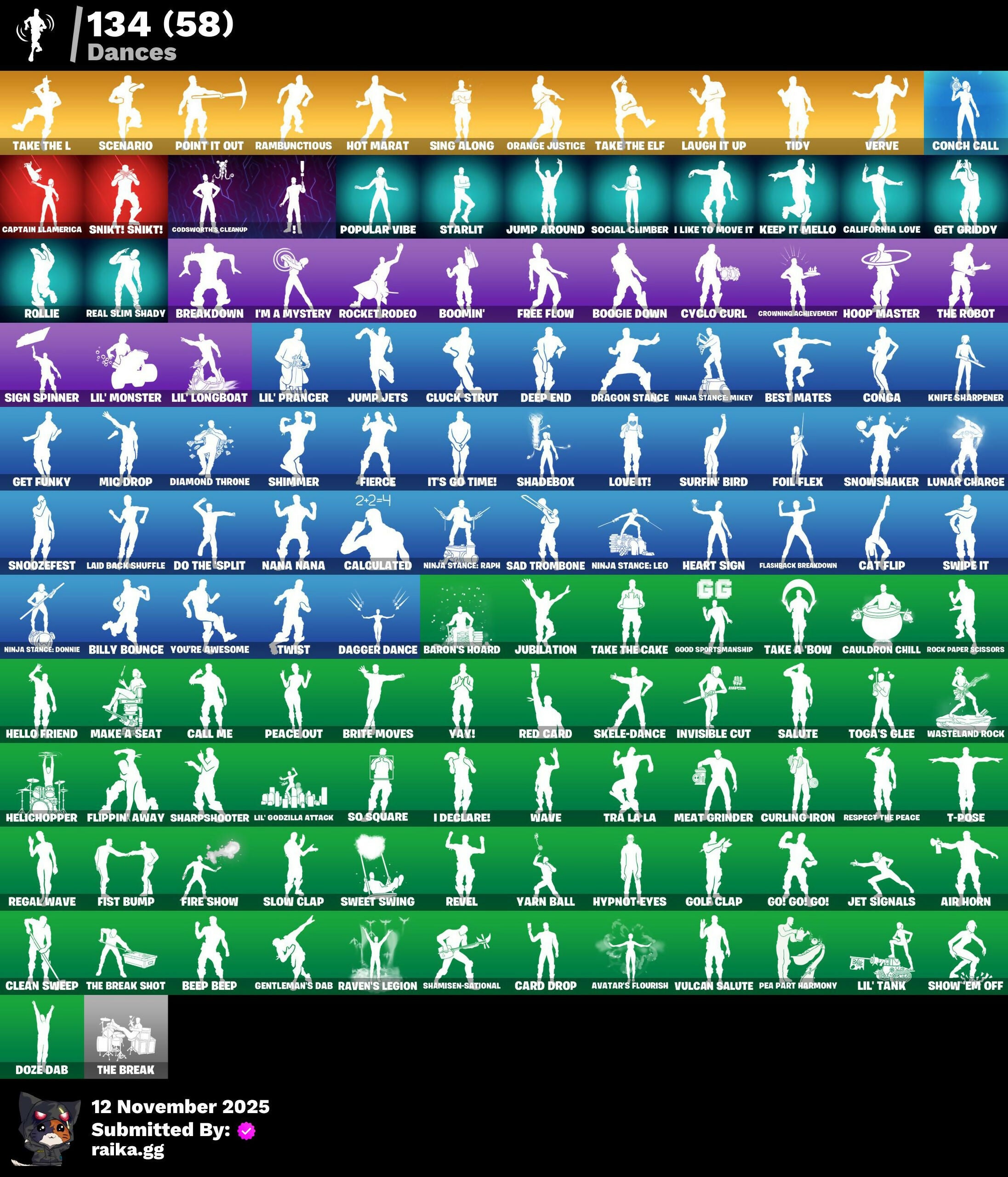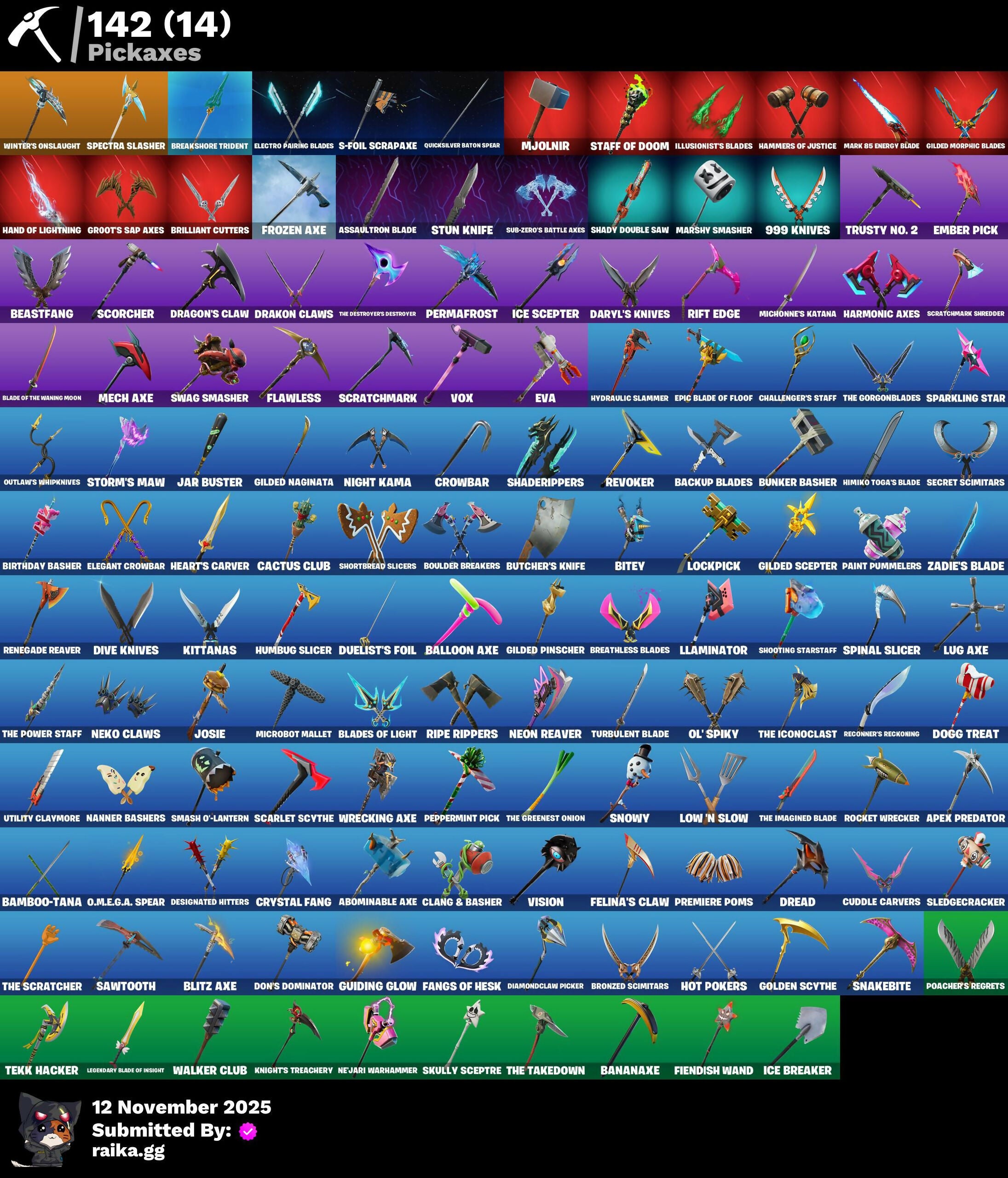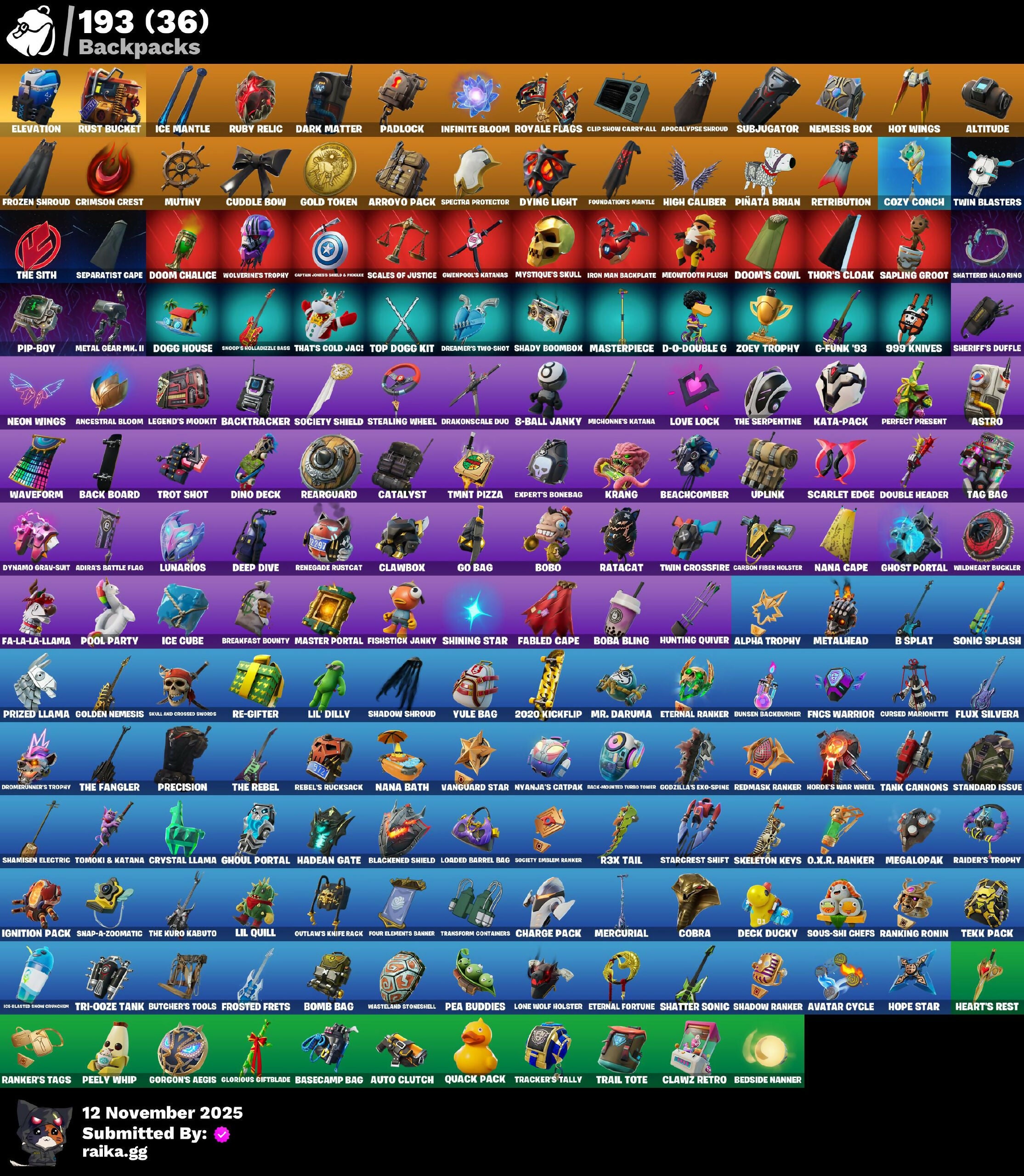 2020 Kickflip, 8-Ball Janky, 999 Knives, Abominable Axe, Abstrakt, Adira's Battle Flag, Aerial Assault Bomber, Air Horn, Alpha Trophy, Altitude, Ancestral Bloom, Andy Fangerson, Apex Predator, Aphrodite, Apocalypse Shroud, Arcane Energy Glider, Arctic Adeline, Arroyo Pack, Assaultron Blade, Astra, Astro, Astroworld Cyclone, Auto Clutch, Avatar Cycle, Avatar's Flourish, B Splat, Back Board, Back-Mounted Turbo Tower, Backtracker, Backup Blades, Balloon Axe, Bamboo-Tana, Bananaxe, Baron's Hoard, Base Jumper, Basecamp Bag, Beach Umbrella, Beachcomber, Beastfang, Bedside Nanner, Beep Beep, Best Mates, Billy Bounce, Birthday Basher, Bitey, Black One X-Wing, Blackened Shield, Blackheart, Blade Of The Waning Moon, Blades Of Light, Blitz 'Brella, Blitz Axe, Boba Bling, Bobo, Bomb Bag, Boogie Down, Boomin', Booty Buoy, Boulder Breakers, Bounty 'Brella, Breakdown, Breakfast Bounty, Breakshore Trident, Breathless Blades, Brilliant Cutters, Brite Moves, Brite Raider, Bronzed Scimitars, Bugha, Bullet Rider, Bullseye, Bunker Basher, Bunker Jonesy, Bunsen Backburner, Butcher's Knife, Butcher's Tools, Cacodemon, Cactus Club, Calculated, California Love, Call Me, Captain Ilamerica, Captain Jones's Shell & Pickaxe, Carbon, Carbon Fiber Holster, Card Drop, Cat Flip, Catalyst, Cauldron Chill, Cerberus, Challenger's Staff, Charge Pack, Chemist's Cloudglider, Cinder, Clang & Basher, Classified, Clawbox, Clawz Retro, Clean Sweep, Cliffside Soarer, Clinical Crosser, Clip Show Carry-All, Cloud Striker, Cluck Strut, Cobra, Codsworth's Cleanup, Competitor's Time Brella, Conch Call, Conga, Conquest, Cozy Conch, Crashing Satellite, Crimson Crest, Crossfire, Crowbar, Crowning Achievement, Cruiser, Crystal, Crystal Fang, Crystal Llama, Cuddle Bow, Cuddle Carvers, Cuddle Team Leader, Cuddly Cloudcruiser, Curling Iron, Cursed Marionette, Cyclo Curl, D-O-Double G, Dagger Dance, Dark Charger, Dark Matter, Dark Voyager, Daryl Dixon, Daryl's Knives, Dealer's Deck, Death Star 'Brella, Deck Ducky, Deep Dive, Deep End, Demi, Designated Hitters, Diamond Throne, Diamondclaw Picker, Dino Deck, Dive Knives, Do The 'Split, Doctor Doom, Dogg House, Dogg Treat, Don's Dominator, Doom Brella, Doom Chalice, Doom's Cowl, Double Header, Downpour, Downshift, Doze Dab, Dragon Stance, Dragon's Claw, Drakon Claws, Drakon Steel Hybrid, Drakonscale Duo, Dread, Dreamer's Two-Shot, Drift, Drome Drifter, Dromrunner's Trophy, Duelist's Foil, Durrr Taisho, Dusk Knight, Dying Light, Dynamo Gray-Suit, Eagle's Form, Eclipse Brella, Electro Pairing Blades, Elegant Crowbar, Elevation, Elite Agent, Elite Servo, Ember, Ember Pick, Enchanted Lifebloom, Enforcer, Epic Blade Of Floof, Equalizer, Eternal Fortune, Eternal Ranker, Eva, Expert's Bonebag, FNCS Warrior, Fa-La-La-Llama, Fabled Cape, Fangs Of Hesk, Felina, Felina's Claw, Field Flyer, Fiendish Wand, Fierce, Fire Show, Fishstick Janky, Fist Bump, Flapjack Flyer, Flashback Breakdown, Flawless, Flippin' Away, Flux Silvera, Foil Flex, Fortilla Flier, Foundation's Mantle, Foundational Brella, Four Elements Banner, Free Flow, Frostburn, Frosted Frets, Frozen Axe, Frozen Shroud, G-Funk '93, Gathering Storm, Gentleman's Dab, Get Funky, Get Griddy, Ghost Portal, Ghoul Portal, Gilded Morphic Blades, Gilded Naginata, Gilded Pinscher, Gilded Scepter, Glidurr, Glorious Giftblade, Go Bag, Go! Go! Go!, Godzilla's Exo-Spine, Gold Token, Golden Nemesis, Golden Scythe, Golf Clap, Good Sportsmanship, Gorgon's Aegis, Grand Glacier Glider, Groot, Groot's Sap Axes, Guiding Glow, Gunn-Brella, Gwenpool's Katanas, Hadean Gate, Hammers Of Justice, Hand Of Lightning, Har-Har-Har!, Harmonic Axes, Heart Sign, Heart's Carver, Heart's Rest, Heartwinder, Heist Flier, Helichopper, Hello Friend, High Caliber, High Octane, High Society Glider, Himiko Toga, Himiko Toga's Blade, Holiday Boxy, Holographic, Hoop Master, Hope, Hope Star, Horde's War Wheel, Hot Marat, Hot Pokers, Hot Wings, Humbug Slicer, Hunter's Skyblade, Hunting Quiver, Huntress, Hybrid, Hydraulic Slammer, Hypnot-Eyes, I Declare!, I Like To Move It, I'm A Mystery, Ice Breaker, Ice Cube, Ice Mantle, Ice Scepter, Ice-Blasted Snow Crunch, Ignition Pack, Ikonik, Illusionist's Blades, Infinite Bloom, Invisible Cut, Iron Man Backplate, It's Go Time!, Jade, Jar Buster, Jennifer Walters, Jet Signals, Jonesy the First, Josie, Jubilation, Jump Around, Jump Jets, Junker 'Brella, K.O. Cruiser, Kata-Pack, Keep It Mello, Kendo, Kittanas, Knife Sharpener, Knight's Treachery, Korra, Krang, LBC '93 Dogg, Lady of Cranes, Laid Back Shuffle, Laugh It Up, Legend's Modkit, Legendary Blade Of Insight, Lil Quill, Lil Split, Lil' Dilly, Lil' Godzilla Attack, Lil' Longboat, Lil' Monster, Lil' Prancer, Lil' Tank, Llaminator, Loaded Barrel Bag, Lockpick, Lockstep, Lone Wolf Holster, Love It!, Love Lock, Low 'N Slow, Lt. Evergreen, Lt. John Llama, Lug Axe, Lunar Charge, Lunarios, Luxe, Lynx, Make A Seat, Mancake, Mandalorian, Mark 85 Energy Blade, Mark 90 Flight Pack, Marshy Smasher, Mask of Balance, Master Key, Master Portal, Masterpiece, Match Point, Mave, Maxx Drop, Meat Grinder, Mech Axe, Medusa, Megalo Don, Megalopak, Meowtooth Plush, Mercurial, Metal Gear Mk. II, Metalhead, Mic Drop, Michonne, Michonne's Katana, Microbot Mallet, Mighty Marvel 'Brella, Millennium Falcon, Mission Specialist, Mjolnir, Mjolnir's Path, Mobile Megalodon, Montague, Moonwalker, Mothra, Mr. Daruma, Mutiny, Mystique, Mystique's Skull, Nana Bath, Nana Cape, Nana Nana, Nanner Bashers, Ne'Jari Warhammer, Neko Claws, Nemesis Box, Neon Man O' War, Neon Reaver, Neon Wings, Night Kama, Ninja Stance: Donnie, Ninja Stance: Leo, Ninja Stance: Mikey, Ninja Stance: Raph, Nisha, Nomad's Drifter, Nyanja, Nyanja's Catpak, O.M.E.G.A. Spear, O.X.R. Ranker, Ol' Spiky, Omegarok, One Shot, Onesie, Orange Justice, Oscar, Outlaw's Knife Rack, Outlaw's Whipknives, PJ Patroller, Padlock, Paint Pummelers, Palm Leaf, Panda Parade, Paper Parasol, Pea Buddies, Pea Part Harmony, Pea-Rigibles, Peabody, Peace Out, Peely, Peely Whip, Peppermint Paraglid
