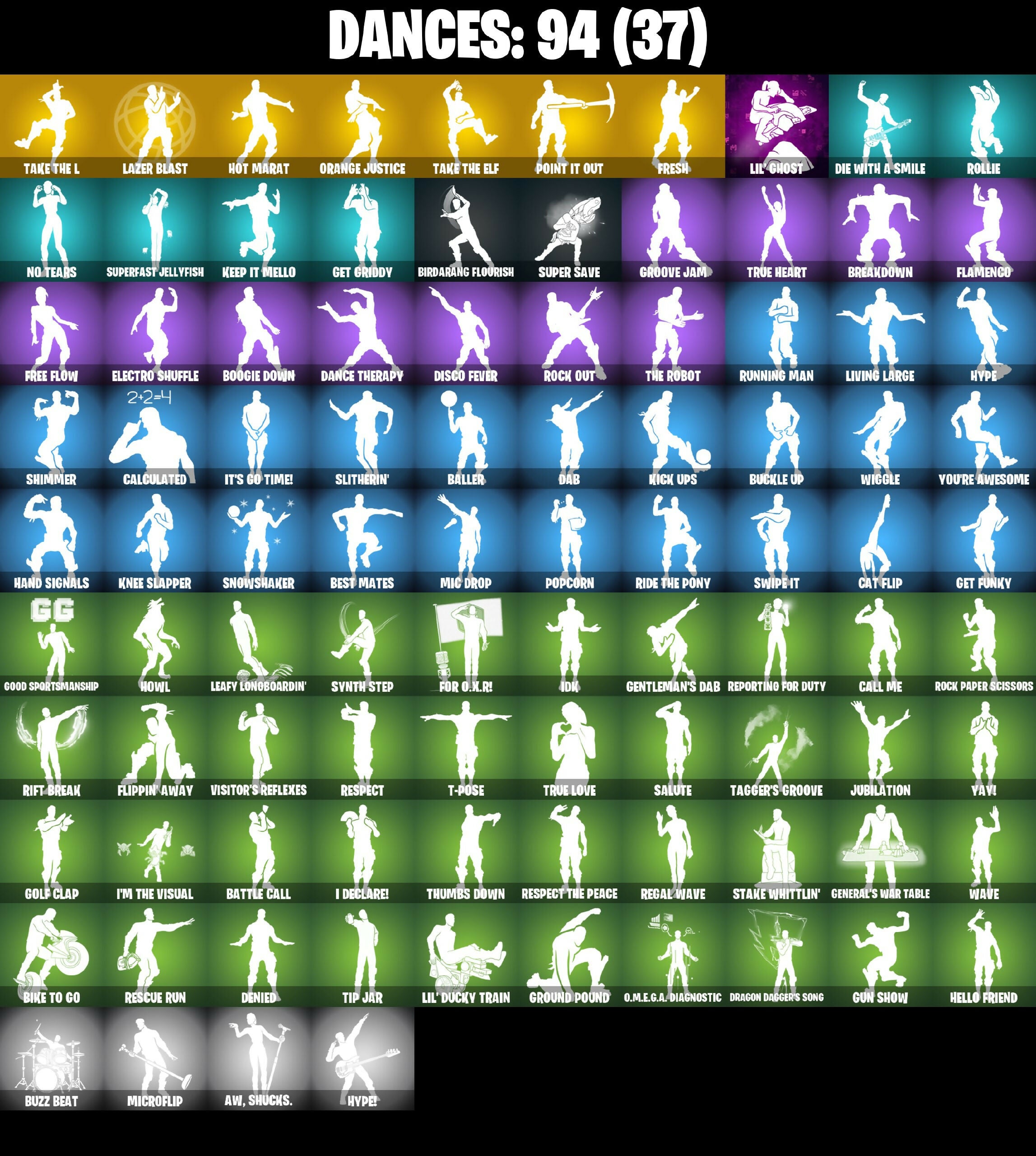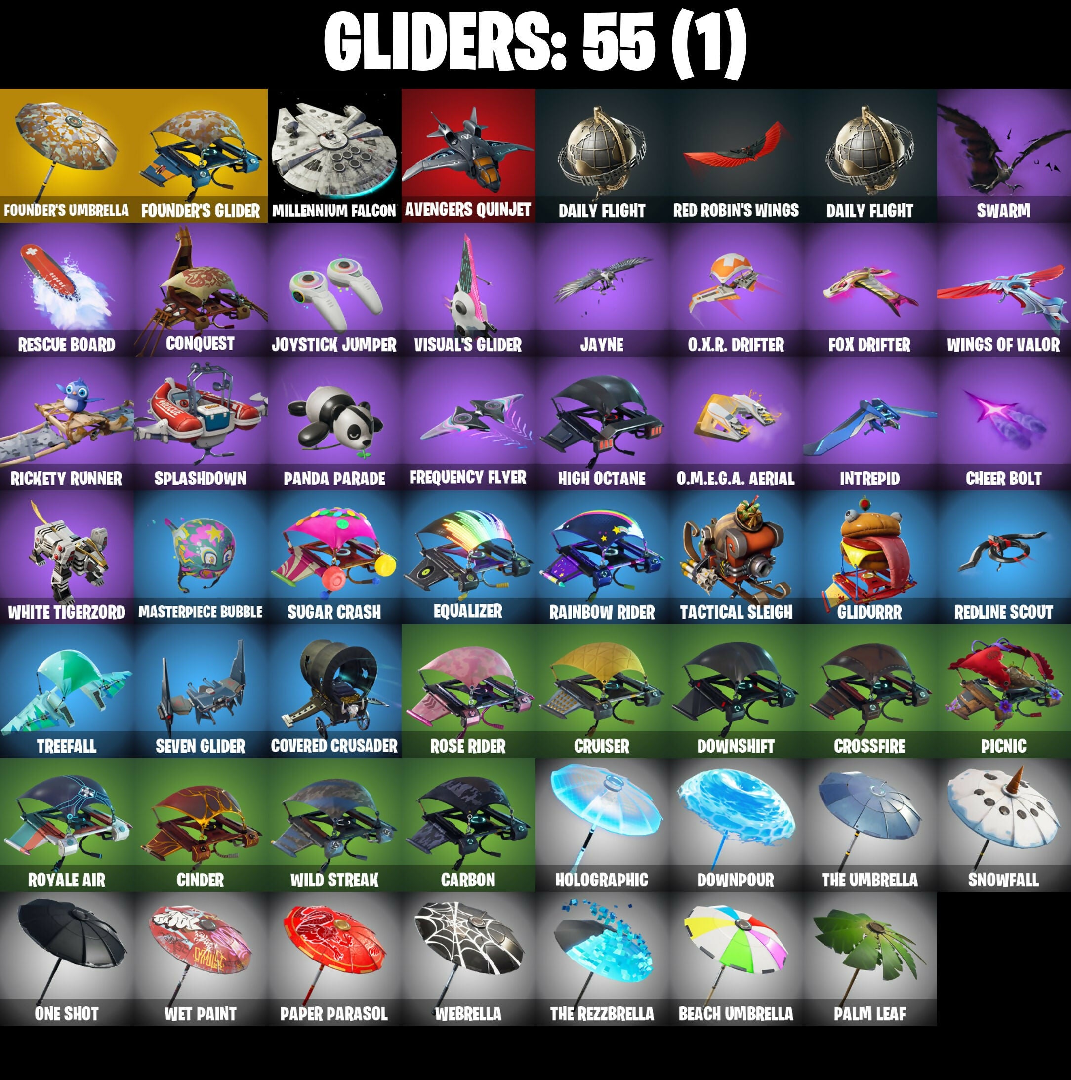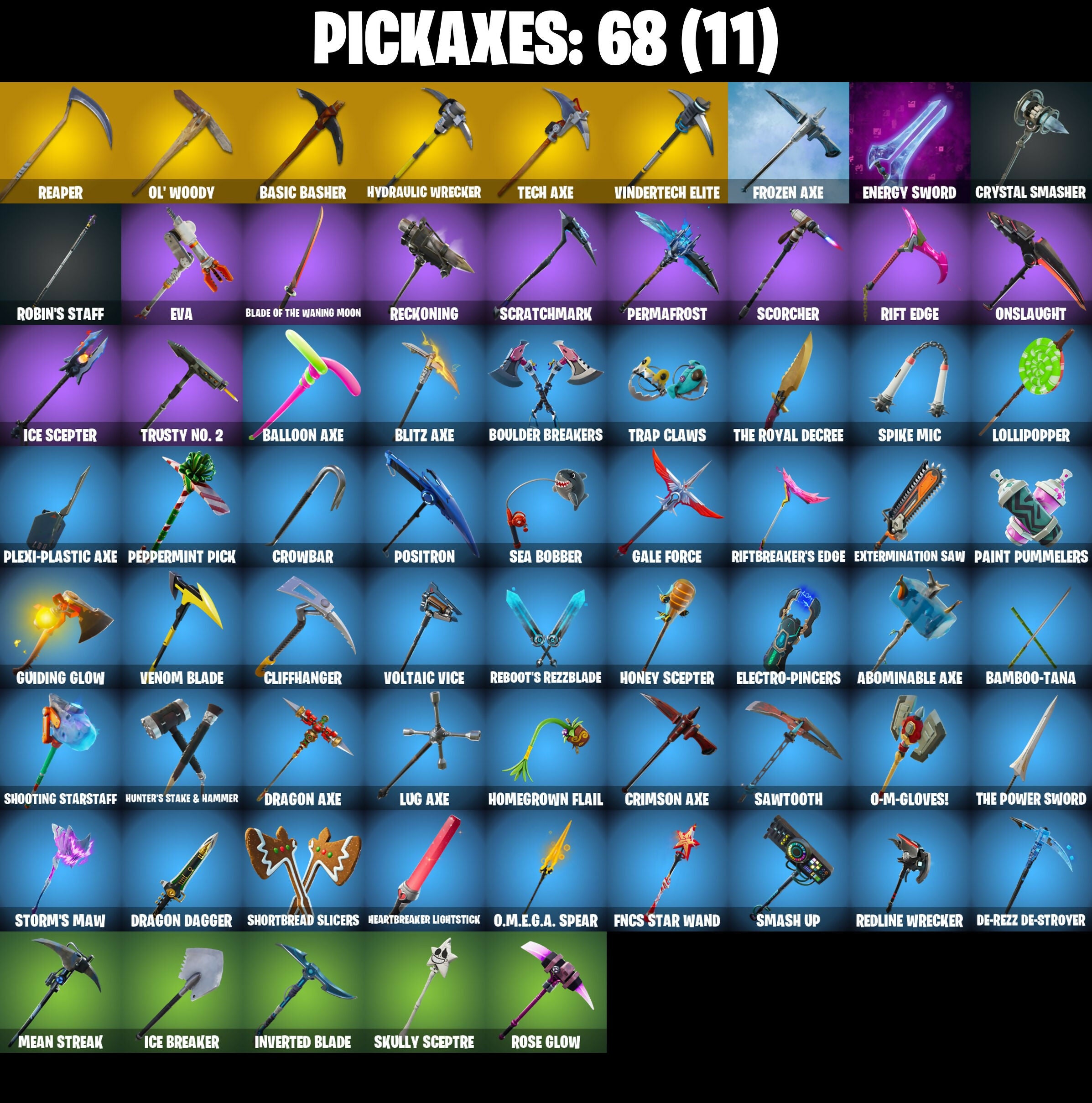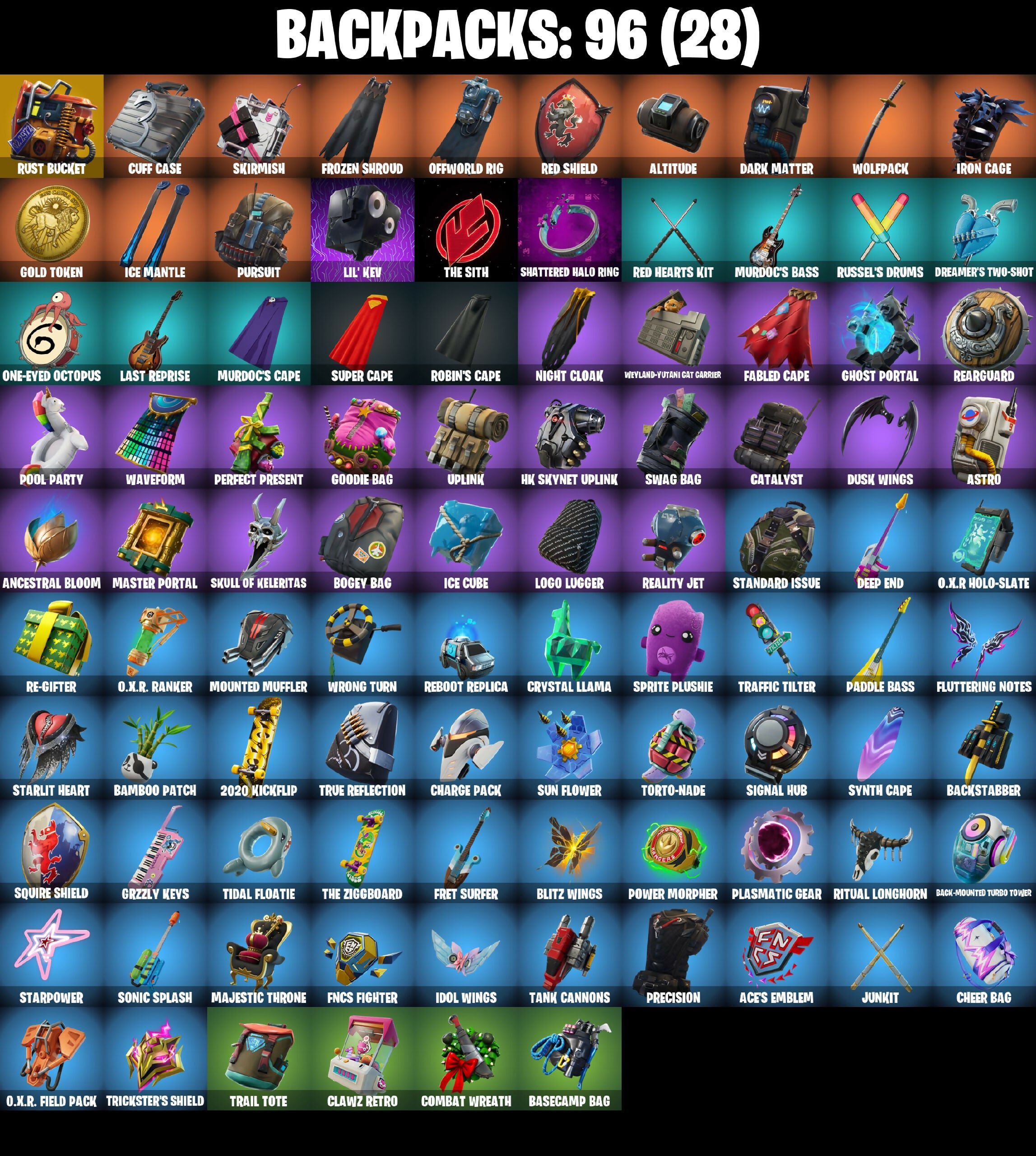 2020 Kickflip, Abominable Axe, Ace's Emblem, Agent Patch, Altitude, Ancestral Bloom, Assault Trooper, Astro, Avengers Quinjet, Aw, Shucks., B.R.U.T.E. Gunner, Back-Mounted Turbo Tower, Backstabber, Baller, Balloon Axe, Bamboo Patch, Bamboo-Tana, Basecamp Bag, Basic Basher, Battle Bus Balloon, Battle Call, Battle Gamer Mae, Battlehawk, Beach Jules, Beach Umbrella, Bernie, Best Mates, Bike To Go, Birdarang Flourish, Black Werewolf, Blade Of The Waning Moon, Blitz Axe, Blitz Wings, Blue Squire, Bogey Bag, Boogie Down, Boulder Breakers, Bracer, Breakdown, Buckle Up, Buzz Beat, Calamity, Calculated, Call Me, Caper, Carbide, Carbon, Cat Flip, Catalyst, Charge Pack, Cheer Bag, Cheer Bolt, Cinder, Clawz Retro, Cliffhanger, Clinical Crosser, Combat Wreath, Commando, Conquest, Covered Crusader, Crimson Axe, Crossfire, Crowbar, Cruiser, Crystal, Crystal Llama, Crystal Smasher, Cuff Case, Dab, Daily Flight, Dance Therapy, Danica, Dark Matter, Dark Voyager, De-Rezz De-Stroyer, Deep End, Denied, Die With A Smile, Die With A Smile Bruno, Dino Megazord, Dire, Disco Fever, Dj Yonder, Downpour, Downshift, Dragon Axe, Dragon Dagger, Dragon Dagger's Song, Dreamer's Two-Shot, Drift, Dummy, Dusk, Dusk Wings, Echo, Electro Shuffle, Electro-Pincers, Elite Agent, Ellen Ripley, Energy Sword, Equalizer, Eva, Extermination Saw, FNCS Star Wand, Fable, Fabled Cape, Flamenco, Flippin' Away, Fluttering Notes, Fncs Fighter, For O.X.R!, Founder's Glider, Founder's Umbrella, Fox Drifter, Free Flow, Frequency Flyer, Fresh, Fret Surfer, Frozen Axe, Frozen Shroud, Gale Force, General's War Table, Gentleman's Dab, Get Funky, Get Griddy, Ghost Portal, Giddy-Up, Glidurrr, Gold, Gold Token, Golf Clap, Good Sportsmanship, Goodie Bag, Green Ranger, Groove Jam, Ground Pound, Grzzly Keys, Guiding Glow, Gun Show, HK Skynet Uplink, Hana, Hana Park, Hand Signals, Haylee Skye, Heartbreaker Lightstick, Heartseeker Aphrodite, Hello Friend, High Octane, Holographic, Homegrown Flail, Honey Scepter, Hot Marat, Howl, Hunter's Stake & Hammer, Huntress, Hydraulic Wrecker, Hype, Hype!, I Declare!, I'm The Visual, IDK, Ice Breaker, Ice Cube, Ice Mantle, Ice Scepter, Idol Wings, Intrepid, Inverted Blade, Iron Cage, It's Go Time!, Jayne, Joystick Jumper, Jubilation, Junkit, Keep It Mello, Kick Ups, Kingsley, Knee Slapper, Last Reprise, Lazer Blast, Leafy Longboardin', Lil' Ducky Train, Lil' Ghost, Lil' Kev, Living Large, Logo Lugger, Lollipopper, Lt. Evergreen, Lt. Ripp Slade, Lug Axe, Lynx, Majestic Throne, Manic, Master Portal, Masterpiece Bubble, Mean Streak, Mercenary Kor, Mic Drop, Microflip, Millennium Falcon, Mission Specialist, Moonwalker, Mounted Muffler, Murdoc, Murdoc's Bass, Murdoc's Cape, Night Cloak, Nightshade, No Tears, O-M-Gloves!, O.M.E.G.A. Aerial, O.M.E.G.A. Diagnostic, O.M.E.G.A. Spear, O.M.E.G.A. Suit Alpha, O.X.R Field Pack, O.X.R Holo-Slate, O.X.R Ranker, O.X.R. Drifter, Offworld Rig, Ol' Woody, Omega, Omen Hunter Calamity, One Shot, One-Eyed Octopus, Onesie, Onslaught, Onyx Winter, Orange Justice, Paddle Bass, Paint Pummelers, Palm Leaf, Panda Parade, Paper Parasol, Par Patroller, Peppermint Pick, Perfect Present, Permafrost, Picnic, Plasmatic Gear, Plexi-Plastic Axe, Point It Out, Polly, Pool Party, Popcorn, Positron, Powder, Power Morpher, Precision, Pursuit, Ragnarok, Rainbow Rider, Raven, Re-Gifter, Reality Jet, Reaper, Rearguard, Reboot Man, Reboot Replica, Reboot's Rezzblade, Reckoning, Red Hearts Kit, Red Knight, Red Robin's Wings, Red Shield, Redline, Redline Racer, Redline Scout, Redline Wrecker, Regal Wave, Reporting For Duty, Rescue Board, Rescue Run, Respect, Respect The Peace, Rickety Runner, Ride The Pony, Rift Break, Rift Edge, Riftbreaker Drift, Riftbreaker's Edge, Ritual Longhorn, Robin, Robin's Cape, Robin's Staff, Rock Out, Rock Paper Scissors, Rogue Agent, Rollie, Rook, Rose Glow, Rose Rider, Rose Team Leader, Royale Air, Running Man, Russel, Russel's Drums, Rust Bucket, Rust Lord, Salute, Sawtooth, Scarlet Commander, Scorcher, Scratchmark, Sea Bobber, Sedona, Serenade, Seven Glider, Sgt. Winter, Shattered Halo Ring, Shimmer, Shooting Starstaff, Shortbread Slicers, Signal Hub, Skirmish, Skull Of Keleritas, Skull Trooper, Skully Sceptre, Sledgehammer, Slitherin', Smash Up, Snowfall, Snowshaker, Sonia, Sonic Splash, Spike Mic, Splashdown, Sprite Plushie, Squad Leader, Squire Shield, Stake Whittlin', Standard Issue, Starlit Heart, Starpower, Storm's Maw, Street Wave Teknique, Sugar Crash, Sun Flower, Sun Strider, Super Cape, Super Save, Superfast Jellyfish, Superman, Surf Witch, Swag Bag, Swarm, Swipe It, Synth Cape, Synth Step, T-800, T-Pose, Tactical Sleigh, Tagger's Groove, Take The Elf, Take The L, Tank Cannons, Tech Axe, Teknique, The Ace, The Ice King, The Power Sword, The Reaper, The Rezzbrella, The Robot, The Royal Decree, The Sith, The Umbrella, The Visitor, The Ziggboard, Thumbs Down, Tidal Floatie, Tide Strider, Tip Jar, Torto-Nade, Traffic Tilter, Trail Tote, Trap Claws, Treefall, Trickster's Shield, Trog, True Heart, True Love, True Reflection, Trusty No. 2, Unchained Ramirez, Unsc Spartan, Uplink, Valor, Venom Blade, Vindertech Elite, Visitor's Reflexes, Visual's Glider, Voltaic Vice, Warpaint, Wave, Waveform, Waypoint, Webrella, Wet Paint, Weyland-Yutani Cat Carrier, White, White Tigerzord, Wiggle, Wild Card, Wild Streak, Wingman, Wings Of Valor, Wolfpack, Wooly Warrior, Wrong Turn, Yay!, Yellow Jacket, Yoo-Mi, You're Awesome, Zenith, Ziggy, Zoey, bruno-san
