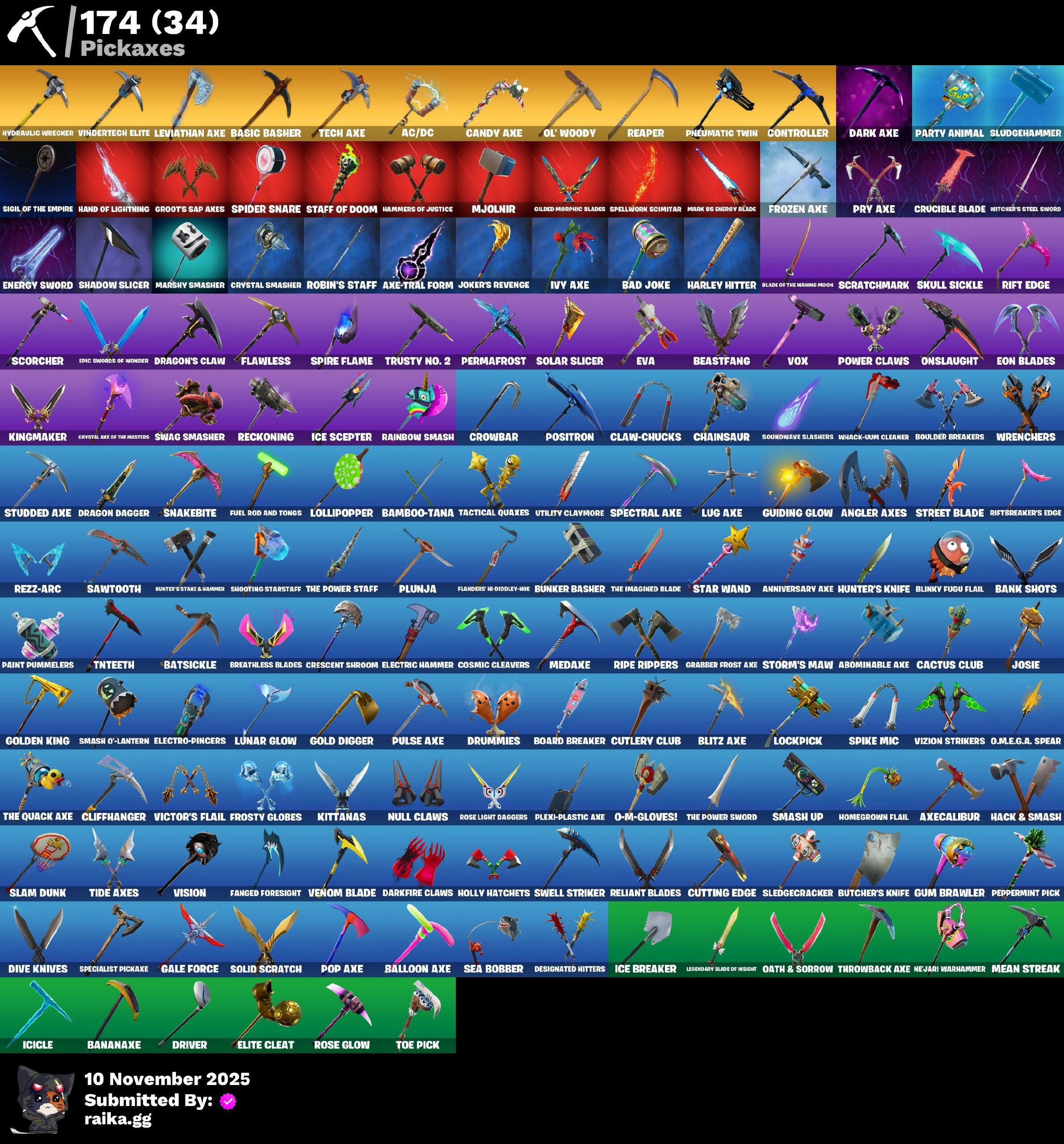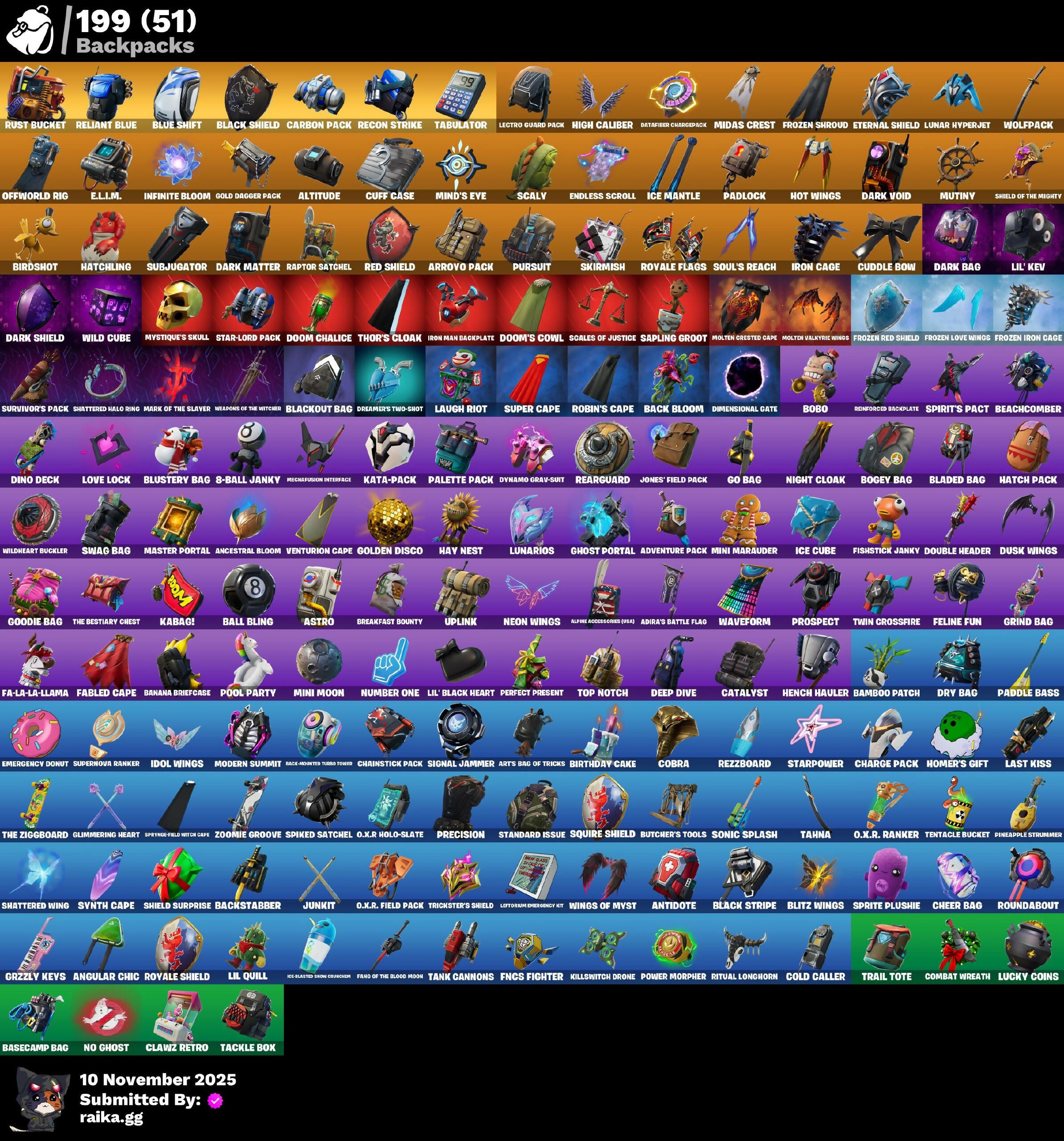 10 Field Flyer, 8-Ball Janky, 8-Ball Vs Scratch, A Warrior Prepares, A.I.M., AC/DC, Abominable Axe, Adeline, Adira's Battle Flag, Adventure Pack, Agent Jones, Agent Patch, Agent Peely, Air Shredder, Alpine Ace (USA), Altitude, Ancestral Bloom, Angler Axes, Angular Chic, Anniversarv Axe, Antidote, Arcana, Arcane Energy Glider, Arcane Research, Arctic Adeline, Arctic Assassin, Arctica, Armadillo, Arroyo Pack, Art The Clown, Arts Bag of Tricks, Ascend!, Astro, Astroworld Cyclone, Aura, Axe-tral Form, Axecalibur, Azarath Metrion Zinthos!, Back Bloom, Back-Mounted Turbo Tower, Backstabber, Bad Joke, Balance Board, Ball Bling, Baller, Balloon Axe, Bamboo Patch, Bamboo-Tana, Banana Bomber, Banana Briefcase, Bananaxe, Bank Shots, Base Jumper, Basecamp Bag, Basic Basher, Batsickle, Battle Bloom, Battle Gamer Mae, Battlehawk, Beach Umbrella, Beachcomber, Bean Bag, Beastfang, Beep Beep, Best Mates, Big Haul, Bike To Go, Birdarang Flourish, Birdshot, Birthday Cake, Black Knight, Black Shield, Black Stripe, Blackheart, Blackout Bag, Blade Raven, Blade of the Waning Moon, Bladed Bag, Blinky Fishstick, Blinky Fugu Flail, Blitz 'Brella, Blitz Axe, Blitz Wings, Blue Shift, Blue Squire, Blue Streak, Blue Striker, Blue Team Leader, Blustery Bag, Board Breaker, Bobo, Bogey Bag, Bombs Away!, Bone Patrol, Boneless, Boogie Down, Boomin', Boots 'N' Cats, Booty Buoy, Boulder Breakers, Bounty 'Brella, Brawler, Breakdown, Breakfast Bounty, Breaking Point, Breakpoint, Breathless Blades, Brella, Brite Bomber, Brutus, Bubbloon, Bulletproof, Bullseye, Bunker Basher, Bunker Jonesy, Burpee, Butcher's Knife, Butcher's Tools, Cacodemon, Cactus Club, Calamity, Calculated, Call Me, Candy Axe, Cap Kick, Carbide, Carbon, Carbon Commando, Carbon Pack, Cardistry, Cat Flip, Catalyst, Catwoman Zero, Cerberus, Chainsaur, Chainstick Pack, Charge Pack, Cheer Bag, Cheer Bolt, Chillest Vibe Rider, Chromebrella, Cinder, Circuit Breaker, Clash, Classified, Claw-Chucks, Clawz Retro, Clean Sweep, Cliffhanger, Cluck, Cluck Strut, Coaxial Blue, Cobalt, Cobra, Coin Flip, Cold Caller, Combat Wreath, Comet Crasher, Comfy Cats, Commando, Conga, Conquest, Controller, Convergence, Copines, Cosmic Cleavers, Covered Crusader, Crackshot, Crashbella, Crazy Eight, Crescent Shroom, Crimson Wish, Crossfire, Crowbar, Crowning Achievement, Crucible Blade, Cruiser, Crystal, Crystal Axe of the Masters, Crystal Smasher, Cuddle Bow, Cuddle Team Leader, Cuddly Cloudcruiser, Cuff Case, Curling Iron, Cutlery Club, Cutting Edge, Cyclo Curl, DJ Yonder, Dab, Dabstand, Dagger Dance, Daily Flight, Dark Axe, Dark Bag, Dark Bomber, Dark Jonesy, Dark Matter, Dark Red Knight, Dark Shield, Dark Vanguard, Dark Void, Dark Voyager, Dark Wild Card, Darkfire Claws, Datafiber Chargepack, Deadpool, Deep Dive, Designated Hitters, Dimensional Gate, Dino Deck, Dino Megazord, Dire, Dire Flyer, Disco Fever, Dive Knives, Doctor Doom, Don't Stare Now, Doom Chalice, Doom Slayer, Doom's Cowl, Double Header, Downpour, Downshift, Dragon Dagger, Dragon Dagger's Song, Dragon Stance, Dragon's Claw, Dream, Dreamer's Two-Shot, Drift, Driver, Droop, Drummies, Dry Bag, Dusk, Dusk Knight, Dusk Wings, Dusty, Dynamic Shuffle, Dynamo, Dynamo Gravy-Suit, E.L.I.M., Eagle, Eagle's Form, Eggar, Electric Hammer, Electro-Pincers, Elite Agent, Elite Cleat, Ember, Emergency Donut, Endless Scroll, Energy Sword, Enforcer, Eon Blades, Epic Swords of Wonder, Equalizer, Eternal Knight, Eternal Shield, Eva, Evasive Maneuvers, FNCS Fighter, Fa-La-La-Llama, Fable, Fabled Cape, Face Palm, Fade, Fang of the Blood Moon, Fanged Foresight, Feline Fun, Field Flyer, Fierce, Finesse Finisher, Fishstick Janky, Fishy Flier, Flamenco, Flanders' Hi-Diddle-Hoe, Flapjack Flyer, Flappy, Flavor Saver Sailor, Flawless, Flip Flyer, Flippin' Away, Flippin' Sexy, Floss, Focused, For O.X.R.!, Fortilla Flier, Foundational 'Brella, Founder's Glider, Founder's Umbrella, Fox Drifter, Free Flow, Frequency Flyer, Frost Axe, Frosty Globes, Frozen Axe, Frozen Iron Cage, Frozen Love Ranger, Frozen Love Wings, Frozen Raven, Frozen Red Knight, Frozen Red Shield, Frozen Shroud, Fuel Rod and Tongs, Funk Ops, Gale Force, Gathering Storm, Gear Specialist Maya, General's War Table, Gentleman's Dab, Geralt of Rivia, Get Down!, Get Funky, Get Loose, Ghost Face, Ghost Portal, Giddy-Up, Gilded Morphic Blades, Gli-Dar 3000, Glidurrr, Glimmering Heart, Go Bag, Gold Dagger Pack, Gold Digger, Gold Midas, Golden Disco, Golden King, Golf Clap, Good Sportsmanship, Goodie Bag, Grabber, Green Ranger, Grind Bag, Grizzly Keys, Groot, Groots Sap Axes, Groove Jam, Ground Pound, Guiding Glow, Guild, Gum Brawler, Gun Show, Hack & Smash, Hammers of Justice, Hand of Lightning, Har-Har-Har!, Harley Hitter, Hatch Pack, Hatchling, Have A Seat, Hay Man, Hay Nest, Haylee Skye, Hello Friend, Hench Hauler, High Caliber, High Five, High Octane, Holly Hatchets, Holographic, Homegrown Flail, Homer Simpson, Homer's Gift, Hoop Master, Horn 'N' Hacksaw, Hot Marat, Hot Wings, Howl, Hula Hoopin', Hunter's Knife, Hunter's Skyblade, Hunter's Stake & Hammer, Huntress, Hush, Hybrid, Hydraulic Wrecker, Hype, Hype!, Hyperboard, Hypnot-eyes, I Am Evil Homer, I Declare!, I'm The Visual, I.C.E.-Blasted Snow Crusader, Ice Breaker, Ice Cube, Ice Mantle, Ice Scepter, Icicle, Idol Wings, Igni Sign, Imperial March, Infield Fly, Infinite Bloom, Inflate-A-Roach, Intrepid, Invasion, Iris, Iron Cage, Iron Man Backplate, It Is Finished, It's Go Time!, It's... You?, Ivy Axe, Jaywalking, Jennifer Walters, Joker's Revenge, Jones' Field Pack, Josie, Journey Vs Hazard, Joystick Jumper, Jubilation, Jules, Jump Jets, Jumpshot, Junk Bucket, Junkit, K.O. Cruiser, Kabag!, Kata-Pack, Keep It Mello, Keyed Up, Killswitch, Killswitch Drone, Kingmaker, Kit, Kittanas, Kondor, Laguna, Lara Croft, Last Kiss, Laugh It Up, Laugh Riot, Lawawing, Lazy Man Toilet Seat, Leafy Longboardin', Lectro Guard Pack, Legendary Blade of Insight, Leptorium Emergency Kit, Leviathan Axe, Lexa, Lightrider, Lil Quill, Lil' Black Heart, Lil' Gho