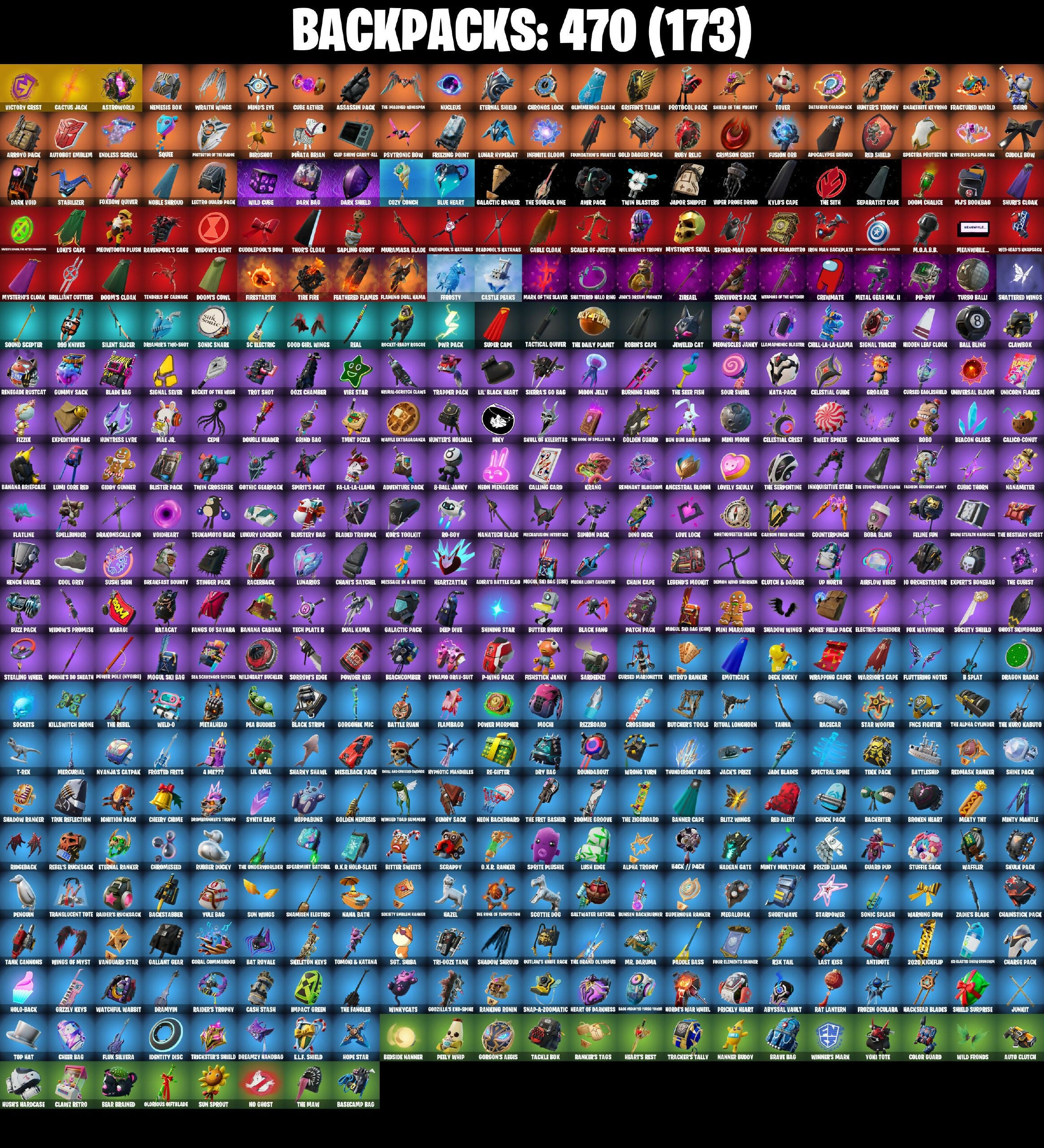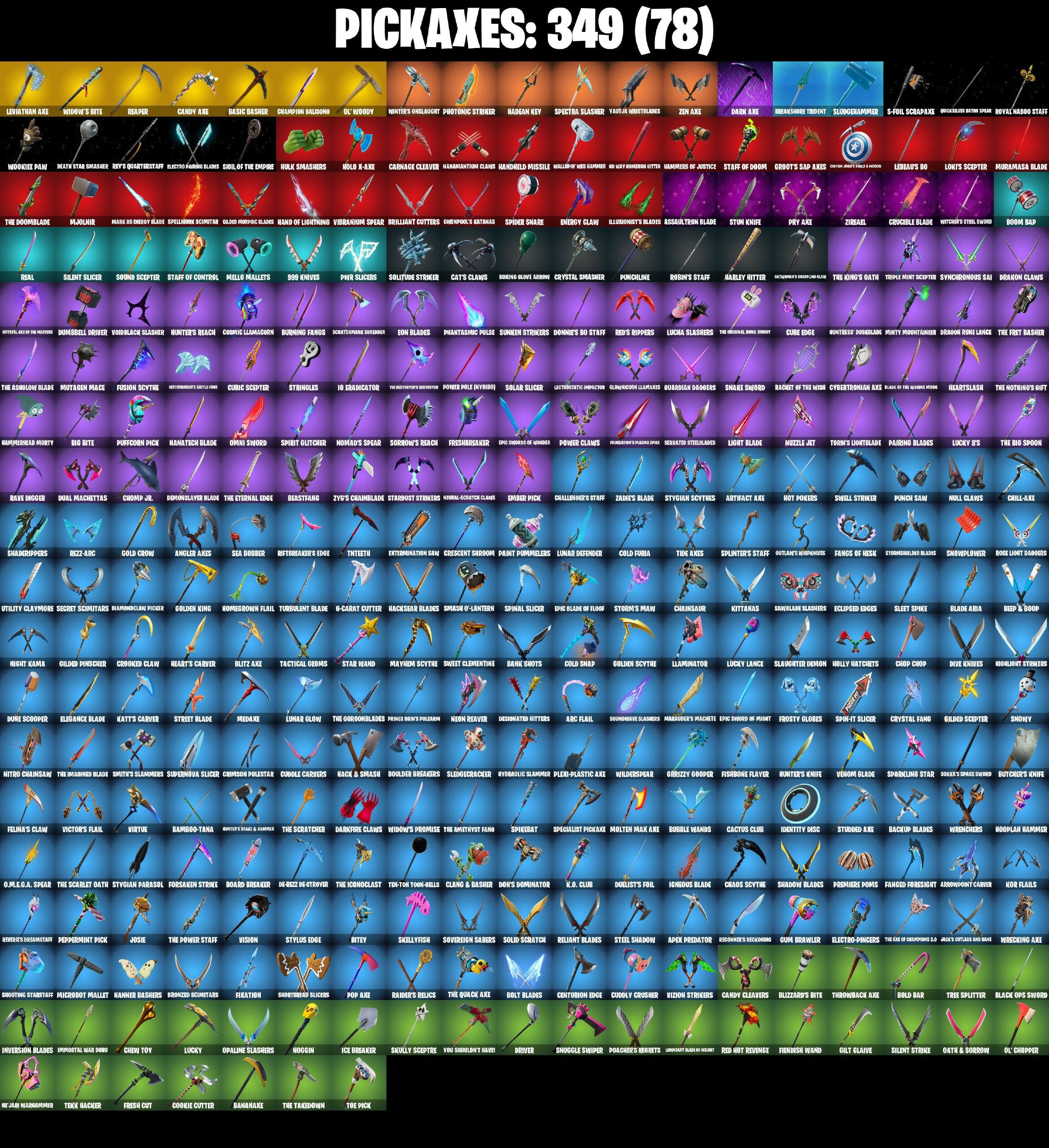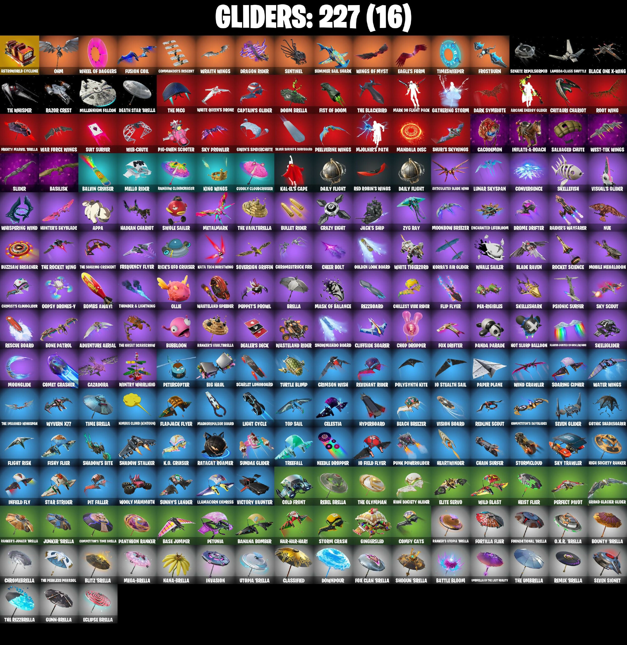 (Snikt!), *Keyed Up*, 10 Field Flyer, 10 Orchestrat0r, 10 Stealth Sail, 2020 Kickflip, 20C Clash, 4 Me???, 6-Carat Cutter, 8-Ball Janky, 8-Ball vs Scratch, 996 Knives, 999 Knives, A Warrior Prepares, AVR Pack, Abyssal Vault, Adventure Aerial, Adventure Pack, Afk, Aftermath, Agent John Loop 29, Agent Jones, Agent Peely, Air Shredder, Airblow Vibes, Ako, Alli, Alpha Trophy, Always Battlefield, Ancestral Bloom, Anderson .Paak, Andra's Battle Flag, Angler Axes, Anora, Antidote, Antonia, Aobolan, Apex Predator, Aphrodite, Apocalypse Shroud, Appa, Arachrobatics, Arc Flail, Arcane Energy Glider, Arcane Jae, Arcane Research, Arctic Adoline, Arctic Assassin, Ares, Arrowpoint Carver, Arroyo Pack, Artemis, Articulated Blade Wing, Artifact Axe, Ascension Nova, Assassin Pack, Assault Trooper, Assaultron Blade, Astra, Astraa, Astro Aaron, Astro Jack, Astroworld, Astroworld Cyclone, Aubrey, Aubrian, Aura, Aurelian, Auto Clutch, Autobot Emblem, Avatar's Flourish, B Splat, B.R.U.T.E. Gunner, Bacch, Back // Pack, Backdenter, Backstabber, Backup Blades, Badger Gunner, Balance Board, Ball Bling, Ball Morphosis Beast, Balvin Cruiser, Bamboo-Tana, Banana Bomber, Banana Briefcase, Banana Cabana, Bananaxe, Bank Shots, Banner Cape, Banner Trooper, Barley Queen, Base Jumper, Basecamp Bag, Basic Basher, Basilisk, Bat Royale, Battle Bloom, Battle Ryan, Battle-Tested, Battleslip, Batty Bomber, Bea Sample, Beach Breezer, Beachcomber, Beacon Glass, Bear Brained, Beastfang, Beatzbunny, Bedside Manner, Beep & Boop, Beep Beep, Bhangra Boogie, Big Bite, Big Haul, Bike To Go, Billy Bounce, Bim Bam Boom, Birdarang Flourish, Birdshot, Bitey, Bitstream, Bitter Sweets, Black Fang, Black One X-Wing, Black Ops Sword, Black Panther Chrome, Black Queen, Black Stripe, Blade Aria, Blade Bag, Blade Raven, Blade of the Rising Moon, Bladed Trapwalk, Blair, Blazany Heroish Digit, Blaze, Blister Pack, Blitz 'Brella, Blitz Axe, Blitz Wings, Blizzard's Bite, Blowin' Up, Blue Heart, Blush, Blustery Bag, Board Breaker, Boardwalk Ruby, Boba Bling, Boba Snack, Bobo, Boing!, Bold Bar, Bold Stance, Bolt Blades, Bombs Away!, Bone Patrol, Bones Do Sheath, Boogie Down, Book of Cagliostro, Boom Bap, Boomin', Boulder Breakers, Bounty 'Brella, Boxing Glove Arrow, Boy's A Liar, Brat, Brave Bag, Breakfast Bounty, Breaking Point, Breakshore Trident, Brella, Brilliant Cutters, Bring It Around, Brite Moves, Broken Heart, Bronzed Scimitars, Bruno Mars, Bubble Wands, Bubbloon, Bug Punk Sunny, Build-up, Bullet Rider, Bullseye, Bun Bun Band Band, Burning Fangs, Business Hips, Butcher's Knife, Butcher's Tools, Butter Robot, Buzz Pack, Buzzsaw Breacher, Byte, Cable Cloak, Cacodemon, Cactus Club, Cactus Jack, Calico-Conut, Call Me, Called Shot, Calling Card, Camille, Camo OG OG, Candy Axe, Candy Cleavers, Caper, Captain Alamea, Captain America's Shield & Hammer, Captain Jones, Captain's Glider, Card Drop, Cardistry, Carnage, Carnage Cleaver, Cash Stash, Castle Peaks, Castor, Cat's Claws, Caterpillar's Afterburn Gun, Cauldron Chill, Cazadora, Cazadora Wings, Celestia, Celestial Crest, Celestial Guide, Centurion, Centurion Edge, Ceph, Cerberus, Cerberus Lock, Chain Cape, Chain Surfer, Chain's Satchel, Chainsaur, Chainstick Pack, Challenger's Staff, Champion Balisong, Chance, Chaos Agent, Chaos Origins, Chaos Scythe, Charge Pack, Cheer Bag, Cheer Bolt, Chemist's Cloudglider, Cherry Chiller, Chew Toy, Chickenpot's Katanas, Chill Count, Chill-Axe, Chill-La-La-Llama, Chillest Vibe Rider, Chiquisa, Chitauri Chariot, Choice Knit, Choka Pack, Chomp Jr., Chop Chop, Chop Dropper, Chrome Pink, Chromebrella, Chromeseed, Chromestruck Fire, Ciani, Clang & Basher, Clantz Retro, Clark Kent, Clash, Classified, Clawbox, Clean Sweep, Cliffside Soarer, Clinical Crosser, Clip Show Carry-All, Cloaked Shadow, Clutch, Clutch & Dagger, Clutch Jones, Cobalt Specialist Maya, CodeName L.L.C., Codsworth's Cleanup, Coin Flip, Cold Front, Cold Furia, Cold Snap, Collector Kidn Theory, Color Crossa, Color Guard, Colorious Outflade, Combat Elite, Combat Tech Jules, Comet Crasher, Comfy Cats, Commander's Descent, Commando, Competitor's Skyblades, Competitor's Time Brella, Conch Call, Conjure Weapon, Convergence, Cookie Cutter, Cool Grey, Coral Commandos, Corrupted, Cosmic Legacy, Cosmic Llamacorn, Cosmos Hooded Rat, Count It!, Counterpunch, Court Queen Brisa, Cozy Champs, Cozy Conch, Crabby, Crack It, Crackdown, Crackshot, Crazy Eight, Crescent Shroom, Crewmate, Crimson Crest, Crimson Elite, Crimson Polestar, Crimson Wish, Crooked Claw, Crossbounce, Crossover, Crossrigger, Crowning Achievement, Crucible Blade, Cryptic, Crystal, Crystal Axe of the Ruins, Crystal Fang, Crystal Smasher, Crystalina, Cube Aether, Cube Assassin, Cube Edge, Cubic Scepter, Cubic Thorn, Cuddle Bow, Cuddle Team Leader, Cuddlepod's Bow, Cuddly Cloudcruiser, Cuddly Crusher, Cupid's Arrow, Curling Iron, Cursed Embershield, Cursed Energy, Cutipied, Cybertronian Axe, Cyclo Curl, D6 Empress A.L, DILLA BEAT SUCKER, Daemon Steel Ryder, Dagger, Dagger Dance, Daily Flight, Dance Monkey, Dance Off, Dark Axe, Dark Bag, Dark Bomber, Dark Fossil Skull, Dark Jonesy, Dark Red Knight, Dark Shield, Dark Symbiote, Dark Vanguard, Dark Void, Dark Wild Card, Darkfire Claws, Darth Vader, Databurst Charger Kid, Dawn Digest Ninja, De-Rizz De-Grover, Deadpool's Katanas, Deal 'Em Out, Dealer's Deck, Death Star 'Brella, Death Star Smasher, Deep Dab, Deep Dive, Delmos, Demon Wing Substance, Demonslayer Blade, Desert Dawn Lyric, Desolated Hatters, Devil Reindeer, Diamond Diva, Diamond Throne, Diamondclaw Picker, Dice Roll, Dicey Donkey, Dieselback Pack, Dino Deck, Dirtbike Challenge, Distraction Dance, Dive Knives, Dixon Stacy, Do The Split, Doctor Doom, Doctor Slone, Don's Dominator, Donnie's Bo Staff, Donny Talie, Donvaly Racer, Doom Brella, Doom Chalice, Doom Cube Pack, Doom Doom, Doom Slayer, Doom's Cloak, Doom's Cowl, Doom's Domain, Double Header, Downpour, Doze Dab, Dragon Barrel, Dragon Rider, Dragon Rune Lance, Dragonscale Duo, Drakon Claws, Dram
