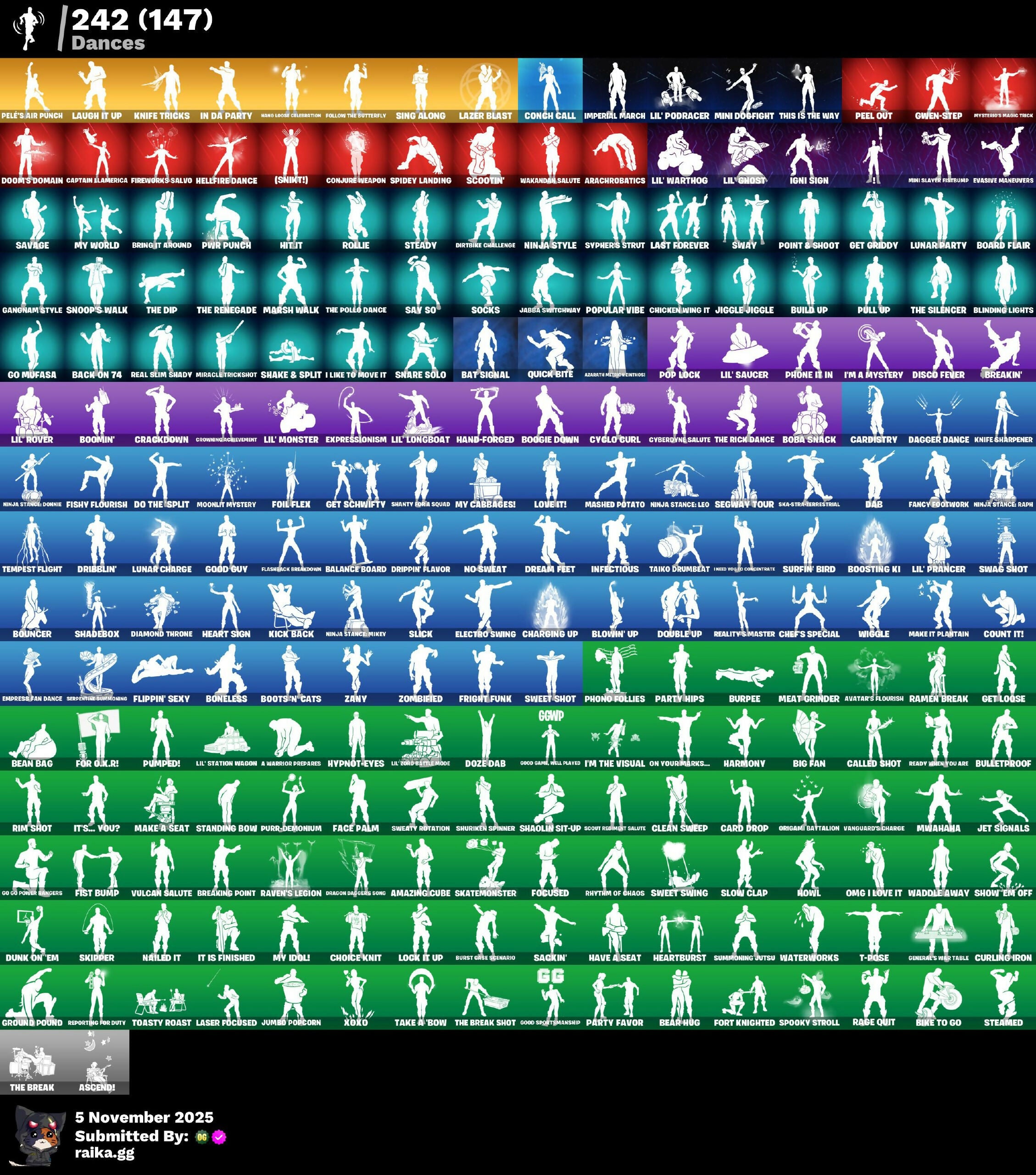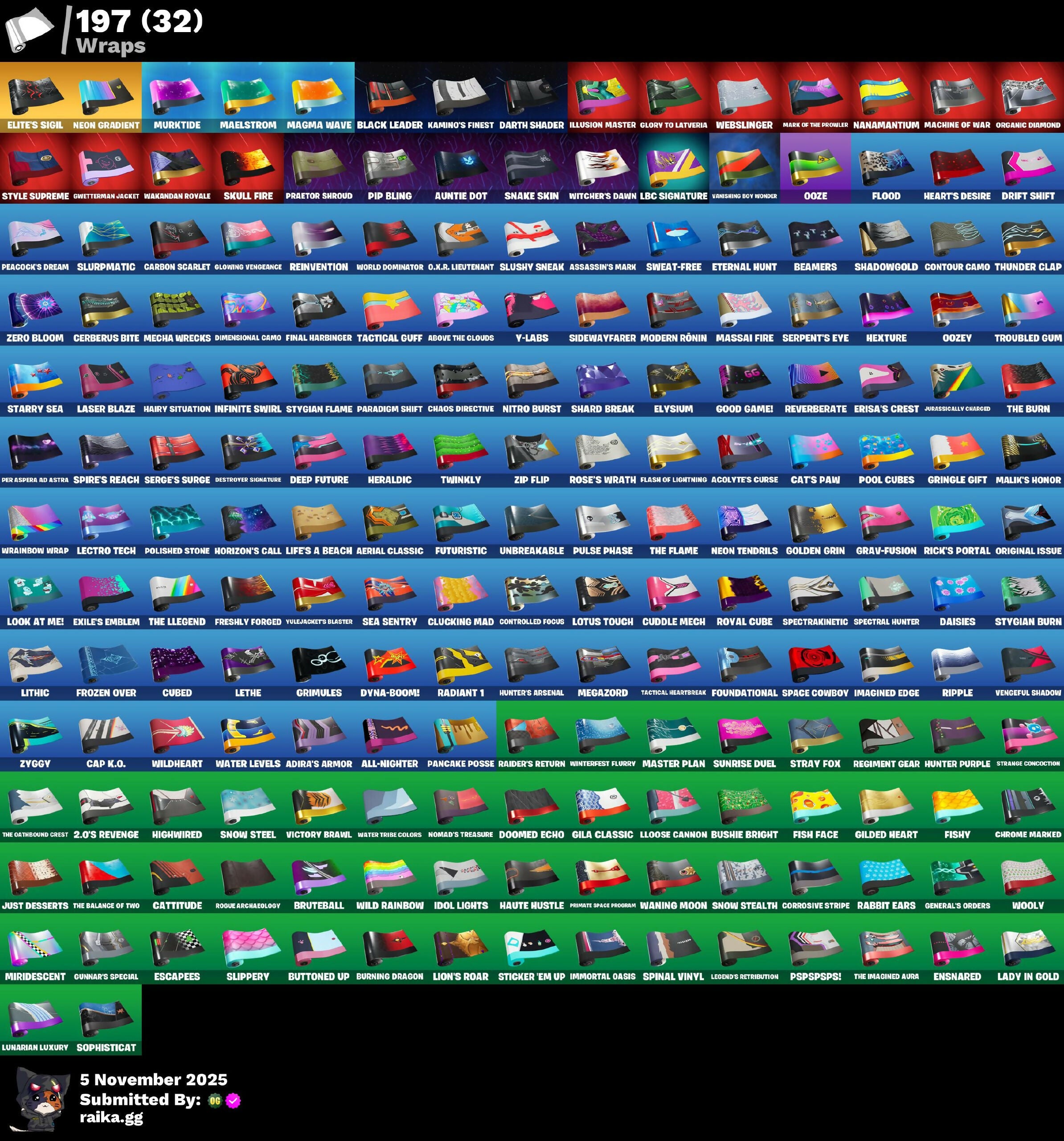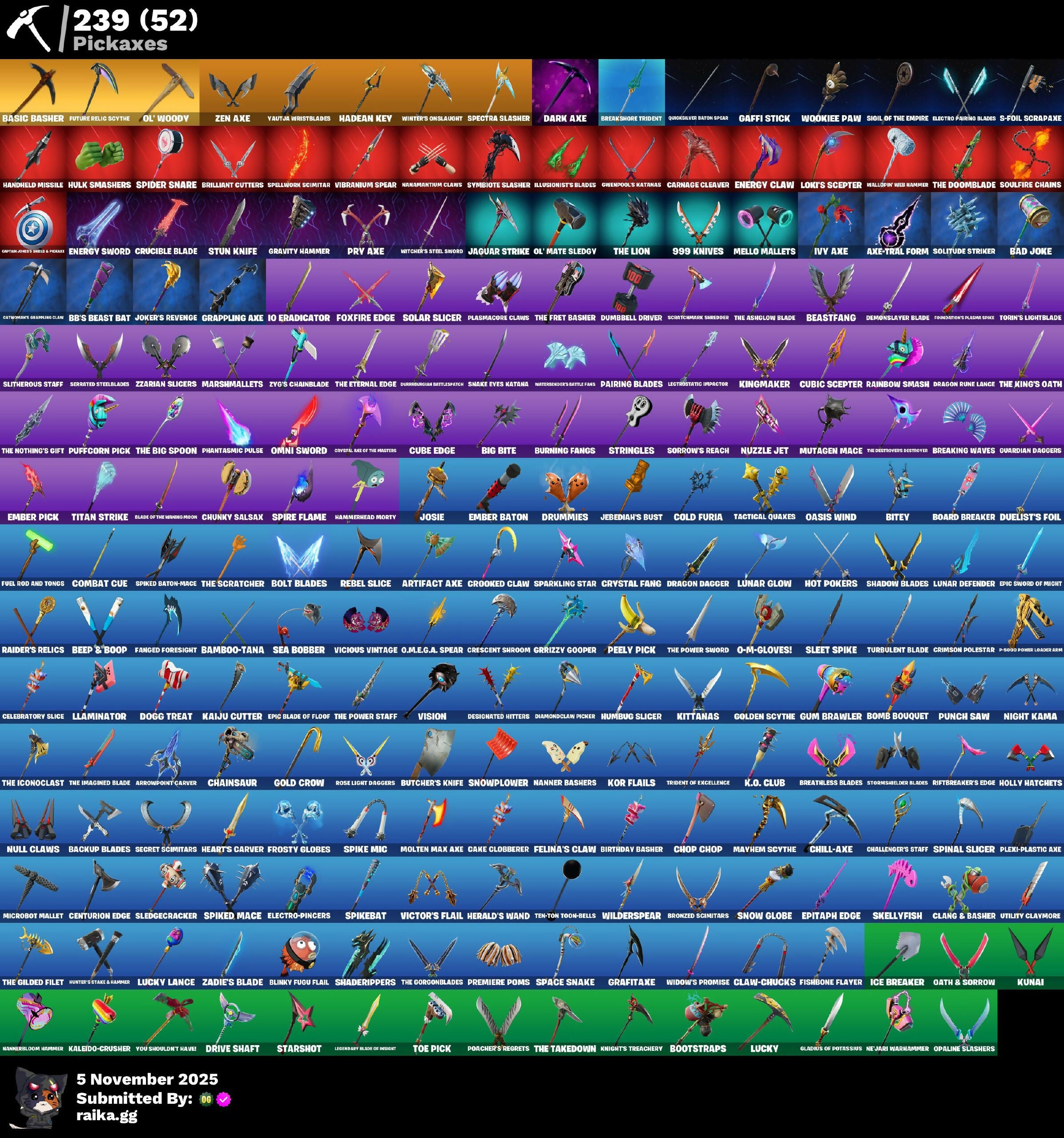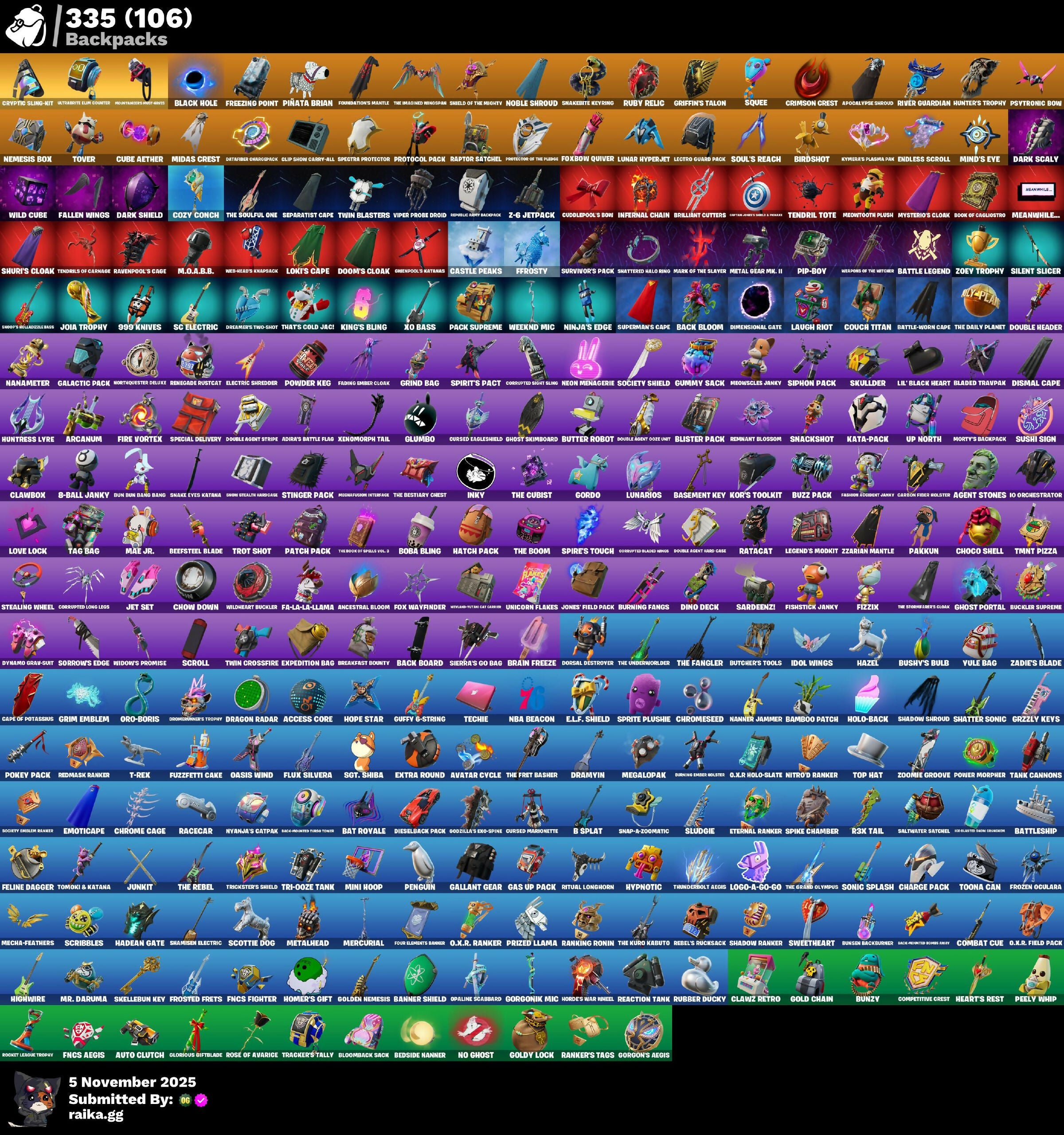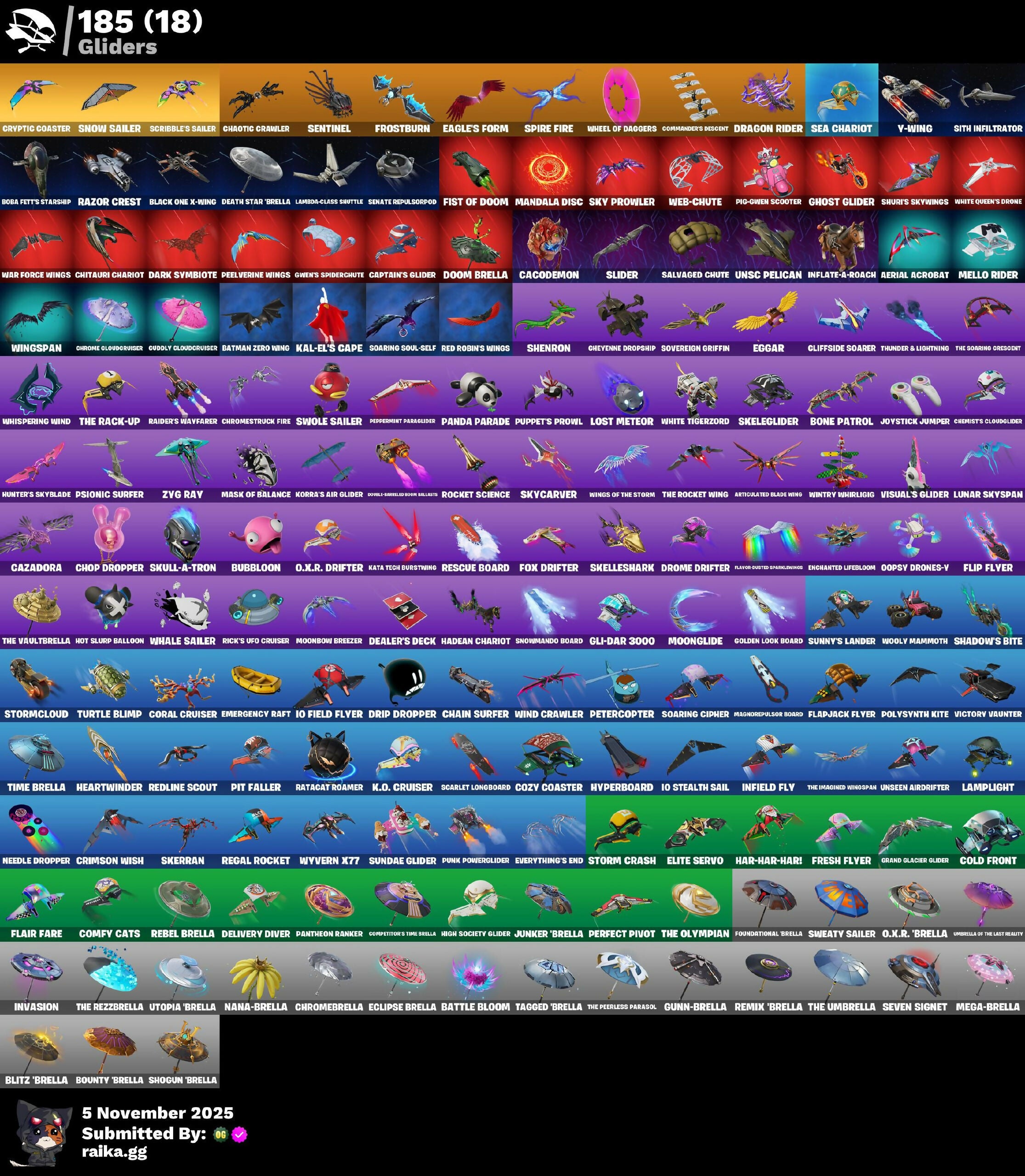 (Snikt!), 1-Ball, 10 Orchestrator, 2.0’s Revenge, 8-Ball Janky, 999 Knives, A Warrior Prepares, Above The Clouds, Abstrakt, Access Core, Acolyte's Curse, Adira, Adira's Battle Flag, Adira’s Armor, Aerial Acrobat, Aerial Classic, Agent Jones, Agent Patch, Agent Stones, All-Nighter, Alli, Amazing Cube, Anarchy Lizard Vertigos, Ancestral Bloom, Aphrodite, Apocalypse Shroud, Arachrobatics, Arcanum, Arctic Adeline, Arrowpoint Carver, Artemis, Articulated Blade Wing, Artifact Axe, Ascend!, Assassin's Mark, Auntie Dot, Aura, Auto Clutch, Avatar Cycle, Avatar's Flourish, Axe-Tral Form, B Splat, BB's Beast Bat, Back Bloom, Back Board, Back On 74, Back-Mounted Orbit Arms, Back-Mounted Turbo Turn, Backlash, Backup Blades, Bad Joke, Balance Board, Bamboo Patch, Bamboo-Tana, Banner Shield, Basement Key, Basic Basher, Bat Royale, Bat Signal, Batman Zero, Batman Zero Wing, Battle Bloom, Battle Gamer Mae, Battle Legend, Battle-Worn Cape, Battleship, Beamers, Bean Bag, Bear Hug, Beast Boy, Beastfang, Bedside Nanner, Beefsteel Blade, Beep & Boop, Big Bite, Big Fan, Bike To Go, Birdshot, Birthday Basher, Bitev, Black Hole, Black Leader, Black One X-Wing, Blade of the Morning Moon, Bladed Travpak, Blinding Lights, Blinky Fugu Flail, Blister Pack, Blitz 'Brella, Blizzard Bomber, Bloomback Sack, Blowin' Up, Board Breaker, Board Flair, Boba Bling, Boba Fett, Boba Fett's Starship, Boba Snack, Bolt Blades, Bomb Bouquet, Bone Patrol, Boneless, Boogie Down, Book Of Cagliostro, Boomin', Boosting Ki, Bootsin' Cats, Bootstraps, Bouncer, Bounty 'Brella, Brain Freeze, Breakfast Bounty, Breakin', Breaking Point, Breaking Waves, Breakshore Trident, Breathless Blades, Brilliant Cutters, Bring It Around, Britesorm Bomber, Bronzed Scimitars, Bruteball, Bubloon, Buckler Supreme, Bugha, Build Up, Bulletproof, Bullseye, Bun Bun, Bunsen Backburner, Bunzy, Burning Dragon, Burning Ember Holster, Burning Fangs, Burpee, Burst Case Scenario, Bushie Bright, Bushy's Bulb, Butcher's Knife, Butcher's Tools, Butter Robot, Buttoned Up, Buzz Pack, Bytes, Cacodemon, Cake Clobberer, Called Shot, Cap K.O., Cape Of Potassium, Captain James's Skull & Pewker, Captain Jones, Captain Llamerica, Captain's Glider, Captains Shield & Pickaxe, Carbon Fiber Holster, Carbon Scarlet, Card Drop, Cardistry, Carnage Cleaver, Castle Peaks, Cat's Paw, Cattitude, Cattywhomp's Grappling Claw, Catwoman Zero, Cazadora, Celebratory Slice, Centurion, Centurion Edge, Cerberus, Cerberus Bite, Chain Surfer, Chainsaur, Challenger's Staff, Chaos Directive, Chaos Director, Chaos Double Agent, Chaos Origins, Chaotic Crawler, Charge Pack, Charging Up, Charlotte, Chef's Special, Chemist's Cloudglider, Cheyenne Dropship, Chicken Wing It, Chill-Axe, Chitauri Chariot, Choco Shell, Choice Knit, Chop Chop, Chop Dropper, Chow Down, Chrome Cage, Chrome Cloudcruiser, Chrome Marked, Chrome Punk, Chromebrella, Chromeseed, Chromestruck Fire, Chunky Salsax, Clang & Basher, Clark Kent, Claw-Chucks, Clawbox, Clawz Retro, Clean Sweep, Cliffside Soarer, Clip Show Carry-All, Cluck, Clucking Mad, Codename E.L.F., Cold Front, Cold Furia, Combat Cue, Comfy Cats, Commander's Descent, Competitive Crest, Competitor's Time Brella, Conch Call, Conjure Weapon, Contour Camo, Contract Giller, Controlled Focus, Coral Cruiser, Corrosive Stripe, Corrupted Arachne, Corrupted Blade Wings, Corrupted Insight, Corrupted Long Legs, Corrupted Shogun, Corrupted Sight Sling, Couch Titan, Count It!, Cozy Coaster, Cozy Conch, Crackabella, Crackdown, Crackshot, Crescent Shroom, Crimson Crest, Crimson Polestar, Crimson Wish, Crooked Claw, Crown Ninja Achievement, Crucible Blade, Cryptic Coaster, Cryptic Sling-Kit, Crystal Axe of the Masters, Crystal Fang, Cube Aether, Cube Assassin, Cube Edge, Cubed, Cubic Scepter, Cuddle Mech, Cuddlepool, Cuddlepool's Bow, Cuddly Cloudcruiser, Curling Iron, Cursed Eagleshield, Cursed Marionette, Cyberdino Salute, Cyclo Curl, Dab, Dagger Dance, Daisies, Dark Agent Wildcard, Dark Axe, Dark Jonesy, Dark Red Knight, Dark Rex, Dark Scaly, Dark Shield, Dark Symbiote, Dark Wild Card, Darth Shader, Darth Vader, Datafiber Chargpack, Dealer's Deck, Death Star 'Brella, Deep Future, Deimos, Delivery Diver, Demon Slayer Blade, Designated Hitters, Destroyer Signature, Diamond Throne, Diamondclaw Picker, Dieselback Pack, Dimensional Camo, Dimensional Gate, Dino Deck, Dino Megazord, Dirtbike Challenge, Disco Fever, Dismal Cape, Dizzie, Do The Split, Doctor Slone, Doctor Strange, Dogg Treat, Doggo, Doom, Doom Brella, Doom Slayer, Doom's Cloak, Doom's Domain, Doomed Echo, Doomhammer Trophy, Dorsal Destroyer, Double Agent Hard Case, Double Agent Ooze Unit, Double Agent Rush, Double Agent Stripe, Double Header, Double-Barreled Boom Ballast, Double-Up, Doze Dab, Dragon Dagger, Dragon Daycare's Long, Dragon Radar, Dragon Rider, Dragon Rune Lance, Dramyin, Dream Feet, Dreamer's Two-Shot, Dribblin', Drift Shift, Drip Dropper, Drippin' Flavor, Drive Shaft, Drome Drifter, Drummies, Duelist's Foil, Dumbbell Driver, Dunk On 'Em, Durrrburgian Battlespike, Dusty, Dutch, Dyna-Boom!, Dynamo Grab-Suit, Dynamo Tintina, Eagle's Form, Eclipse Brella, Eggar, Electric Shredder, Electro Pairing Blades, Electro Swing, Electro-Pincers, Elf Shield, Elite Servo, Elite's Sigil, Ellen Ripley, Elysium, Ember Baton, Ember Pick, Emergency Raft, Emma Frost, Emoticape, Empress Fan Dance, Enchanted Lifebloom, Endless Scroll, Endop's Coldazzle Slasher, Energy Claw, Energy Sword, Ensnared, Epic Blade of Floof, Epic Sword of Might, Epitaph Edge, Eren Jaeger, Erisa, Erisa's Crest, Escapees, Eternal Hunt, Eternal Ranker, Evasive Maneuvers, Everything's End, Evie, Exile’s Emblem, Expedition Bag, Expressionism, Extra Round, Fa-La-La-Llama, Fabio Sparklemane, Face Palm, Fading Ember Cloak, Fallen Love Ranger, Fallen Wings, Fancy Footwork, Fanged Foresight, Fashion & Accident Janky, Felina, Felina's Claw, Feline Dagger, Ffrosty, Final Harbinger, Fire Vortex, Fireworks Salvo, Fish Face, Fishbone Flayer, Fishstick, Fishstick Janky, Fishy,