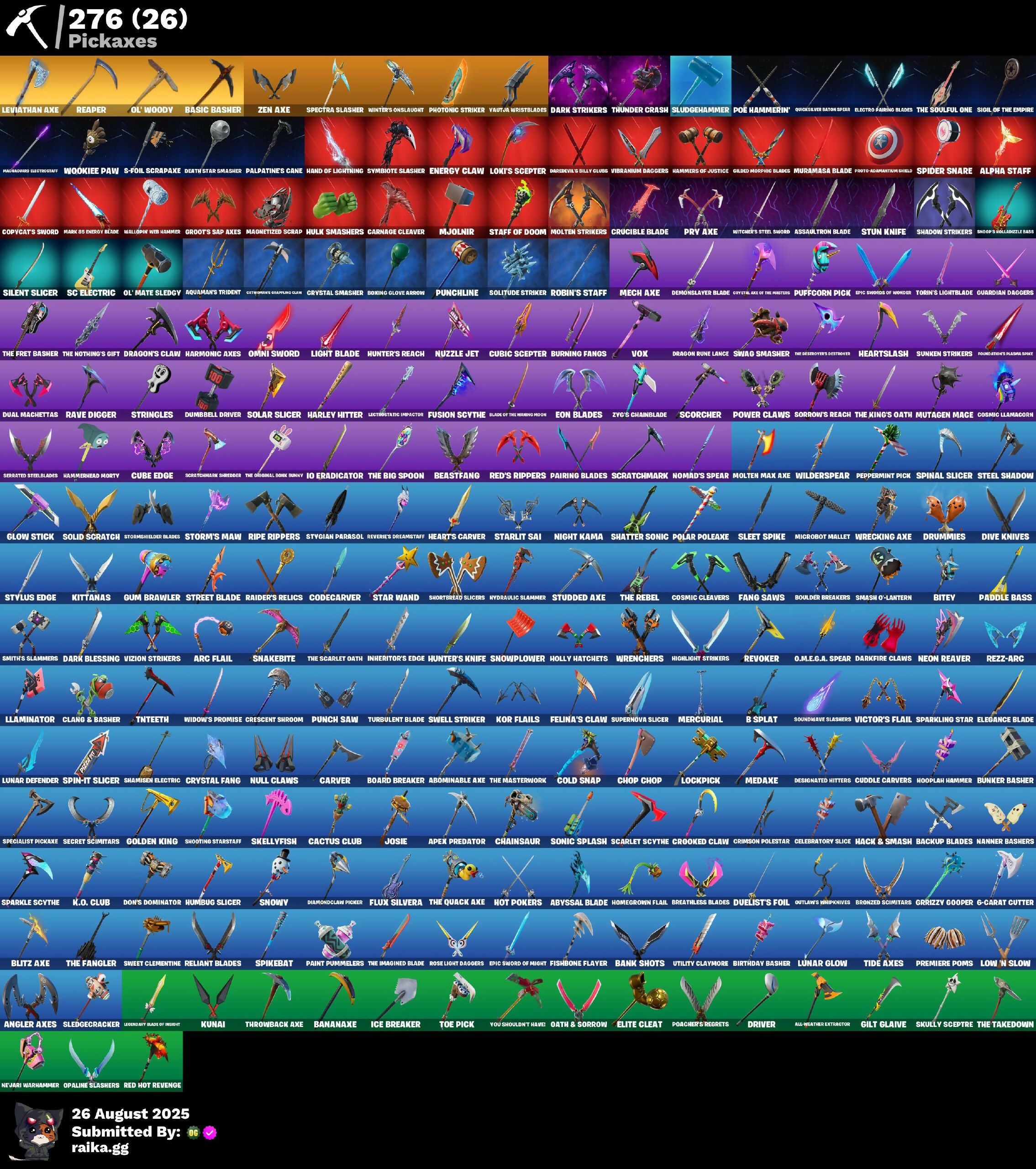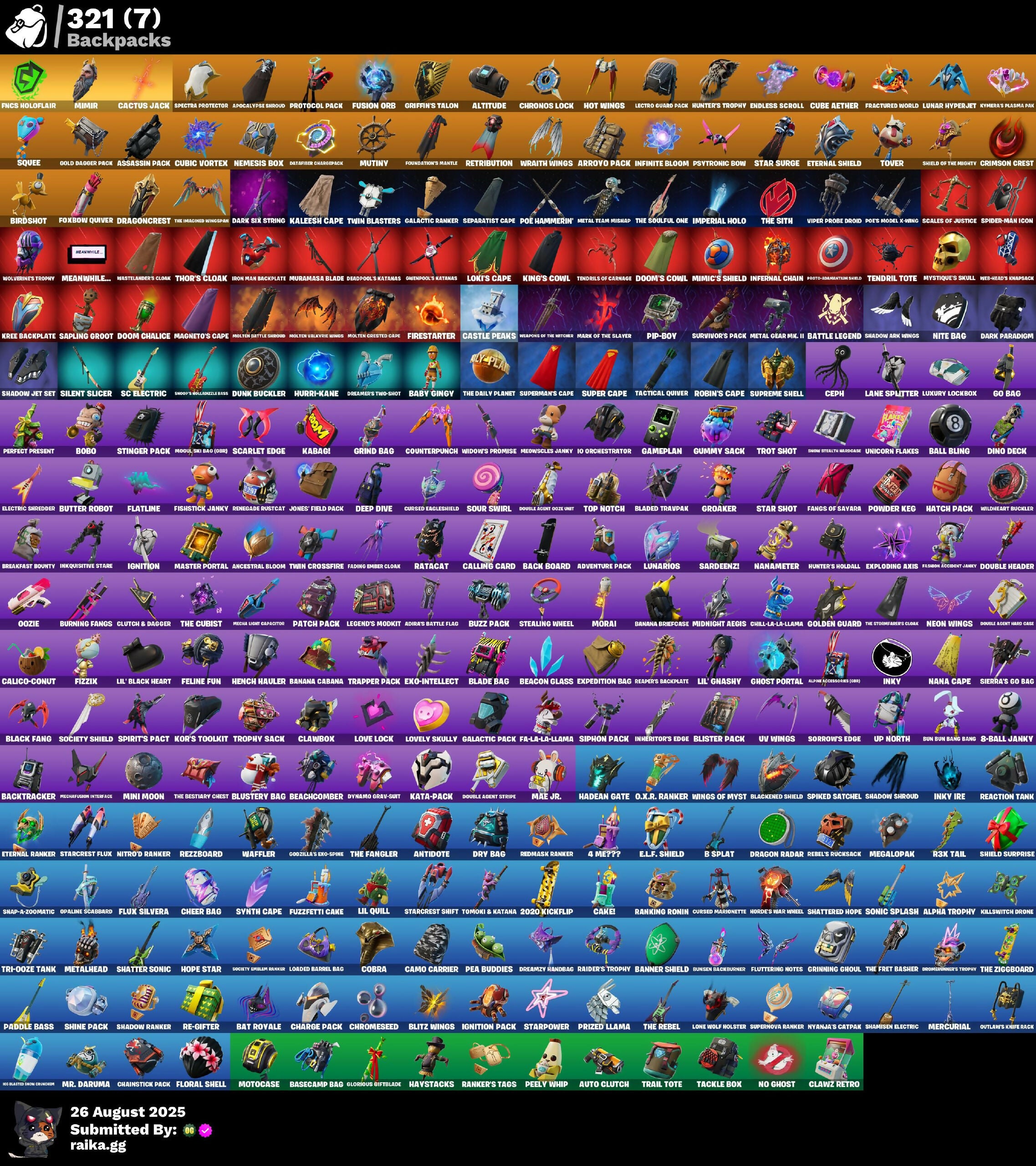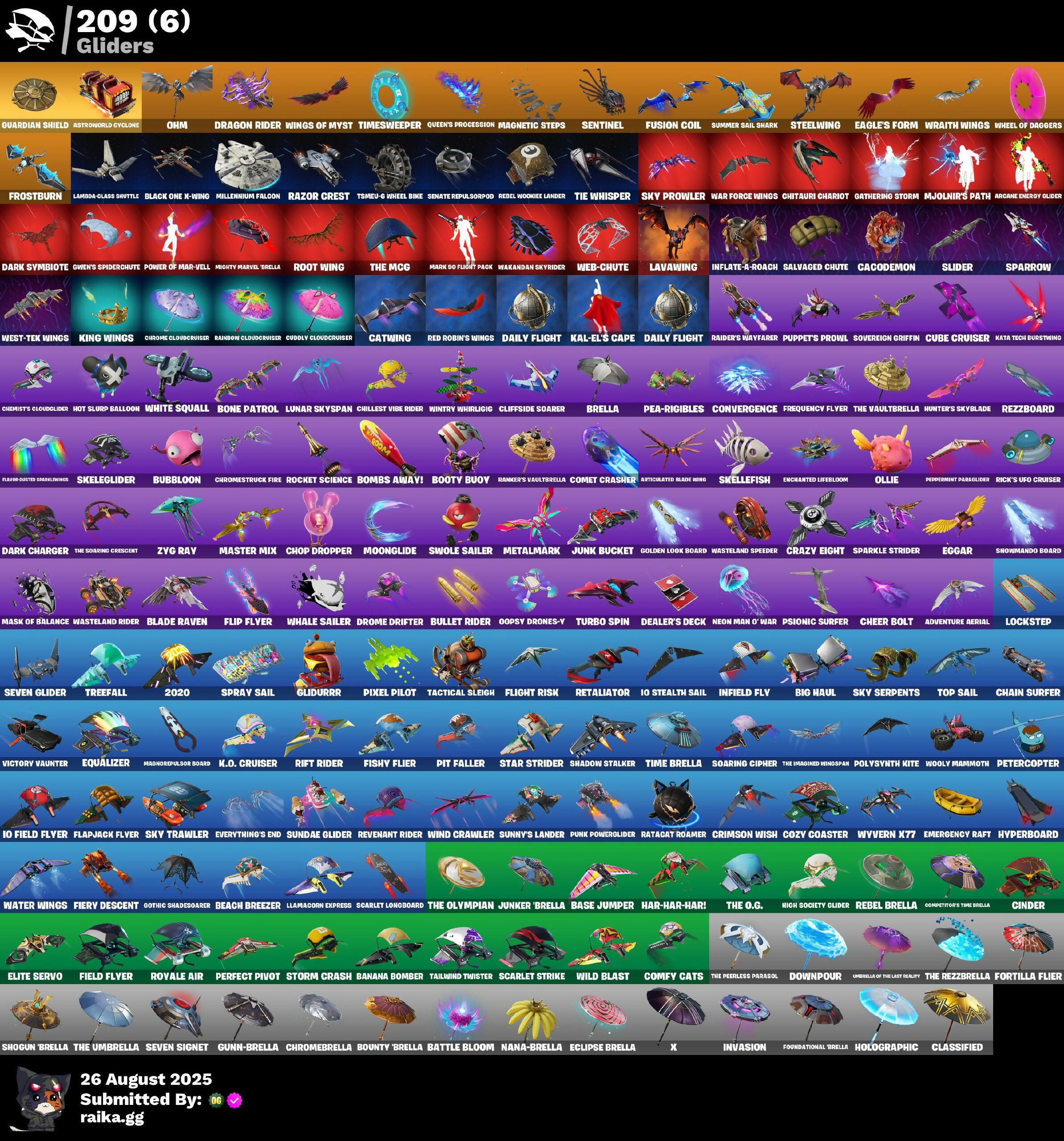 10 Field Flyer, 10 Orchestrator, 10 Stealth Sail, 2.0's Revenge, 2020, 2020 Kickflip, 4 Me???, 8-Ball, 8-Ball Janky, 8-Ball Vs Scratch, A Warrior Prepares, Abbsenz, Abominable Axe, Abyssal Blade, Acolyte's Curse, Adira, Adira's Armor, Adira's Battle Flag, Adventure Aerial, Adventure Pack, Aerial Classic, Aftermath, Afterparty, Agent Colorado, Agent Jones, Agent Peely, Ahsoka Tano, Air Shredder, All-Weather Extractor, Alli, Alpha Staff, Alpha Trophy, Alpine Ace (GBR), Altitude, Ancestral Bloom, Angler Axes, Antidote, Antonia, Anvil Accessories (08R), Apex Predator, Apocalypse Shroud, Apprentice Evie, Aquaman, Aquaman's Trident, Arachnobatics, Arc Flail, Arcane Energy Glider, Arcane Research, Arcane Steel, Arctic Adeline, Arctic Camo, Arroyo Pack, Articulated Blade Wing, Assassin Pack, Assassin's Mark, Assaultron Blade, Astroworld Cyclone, Aura, Auto Clutch, B Splat, Baby Gingy, Back Board, Backtracker, Backup Blades, Balance Board, Ball Bling, Banana Bomber, Banana Briefcase, Banana Cabana, Bananaxe, Bank Shots, Banner Shield, Baron's Hoard, Base Jumper, Basecamp Bag, Basic Basher, Bat Royale, Battle Bloom, Battle Legend, Beach Breezer, Beachcomber, Beacon Glass, Beamers, Beastfang, Beatzbunny, Beep Beep, Big Fan, Big Haul, Billy Bounce, Birdarang Flourish, Birdshot, Birthday Basher, Bitey, Black Fang, Black Leader, Black One X-Wing, Black Panther, Blackened Shield, Blackheart, Blade Bag, Blade Raven, Blade of the Morning Moon, Bladed Trappak, Blasted, Blaze, Blister Pack, Blitz Axe, Blitz Wings, Blowin' Up, Blowing Bubbles, Blustery Bag, Board Breaker, Bobo, Boing!, Bombs Away!, Bone Patrol, Boogeyman, Boogie Down, Boomin', Boots N' Cats, Booty Buoy, Boulder Breakers, Bounty 'Brella, Boxing Glove Arrow, Brainiac, Breakfast Bounty, Breakneck, Breathless Blades, Brella, Brite Bomber, Brite Moves, Brite Raider, Bronzed Scimitars, Bubbloon, Buckets, Bullet Rider, Bullseye, Bun Bun Bang Bang, Bunker Basher, Bunker Jonesy, Burning Fangs, Burnoff, Bushie Bright, Butter Robot, Buttoned Up, Buzz Pack, Buzzer Beater, Bytes, Cacodemon, Cactus Club, Cactus Jack, Cake!, Cakev, Calico, Calico Holiday, Calico-Conut, Call Me, Calling Card, Cameo, Cameo Vs Chic, Camo Carrier, Captain America, Captain Marvel, Carbon Scarlet, Cardistry, Carnage, Carnage Cleaver, Carver, Castle Peaks, Cat Flip, Cat's Paw, Catalyst, Cattitude, Catwing, Celebratory Slice, Ceph, Cerberus Bite, Chain Surfer, Chainsaur, Chainstick Pack, Chaos Directive, Chaos Double Agent, Chaos Origins, Charge Pack, Charlotte, Cheer Bag, Cheer Bolt, Chemist's Cloudglider, Chic, Chicken Wing It, Chili-La-La-Llama, Chillest Vibe Rider, Chitauri Chariot, Choice Knit, Chop Chop, Chop Dropper, Chrome Cloudcruiser, Chrome Marked, Chrome Punk, Chromebrella, Chromeseed, Chromestruck Fire, Chronos Lock, Cinder, Clang & Basher, Clark Kent, Classic Age, Classified, Clawbox, Clawz Retro, Clean Groove, Clean Sweep, Cliffside Soarer, Cloudburst, Cluck, Cluck Strut, Clucking Mad, Clutch & Dagger, Cobra, Codecarver, Codename E.L.F., Coin Flip, Cold Snap, Comet Crasher, Comfy Cats, Competitor's Time Brella, Conga, Contour Camo, Controlled Focus, Convergence, Copycat's Sword, Coral Crush, Corrosive Stripe, Cosmic Cleavers, Cosmic Llamacorn, Counterpunch, Cozy Coaster, Crabby, Crack It, Crackshot, Crazy Eight, Crescent Shroom, Crimson Crest, Crimson Polestar, Crimson Wish, Crooked Claw, Crucible Blade, Crustina, Crystal Axe of the Pastures, Crystal Fang, Crystal Smasher, Cube Aether, Cube Assassin, Cube Cruiser, Cube Edge, Cubed, Cubic Scepter, Cubic Vortex, Cuddle Carvers, Cuddle Mech, Cuddly Cloudcruiser, Curling Iron, Cursed, Cursed Eagleshield, Cursed Marionette, Cutthroat's Grappling Claw, Cyclo Curl, D'Ark, Dabstand, Dagger Dance, Dahlia, Daily Flight, Daisies, Dalgona Destroyer, Danger Zone, Daredevil's Billy Clubs, Dark Blessing, Dark Charger, Dark Paradigm, Dark Power Chord, Dark Six String, Dark Strikers, Dark Symbiote, Darkfire Claws, Darth Shader, Darth Vader, Databifur Chairpack, Ddakji Defender, Deadpool, Deadpool's Katanas, Dealer's Deck, Death Star Smasher, Deep Dab, Deep Dive, Deep End, Deep Future, Deimos, Demi, Demonslayer Blade, Denim Destiny, Designated Hitters, Destroyer Signature, Diamond Diva, Diamondclaw Picker, Dice Roll, Dimensional Camo, Dino Deck, Dirtbike Challenge, Disassemble, Dive Knives, Do The Split, Doctor Doom, Doctor Slone, Don's Dominator, Don't Stare Now, Doom Chalice, Doom Slayer, Doom's Cowl, Doomed Echo, Doomrenewers Trophy, Double Agent Hard Case, Double Agent Hush, Double Agent Ooze Unit, Double Agent Stripe, Double Agent Wildcard, Double Header, Doublecross, Downpour, Doze Dab, Dragon Radar, Dragon Rider, Dragon Rune Lance, Dragon Scales, Dragon Stance, Dragon's Claw, Dragoncrest, Dreamer's Two-Shot, Dreamzy Handbag, Drift Shift, Driftwood, Driver, Drome Drifter, Droop, Drummies, Dry Bag, Dual Machettas, Duelist's Foil, Dumbbell Driver, Dunk Buckler, Dunk On 'Em, Durrr Burger, Dusk Knight, Dusty, Dynamo, Dynamo Grav-Suit, E.L.F. Shield, EQ, Eagle's Form, Eclipse Brella, Eggar, Electric Shredder, Electro Shuffle, Elegance Blade, Elite Cleat, Elite Servo, Ember, Emergency Raft, Emote Camo, Emperor Palpatine, Emperor's Might, Enchanted Lifebloom, Endless Scroll, Energy Claw, Ensnared, Eon Blades, Epic Shades of Wonder, Epic Sword of Night, Equalizer, Era, Erisa, Erisa's Crest, Eternal Knight, Eternal Ranker, Eternal Shield, Eternal Voyager, Evasive Maneuvers, Everything's End, Evie, Exo-Intellect, Expedition Bag, Exploding Axis, Fa-La-La-Llama, Fabio Sparklemane, Fade, Fading Ember Cloak, Falling Leaf, Fang Saws, Fangs of Savara, Fashion Accident Janky, Featherweight, Feel The Force, Felina's Claw, Feline Fun, Feral Finisher, Ferocious, Festive Paper, Field Flyer, Fiery Descent, Final Eclipse, Final Harbinger, Fire Show, Firestarter, Fish Thicc, Fishbone Flayer, Fishin', Fishstick Janky, Fishy Flier, Fist Bump, Fizzix, Flaky Feast, Flapjack Flyer, Flare-Dusted Sparkwings, Flatline, Flight Risk, Flip Flyer, Flippin' Away,