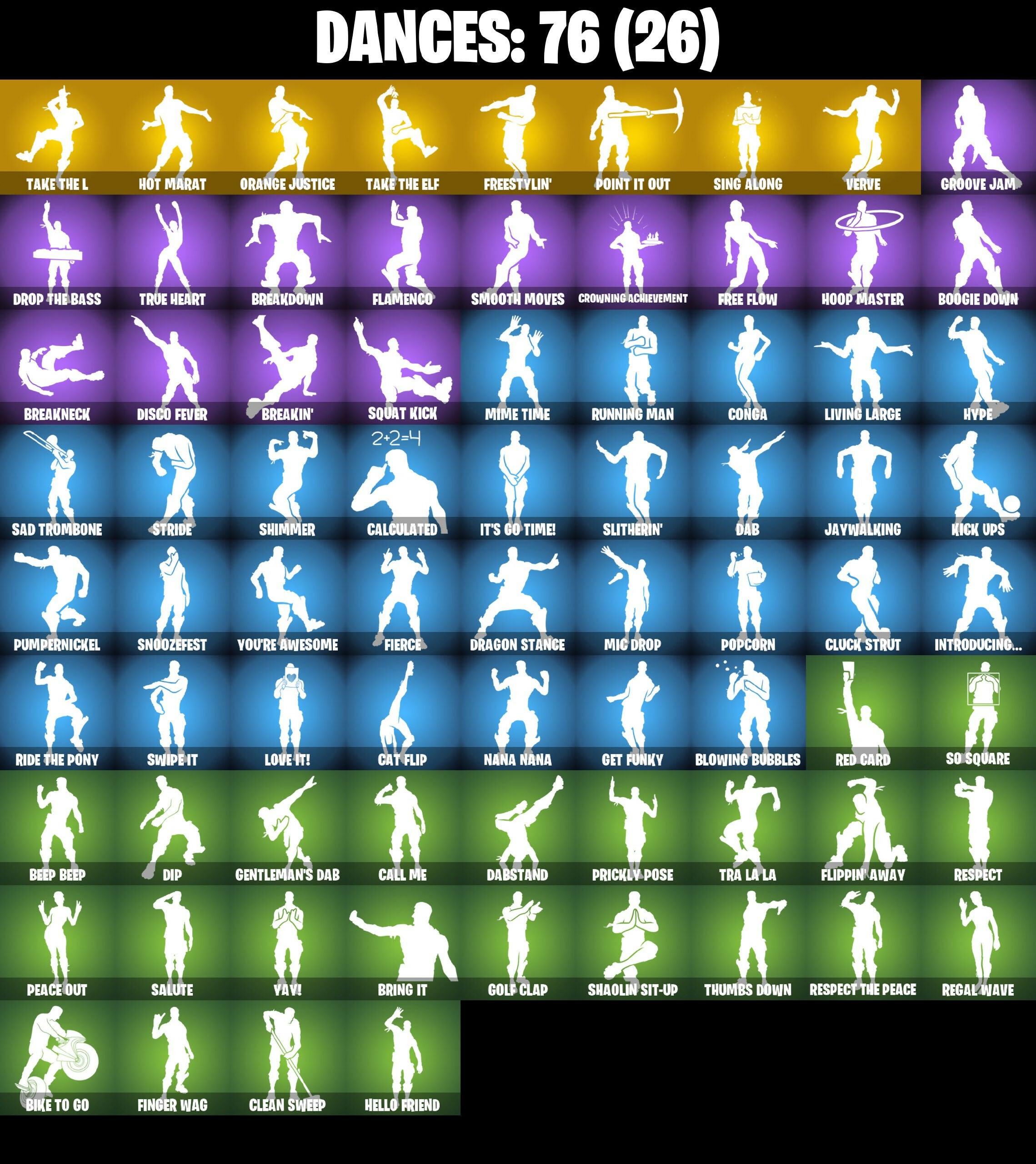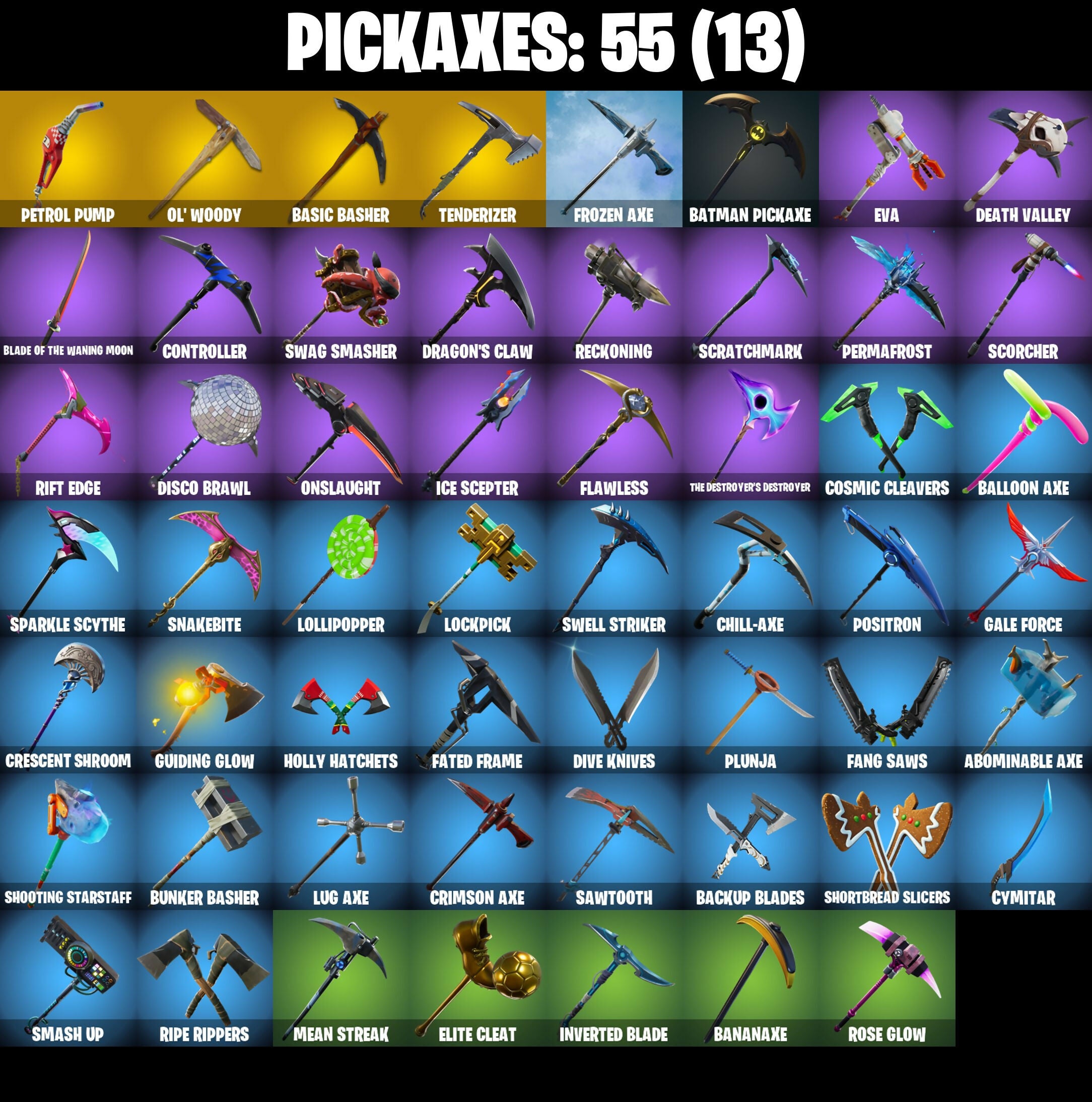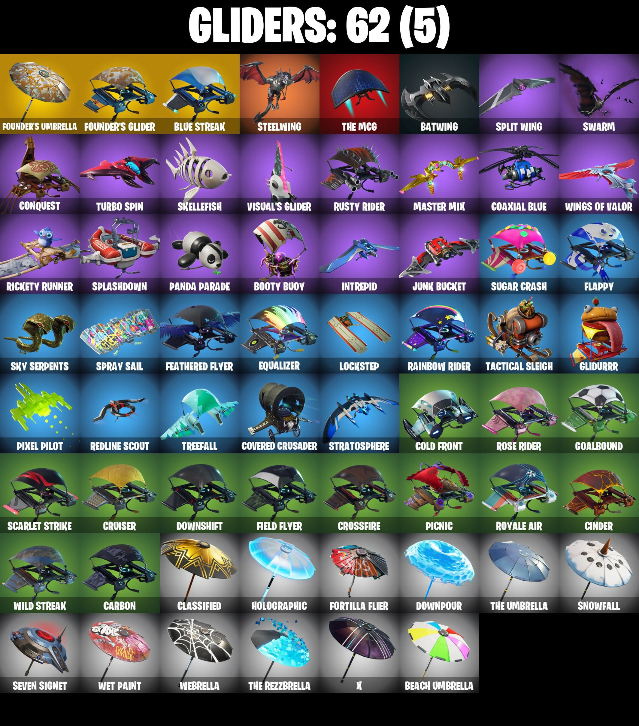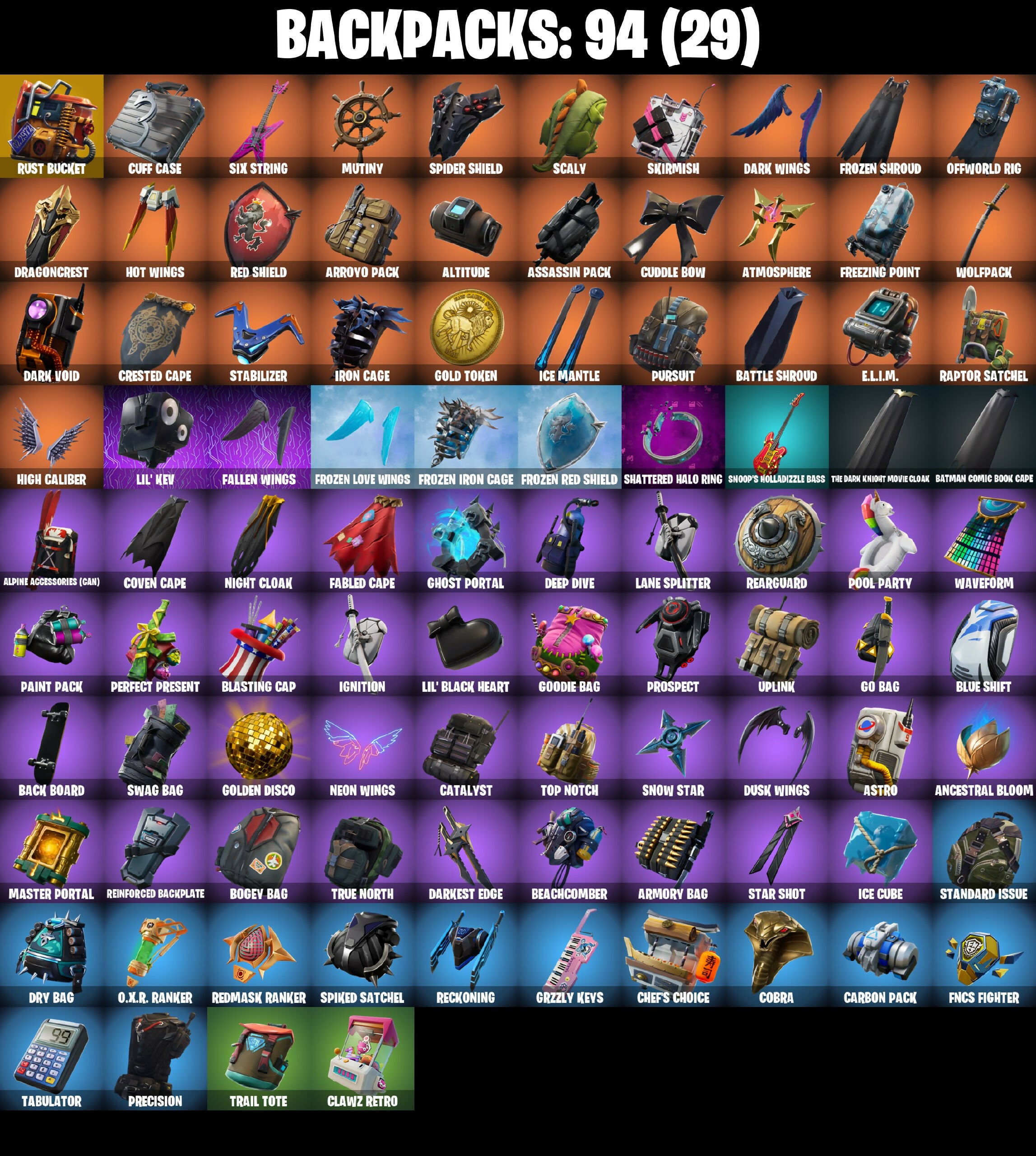 A.I.M., Abominable Axe, Absolute Zero, Alpine Accessories (Can), Alpine Ace (CAN), Altitude, Ancestral Bloom, Arctic Assassin, Armory Bag, Arroyo Pack, Assassin Pack, Astro, Atmosphere, Back Board, Backup Blades, Balloon Axe, Bananaxe, Bandolier, Basic Basher, Batman Comic Book Cape, Batman Comic Book Outfit, Batman Pickaxe, Battle Bus Balloon, Battle Hound, Battle Shroud, Battlehawk, Batwing, Beach Umbrella, Beachcomber, Beep Beep, Bike To Go, Black Werewolf, Blackheart, Blade Of The Waning Moon, Blasting Cap, Blowing Bubbles, Blue Shift, Blue Streak, Blue Striker, Blue Team Leader, Bob Cut, Bogey Bag, Boogie Down, Booty Buoy, Breakdown, Breakin', Breakneck, Bring It, Brite Bomber, Bullseye, Bunker Basher, Bunker Jonesy, Calamity, Calculated, Call Me, Carbide, Carbon, Carbon Commando, Carbon Pack, Cat Flip, Catalyst, Chef's Choice, Chill-Axe, Cinder, Circuit Breaker, Classified, Clawz Retro, Clean Sweep, Cloaked Star, Cluck Strut, Coaxial Blue, Cobalt, Cobra, Cold Front, Commando, Conga, Conquest, Controller, Cosmic Cleavers, Coven Cape, Covered Crusader, Crescent Shroom, Crested Cape, Crimson Axe, Criterion, Crossfire, Crowned, Crowning Achievement, Cruiser, Cuddle Bow, Cuddle Team Leader, Cuff Case, Cymitar, DJ Yonder, Dab, Dabstand, Dark Vanguard, Dark Void, Dark Wings, Darkest Edge, Death Valley, Deep Dive, Diecast, Dip, Dire, Disco Brawl, Disco Fever, Dive Knives, Downpour, Downshift, Dragon Stance, Dragon's Claw, Dragoncrest, Drift, Drop The Bass, Dry Bag, Dusk, Dusk Wings, E.L.I.M., Elite Cleat, Ember, Equalizer, Eternal Voyager, Eva, FNCS Fighter, Fable, Fabled Cape, Fallen Love Ranger, Fallen Wings, Fang Saws, Fated Frame, Feathered Flyer, Field Flyer, Fierce, Finger Wag, Fireworks Team Leader, Fixer, Flamenco, Flappy, Flawless, Flippin' Away, Fortilla Flier, Founder's Glider, Founder's Umbrella, Free Flow, Freestylin', Freezing Point, Frostbite, Frozen Axe, Frozen Iron Cage, Frozen Love Ranger, Frozen Love Wings, Frozen Raven, Frozen Red Knight, Frozen Red Shield, Frozen Shroud, Funk Ops, Gale Force, Gentleman's Dab, Get Funky, Ghost Portal, Giddy-Up, Glidurrr, Go Bag, Goalbound, Gold, Gold Token, Golden Disco, Golf Clap, Goodie Bag, Grizzly Keys, Groove Jam, Guiding Glow, Hello Friend, High Caliber, Holly Hatchets, Holographic, Hoodie, Hoop Master, Hot Marat, Hot Wings, Huntress, Hybrid, Hype, Ice Cube, Ice Mantle, Ice Scepter, Ignition, Intrepid, Introducing..., Inverted Blade, Iron Cage, It's Go Time!, Jaywalking, John Wick, Jungle Scout, Junk Bucket, Kick Ups, Lane Splitter, Lil' Black Heart, Lil' Kev, Living Large, Lockpick, Lockstep, Lollipopper, Love It!, Lug Axe, Luxe, Lynx, Mask, Master Key, Master Mix, Master Portal, Mean Streak, Mic Drop, Midfield Maestro, Midnight Ops, Mime Time, Mission Specialist, Moonwalker, Munitions Expert, Mutiny, Nana Nana, Neon Wings, Night Cloak, Nightshade, Nitelite, Nog Ops, O.X.R. Ranker, Offworld Rig, Ol' Woody, Omega, Omen, Onesie, Onslaught, Orange Justice, Overtaker, Paint Pack, Panda Parade, Peace Out, Peely, Perfect Present, Permafrost, Petrol Pump, Picnic, Pixel Pilot, Plunja, Point It Out, Pool Party, Popcorn, Positron, Powder, Power Chord, Precision, Prickly Pose, Prodigy, Prospect, Pumpernickel, Pursuit, Ragnarok, Rainbow Rider, Raptor, Raptor Satchel, Ravage, Raven, Rearguard, Reckoning, Red Card, Red Knight, Red Shield, Red-Nosed Raider, Redline, Redline Scout, Redmask Ranker, Regal Wave, Reinforced Backplate, Renegade, Respect, Respect The Peace, Rex, Rickety Runner, Ride The Pony, Rift Edge, Ripe Rippers, Rogue Agent, Rook, Rose Glow, Rose Rider, Rose Team Leader, Rox, Royale Air, Running Man, Rust Bucket, Rust Lord, Rusty Rider, Sad Trombone, Salute, Sanctum, Sash Sergeant, Sawtooth, Scaly, Scarlet Strike, Scavenger, Scorcher, Scorpion, Scratchmark, Sentinel, Seven Signet, Sgt. Winter, Shadow Ops, Shaolin Sit-Up, Shattered Halo Ring, Shimmer, Shooting Starstaff, Shortbread Slicers, Sidewinder, Sing Along, Six String, Skellefish, Skirmish, Skull Trooper, Sky Serpents, Sledgehammer, Slitherin', Smash Up, Smooth Moves, Snakebite, Snoop's Wolladazzle Bass, Snoozefest, Snorkel Ops, Snow Star, Snowfall, Snowfoot, So Square, Sparkle Scythe, Sparkle Supreme, Spider Knight, Spider Shield, Spiked Satchel, Splashdown, Split Wing, Spray Sail, Squad Leader, Squat Kick, Stabilizer, Stage 4, Stage 4 - No Ponytail, Stage 5, Stage 6 - No Shoulder Pad, Stage 8, Standard Issue, Star Shot, Steelwing, Stratosphere, Stride, Sugar Crash, Sultura, Summit Striker, Sun Strider, Super Striker, Sushi Master, Swag Bag, Swag Smasher, Swarm, Swell Striker, Swipe It, Tabulator, Tactical Sleigh, Take The Elf, Take The L, Teknique, Tenderizer, The Ace, The Dark Knight Movie Cloak, The Dark Knight Movie Outfit, The Destroyer's Destroyer, The Ice King, The Mcg, The Rezzbrella, The Umbrella, The Visitor, Thumbs Down, Tilted Teknique, Top Notch, Tra La La, Trail Tote, Trailblazer, Treefall, Trog, True Heart, True North, Turbo Spin, Ultima Knight, Uplink, Valor, Vega, Verge, Verve, Visual's Glider, Warpaint, Wavebreaker, Waveform, Webrella, Wet Paint, Whiplash, White, Whiteout, Wild Card, Wild Streak, Wingman, Wings Of Valor, Wolfpack, X, X-Lord, Yay!, Yond3r, You're Awesome, Zenith, Zoey