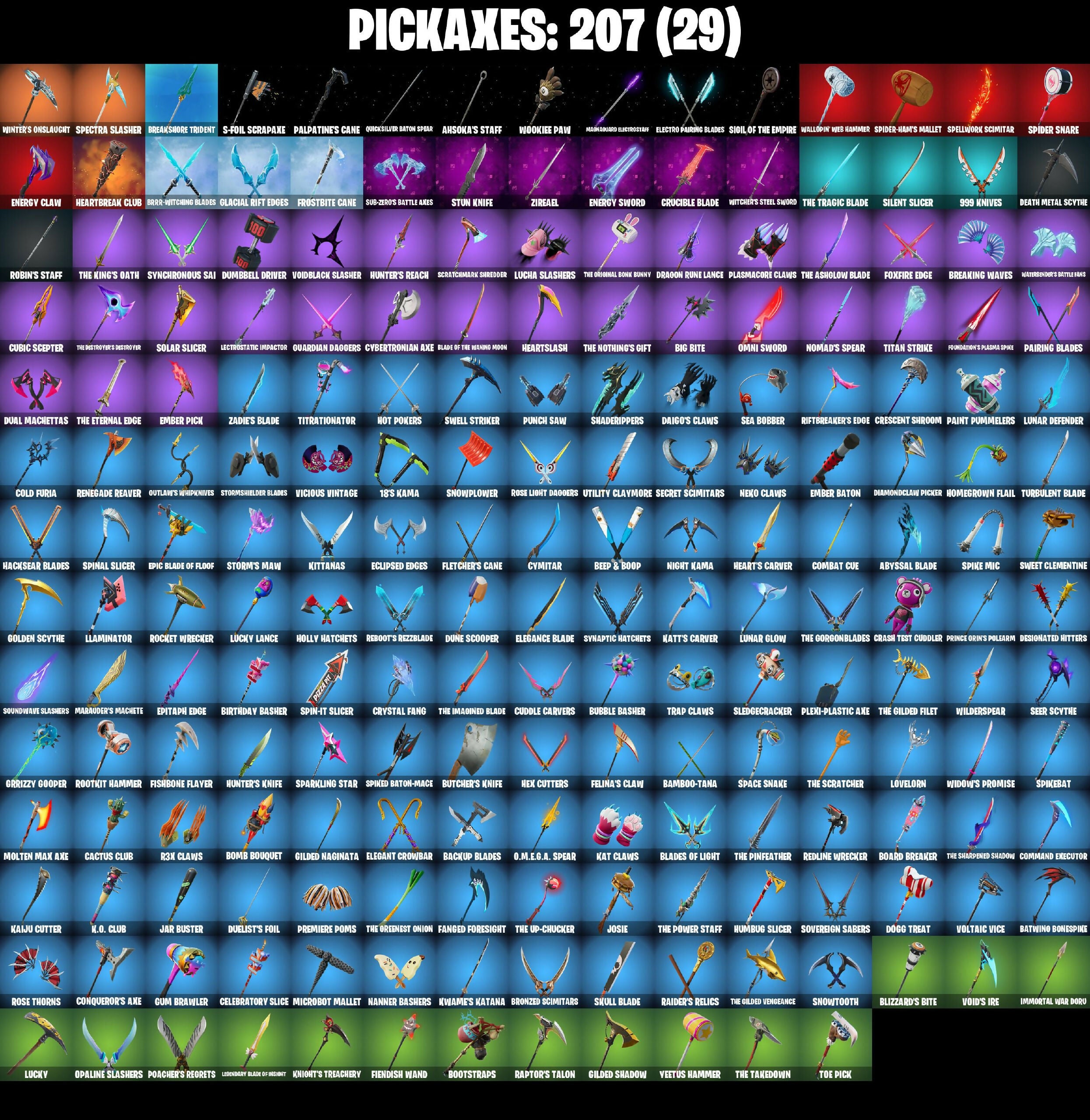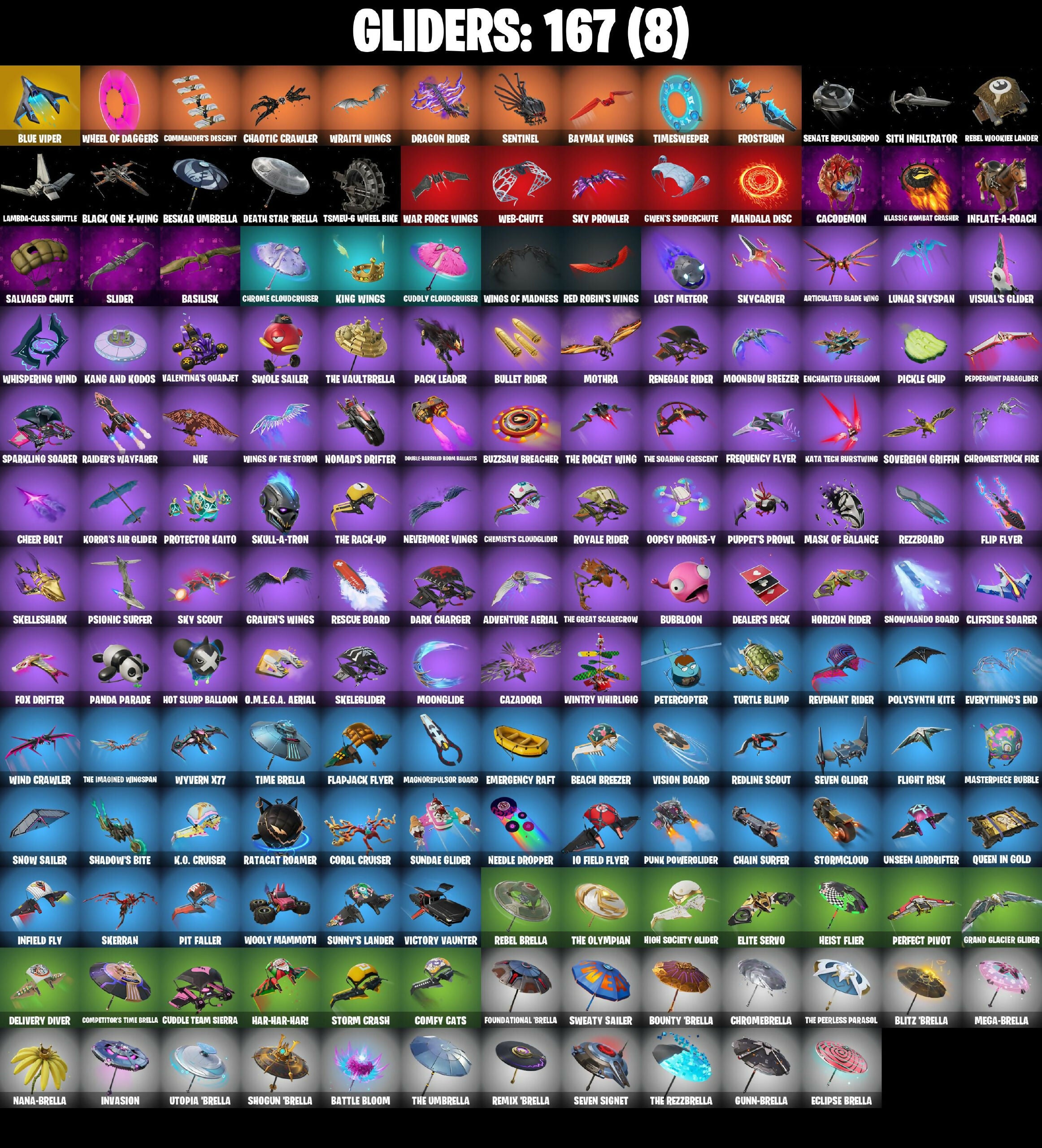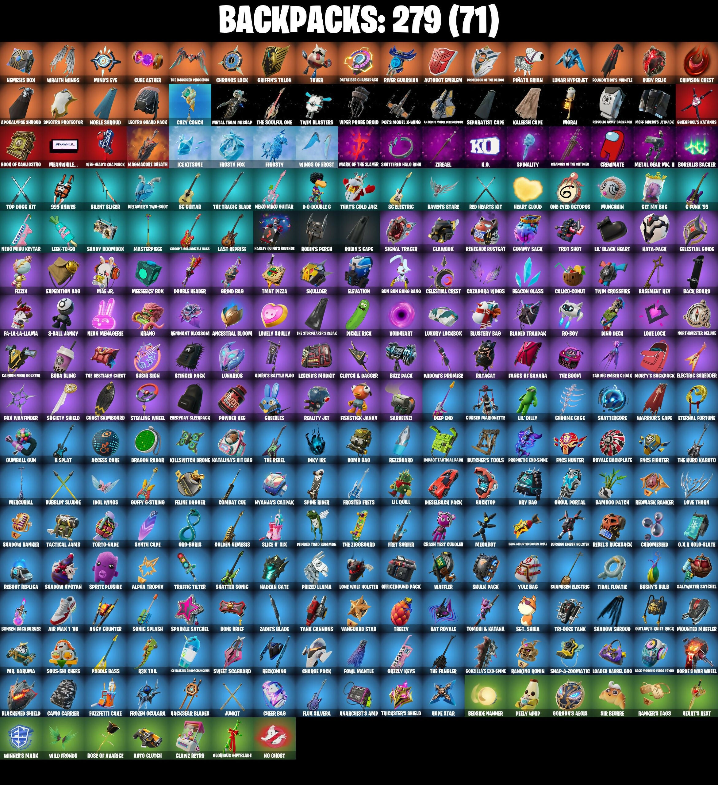 1-Ball, 10 Field Flyer, 18's Kama, 2D, 8-Ball Janky, 999 Knives, AFK, Absenz, Abyssal Blade, Access Core, Adira, Adira's Battle Flag, Adventure Aerial, Aerial Assault Bomber, Agent Patch, Ahsoka Tano, Ahsoka's Staff, Air Max 1 '86, Alpha Trophy, Anarchist's Amp, Ancestral Bloom, Andy Fangerson, Angry Counter, Antonia, Aphrodite, Apocalypse Shroud, Apprentice Evie, Arachnobatics, Arctic Adeline, Ares, Arkan's Model Interceptor, Articulated Blade Wing, Ascension Nezumi, Astrea, Astro Armor, Augury, Aurelian, Auto Clutch, Autobot Emblem, Avla Winn, Aw, Shucks., B Splat, B.R.U.T.E. Gunner, Back Board, Back Up Blades, Back-Mounted Bombs Away, Back-Mounted Turbo Tower, Balance Board, Bamboo Patch, Bamboo-Tana, Baron's Hoard, Basement Key, Basilisk, Bat Royale, Battle Blessing, Battle Bloom, Battle-Tested, Batwing Bonespike, Baymax Wings, Beach Breezer, Beacon Glass, Beatzbunny, Bedside Nanner, Beep & Boop, Bernie, Beskar Umbrella, Bi-Ran, Big Bite, Big Dawgs, Big Dill, Big Fan, Bike to Go, Birdarang Flourish, Birthday Basher, Black One X-Wing, Blackened Shield, Blade Of The Waning Moon, Bladed Travpak, Blades Of Light, Blazing Fire Cerberus, Blitz 'Brella, Blizzard's Bite, Blowin' Up, Blue Viper, Blustery Bag, Board Breaker, Boba Bling, Boba Snack, Bomb Bag, Bomb Bouquet, Bone Breaker, Bone Brief, Bones, Boogie Down, Book of Cagolistro, Bootstraps, Borealis Backer, Bounty 'Brella, Bow Go, Breaking Waves, Breakshore Trident, Brit Hatsune Miku, Bronzed Scimitars, Brrr-Witching Blades, Bubble Basher, Bubblegum Wade, Bubblin' Sludge, Bubloon, Bullet Rider, Bullpen Brawler Dusty, Bun Bun Bano Bano, Bunsen Backburner, Burning Animation Valeria, Burning Ember, Burning Ember Holster, Burnoff, Bushy's Bulb, Butcher's Knife, Butcher's Tools, Buzz Beat, Buzz Pack, Buzzsaw Breacher, Bytes, Cacodemon, Cactus Club, Calico-Conut, Called Shot, Cammy, Camo Carrier, Captain Phasma, Carbon Fiber Holster, Card Drop, Cassidy Quinn, Cauldron Chill, Cazadora, Cazadora Wings, Celebratory Slice, Celestial Crest, Celestial Guide, Cerberus, Chain Surfer, Chalked Up 1-Ball, Chaos Director, Chaotic Crawler, Charge Pack, Cheer Bag, Cheer Bolt, Chef's Special, Chemist's Cloudglider, Chicken Wing It, Choice Knit, Chrome Cage, Chrome Cloudcruiser, Chrome Punx, Chromebrella, Chromeseed, Chromestruck Fire, Chronos Lock, Ciri, Clawbox, Clawz Retro, Clean Sweep, Cliffside Soarer, Clone Trooper, Cloud Striker, Cloudy Team Specialist, Club President Relik, Clutch & Dagger, Cold Furia, Collector Kado Thorne, Combat Cue, Combat Elite, Combat Tech Jules, Comfy Cats, Command Executor, Commander's Descent, Competitor's Time Brella, Conch Call, Conjure Weapon, Conqueror's Axe, Conqueror's Claim, Coral Cruiser, Cosmic Legacy, Count It!, Cozy Conch, Crack It, Crash Test Cuddler, Crescent Shroom, Crewmate, Crimson Crest, Crucible Blade, Crystal Fang, Cube Aether, Cubic Scepter, Cuddle Carvers, Cuddle Team Sierra, Cuddly Cloudcruiser, Curling Iron, Cursed Marionette, Cybertronian Axe, Cyclo Curl, Cymitar, D-O-Double G, Dagger Dance, Daigo, Daigo's Claws, Dancefloor Diva, Danica, Dark Charger, Dark Doggo, Dark Side, Darth Vader, Datafiber Charged Pack, Dawn August Nisha, Dealer's Deck, Death Metal Scythe, Death Star 'Brella, Deep End, Delivery Diver, Demon Hunter Hope, Designated Hitters, Diamond Throne, Diamondclaw Picker, Dice Roll, Die With a Smile, Die With a Smile Bruno, Dieselback Pack, Dillinger the Greek, Dino Deck, Dino Megazord, Dirtbike Challenge, Distraction Dance, Diva Fever, Do the Split, Doctor Strange, Dogg Treat, Doom Slayer, Double Header, Double-Barreled Boom Ballasts, Doze Dab, Dragon Radar, Dragon Rider, Dragon Rune Lance, Dramatic Flares, Dreamer's Two-Shot, Dry Bag, Dual Machettas, Duelist's Card Trick, Duelist's Foil, Dumbbell Driver, Dune Scooper, Durrr Taisho, Dusk Knight, Dusty, Dynamo TNTina, Dynamo TNTon-A, Eclipse Brella, Eclipsed Edges, Electric Shredder, Electro Pairing Blades, Elegance Blade, Elegant Crowbar, Elevation, Elite Servo, Ember Baton, Ember Pick, Emergency Raft, Emperor Palpatine, Empress Fan Dance, Enchanted Lifebloom, Energized Godzilla, Energy Claw, Energy Sword, Epic Blade Of Flood, Epitaph Edge, Era, Eren Jaeger, Erisa, Eternal Fortune, Everyday Sleepack, Everything's End, Evie, Expedition Bag, Explorer Emilie, Expressionism, FNCS Fighter, FNCS Hunter, Fa-La-La-Llama, Fading Ember Cloak, Fancy Peter Griffin, Fang Dance, Fanged Foresight, Fangs of Sayara, Fashion Banshee, Feel the Force, Felina, Felina's Claw, Feline Dagger, Fiendish Wand, Fish Thicc, Fishbone Flayer, Fishstick Janky, Fishtick, Fishy Flourish, Fist Bump, Fixer, Fizzix, Flaky Feast, Flapjack Flyer, Flashback Breakdown, Fletcher Kane, Fletcher's Cane, Flight Risk, Flip Flyer, Flux Silvera, Foil Flex, Follow the Butterfly, Force Lightning, Foundation's Mantle, Foundation's Plasma Spike, Foundational Brella, Fowl Mantle, Fox Drifter, Fox Wayfinder, Foxfire Edge, Frequency Flyer, Fret Surfer, Front Page Pose, Frost Broker, Frostbite Cane, Frostburn, Frosted Frets, Frosty, Frosty Fox, Frozen Ghost Stormtrooper, Frozen Oculara, Fundable Mr. Meeseeks, Fuzzfetti Cake, G-Funk '93, General Grievous, Geralt of Rivia, Get My Bag, Get Out of Your Mind, Get Schwifty, Ghost Skimboard, Ghoul Portal, Gilded Naginata, Gilded Reality, Gilded Shadow, Glacial Rift Edges, Glorious Giftblade, Godzilla Evolved, Godzilla's Exo-Spine, Golden Conqueror, Golden Nemesis, Golden Scythe, Good Game, Well Played, Good Guy, Good Sportsmanship, Gorgon's Aegis, Grand Glacier Glider, Graven's Wings, Greebles, Griffin's Talon, Grind Bag, Grizzly Keys, Grizzy Gooper, Grriz, Guardian Daggers, Guff Gringle, Guffy 6-String, Guile, Gum Brawler, Gumball Gun, Gumbo, Gummy Sack, Gunn-Brella, Gunnar, Gwen Stacy, Gwen's Spiderchute, Gwenpool's Katanas, Hacksear Blades, Hacksfear Blades, Hacktop, Hadean Gate, Har-Har-Har!, Harley Quinn's Revenge, Harlowe, Have a Seat, Haven, HaxSaur, Haylee Skye, Headpiece, Heart Chopper, Heart Cloud, Heart Sign, Heart's Carver, Heart's Rest, H