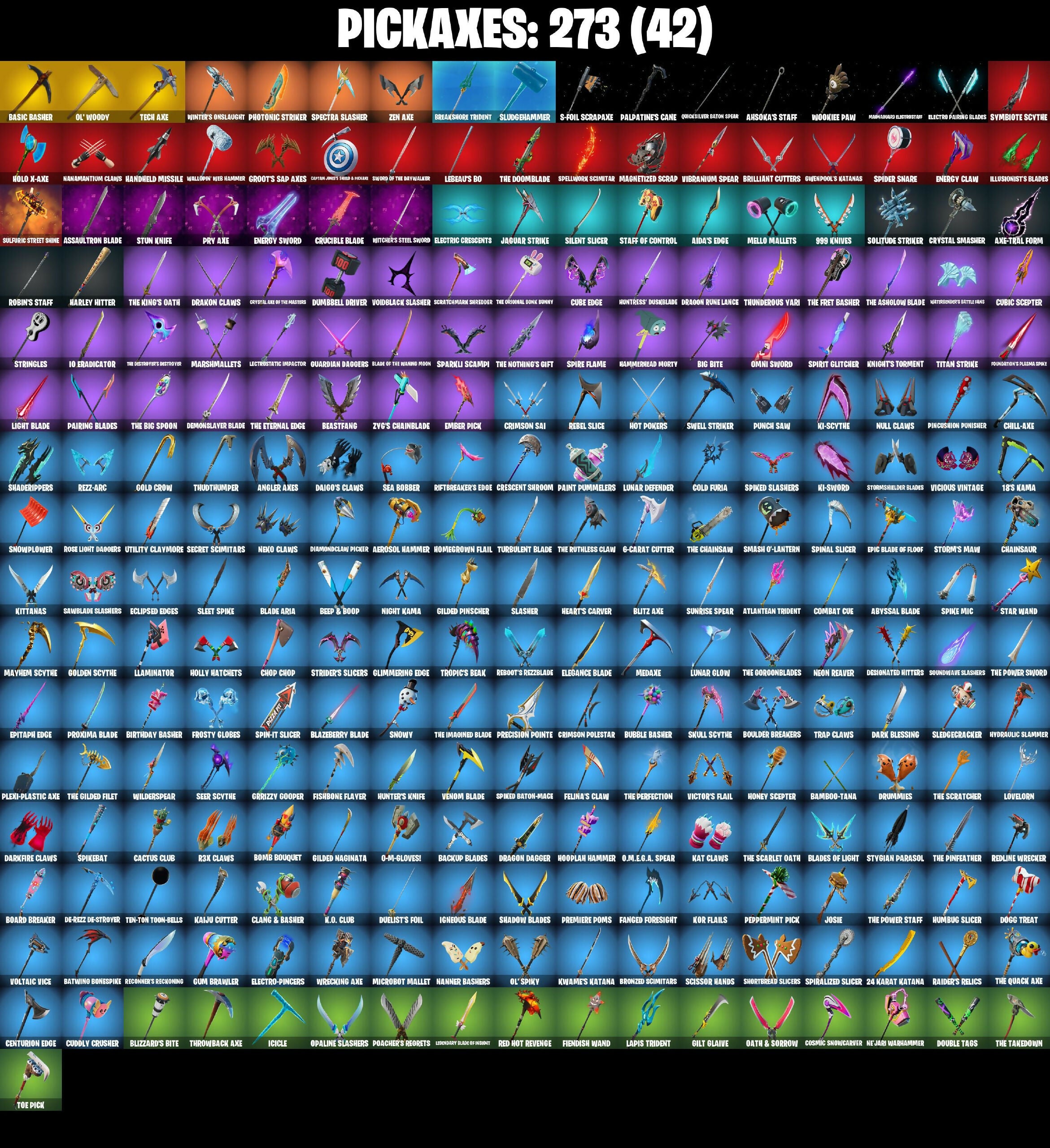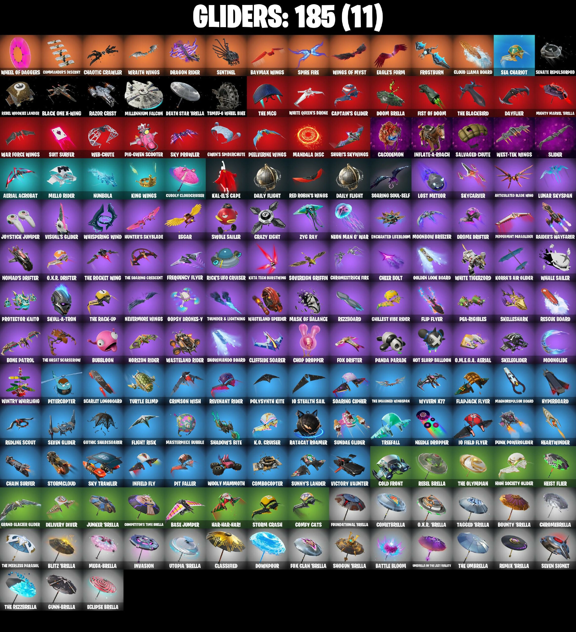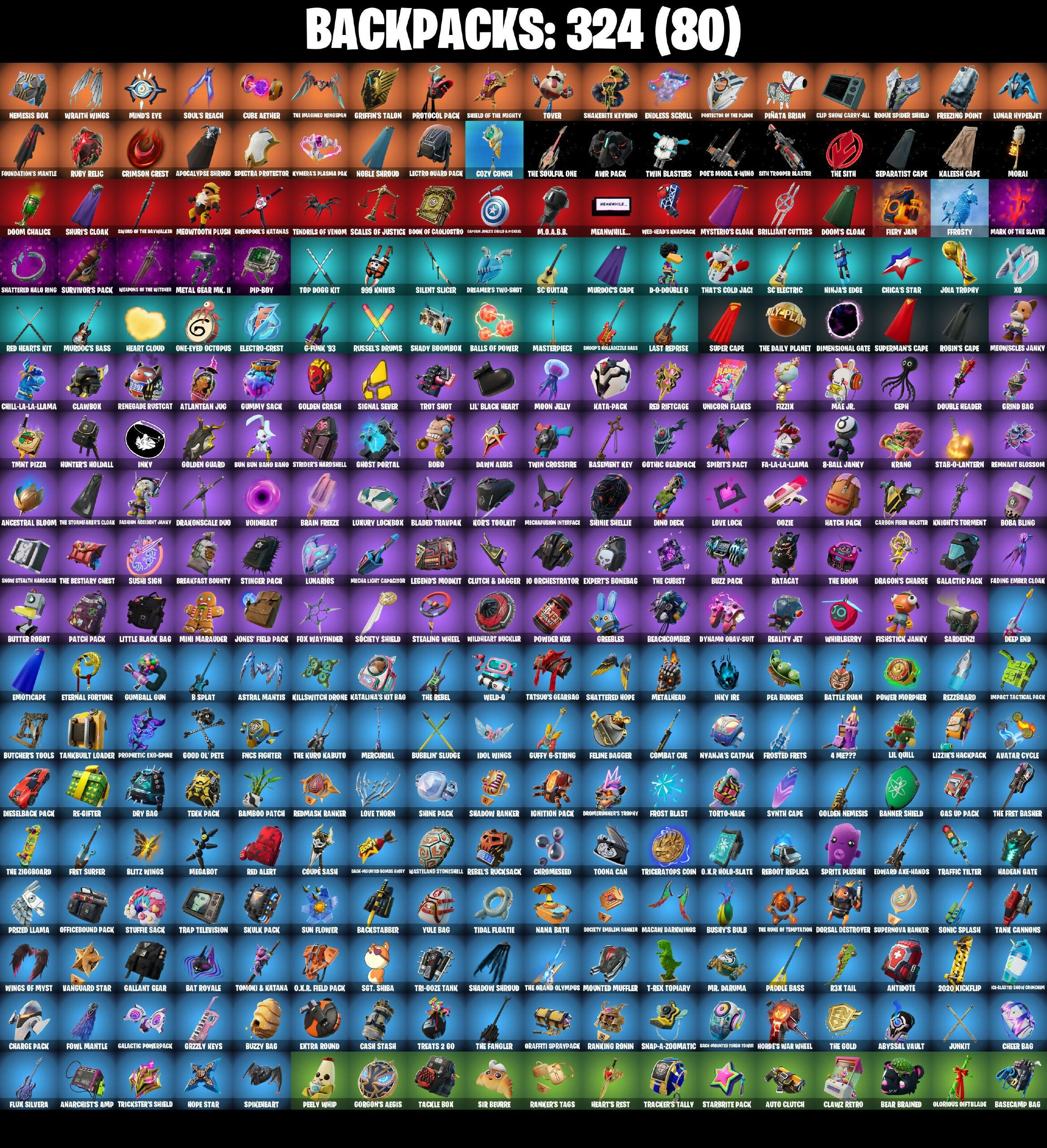 (Snikt!), 10 Field Flyer, 10 Stealth Sail, 18'S Kama, 2020 Kickflip, 24 Karat Katana, 3rd Battalion Trooper, 4 Me???, 501st Trooper, 6-Carat Cutter, 8-Ball Janky, 999 Knives, A Two In Skua, A Warrior Prepares, APT., ASMR Keys, AVIR Pack, AVL Shocks, Absenz, Abyssal Blade, Abyssal Vault, Acrobatics, Aerial Acrobat, Aerosol Hammer, Agent Jones, Agent Jones (Jump 31), Agent Patch, Ahsoka Tano, Ahsoka's Staff, Aida's Edge, Amazing Cube, Ambitious, Anarchists Amp, Ancestral Bloom, Andy Fancerson, Angler Axes, Antidote, Antonia, Aphrodite, Apocalypse Shroud, Apprentice Evie, Arcane Research, Arctic Adeline, Articulated Blade Wing, Ascension Nezumi, Ashwood Armor Insurance, Assaultron Blade, Astral Ace, Astral Mantis, Astrea, Astro Armor, Atlantean Jug, Atlantean Trident, Attraction, Augury, Aurelian, Aurum Goggles, Auto Clutch, Avatar Cycle, Avatar's Flourish, Avia Winn, Axe-Trail Form, Ayida, Azarath Metrion Zinthos, B Splat, BB Belt, Baby Lame, Back-Avenger Bomb Carry, Backstabber, Backup Blades, Bad Guy, Balance Board, Balanced, Ball Rap, Balls of Power, Bamboo Patch, Bamboo-Tana, Bang Loud Celebration, Banner Shield, Base Jumper, Basecamp Bag, Basement Key, Basic Basher, Bat Royale, Bat Signal, Battle Bloom, Battle Dame Mave, Battle Ryan, Batwinq Bonespike, Baymax Wings, Be Seeing You, Beachcomber, Bean Bag, Bear Brained, Bear Hug, Beast Blasting, Beastfang, Beatzbunny, Beep & Boop, Belly Bounce, Bernie, Big Bite, Big Spin, Bigchota Saison Karolo 6, Bike To Go, Billy, Billy's Tricycle, Bim Bam Boom, Bird Call, Birdarang Flourish, Birds Of A Feather, Birthday Basher, Black And White, Black One X-Wing, Black Panther (Surreal), Black Queen, Blade, Blade Aria, Blade of the Waning Moon, Bladed Trapvak, Blades of Light, Blah Blah Blah, Blazeberry Blade, Blitz 'Brella, Blitz Axe, Blitz Wings, Blizzard's Bite, Blooming Bouquet, Blown Up, Blue-Blood, Board Breaker, Board Flair, Boated, Boba Bling, Boba Snack, Bobo, Bomb Bouquet, Bonde Do Brunão, Bone Breaker, Bone Patrol, Boney Bounce, Boogie Down, Book of Cagliostro, Boomin, Boop Up Groove, Boots 'N' Cats, Booyah, Boulder Breakers, Bounce, Bounty 'Brella, Bow Go, Boys & Liar, Brain Freeze, Bratty, Breakfast Bounty, Breakin', Breaking Point, Breakshore Trident, Brilliant Cutters, Bring It Around, Brite Agent, Brokenhearted, Bronzed Scimitars, Bubble Basher, Bubblin' Sludge, Bubbloon, Build-Up, Bulletin Breaker Duty, Bulletproof, Bun Bun Bang Bang, Burning Autumn Rules, Burning Ember, Burst Base Scenario, Bushranger, Bushy's Bulb, Busta Move, Butcher's Tools, Butter Robot, Buzz Beat, Buzz Pack, Buzzy Bag, Bye Bye Bye, Bytes, Cacodemon, Cactus Club, Call Me, Called Shot, Camo Wear Machine, Canistry, Captain Clamerica, Captain Janet's Sword & Shield, Captain Jones, Captain Jones's Grab & Hideout, Captain Phasma, Captain's Glider, Carbon Fiber Holster, Card Drop, Carefree, Cargo, Cash Stash, Cauldron Chill, Ccum, Celebrate Me, Centurion, Centurion Edge, Ceph, Cerberus, Chain Surfer, Chainsaur, Chainsaw Dance, Chalked Up T-Ball, Challenge, Challenger Mirage - Furia, Chaos Director, Chaotic Crawler, Charge Pack, Charlotte, Cheer Bag, Cheer Bolt, Chef's Special, Chica, Chica's Star, Chicken Wing It, Childlike Things, Chill-Axe, Chill-La-La-Llama, Chillest Vibe Rider, Chimichanga!, Choice Knit, Chop Chop, Chop Dropper, Chrome Punk, Chromebrella, Chromeseed, Chromestruck Fire, Cil, Clang & Basher, Clara, Clark Kent, Classic Peelverine, Classified, Clawbox, Clawz Retro, Clean Sweep, Cleaning's Shanty, Click Click Flash, Cliffside Soarer, Clip Show Carry-All, Cloud Llama Board, Club President Jules, Cluck, Cluck (Slurpy), Clutch & Dagger, Cold Front, Cold Furia, Collector Kado Thorne, Combat Cue, Combat Elite, Combo, Combocopter, Cometbrella, Comfy Cats, Commander's Descent, Committed, Competitor's Time Brella, Conch Call, Conjure Weapon, Contract Giller, Controller Crew, Cooldowns7, Cooling Iron, Copones, Cosmic Legacy, Cosmic Snowcarver, Coupe Sash, Cozy Conch, Crack It, Crackdown, Crazy Boy, Crazy Eight, Crescent Shroom, Crimson Crest, Crimson Polestar, Crimson Sai, Crimson Wish, Crown Achievement, Crucible Blade, Crystal Axe of the Masters, Crystal Smasher, Cube Aether, Cube Assassin, Cube Edge, Cubic Scepter, Cucuchin, Cuddly Cloudcruiser, Cuddly Crusher, Culture Freezy & Dance, Cupid's Arrow, Cyclo' Curl, D'Ark, D-O-Double G, Dagger Dance, Dagon Dagger's Song, Daigo, Daigo's Claws, Daily Flight, Dally, Dance Monkey, Dancery, Dancin' Domino, Danica, Dark Blessing, Dark Gwenpool, Dark Side, Darkfire Claws, Dawn Aegis, Dawn Duelist Ninja, Dayflier, Daywalker's Kata, De-Rezz Destroyer, Deal 'Em' Out, Death Star 'Brella, Deep Dab, Deep End, Deep Exploder, Delivery Diver, Demon Slayer Blade, Denali's River, Designated Hitters, Desirable, Diamond Diva, Diamond Trainer, Diamondclaw Picker, Dice Roll, Die With A Smile, Die With A Smile Bruno, Dieselback Pack, Dimensional, Dimensional Gate, Dino Deck, Dino Megazord, Dirtbike Challenge, Disc Spinner, Dizzle, Do The Split, Doctor Slone, Doctor Strange, Dogg Treat, Don't Start Now, Doom, Doom Brella, Doom Chalice, Doom Slayer, Doom's Cloak, Doom's Domain, Dorsal Destroyer, Double Header, Double Tags, Downpour, Doze Dab, Dragon Dagger, Dragon Rider, Dragon's Charge, Dragoon Rune Lance, Drakon Claws, Drakon Steel Hybrid, Drakonscale Duo, Dreamer's Two-Shot, Drippin' Flavor, Drive Dust, Drome Drifter, Dromeminer's Trophy, Droop, Drummies, Dry Bag, Duelist's Foil, Dumbbell Driver, Dusk Knight, Dusty, Dynamo Grav-Suit, Dynamo Tntina, Eagle, Eagle's Form, Eclipse 'Brella, Eclipsed Edges, Eddie Brock, Edward Axe-Hands, Edward Scissorhands, Eggar, Electric Crescents, Electro Pairing Blades, Electro-Crest, Electro-Pincers, Elegance Blade, Ember Pick, Emma Frost, Emoticape, Enchanted Lifebloom, Endless Scroll, Energy Claw, Energy Sword, Epic Blade of Floof, Epitaph Edge, Eren Jaeger, Erisa, Eternal Fortune, Evasive Maneuvers, Evie, Evil Plan, Expert's Bonebag, Explorer Emilie, Expressionism, Extra Round, Extraterrestrial, FN