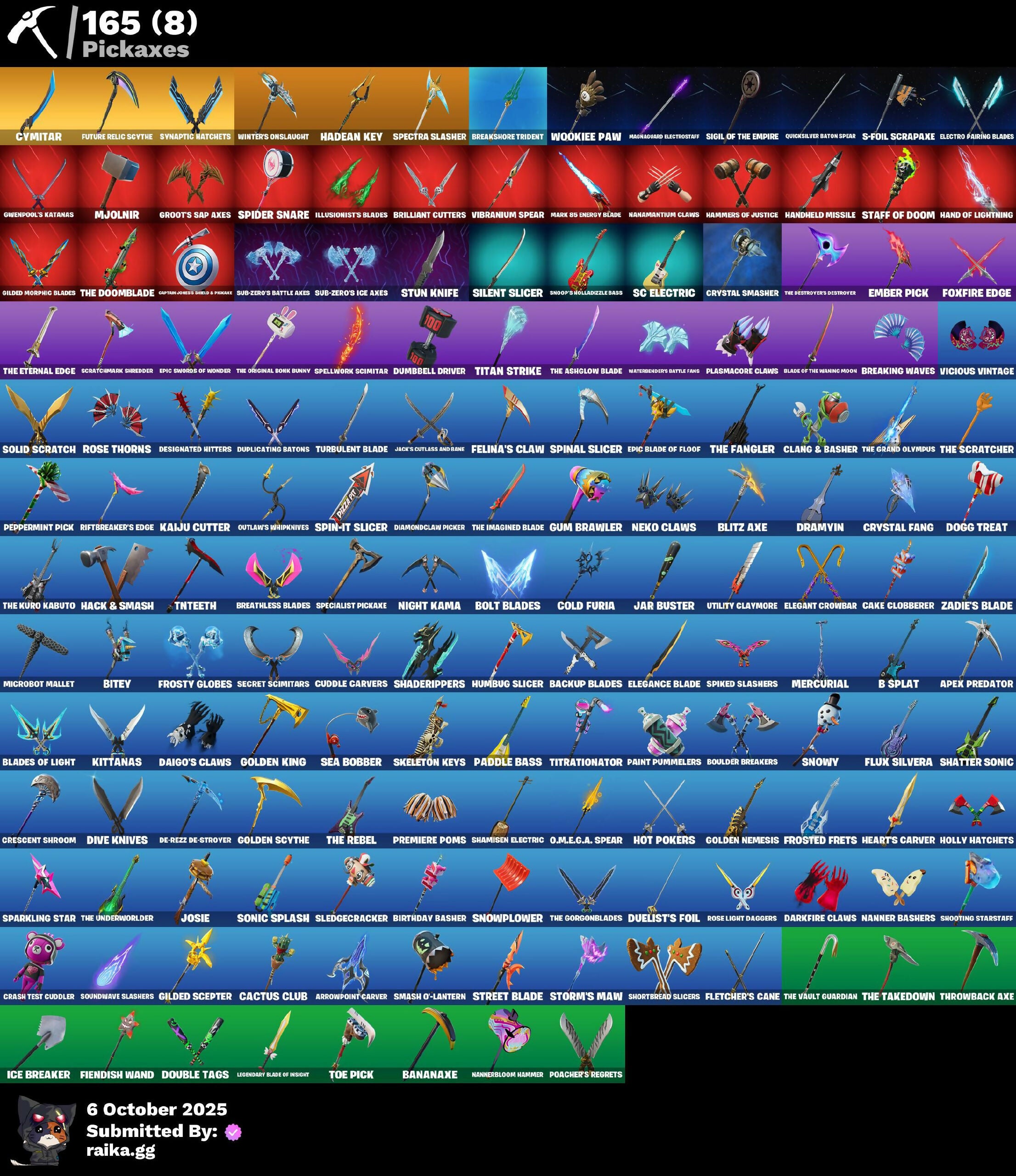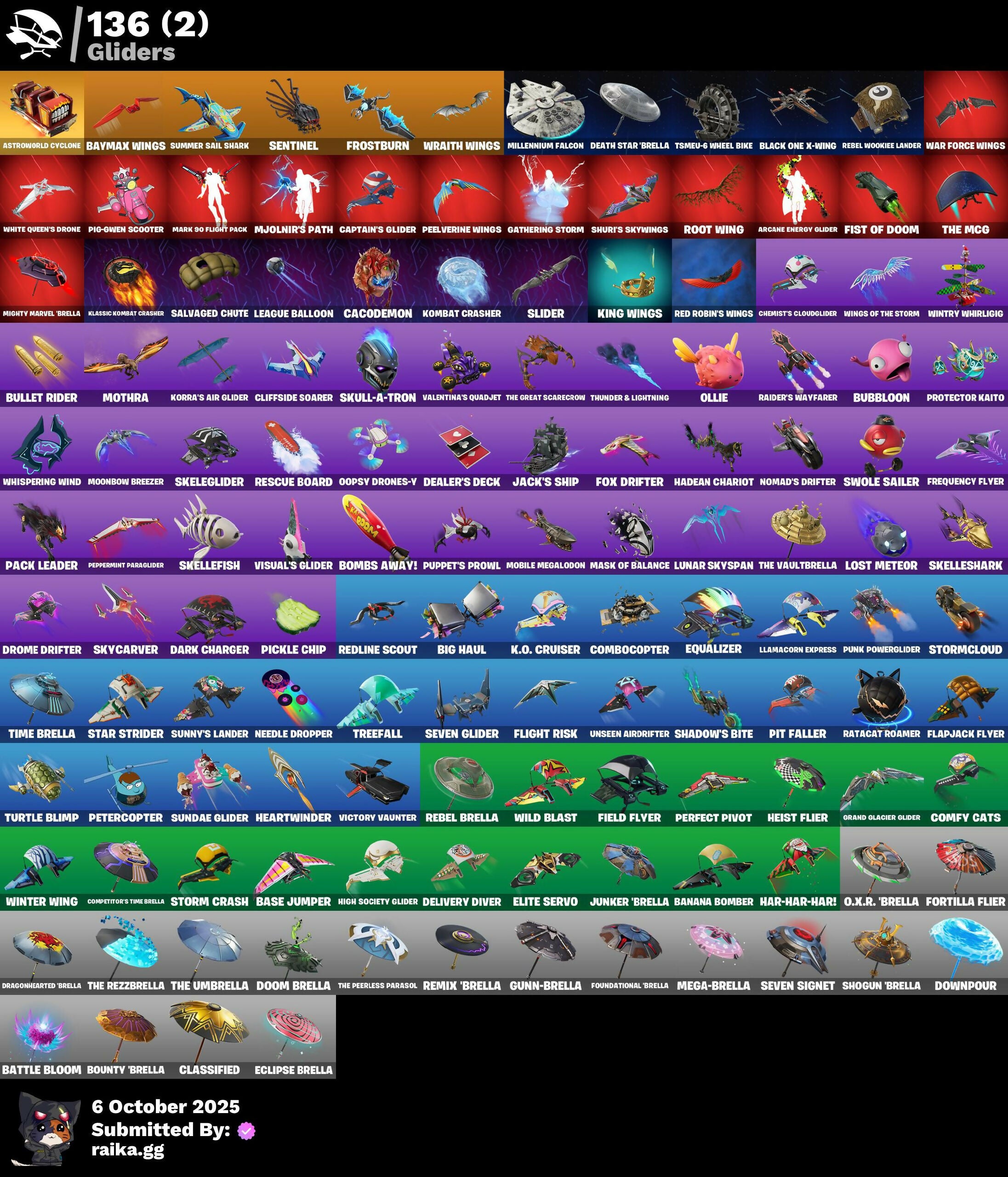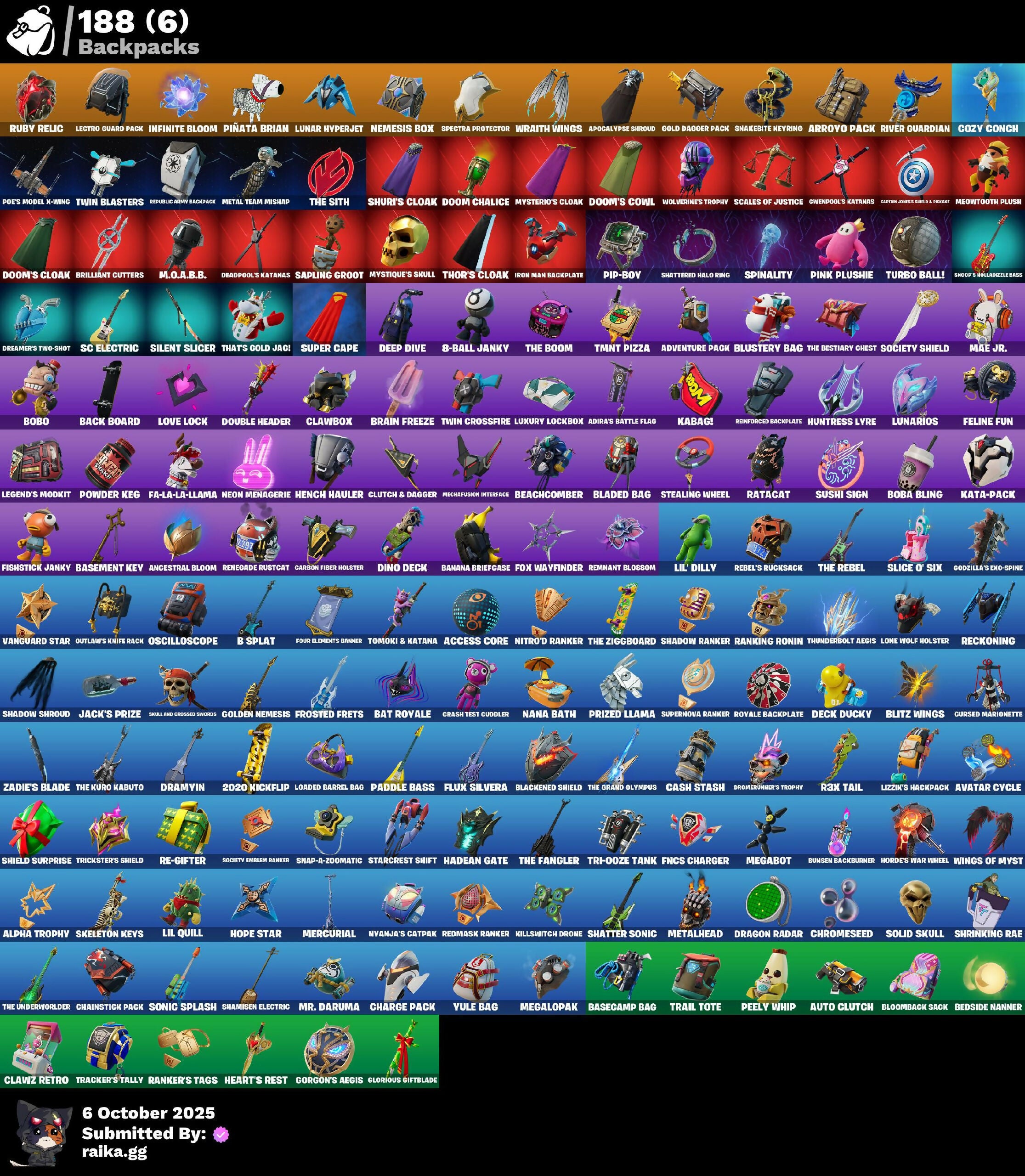 (Sniikt!), 2020 Kickflip, 8-Ball, 8-Ball Janky, A Warrior Prepares, A.L.T.E.R., Access Core, Ace Pilot Poe, Adira's Armor, Adira's Battle Flag, Adventure Pack, Aerial, Aerial Classic, Aerial Swagger, Afterparty, Agent Jones, Agent Nana, Agent Peely, Air Horn, All-Nighter, Alpha Trophy, Ancestral Bloom, Antonia, Antonia In Action, Apex Predator, Aphrodite, Apocalypse Shroud, Appeeling Drive, Apprentice Evie, Arcade Cat, Arcane Energy Glider, Arcane Steel, Arctic Adeline, Arrowpoint Carver, Arroyo Pack, Artemis, Astro Antidote, Astro Jack, Astroworld Cyclone, Auntie Dot, Aura, Auto Clutch, Avatar Cycle, Avengers Logo, Axo's Big Moment, B Splat, B.R.U.L.E. Competitor, Back Board, Backup Blades, Banana Bomber, Banana Briefcase, Bananaxe, Baron's Hoard, Base Jumper, Basecamp Bag, Basement Key, Bat Royale, Batman, Battle Ball, Battle Blessing, Battle Bloom, Battle Mode, Battle Ready Poe, Baymax Wings, Beachcomber, Beatzbunny, Bedside Nanner, Beep Beep, Belt It!, Berserker Barrage, Bi-Han, Big Dill, Big Guns, Big Haul, Bike To Go, Billy Bounce, Birthday Basher, Birthday Bud, Birthday Dash, Bitey, Black Leader, Black One X-Wing, Black Panther (Shuri), Black Queen, Blackened Shield, Blade Of The Waning Moon, Bladed Bag, Blades Of Light, Blasted, Blazing Fire Cerberus, Blitz Axe, Blitz Wings, Blocko, Bloomback Sack, Blue Camo, Blustery Bag, Boba Bling, Bobo, Bolt Blades, Bombastic Winterfest, Bombs Away!, Boogie Down, Both Eyes Open, Boulder Breakers, Bounty 'Brella, Brain Freeze, Breaking Waves, Breakshore Trident, Breathless Blades, Brilliant Cutters, Bring It Around, Brite & Speedy, Brite Stars, Brutus, Bubblegum Highwire, Bubbloon, Buffer Fish, Bullet Rider, Bunsen Backburner, Burning Ambition Valeria, Bushie Bright, Butterfly, Buttoned Up, By The Horns, Bytes' Sigil, Cacodemon, Cactus Club, Cake Clobberer, Calico, Call Me, Camo War Machine, Capoeira, Captain America’s Shield, Captain Jeep's Build & Repair, Captain Jones, Captain Llamerica, Captain's Glider, Captain-Jones's Shield & Pickaxe, Carbon Fiber Holster, Card Drop, Cas1 Contender1, Cash Grab, Cash Stash, Cassidy Quinn, Cauldron Chill, Cerberus, Cerberus Bite, Cerberus Medallion, Chainstick Pack, Chaos Directive, Charge Pack, Chef's Special, Chemist's Cloudglider, Chic, Chillshot, Choice Knit, Chomp Cud!!, Choose Naughty, Choppy, Chrome Marked, Chromeseed, Clang & Basher, Classic Peelverine, Classified, Clawbox, Clawz Retro, Clean Sweep, Cliffside Soarer, Cloudburst, Clutch & Dagger, Cobalt, Cobalt Overdrive, Coin Flip, Cold Blooded, Cold Blooded Style, Cold Furia, Collector Kado Thorne, Combat Giller, Combocopter, Comet, Comfy Cats, Competitor's Time Brella, Conch Call, Confetti, Conjuring Mysterio, Console Cup, Controlled Focus, Coral Crush, Corrosive Stripe, Courageous Mikasa, Cowboy Chat, Cozy Conch, Crack It, Crash Test Cuddler, Crashed Chiller, Crashed Shield, Crescent Shroom, Cross Grand Entrance, Crowning Achievement, Cryptic Sigil, Crystal Fang, Crystal Smasher, Crystal's Run, Cuddle Carvers, Cuddles' Garden, Cursed, Cursed Marionette, Cyclo Curl, Cymitar, D.C. 63, Dagger Dance, Daigo, Daigo's Claws, Daisies, Dark Charger, Dark Gwenpool, Darkfire Claws, Dawn Duelist Nisha, De-Rezz De-Stroyer, Deadpool, Deadpool Unmasked, Deadpool's Katanas, Dealer's Deck, Death Star 'Brella, Deck Ducky, Deep Dive, Delivery Diver, Demon Hunter Hope, Denim Destiny, Designated Hitters, Destroyer Signature, Determined Kendo, Determined Korra, Determined Renegade, Diamond Throne, Diamondclaw Picker, Dice Roll, Dillicious, Dillinger The Gherk, Dino Deck, Distant Roar, Diva's Grin, Dive Knives, Doctor Doom, Doctor Doom (God Emperor), Dogg Treat, Doom, Doom Brella, Doom Chalice, Doom's Cloak, Doom's Cowl, Doom's Domain, Double Header, Double Tags, Downpour, Doze Dab, Dragon Radar, Dragon Rune Lances, Dragon Spirit, Dragonhearted 'Brella, Dramvin, Dreamer's Two-Shot, Drome Drifter, Dromerunner's Trophy, Drones-V View, Dropout, Drummies, Duelist's Card Trick, Duelist's Foil, Dumbbell Driver, Dumbell Driver, Duplicating Batons, Duplikates, Dusk Knight, Dynamic Tntina, Dynamite, E.G.O., Eclipse Brella, Electro Pairing Blades, Elegance Blade, Elegant Crowbar, Elemental Cycle, Elite Servo, Elysium, Ember Pick, Emma Frost, Emma's Influence, Empress Fan Dance, Energized Godzilla, Epic Blade Of Floof, Epic Swords Of Wonder, Equalizer, Eren Jaeger, Eren's Faceoff, Erisa Alert, Escapees, Everything's Fine, Evolved Heat Ray, Expressionism, Eye Of Agamotto, FNCS Charger, Fa-La-La-Llama, Falling Leaf, Falling Snow, Fan Attack, Fancy Peter Griffin, Feel The Force, Felina, Felina's Claw, Feline Fun, Ferocious, Field Flyer, Fiendish Wand, Final Eclipse, Final Harbinger, Fireworks Salvo, Fish Hook, Fish Thicc, Fishbone, Fishstick Janky, Fist, Fist Bump, Fist of Doom, Fixer, Fizzix, Flaky Feast, Flapjack Flyer, Flash Of Lightning, Flashback Breakdown, Fletcher Kane, Fletcher's Cane, Flight Risk, Flippin' Away, Floating Island, Flood, Flux Silvera, Foil Flex, Fortilla Flier, Foundational 'Brella, Four Elements Banner, Fox Drifter, Fox Wayfinder, Foxfire Edge, Frequency Flyer, Frost Squad, Frostburn, Frosted, Frosted Frets, Frosty Globes, Frozen Over, Frozen Treat Cart, Fryangles, Full Moon Fletcher Kane, Fully Charged Drift, Fusion!, Future Relic Scythe, GG Snakes, GG Snowman, Gathering Storm, Gear Specialist Maya, Gear Specialist Maya (Hat - Dark), Get Griddy, Gg Cuddlez, Gila, Gila Classic, Gilded Heart, Gilded Morphic Blades, Gilded Scepter, Glorious Giftblade, Glory To Latveria, Godzilla Awaits, Godzilla Evolved, Godzilla's Exo-Spine, Gold Blooded Ace, Gold Blooded Ace (Cold Blooded Ace), Gold Brutus, Gold Dagger Pack, Gold Midas, Gold Touch, Golden Ghoul, Golden King, Golden Nemesis, Golden Scythe, Golden Shine, Golden Wolf, Golf Clap, Good Game, Well Played, Gorgon's Aegis, Grand Glacier Glider, Grav-Fusion, Greed, Gringle Gift, Groot, Groot (Silver Foil), Groot Glow, Groot's Sap Axes, Groovy!, Grriz, Guardian Jade, Guggi Was Here, Gum Brawler, Gumbo, Gunn-Brella