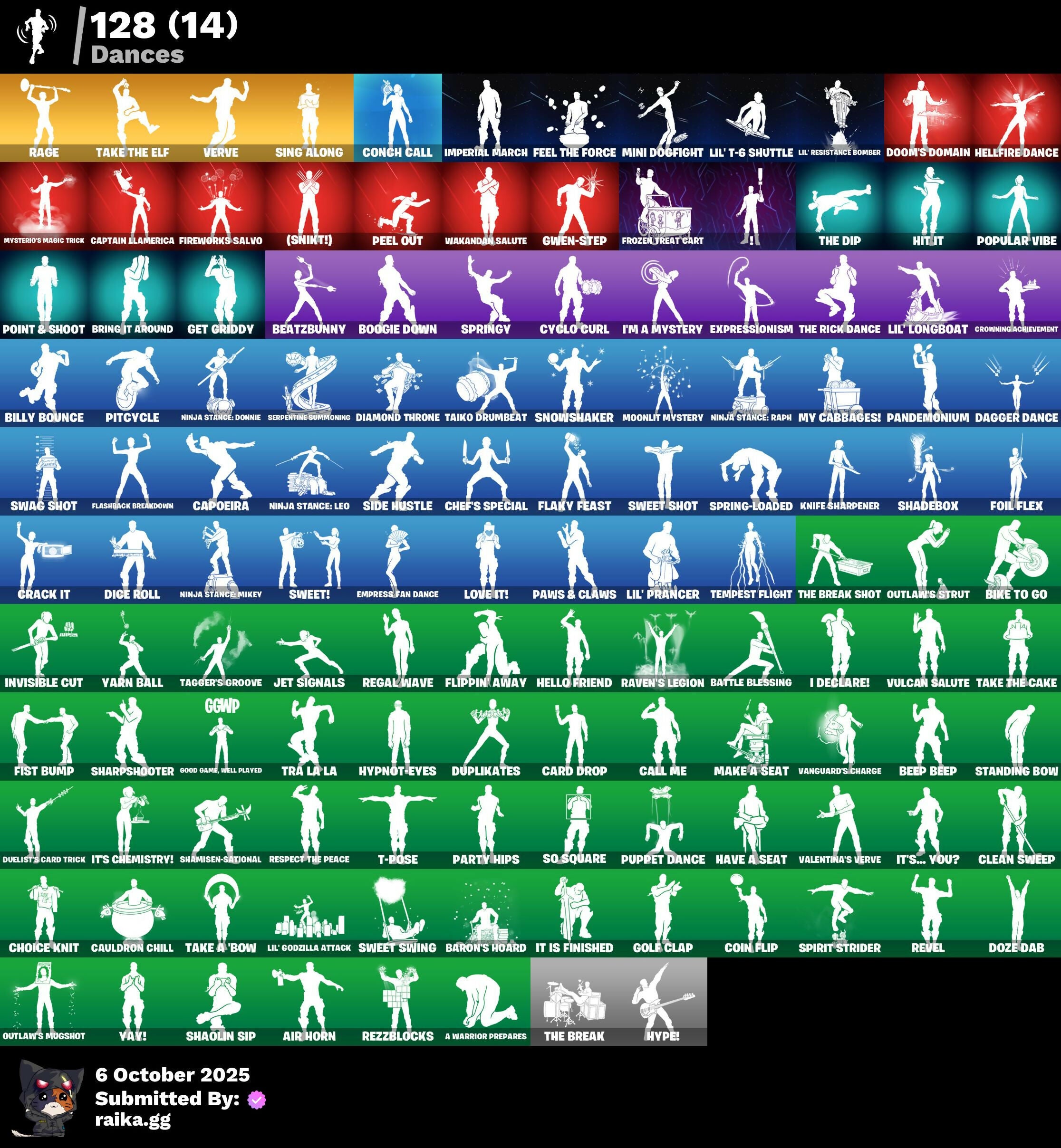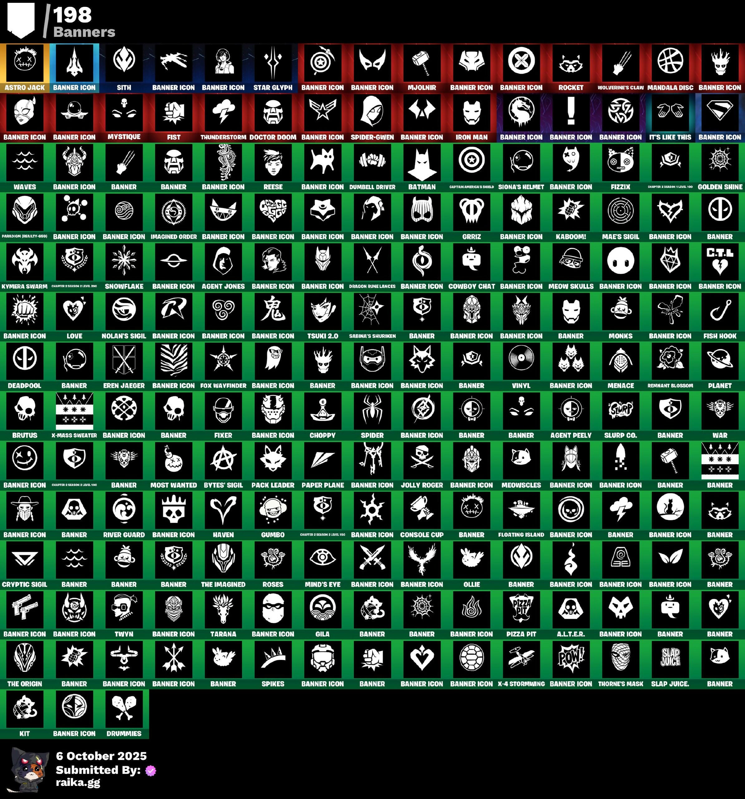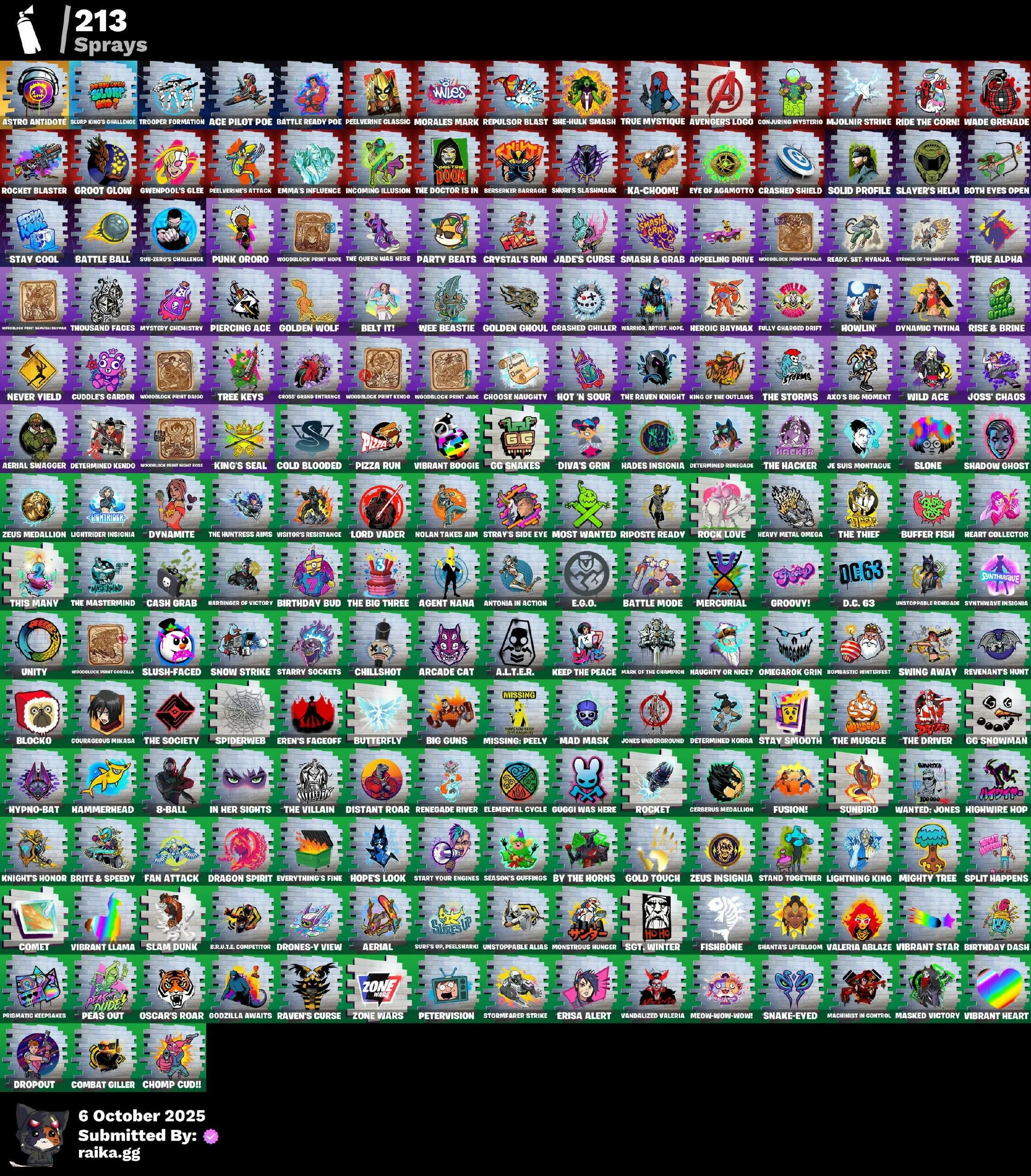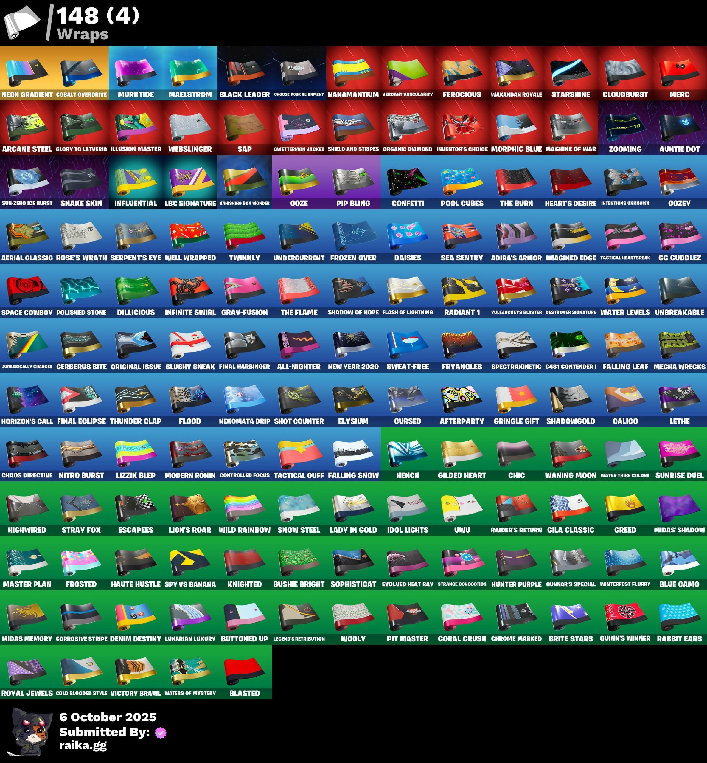 (Sniikt!), 2020 Kickflip, 8-Ball, 8-Ball Janky, A Warrior Prepares, A.L.T.E.R., Access Core, Ace Pilot Poe, Adira's Armor, Adira's Battle Flag, Adventure Pack, Aerial, Aerial Classic, Aerial Swagger, Afterparty, Agent Jones, Agent Nana, Agent Peely, Air Horn, All-Nighter, Alpha Trophy, Ancestral Bloom, Antonia, Antonia In Action, Apex Predator, Aphrodite, Apocalypse Shroud, Appeeling Drive, Apprentice Evie, Arcade Cat, Arcane Energy Glider, Arcane Steel, Arctic Adeline, Arrowpoint Carver, Arroyo Pack, Artemis, Astro Antidote, Astro Jack, Astroworld Cyclone, Auntie Dot, Aura, Auto Clutch, Avatar Cycle, Avengers Logo, Axo's Big Moment, B Splat, B.R.U.L.E. Competitor, Back Board, Backup Blades, Banana Bomber, Banana Briefcase, Bananaxe, Baron's Hoard, Base Jumper, Basecamp Bag, Basement Key, Bat Royale, Batman, Battle Ball, Battle Blessing, Battle Bloom, Battle Mode, Battle Ready Poe, Baymax Wings, Beachcomber, Beatzbunny, Bedside Nanner, Beep Beep, Belt It!, Berserker Barrage, Bi-Han, Big Dill, Big Guns, Big Haul, Bike To Go, Billy Bounce, Birthday Basher, Birthday Bud, Birthday Dash, Bitey, Black Leader, Black One X-Wing, Black Panther (Shuri), Black Queen, Blackened Shield, Blade Of The Waning Moon, Bladed Bag, Blades Of Light, Blasted, Blazing Fire Cerberus, Blitz Axe, Blitz Wings, Blocko, Bloomback Sack, Blue Camo, Blustery Bag, Boba Bling, Bobo, Bolt Blades, Bombastic Winterfest, Bombs Away!, Boogie Down, Both Eyes Open, Boulder Breakers, Bounty 'Brella, Brain Freeze, Breaking Waves, Breakshore Trident, Breathless Blades, Brilliant Cutters, Bring It Around, Brite & Speedy, Brite Stars, Brutus, Bubblegum Highwire, Bubbloon, Buffer Fish, Bullet Rider, Bunsen Backburner, Burning Ambition Valeria, Bushie Bright, Butterfly, Buttoned Up, By The Horns, Bytes' Sigil, Cacodemon, Cactus Club, Cake Clobberer, Calico, Call Me, Camo War Machine, Capoeira, Captain America’s Shield, Captain Jeep's Build & Repair, Captain Jones, Captain Llamerica, Captain's Glider, Captain-Jones's Shield & Pickaxe, Carbon Fiber Holster, Card Drop, Cas1 Contender1, Cash Grab, Cash Stash, Cassidy Quinn, Cauldron Chill, Cerberus, Cerberus Bite, Cerberus Medallion, Chainstick Pack, Chaos Directive, Charge Pack, Chef's Special, Chemist's Cloudglider, Chic, Chillshot, Choice Knit, Chomp Cud!!, Choose Naughty, Choppy, Chrome Marked, Chromeseed, Clang & Basher, Classic Peelverine, Classified, Clawbox, Clawz Retro, Clean Sweep, Cliffside Soarer, Cloudburst, Clutch & Dagger, Cobalt, Cobalt Overdrive, Coin Flip, Cold Blooded, Cold Blooded Style, Cold Furia, Collector Kado Thorne, Combat Giller, Combocopter, Comet, Comfy Cats, Competitor's Time Brella, Conch Call, Confetti, Conjuring Mysterio, Console Cup, Controlled Focus, Coral Crush, Corrosive Stripe, Courageous Mikasa, Cowboy Chat, Cozy Conch, Crack It, Crash Test Cuddler, Crashed Chiller, Crashed Shield, Crescent Shroom, Cross Grand Entrance, Crowning Achievement, Cryptic Sigil, Crystal Fang, Crystal Smasher, Crystal's Run, Cuddle Carvers, Cuddles' Garden, Cursed, Cursed Marionette, Cyclo Curl, Cymitar, D.C. 63, Dagger Dance, Daigo, Daigo's Claws, Daisies, Dark Charger, Dark Gwenpool, Darkfire Claws, Dawn Duelist Nisha, De-Rezz De-Stroyer, Deadpool, Deadpool Unmasked, Deadpool's Katanas, Dealer's Deck, Death Star 'Brella, Deck Ducky, Deep Dive, Delivery Diver, Demon Hunter Hope, Denim Destiny, Designated Hitters, Destroyer Signature, Determined Kendo, Determined Korra, Determined Renegade, Diamond Throne, Diamondclaw Picker, Dice Roll, Dillicious, Dillinger The Gherk, Dino Deck, Distant Roar, Diva's Grin, Dive Knives, Doctor Doom, Doctor Doom (God Emperor), Dogg Treat, Doom, Doom Brella, Doom Chalice, Doom's Cloak, Doom's Cowl, Doom's Domain, Double Header, Double Tags, Downpour, Doze Dab, Dragon Radar, Dragon Rune Lances, Dragon Spirit, Dragonhearted 'Brella, Dramvin, Dreamer's Two-Shot, Drome Drifter, Dromerunner's Trophy, Drones-V View, Dropout, Drummies, Duelist's Card Trick, Duelist's Foil, Dumbbell Driver, Dumbell Driver, Duplicating Batons, Duplikates, Dusk Knight, Dynamic Tntina, Dynamite, E.G.O., Eclipse Brella, Electro Pairing Blades, Elegance Blade, Elegant Crowbar, Elemental Cycle, Elite Servo, Elysium, Ember Pick, Emma Frost, Emma's Influence, Empress Fan Dance, Energized Godzilla, Epic Blade Of Floof, Epic Swords Of Wonder, Equalizer, Eren Jaeger, Eren's Faceoff, Erisa Alert, Escapees, Everything's Fine, Evolved Heat Ray, Expressionism, Eye Of Agamotto, FNCS Charger, Fa-La-La-Llama, Falling Leaf, Falling Snow, Fan Attack, Fancy Peter Griffin, Feel The Force, Felina, Felina's Claw, Feline Fun, Ferocious, Field Flyer, Fiendish Wand, Final Eclipse, Final Harbinger, Fireworks Salvo, Fish Hook, Fish Thicc, Fishbone, Fishstick Janky, Fist, Fist Bump, Fist of Doom, Fixer, Fizzix, Flaky Feast, Flapjack Flyer, Flash Of Lightning, Flashback Breakdown, Fletcher Kane, Fletcher's Cane, Flight Risk, Flippin' Away, Floating Island, Flood, Flux Silvera, Foil Flex, Fortilla Flier, Foundational 'Brella, Four Elements Banner, Fox Drifter, Fox Wayfinder, Foxfire Edge, Frequency Flyer, Frost Squad, Frostburn, Frosted, Frosted Frets, Frosty Globes, Frozen Over, Frozen Treat Cart, Fryangles, Full Moon Fletcher Kane, Fully Charged Drift, Fusion!, Future Relic Scythe, GG Snakes, GG Snowman, Gathering Storm, Gear Specialist Maya, Gear Specialist Maya (Hat - Dark), Get Griddy, Gg Cuddlez, Gila, Gila Classic, Gilded Heart, Gilded Morphic Blades, Gilded Scepter, Glorious Giftblade, Glory To Latveria, Godzilla Awaits, Godzilla Evolved, Godzilla's Exo-Spine, Gold Blooded Ace, Gold Blooded Ace (Cold Blooded Ace), Gold Brutus, Gold Dagger Pack, Gold Midas, Gold Touch, Golden Ghoul, Golden King, Golden Nemesis, Golden Scythe, Golden Shine, Golden Wolf, Golf Clap, Good Game, Well Played, Gorgon's Aegis, Grand Glacier Glider, Grav-Fusion, Greed, Gringle Gift, Groot, Groot (Silver Foil), Groot Glow, Groot's Sap Axes, Groovy!, Grriz, Guardian Jade, Guggi Was Here, Gum Brawler, Gumbo, Gunn-Brella