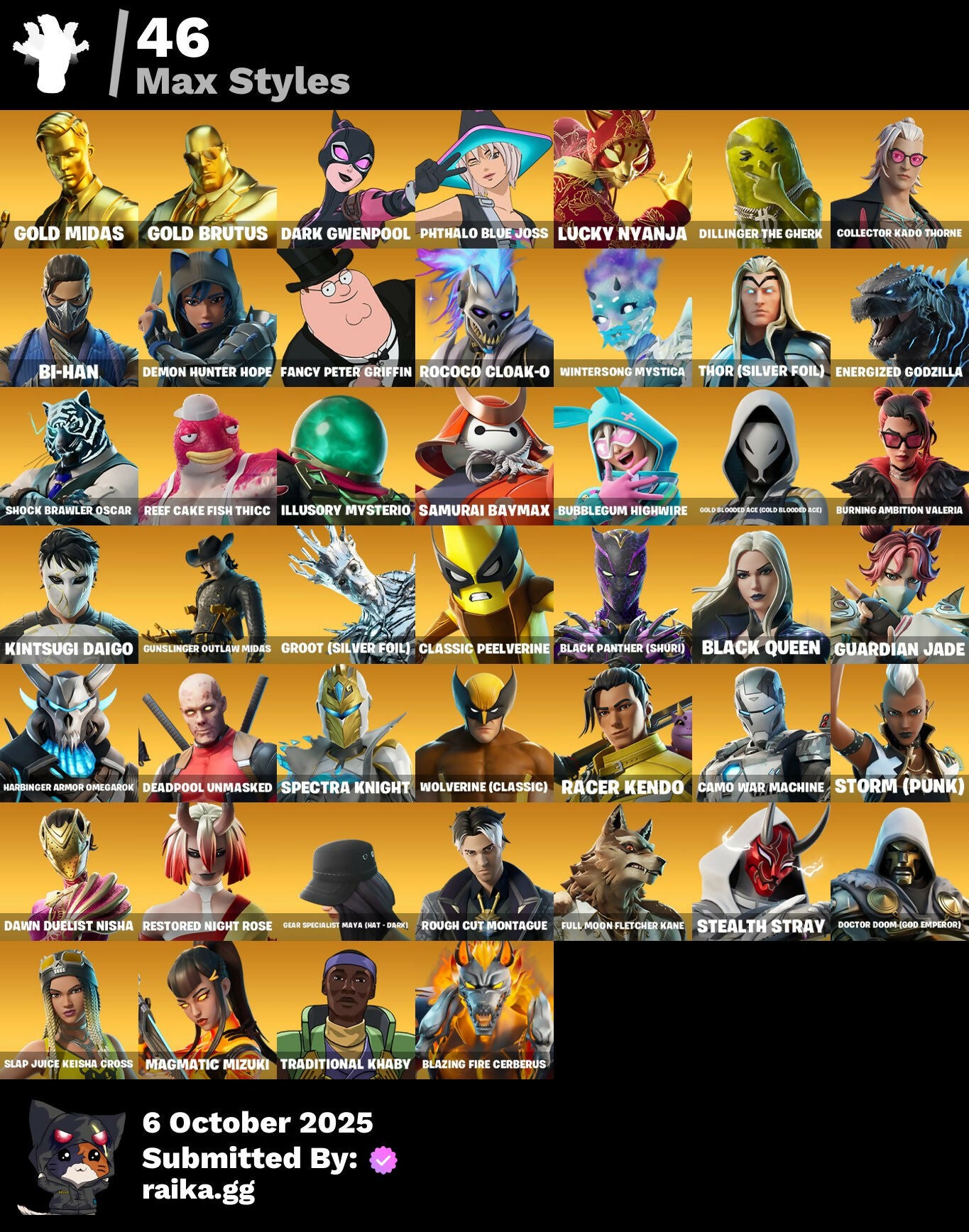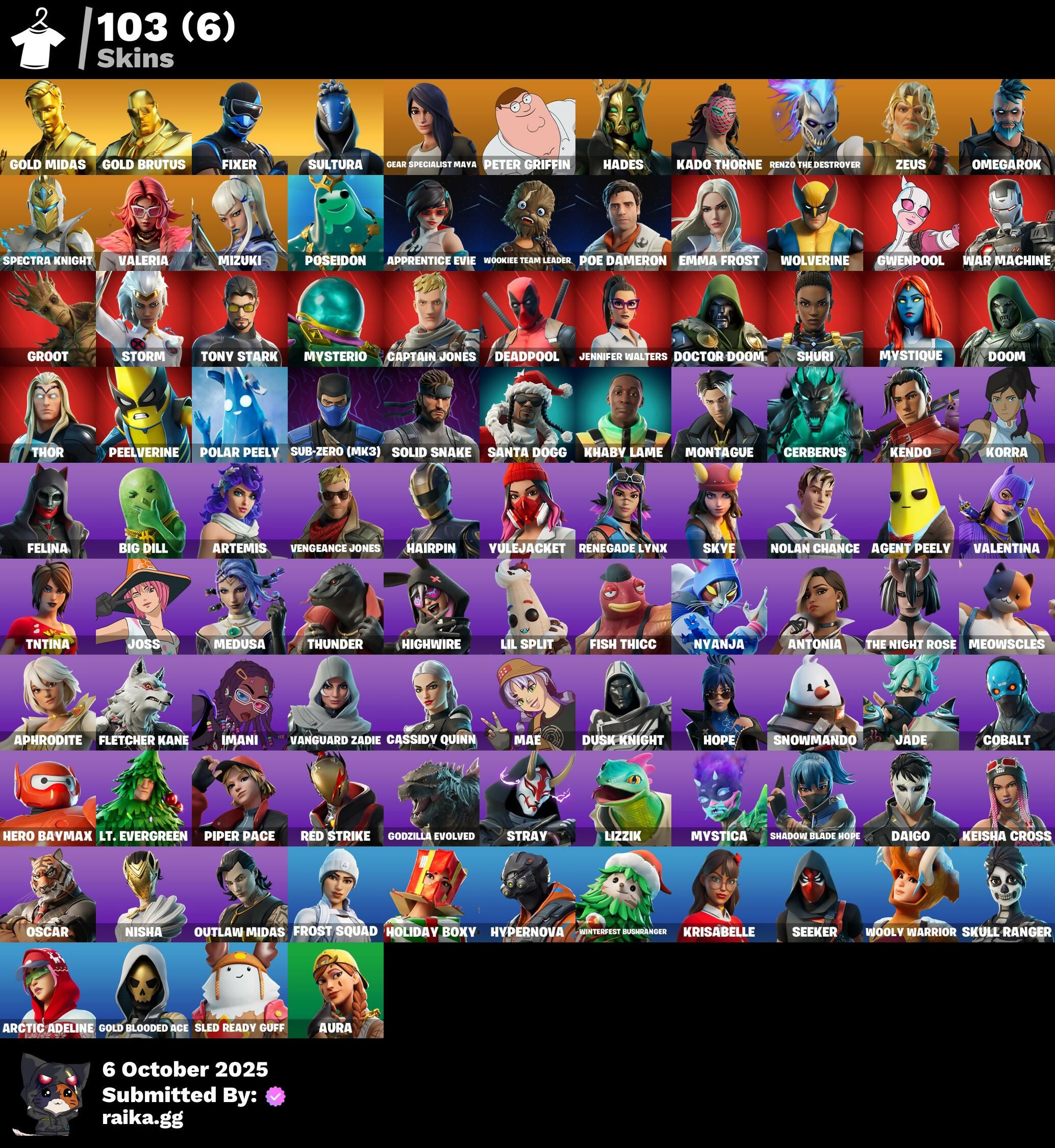 [PC/PSN/XBOX] 103 skins | Gold Midas | Gold Brutus | Fixer | Sultura | Gear Specialist Maya | Peter Griffin | Hades | Kado Thorne | Renzo the Destroyer | 650 VB / FN