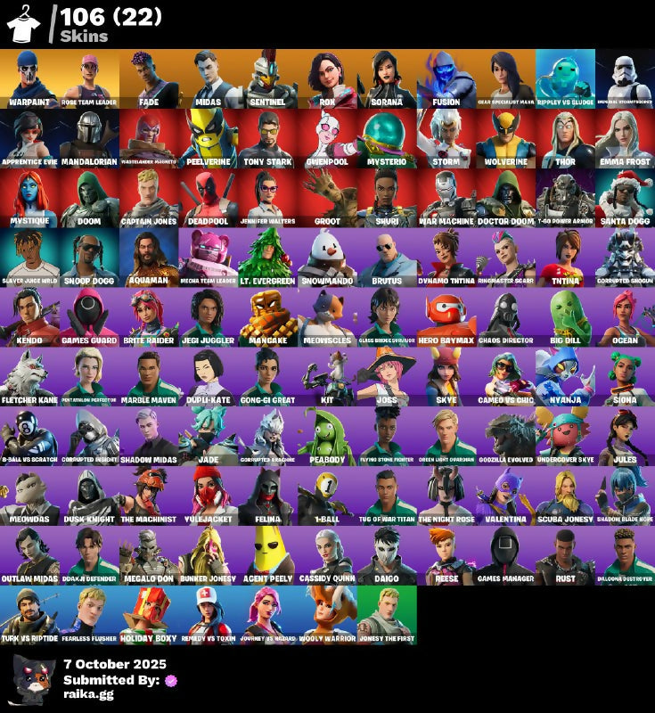 [PC/PSN/XBOX] 106 skins | OG STW | Fade | Midas | Sentinel | Rox | Sorana | Fusion | Gear Specialist Maya | Rippley vs Sludge | Imperial Stormtrooper | 230 VB