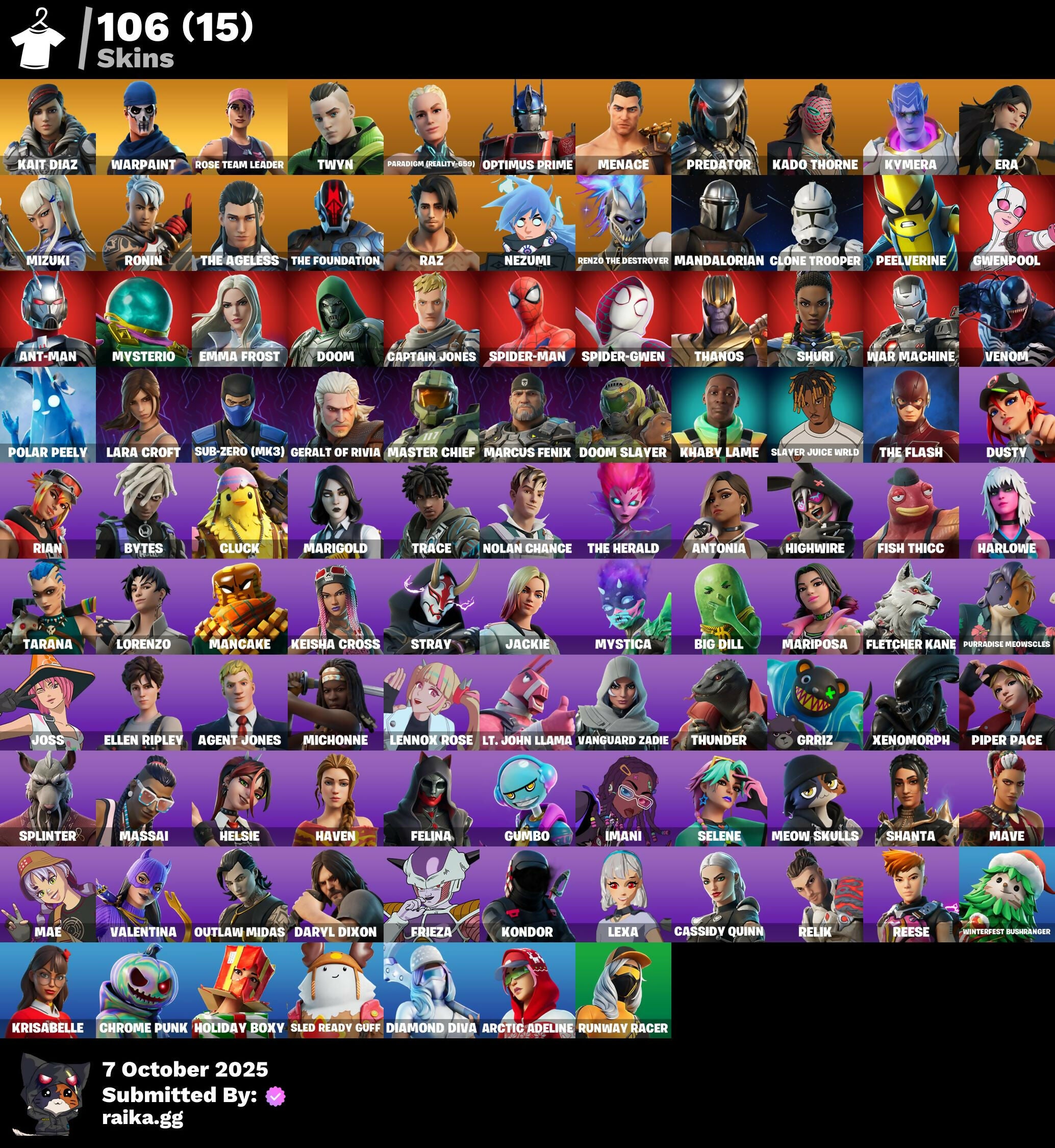 [PC/PSN/XBOX] 106 skins | OG STW | Master Chief | Kait Diaz | Twyn | Paradigm (Reality-659) | Optimus Prime | Menace | Predator | Kado Thorne | Kymera | Era | 1220 VB