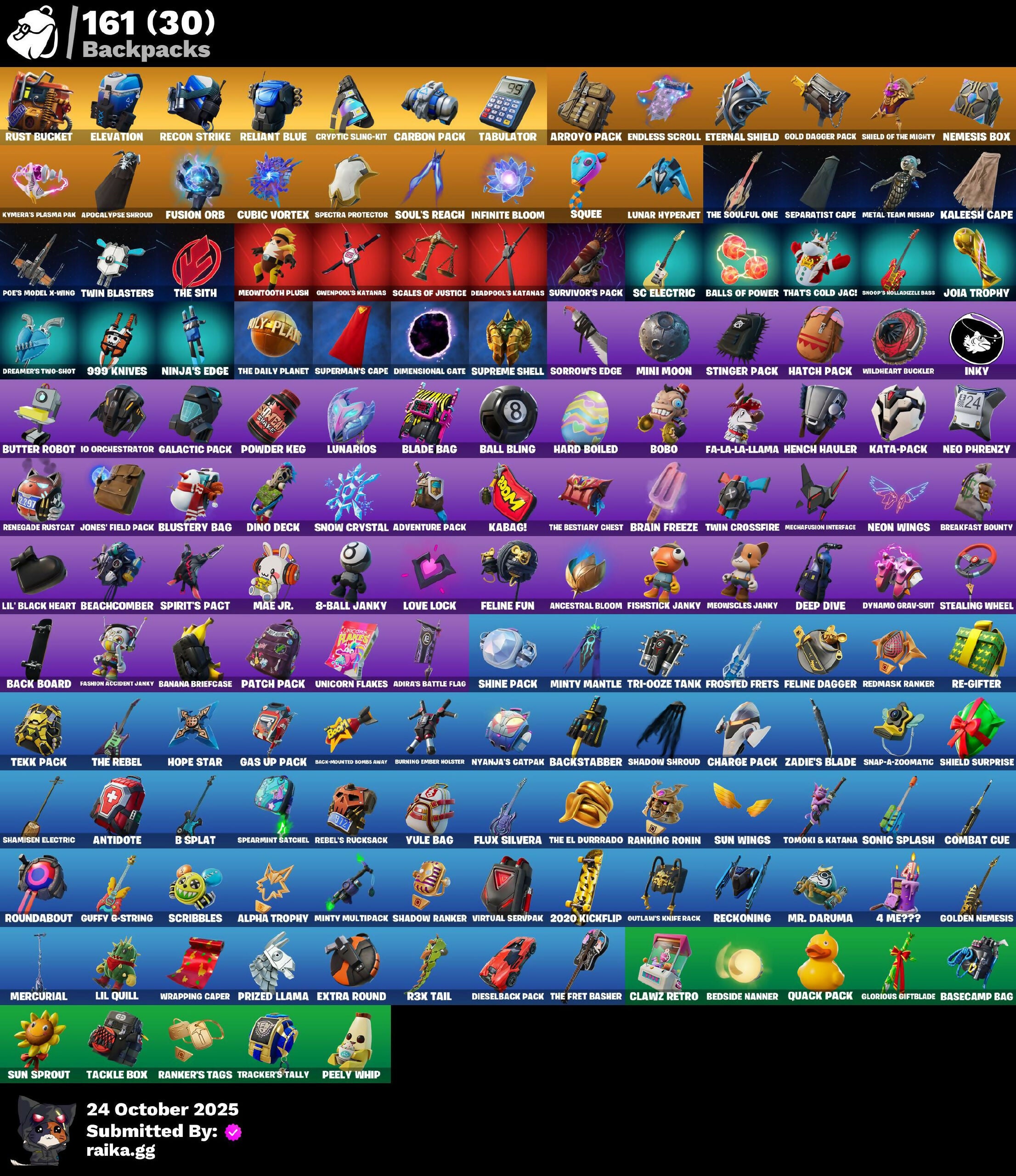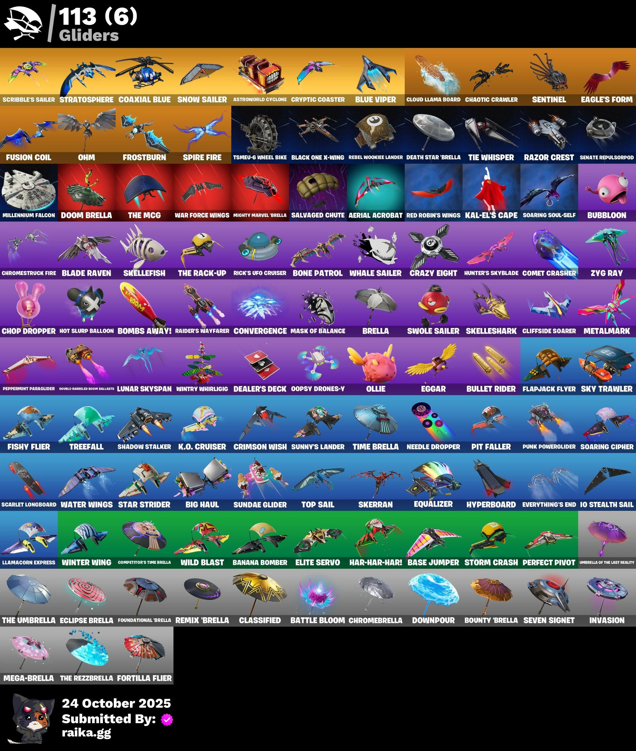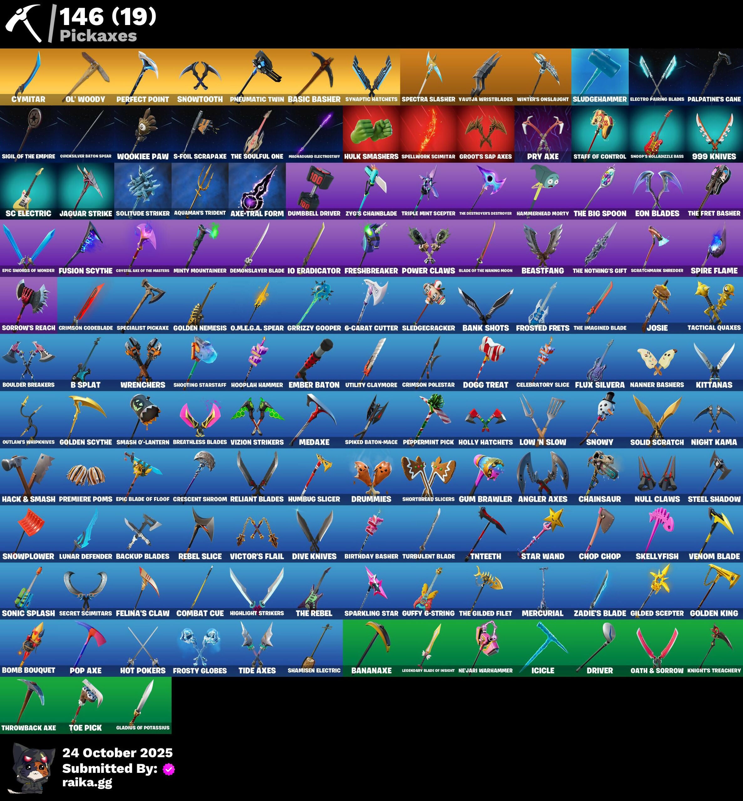 1-Ball, 2020 Kickflip, 2022, 4 Me???, 6-Carat Cutter, 8-Ball, 8-Ball Janky, 8-Ball Vs Scratch, 999 Knives, A Warrior Prepares, A.L.T.E.R., Abduction, Ace Pilot Poe, Acolyte's Curse, Adira's Armor, Adira's Battle Flag, Adventure Pack, Aerial Acrobat, Aerial Classic, Aerial Swagger, Afterparty, Agent Jones, Agent Jones (Jump 31), Agent Nana, Agent Peely, Air Shredder, Alli, Alpha Trophy, Ancestral Bloom, Angler Axes, Antidote, Apocalypse Shroud, Apprentice Evie, Aquaman, Aquaman's Trident, Arctic Adeline, Arroyo Pack, Arthur Curry, Astro Antidote, Astro Jack, Astroworld Cyclone, Aura, Axe-Tral Form, Axo's Big Moment, Azarath Metrion Zinthos!, B Splat, Babygirl!!!, Back Board, Back-Mounted Bombs Away, Backstabber, Backup Blades, Ball Bling, Balls Of Power, Banana Bomber, Banana Briefcase, Bananaxe, Bank Shots, Banner, Banner Icon, Base Jumper, Basecamp Bag, Basic Basher, Basketball Hoop, Batman, Battle Bloom, Battle Mode, Battle Ready Poe, Bawk Off, Beachcomber, Beamers, Bean Bag, Beastfang, Bedside Nanner, Beef Blade, Beep Beep, Bees!, Beskar, Big Guns, Big Haul, Birthday Basher, Bitter Sweets, Black Eternal Knight, Black Leader, Black One X-Wing, Blade Bag, Blade Raven, Blade of the Waning Moon, Blasted, Blizzabelle, Blizzard Bomber, Blocko, Blue Viper, Blustery Bag, Bobo, Boing!, Bolt, Bomb Bouquet, Bombastic Winterfest, Bombs Away!, Bone Patrol, Boogie Down, Boomin', Boots 'N' Cats, Both Eyes Open, Boulder Breakers, Bounty 'Brella, Brain Freeze, Breakfast Bounty, Breaking Point, Breathless Blades, Brella, Bring It Around, Brutus, Bubbloon, Bullet Rider, Burning Dragon, Burning Ember Holster, Burpee, Bushie Bright, Butter Robot, Bytes, Bytes' Sigil, Calico, Call Me, Cameo, Cameo Vs Chic, Carbon Commando, Carbon Pack, Carbon Scarlet, Cardistry, Cash Grab, Cat's Paw, Celebratory Slice, Chainsaur, Chalked Up 1-Ball, Challenger Menace - Flame, Chaos Directive, Chaos Director, Chaotic Crawler, Charge Pack, Charlotte, Charlotte's Logo, Chibi, Chic, Chillshot, Choice Knit, Chomp Cud!!, Choose Naughty, Choose Your Alignment, Chop Chop, Chop Dropper, Choppy, Chrome Marked, Chromebrella, Chromestruck Fire, Clark Kent, Classified, Clawz Retro, Clean Sweep, Cliffside Soarer, Cloud Llama Board, Cloud Striker, Cloudburst, Cluck, Cluck (Slurpy), Clucking Mad, Coaxial Blue, Cobalt Overdrive, Coin Flip, Combat Cue, Comet, Comet Crasher, Competitor's Time Brella, Confetti, Controlled Chaos, Controller Crew, Convergence, Corrupted, Courageous Mikasa, Cowboy Chat, Crabby King, Crashed Chiller, Crazy Castle, Crazy Eight, Crescent Shroom, Crimson Codeblade, Crimson Polestar, Crimson Wish, Crowning Achievement, Cryptic Coaster, Cryptic Sling-Kit, Crystal Axe of the Masters, Cube Marking, Cubic Vortex, Cyclo Curl, Cymitar, D.C. 63, Dagger Dance, Daisies, Daughter Of Trigon, Deadpool, Deadpool's Katanas, Dealer's Deck, Death Star 'Brella, Deep Dive, Deep End, Deimos, Demons Beware, Demonslayer Blade, Denim Destiny, Determined Renegade, Diamond Diva, Diamond Shapes, Dieselback Pack, Dimensional Gate, Dino Deck, Diva's Grin, Dive Knives, Dizzie, Do The Split, Doctor Slone, Dogg Treat, Doggo, Dolphin, Doom Brella, Doomed Echo, Double-Barreled Boom Ballasts, Downpour, Doze Dab, Dragon Rune Lances, Dragon Spirit, Dreamer's Two-Shot, Driver, Drones-V View, Droop, Dropout, Drummies, Dumbbell Driver, Dyna-Boom!, Dynamic Tntina, Dynamite, Dynamo, Dynamo Grav-Suit, Dynamo TNToon-A, Dynamo Tntina, E.G.O., Eagle's Form, Eclipse Brella, Eggar, Electro Pairing Blades, Elevation, Elite Servo, Ember Baton, Emperor Palpatine, Emperor's Might, Endless Scroll, Eon Blades, Epic Blade of Floof, Epic Swords of Wonder, Equalizer, Erisa Alert, Eternal Emblem, Eternal Knight, Eternal Shield, Evasive Maneuvers, Everything's End, Everything's Fine, Extra Round, Eye Of Agamotto, Fa-La-La-Llama, Fade, Fade Out, Falling Leaf, Falling Snow, Fashion Accident Janky, Feel The Force, Felina, Felina's Claw, Feline Dagger, Feline Fun, Final Harbinger, Fire Mint, Fish Hook, Fishbone, Fishstick Janky, Fishy Flier, Fist Bump, Fixer, Fizzix, Flapjack Flyer, Flashback Breakdown, Flippin' Away, Flux Silvera, Follow The Butterfly, Force Lightning, Fortilla Flier, Foundational 'Brella, Fresh Aura, Freshbreaker, Frost Squad, Frostburn, Frosted, Frosted Frets, Frosty Globes, Fryangles, Fusion, Fusion Coil, Fusion Orb, Fusion Scythe, GG Ornament, Galactic Pack, Gangnam Style, Gas Up Pack, Gear Specialist Maya, General Grievous, Gilded Scepter, Gladius of Potassius, Glorious Giftblade, Glyph Master, Gold Brutus, Gold Dagger Pack, Gold Midas, Gold Touch, Golden Grin, Golden King, Golden Nemesis, Golden Scythe, Golden Shine, Good Guy, Grav-Fusion, Greed, Grievous Stare, Gringle Gift, Groot's Sap Axes, Grriz, Grrizzly Gooper, Guffy 6-String, Guffy G-String, Guggi Was Here, Guggimon, Gugmon, Gum Brawler, Gumbo, Gunnar's Special, Gwettermann Jacket, Hack & Smash, Hammerhead, Hammerhead Morty, Hand-Forged, Hang Loose Celebration, Happy Kit, Har-Har-Har!, Harbinger Armor Omegarok, Harbinger Of Victory, Hard Boiled, Hat - Dark, Hatch Pack, Haute Hustle, Have A Seat, Haven, Heart Sign, Heart's Desire, Heat Vision Hunter, Heavy Metal Omega, Hench, Hench Hauler, Hex Code, High Five, Highlight Strikers, Holiday Boxy, Holly Hatchets, Hooplah Hammer, Hop And A Wink, Hope Star, Hope's Look, Hot Pokers, Hot Slurp Balloon, Hula Hoopin', Hulk Smashers, Humbug Slicer, Hunter's Skyblade, Hyperboard, I Am Fearless, I Believe, I'm Ready!, IO Eradicator, IQ Orchestrator, Icicle, Icy Pop, Imagined Edge, Imagined Order, Imperial March, In Her Sights, Industrious, Infinite Bloom, Infinite Swirl, Ink Wolf, Inky, Inside Out, Interstellar Rick, Introducing..., Invasion, Io Stealth Sail, Iris, It Is Finished, It's... You?, Jaguar Strike, Jedi Order, Joey, Joia Trophy, Jones' Field Pack, Josie, Journey, Journey Vs Hazard, Jules, Jules' Mask, Jun-Hwan, Jurassically Charged, Just Desserts, K.O. Cruiser, Ka Boom!, Ka-Bang!, Ka-Choom!, Kabag!, Kablammo!, Kaboom!, Kal-El's Cape, Kaleesh Cape, Ka