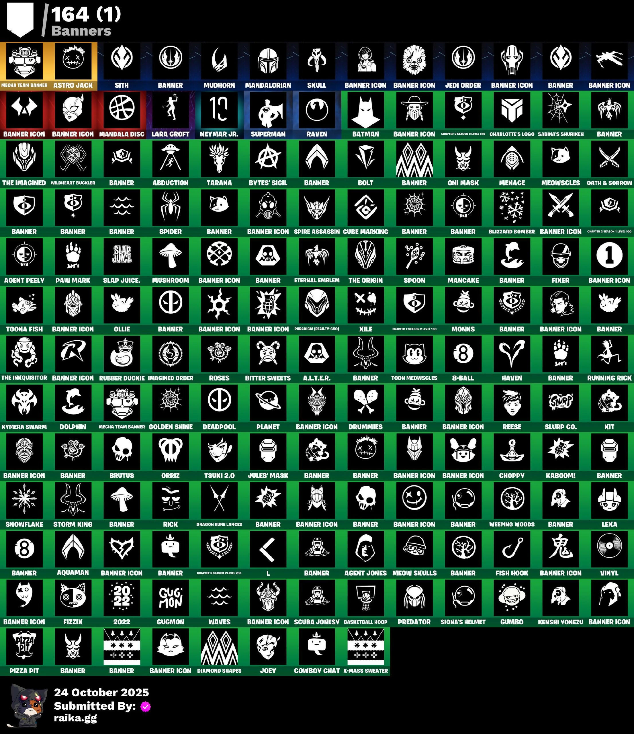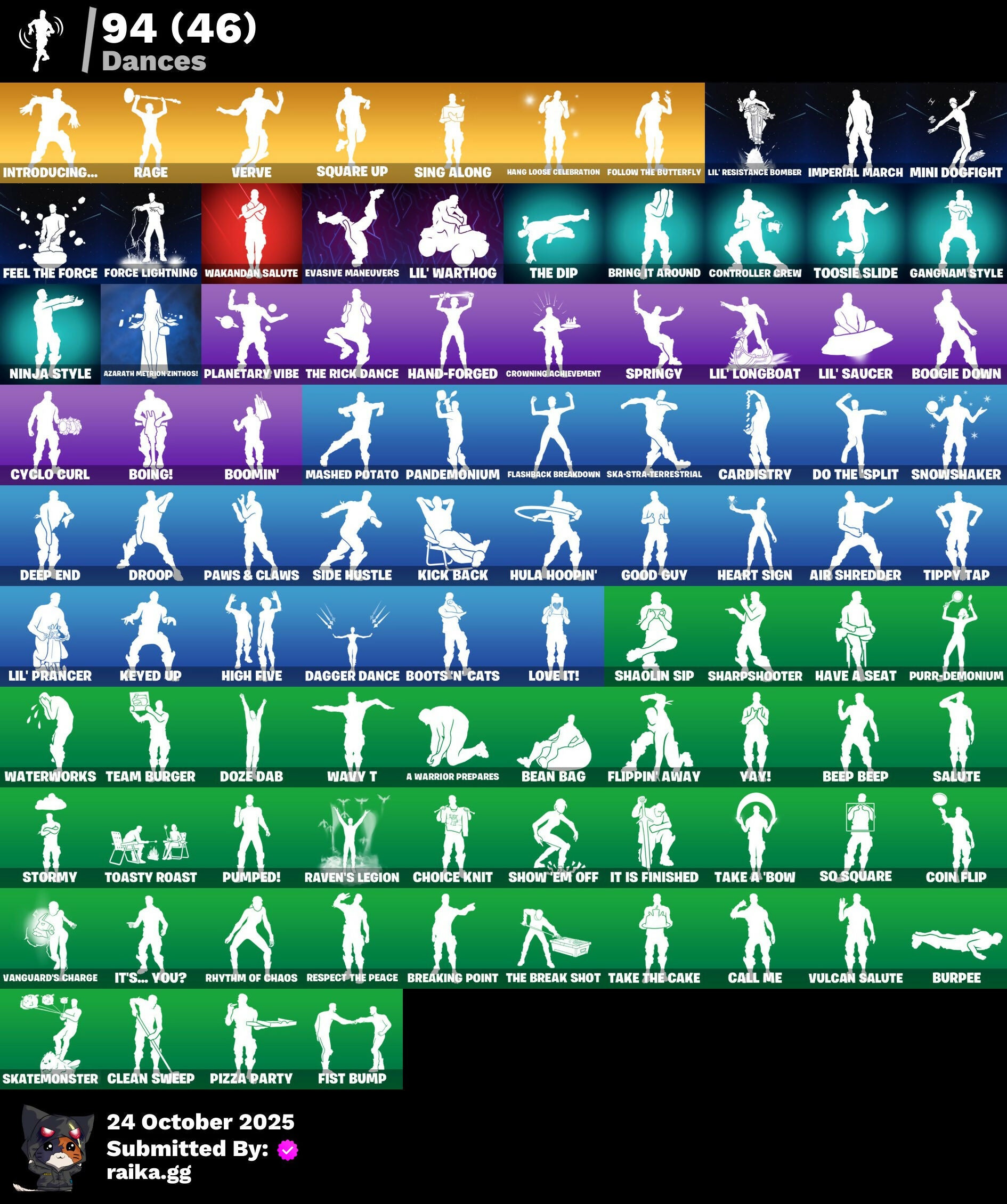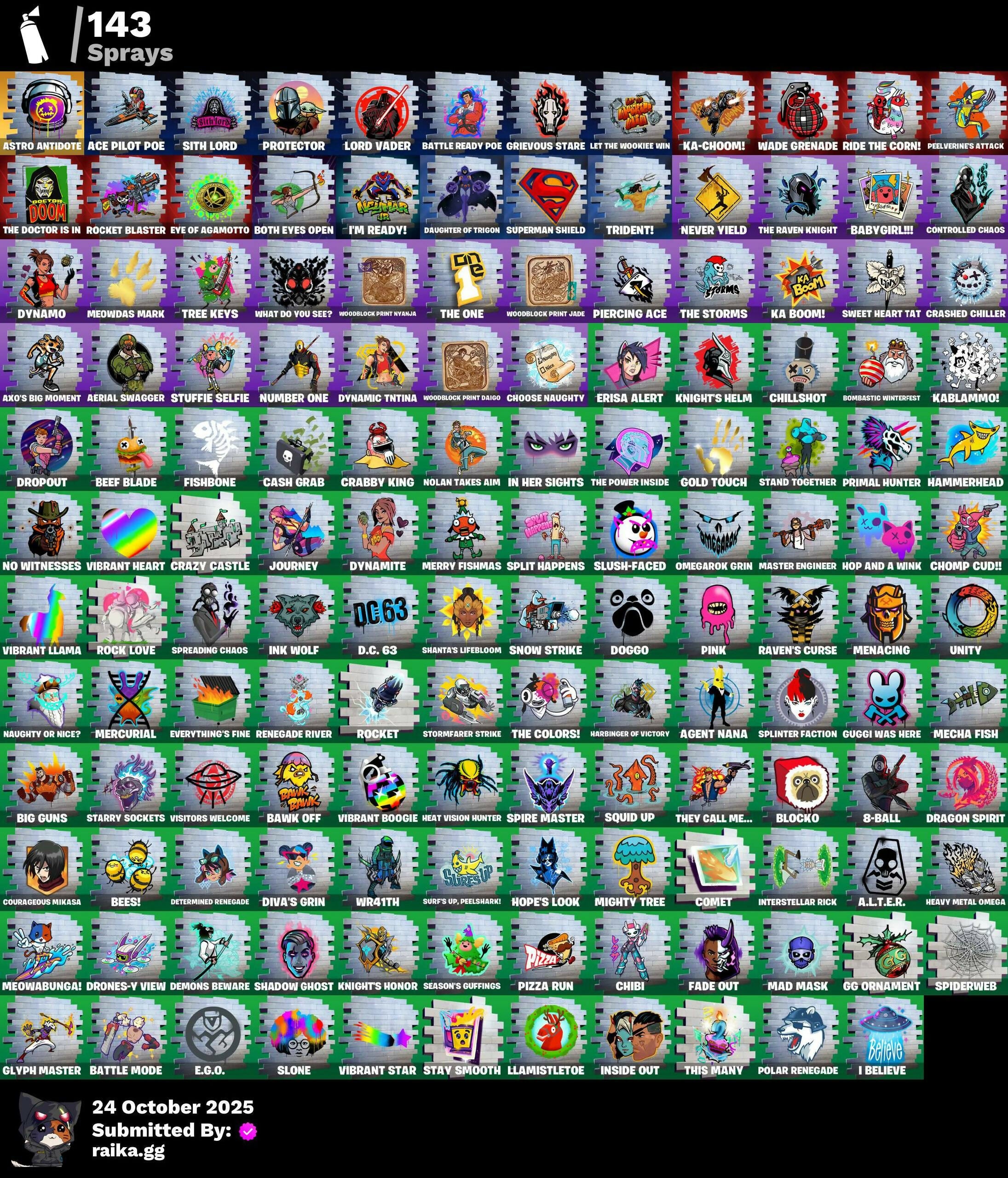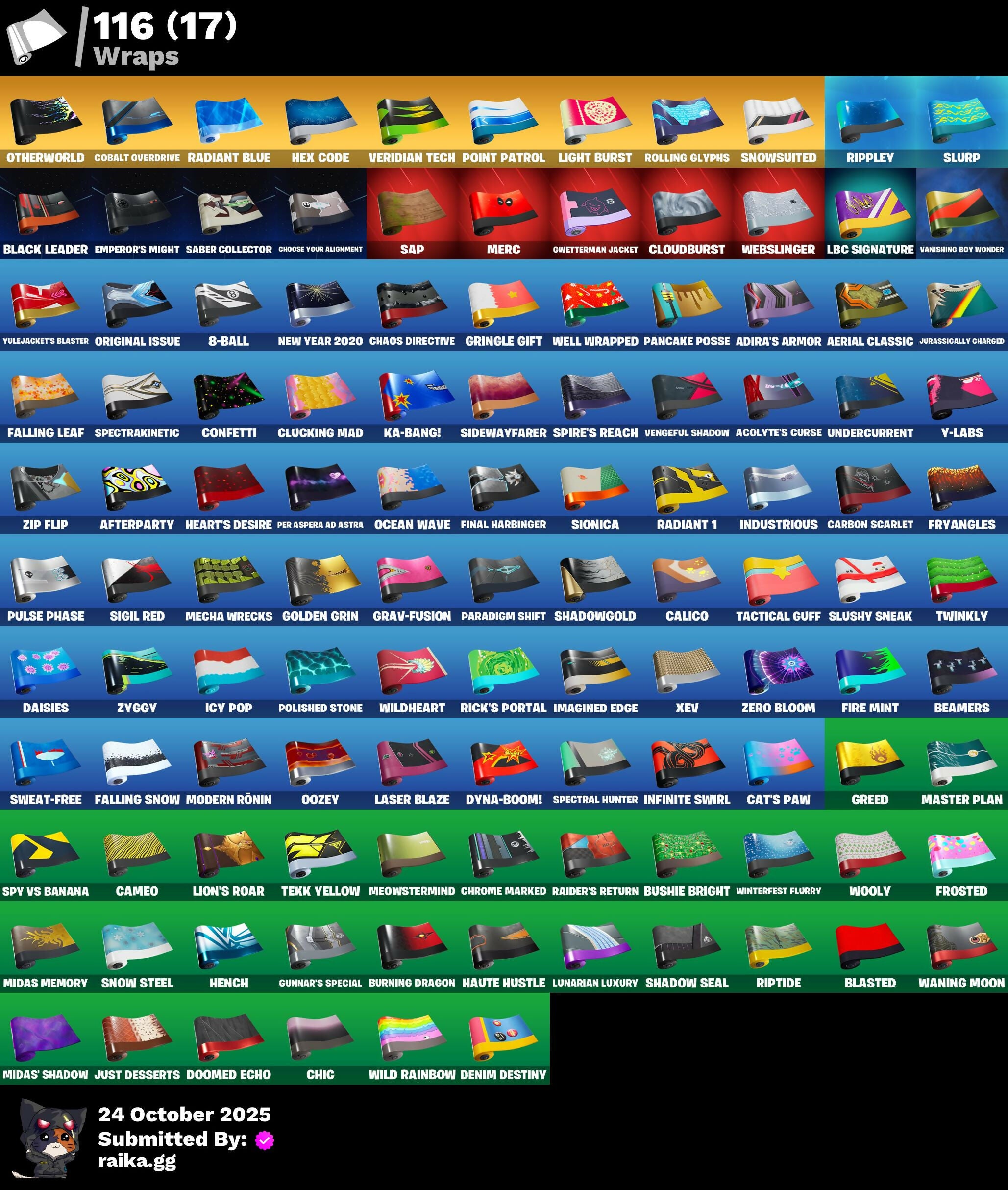 1-Ball, 2020 Kickflip, 2022, 4 Me???, 6-Carat Cutter, 8-Ball, 8-Ball Janky, 8-Ball Vs Scratch, 999 Knives, A Warrior Prepares, A.L.T.E.R., Abduction, Ace Pilot Poe, Acolyte's Curse, Adira's Armor, Adira's Battle Flag, Adventure Pack, Aerial Acrobat, Aerial Classic, Aerial Swagger, Afterparty, Agent Jones, Agent Jones (Jump 31), Agent Nana, Agent Peely, Air Shredder, Alli, Alpha Trophy, Ancestral Bloom, Angler Axes, Antidote, Apocalypse Shroud, Apprentice Evie, Aquaman, Aquaman's Trident, Arctic Adeline, Arroyo Pack, Arthur Curry, Astro Antidote, Astro Jack, Astroworld Cyclone, Aura, Axe-Tral Form, Axo's Big Moment, Azarath Metrion Zinthos!, B Splat, Babygirl!!!, Back Board, Back-Mounted Bombs Away, Backstabber, Backup Blades, Ball Bling, Balls Of Power, Banana Bomber, Banana Briefcase, Bananaxe, Bank Shots, Banner, Banner Icon, Base Jumper, Basecamp Bag, Basic Basher, Basketball Hoop, Batman, Battle Bloom, Battle Mode, Battle Ready Poe, Bawk Off, Beachcomber, Beamers, Bean Bag, Beastfang, Bedside Nanner, Beef Blade, Beep Beep, Bees!, Beskar, Big Guns, Big Haul, Birthday Basher, Bitter Sweets, Black Eternal Knight, Black Leader, Black One X-Wing, Blade Bag, Blade Raven, Blade of the Waning Moon, Blasted, Blizzabelle, Blizzard Bomber, Blocko, Blue Viper, Blustery Bag, Bobo, Boing!, Bolt, Bomb Bouquet, Bombastic Winterfest, Bombs Away!, Bone Patrol, Boogie Down, Boomin', Boots 'N' Cats, Both Eyes Open, Boulder Breakers, Bounty 'Brella, Brain Freeze, Breakfast Bounty, Breaking Point, Breathless Blades, Brella, Bring It Around, Brutus, Bubbloon, Bullet Rider, Burning Dragon, Burning Ember Holster, Burpee, Bushie Bright, Butter Robot, Bytes, Bytes' Sigil, Calico, Call Me, Cameo, Cameo Vs Chic, Carbon Commando, Carbon Pack, Carbon Scarlet, Cardistry, Cash Grab, Cat's Paw, Celebratory Slice, Chainsaur, Chalked Up 1-Ball, Challenger Menace - Flame, Chaos Directive, Chaos Director, Chaotic Crawler, Charge Pack, Charlotte, Charlotte's Logo, Chibi, Chic, Chillshot, Choice Knit, Chomp Cud!!, Choose Naughty, Choose Your Alignment, Chop Chop, Chop Dropper, Choppy, Chrome Marked, Chromebrella, Chromestruck Fire, Clark Kent, Classified, Clawz Retro, Clean Sweep, Cliffside Soarer, Cloud Llama Board, Cloud Striker, Cloudburst, Cluck, Cluck (Slurpy), Clucking Mad, Coaxial Blue, Cobalt Overdrive, Coin Flip, Combat Cue, Comet, Comet Crasher, Competitor's Time Brella, Confetti, Controlled Chaos, Controller Crew, Convergence, Corrupted, Courageous Mikasa, Cowboy Chat, Crabby King, Crashed Chiller, Crazy Castle, Crazy Eight, Crescent Shroom, Crimson Codeblade, Crimson Polestar, Crimson Wish, Crowning Achievement, Cryptic Coaster, Cryptic Sling-Kit, Crystal Axe of the Masters, Cube Marking, Cubic Vortex, Cyclo Curl, Cymitar, D.C. 63, Dagger Dance, Daisies, Daughter Of Trigon, Deadpool, Deadpool's Katanas, Dealer's Deck, Death Star 'Brella, Deep Dive, Deep End, Deimos, Demons Beware, Demonslayer Blade, Denim Destiny, Determined Renegade, Diamond Diva, Diamond Shapes, Dieselback Pack, Dimensional Gate, Dino Deck, Diva's Grin, Dive Knives, Dizzie, Do The Split, Doctor Slone, Dogg Treat, Doggo, Dolphin, Doom Brella, Doomed Echo, Double-Barreled Boom Ballasts, Downpour, Doze Dab, Dragon Rune Lances, Dragon Spirit, Dreamer's Two-Shot, Driver, Drones-V View, Droop, Dropout, Drummies, Dumbbell Driver, Dyna-Boom!, Dynamic Tntina, Dynamite, Dynamo, Dynamo Grav-Suit, Dynamo TNToon-A, Dynamo Tntina, E.G.O., Eagle's Form, Eclipse Brella, Eggar, Electro Pairing Blades, Elevation, Elite Servo, Ember Baton, Emperor Palpatine, Emperor's Might, Endless Scroll, Eon Blades, Epic Blade of Floof, Epic Swords of Wonder, Equalizer, Erisa Alert, Eternal Emblem, Eternal Knight, Eternal Shield, Evasive Maneuvers, Everything's End, Everything's Fine, Extra Round, Eye Of Agamotto, Fa-La-La-Llama, Fade, Fade Out, Falling Leaf, Falling Snow, Fashion Accident Janky, Feel The Force, Felina, Felina's Claw, Feline Dagger, Feline Fun, Final Harbinger, Fire Mint, Fish Hook, Fishbone, Fishstick Janky, Fishy Flier, Fist Bump, Fixer, Fizzix, Flapjack Flyer, Flashback Breakdown, Flippin' Away, Flux Silvera, Follow The Butterfly, Force Lightning, Fortilla Flier, Foundational 'Brella, Fresh Aura, Freshbreaker, Frost Squad, Frostburn, Frosted, Frosted Frets, Frosty Globes, Fryangles, Fusion, Fusion Coil, Fusion Orb, Fusion Scythe, GG Ornament, Galactic Pack, Gangnam Style, Gas Up Pack, Gear Specialist Maya, General Grievous, Gilded Scepter, Gladius of Potassius, Glorious Giftblade, Glyph Master, Gold Brutus, Gold Dagger Pack, Gold Midas, Gold Touch, Golden Grin, Golden King, Golden Nemesis, Golden Scythe, Golden Shine, Good Guy, Grav-Fusion, Greed, Grievous Stare, Gringle Gift, Groot's Sap Axes, Grriz, Grrizzly Gooper, Guffy 6-String, Guffy G-String, Guggi Was Here, Guggimon, Gugmon, Gum Brawler, Gumbo, Gunnar's Special, Gwettermann Jacket, Hack & Smash, Hammerhead, Hammerhead Morty, Hand-Forged, Hang Loose Celebration, Happy Kit, Har-Har-Har!, Harbinger Armor Omegarok, Harbinger Of Victory, Hard Boiled, Hat - Dark, Hatch Pack, Haute Hustle, Have A Seat, Haven, Heart Sign, Heart's Desire, Heat Vision Hunter, Heavy Metal Omega, Hench, Hench Hauler, Hex Code, High Five, Highlight Strikers, Holiday Boxy, Holly Hatchets, Hooplah Hammer, Hop And A Wink, Hope Star, Hope's Look, Hot Pokers, Hot Slurp Balloon, Hula Hoopin', Hulk Smashers, Humbug Slicer, Hunter's Skyblade, Hyperboard, I Am Fearless, I Believe, I'm Ready!, IO Eradicator, IQ Orchestrator, Icicle, Icy Pop, Imagined Edge, Imagined Order, Imperial March, In Her Sights, Industrious, Infinite Bloom, Infinite Swirl, Ink Wolf, Inky, Inside Out, Interstellar Rick, Introducing..., Invasion, Io Stealth Sail, Iris, It Is Finished, It's... You?, Jaguar Strike, Jedi Order, Joey, Joia Trophy, Jones' Field Pack, Josie, Journey, Journey Vs Hazard, Jules, Jules' Mask, Jun-Hwan, Jurassically Charged, Just Desserts, K.O. Cruiser, Ka Boom!, Ka-Bang!, Ka-Choom!, Kabag!, Kablammo!, Kaboom!, Kal-El's Cape, Kaleesh Cape, Ka