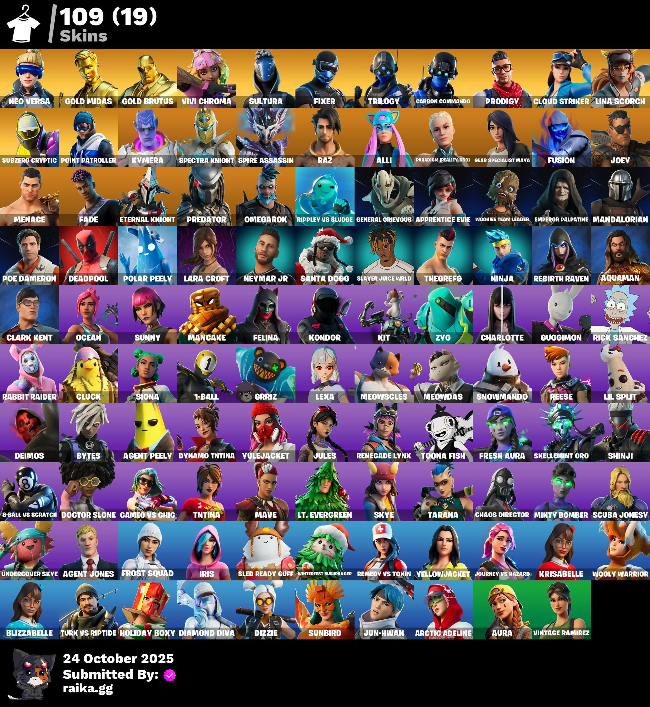 [PC/PSN/XBOX] 109 skins | Neo Versa | Gold Midas | Gold Brutus | Vivi Chroma | Sultura | Fixer | Trilogy | Carbon Commando | Prodigy | Cloud Striker | 1250 VB / FN
